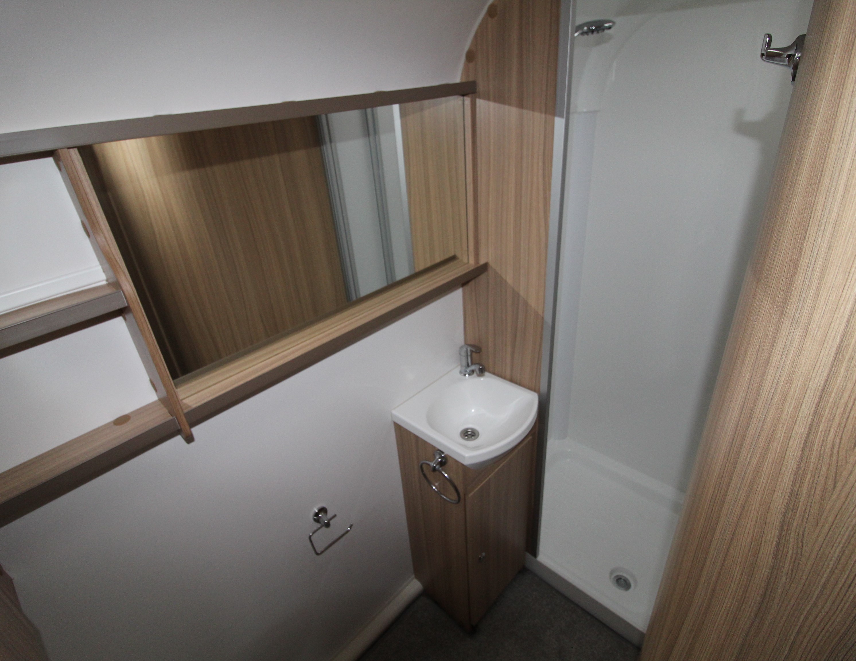 Moving into the main bedroom area you will find a fixed French bed with overhead lockers, wardrobe and access to your full width washroom complete with washbasin, cassette toilet and shower cubicle.