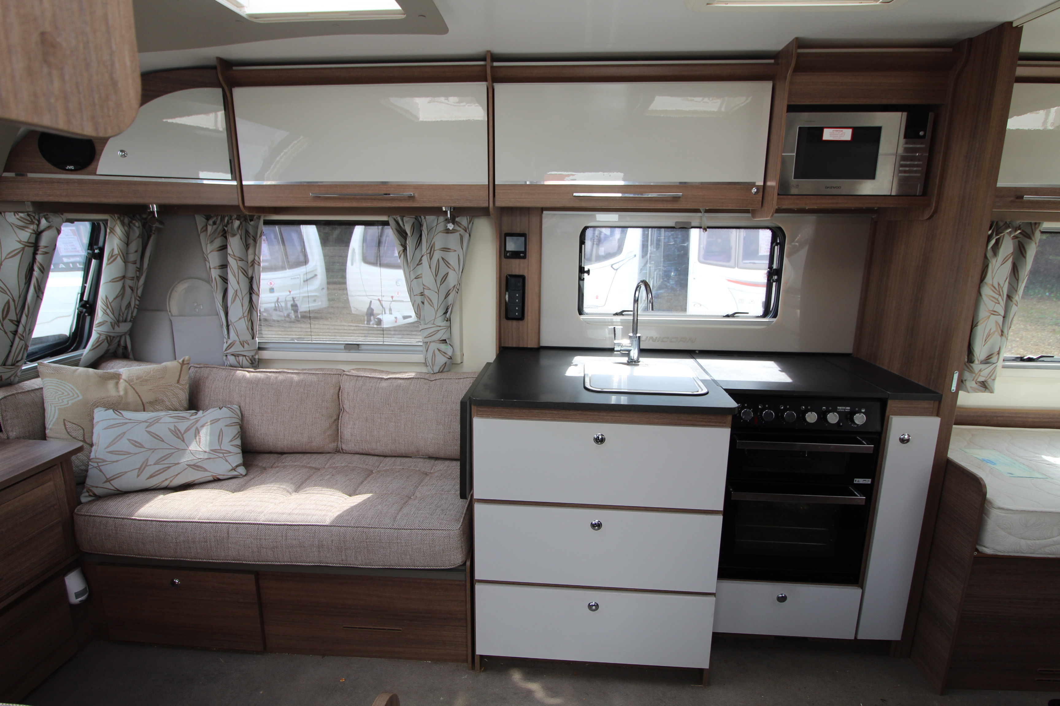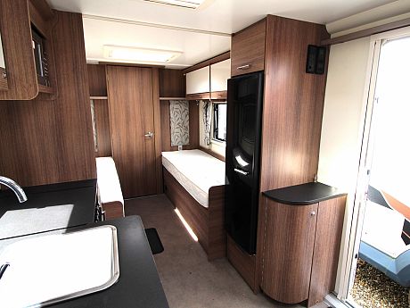 The well fitted kitchen is equipped with everything you need for a short weekend break or long touring adventures. The kitchen offers a hob, oven, grill, fridge and microwave
