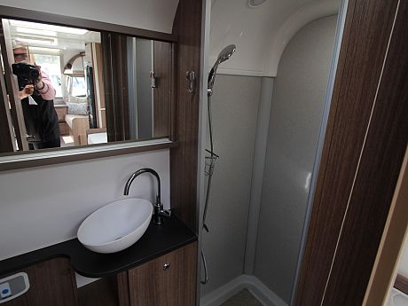 The full width end washroom provides a separate shower cubicle, washbasin and cassette toilet.