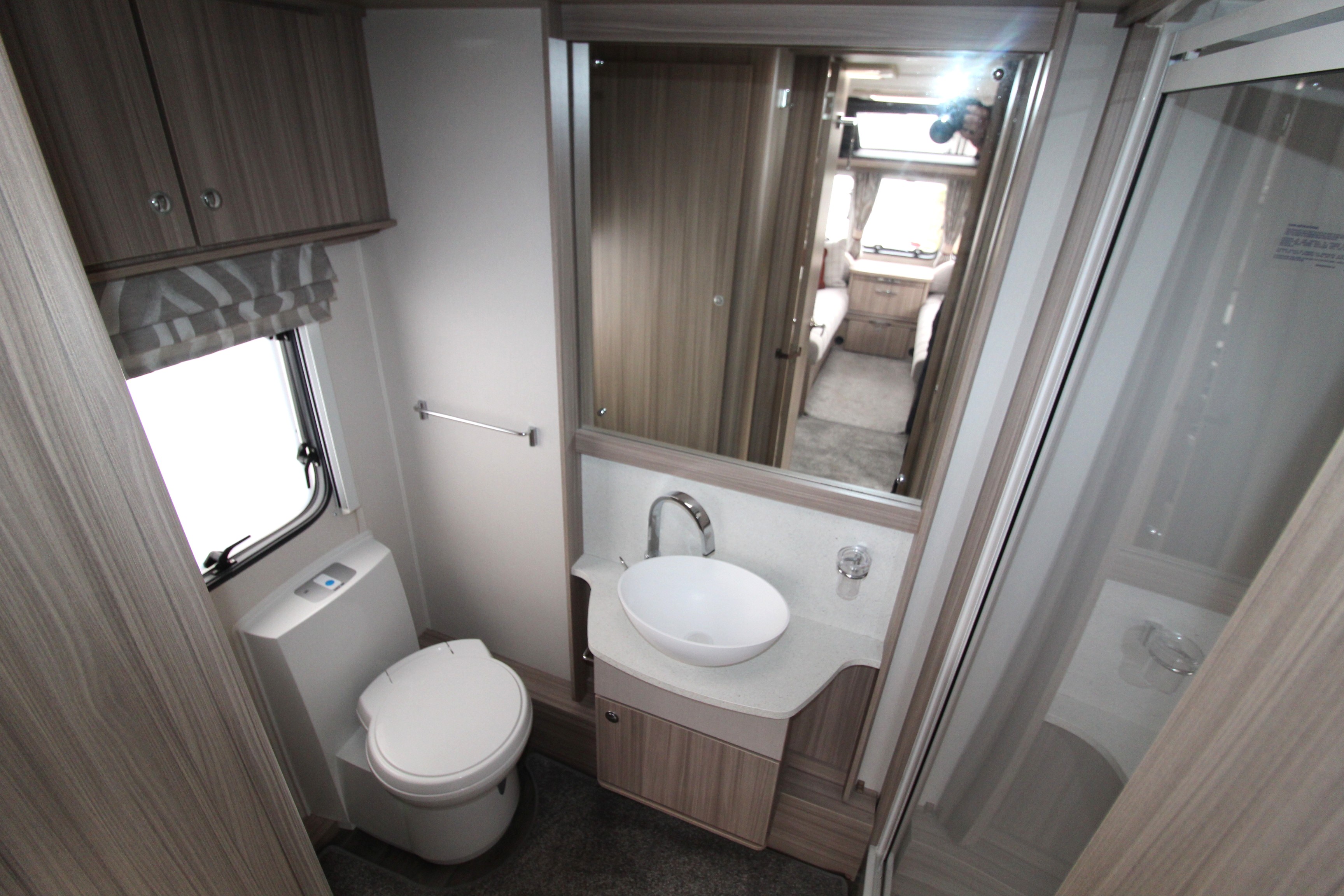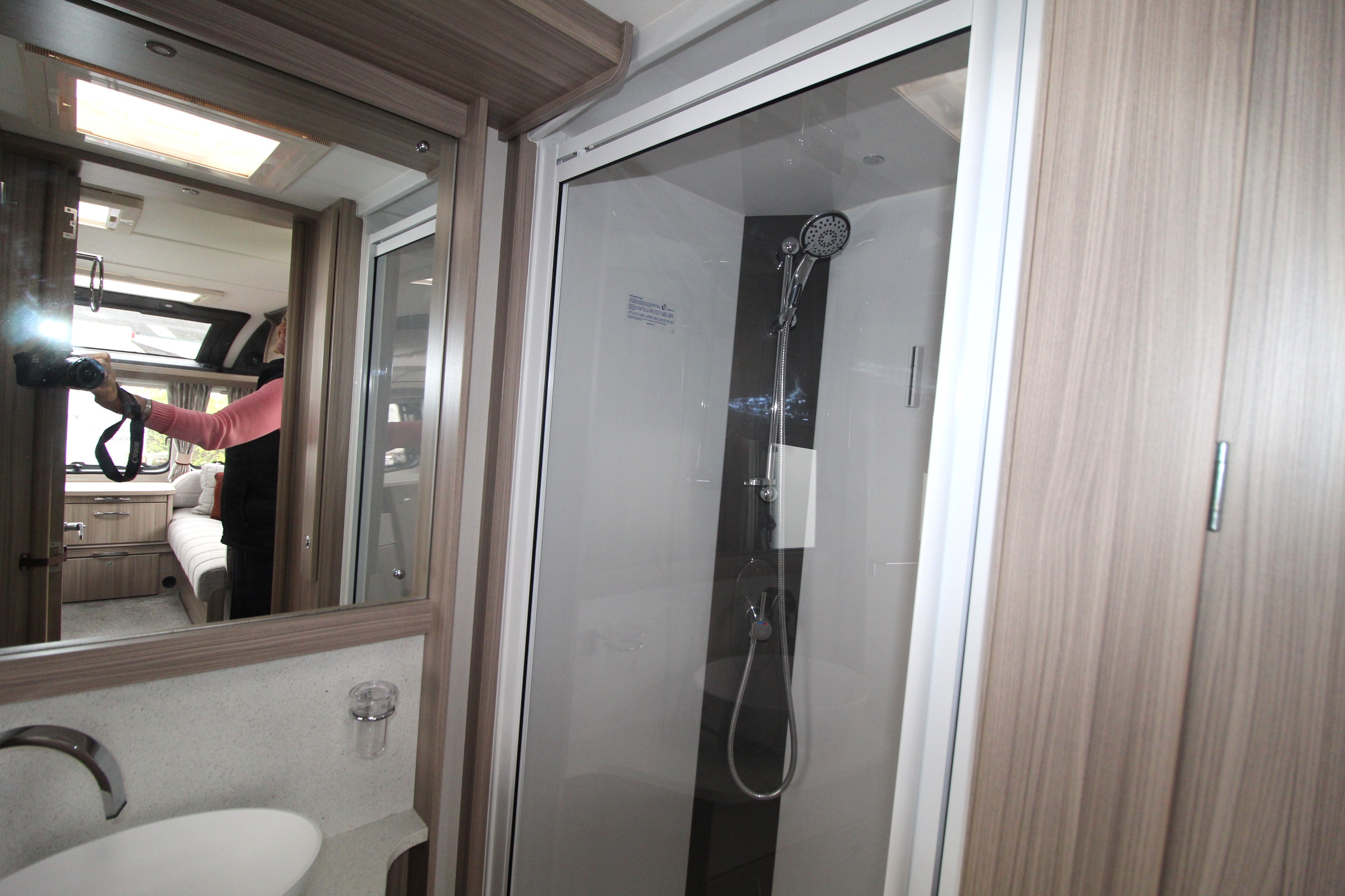 The large end washroom doubles up a as a dressing room and offers double wardrobe, cassette toilet, vanity sink and a shower cubicle.
