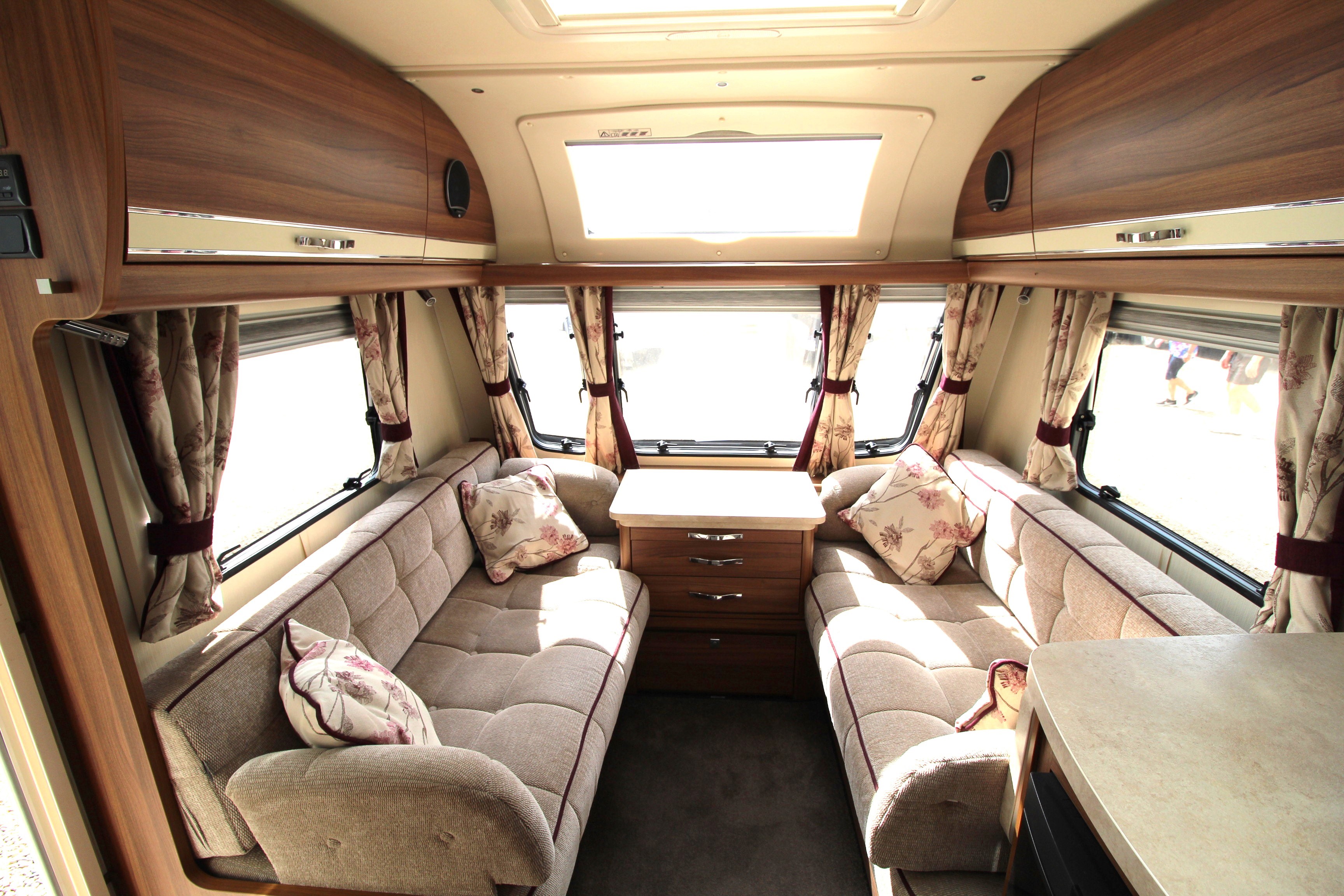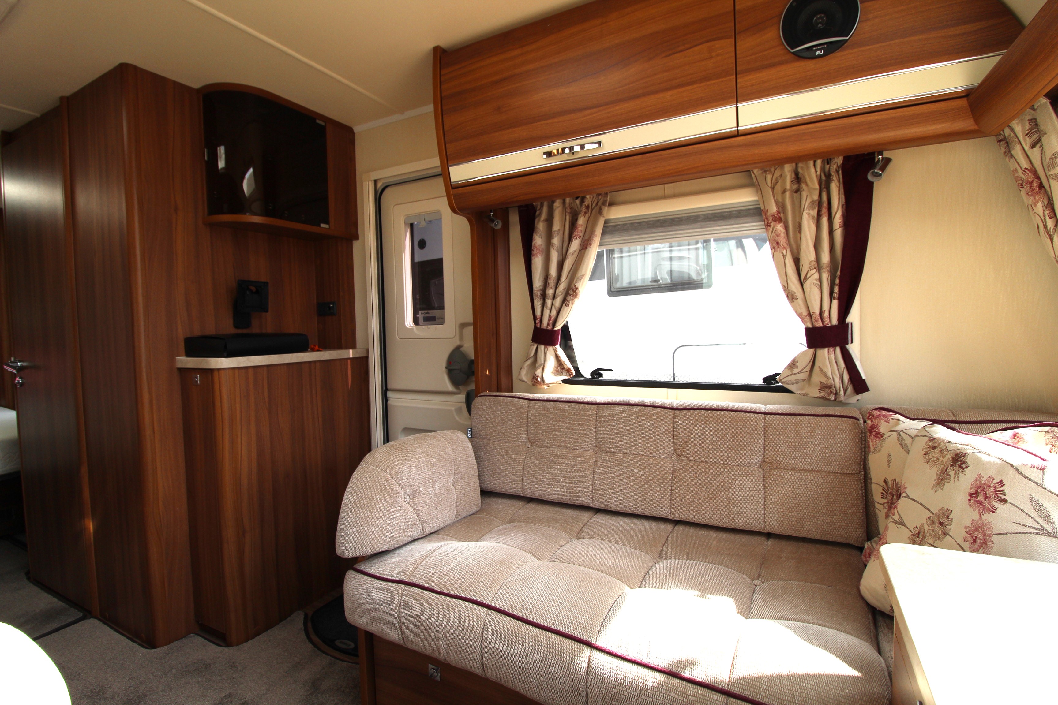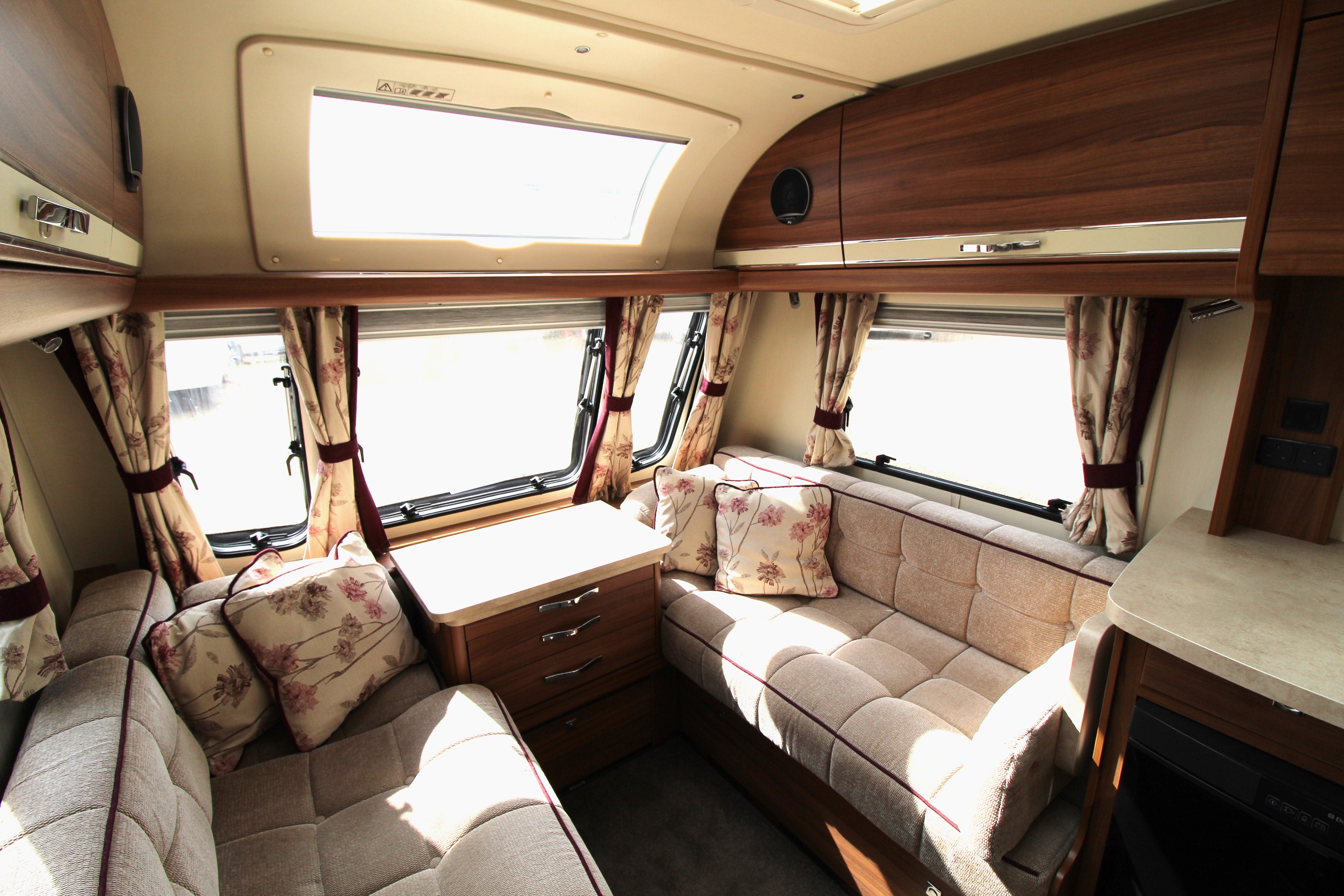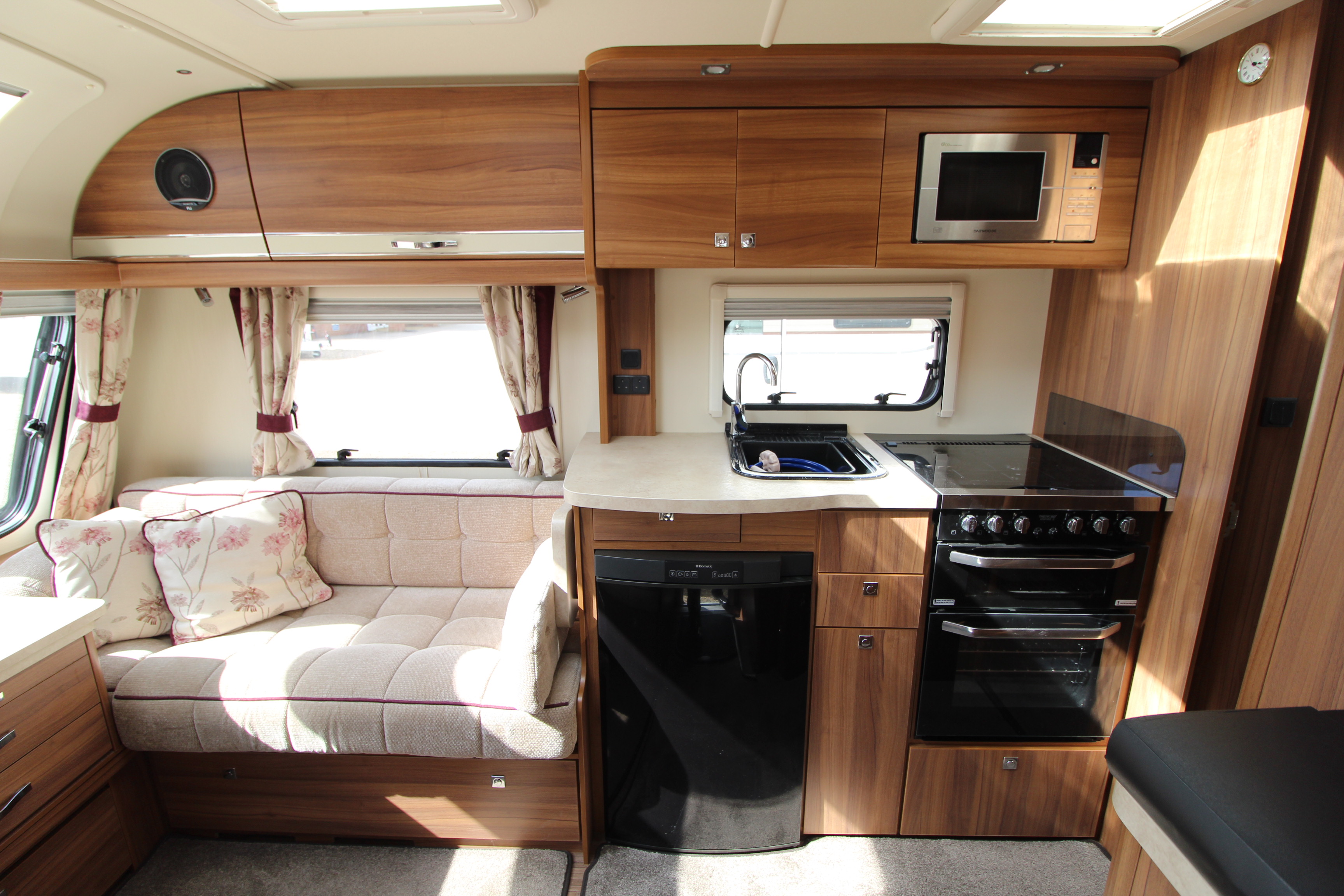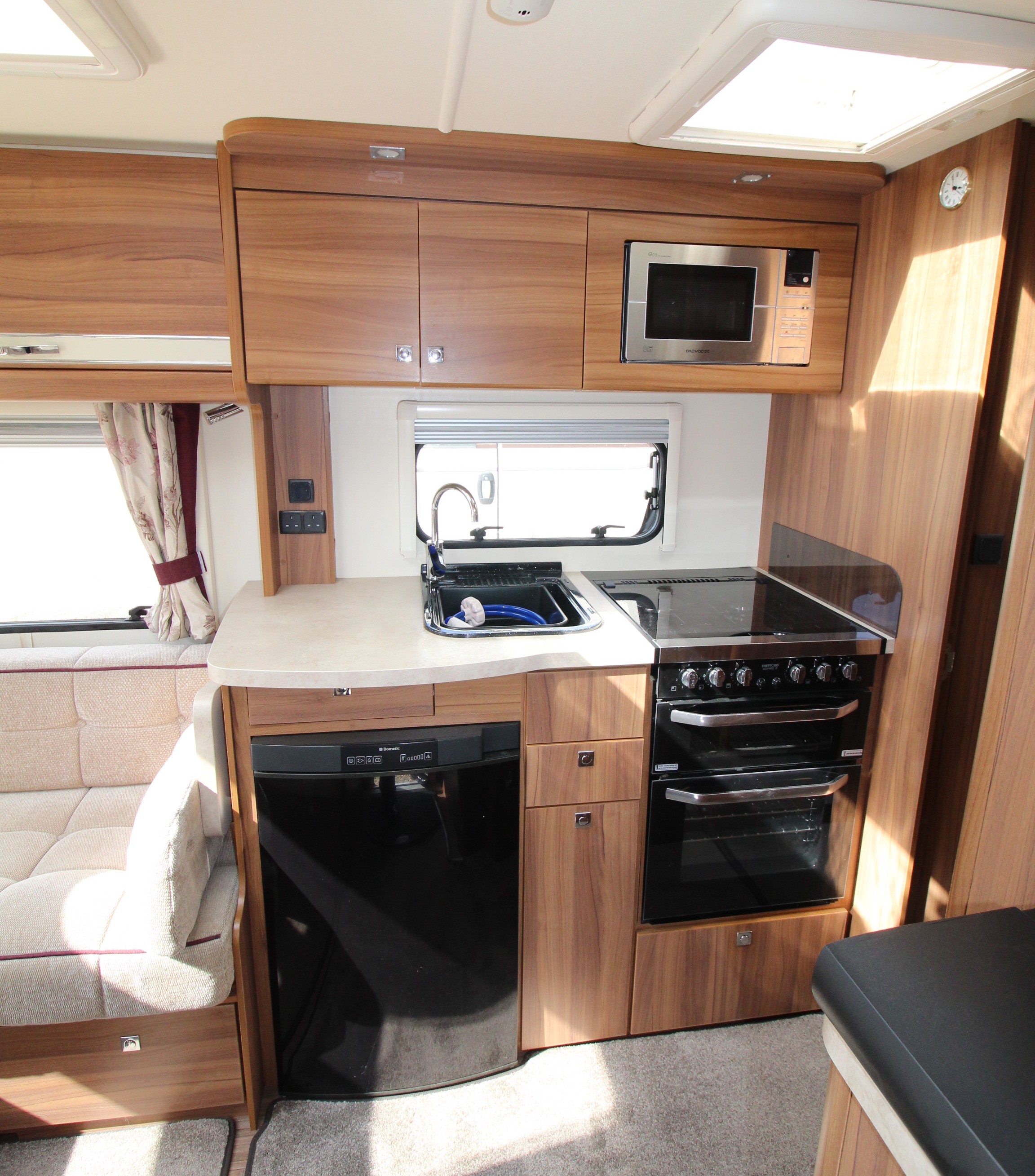 The well fitted kitchen is equipped with everything you need for a short weekend break or long touring adventures. The kitchen offers a hob, oven, grill, fridge, microwave, ample worksurface and cupboard units.