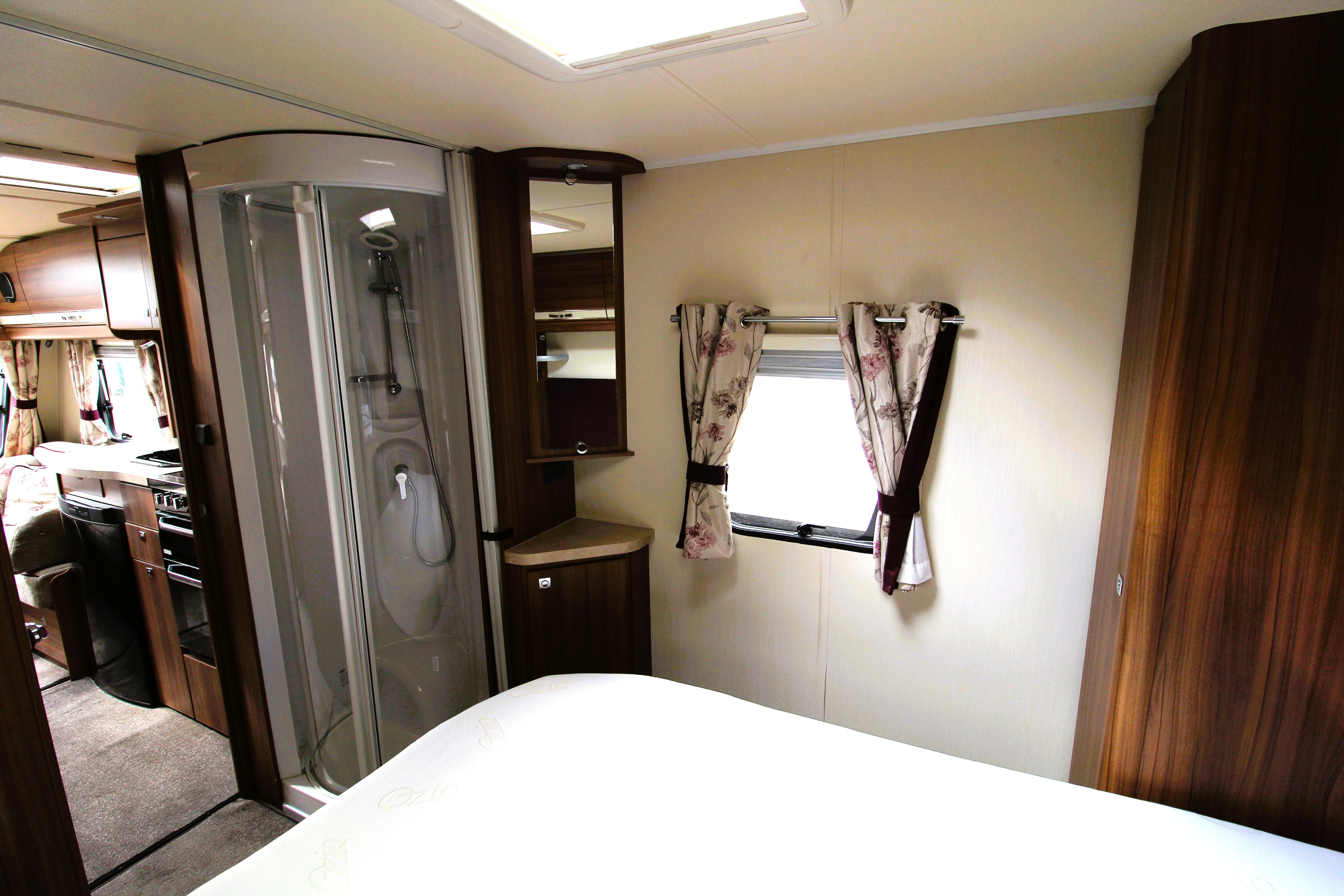 Moving along from into the spacious main bedroom area with its feature island bed with overhead lockers and wardrobes/bedside cabinets either side. With the homely feel of an ensuite bathroom you will find a corner shower cubicle to the offside and a washroom with cassette toilet and vanity basin situated opposite.