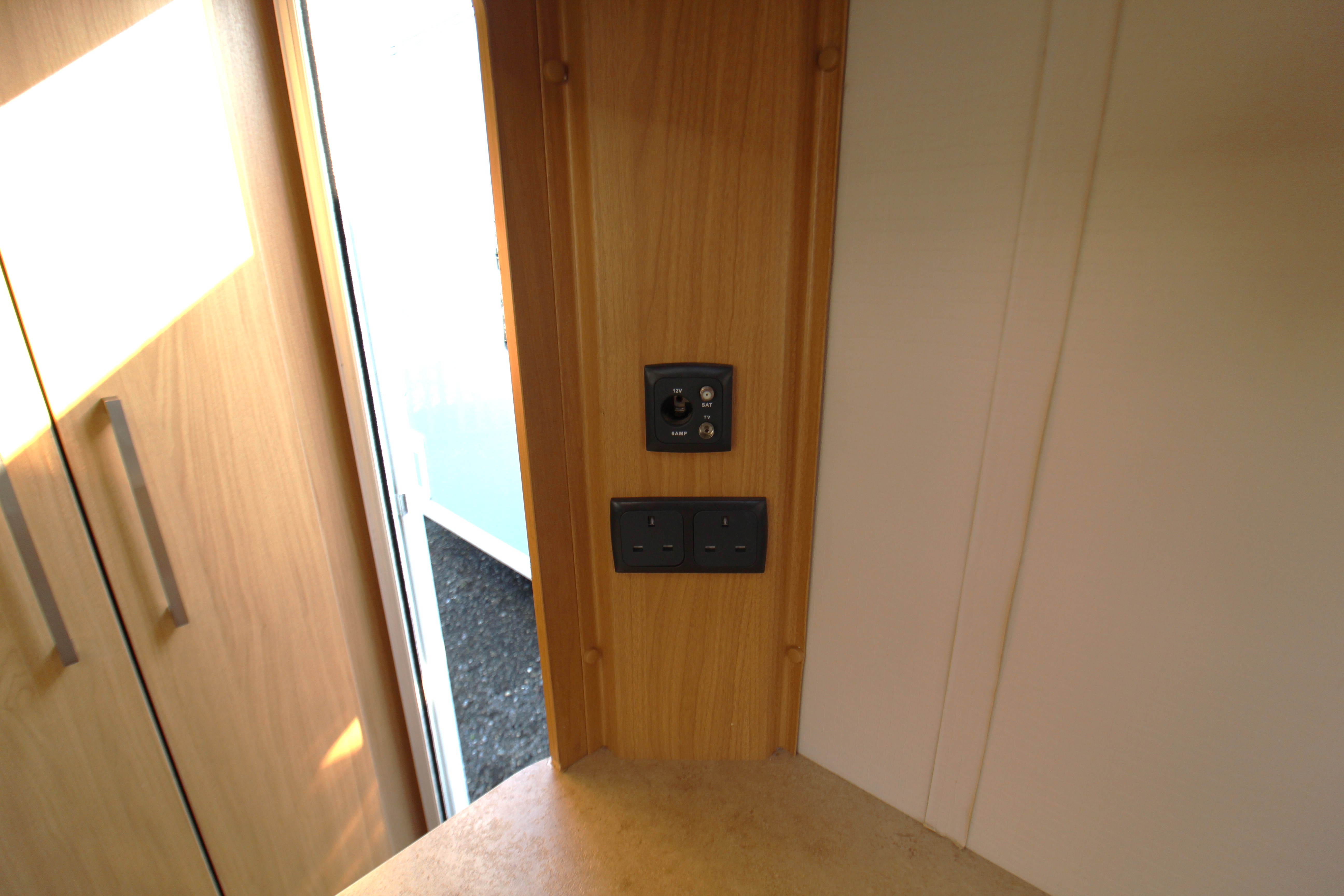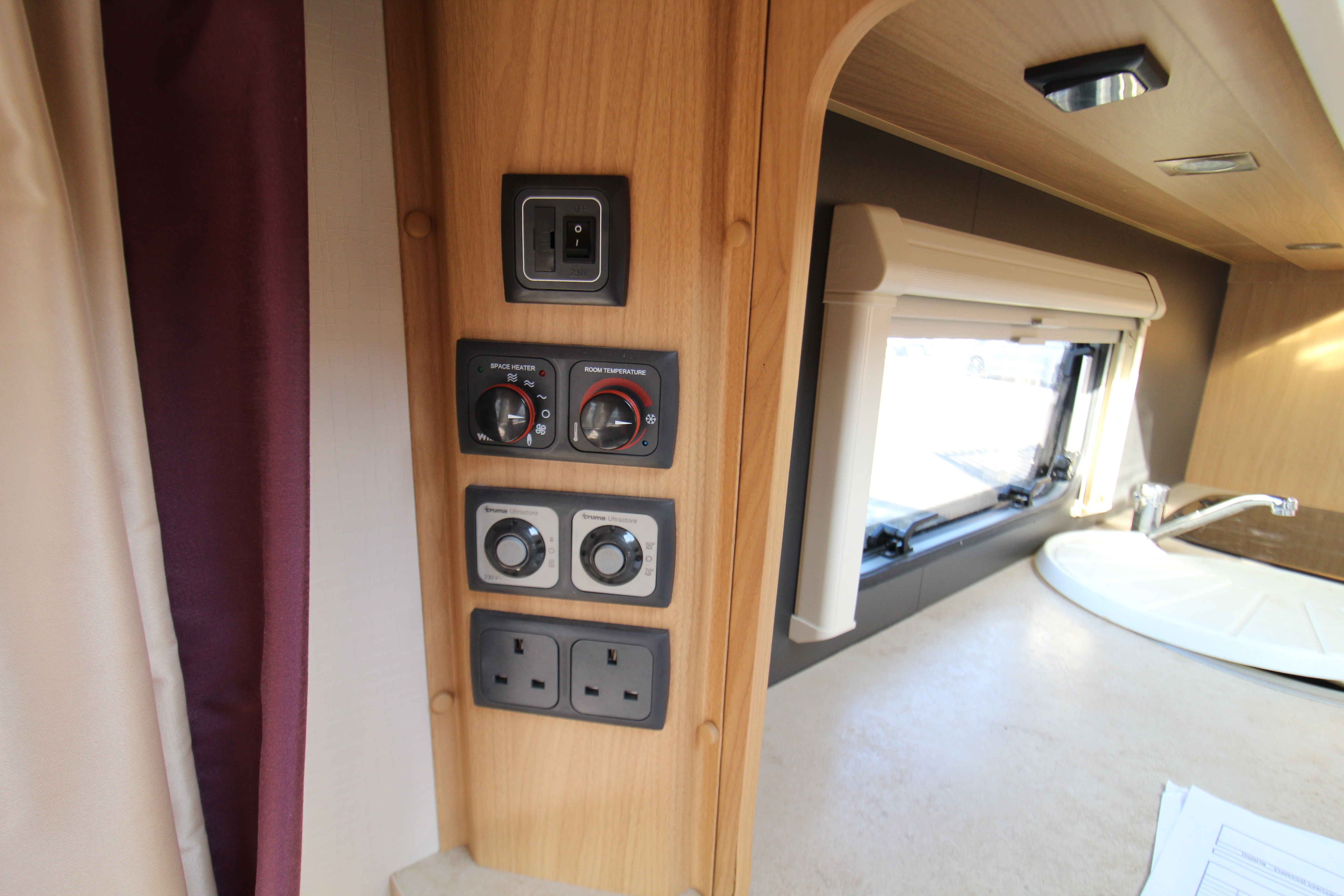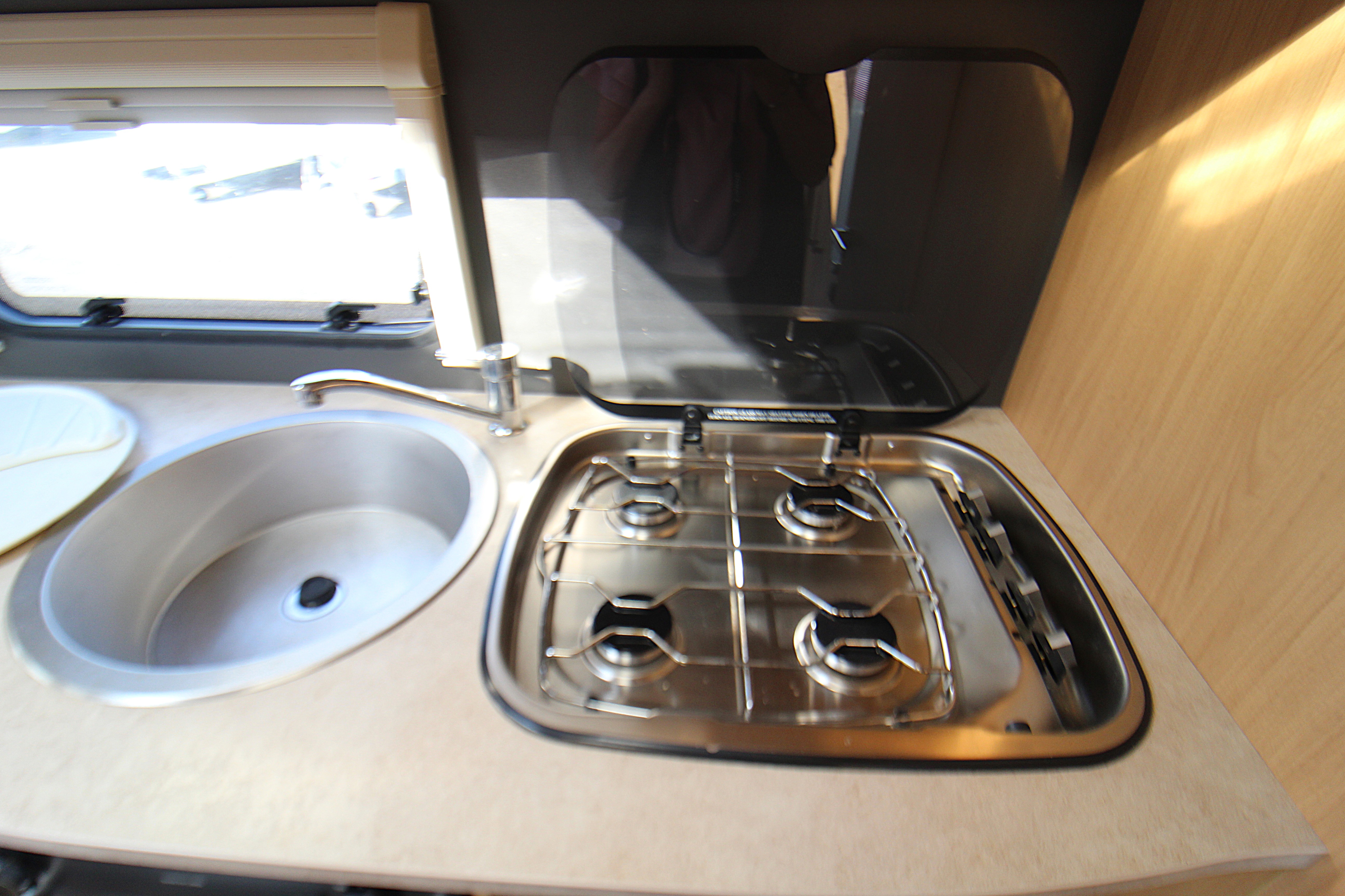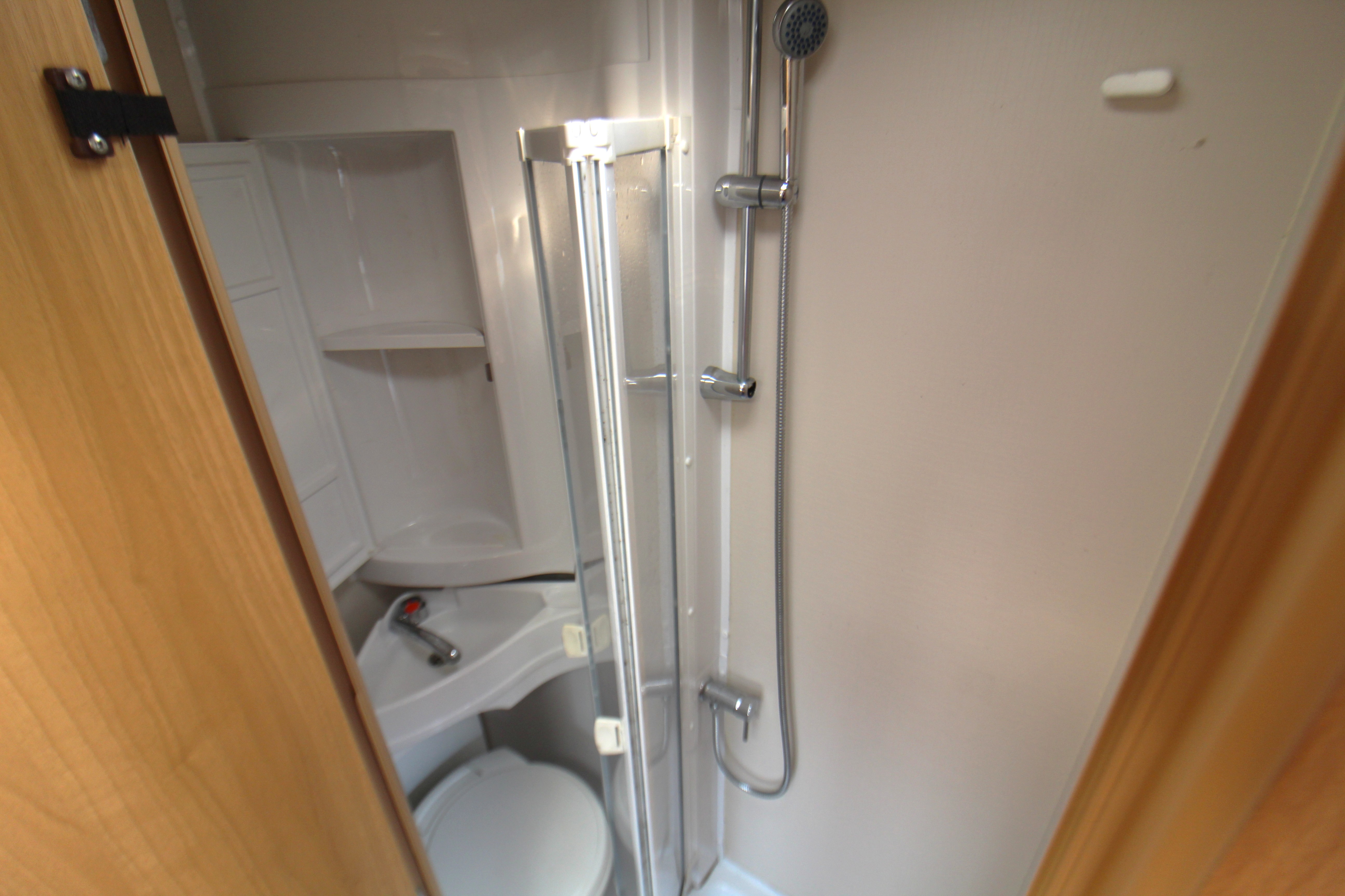 The combi-washroom has a shower facility with screen, cassette toilet and washbasin.