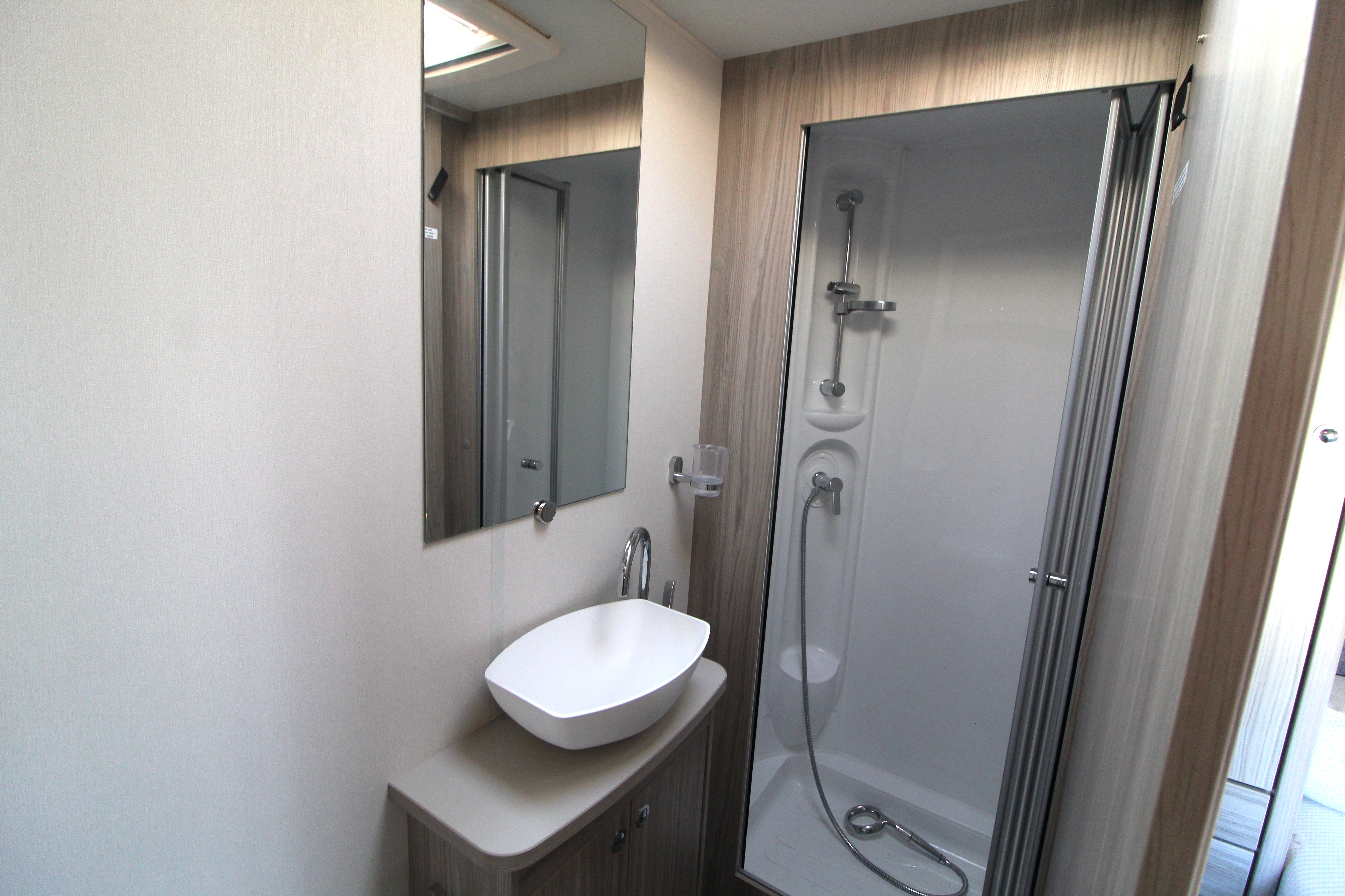 - Full-Width Rear Washroom: A spacious end bathroom featuring a separate shower cubicle, Thetford cassette toilet, and vanity sink.