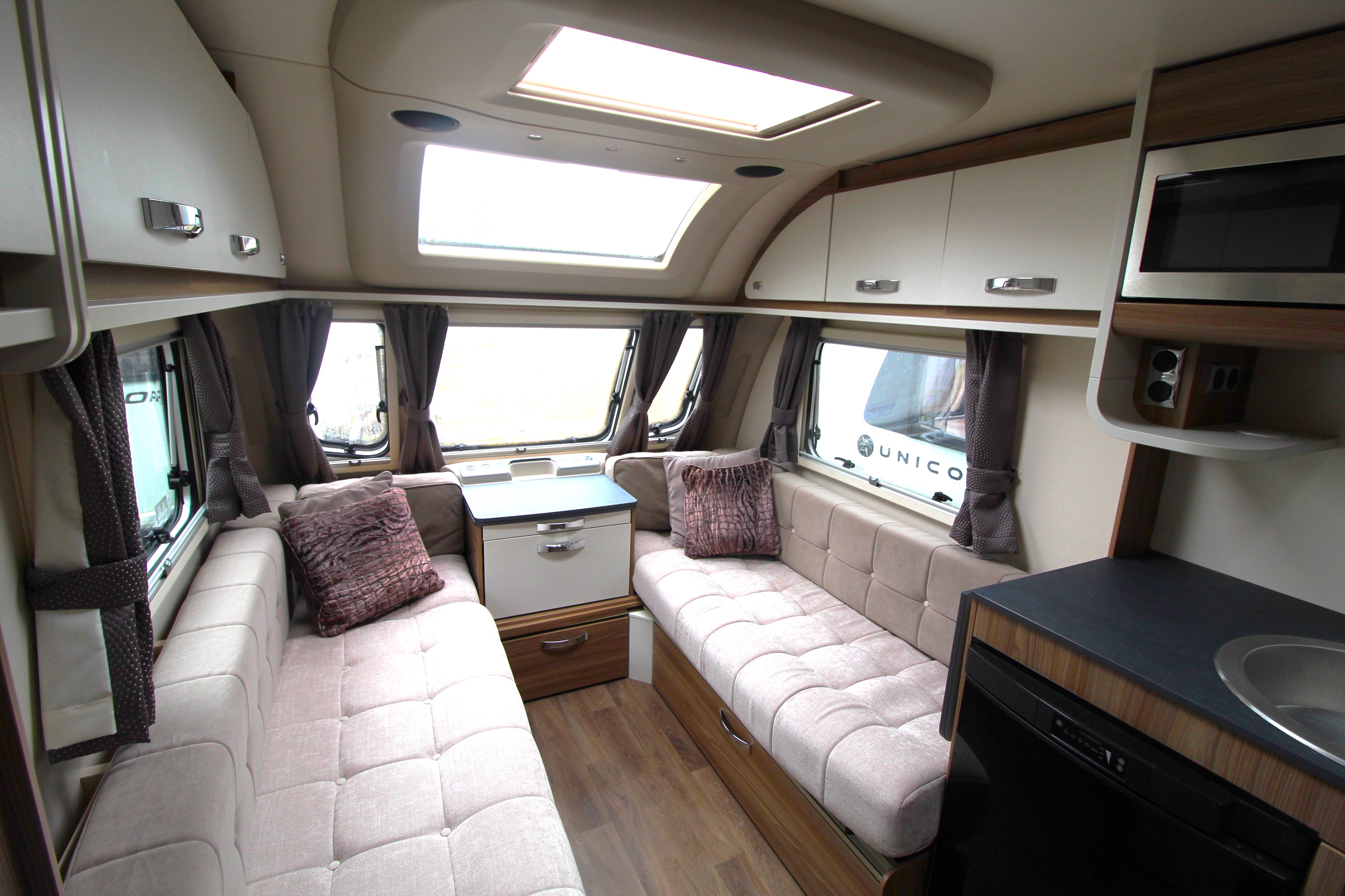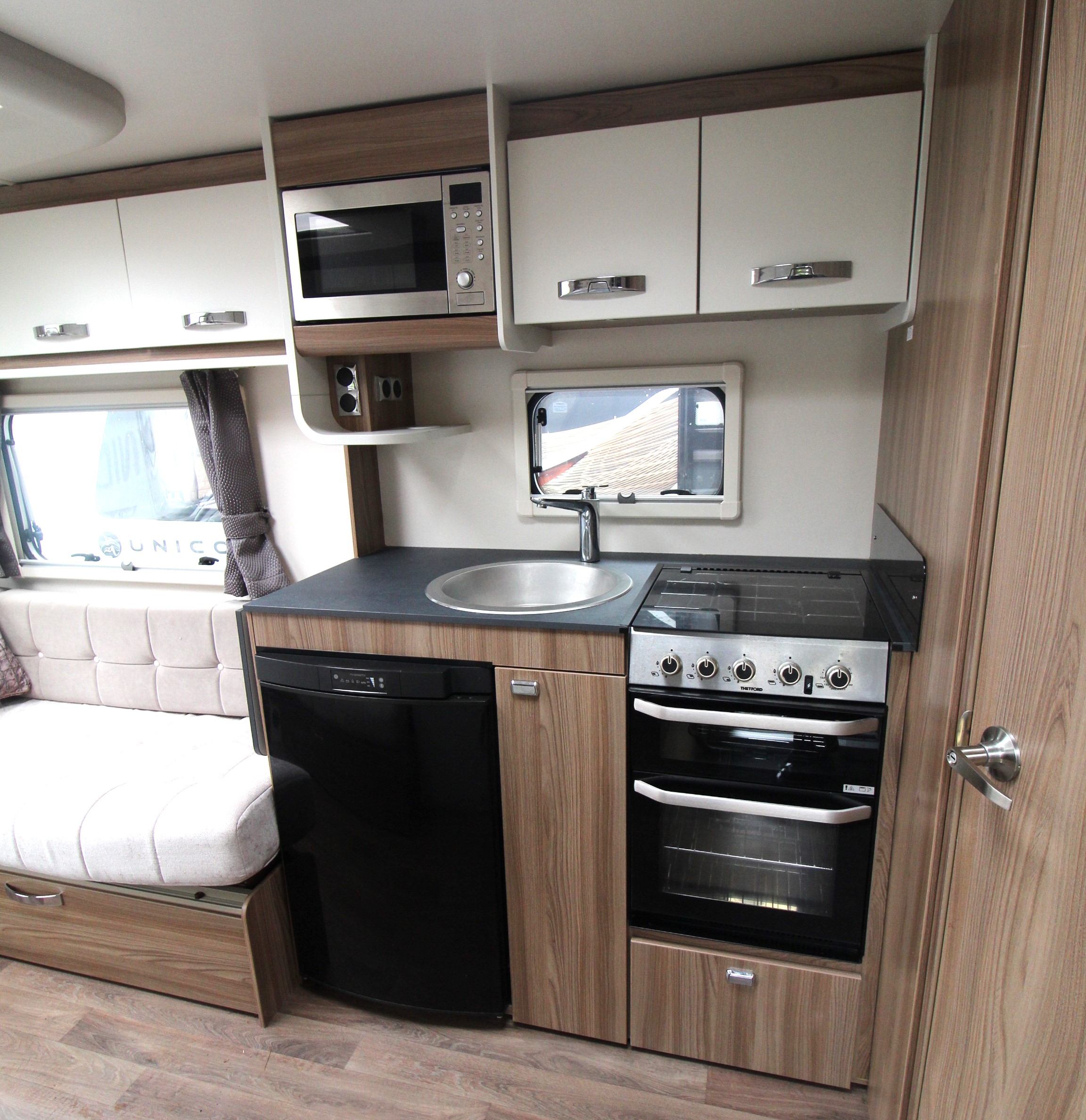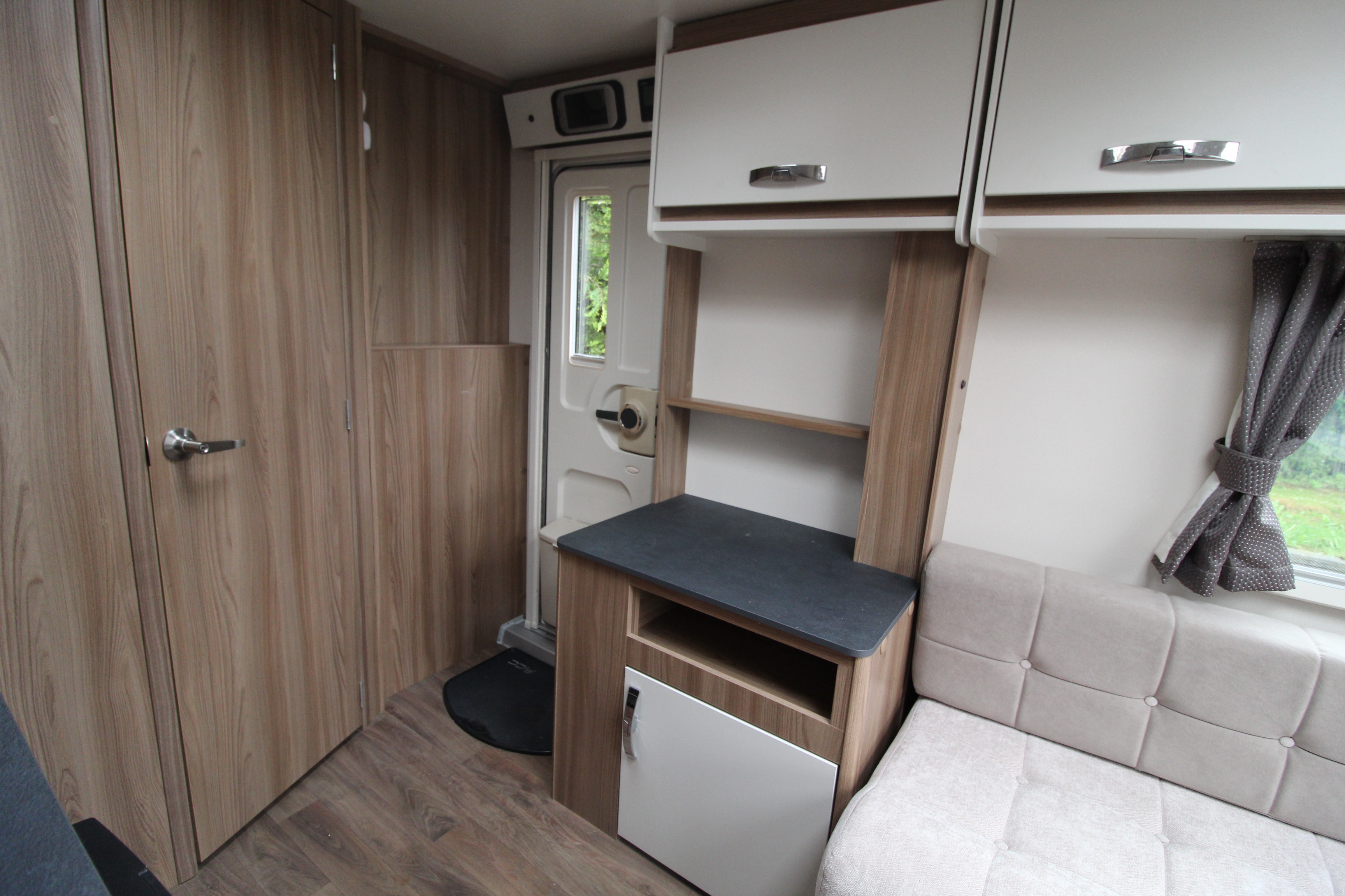 The open plan accommodation offers a well-equipped kitchen providing everything you need for a short weekend break or long touring adventures. Facilities include hob, oven, grill, fridge, microwave and ample cupboards for your essential items. A generous display unit can double up to offer extra work space if required.