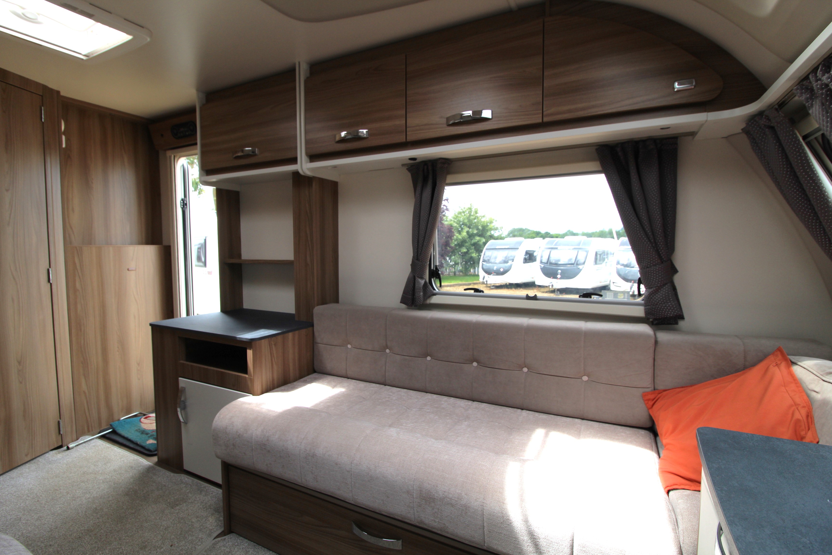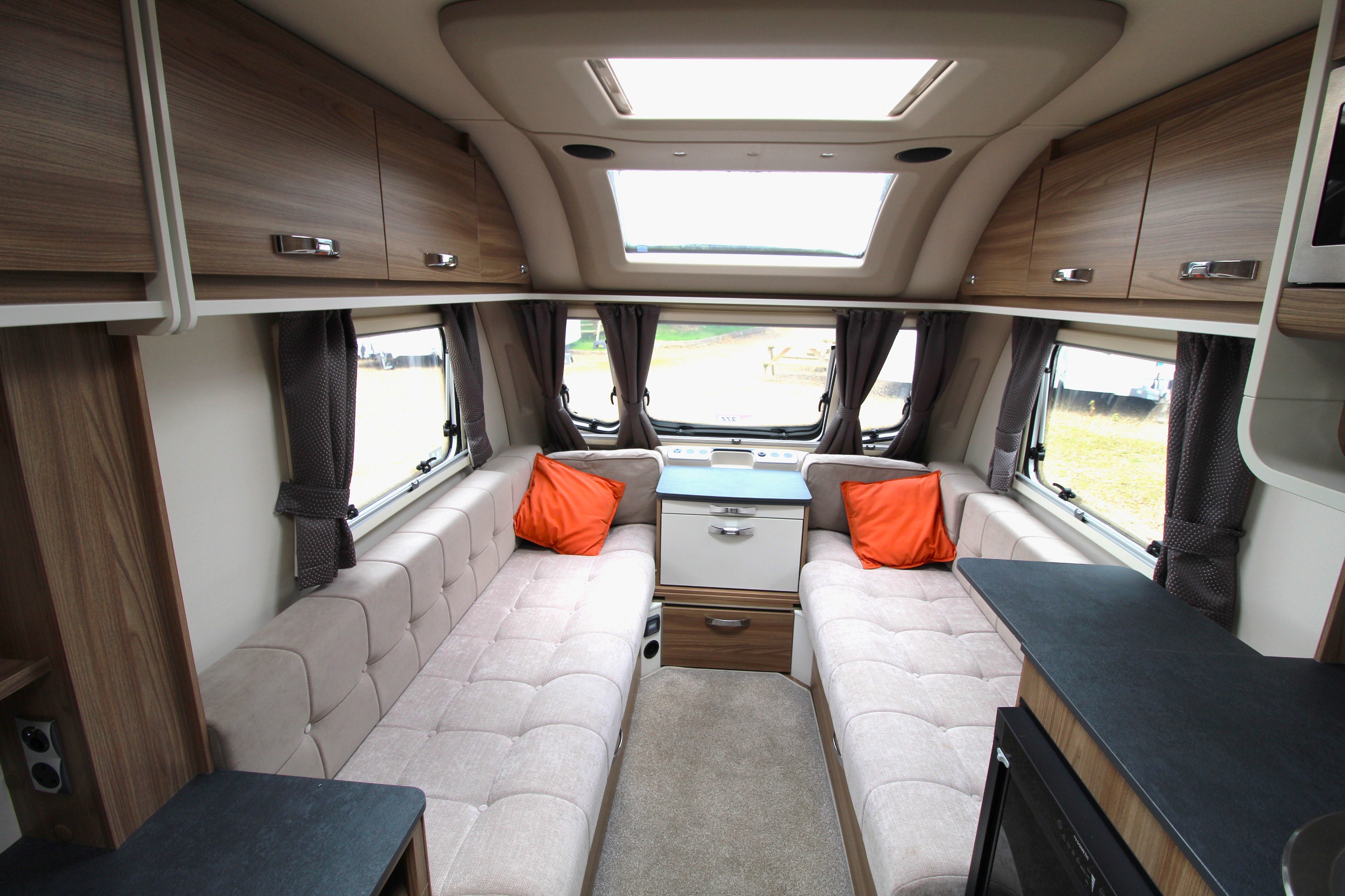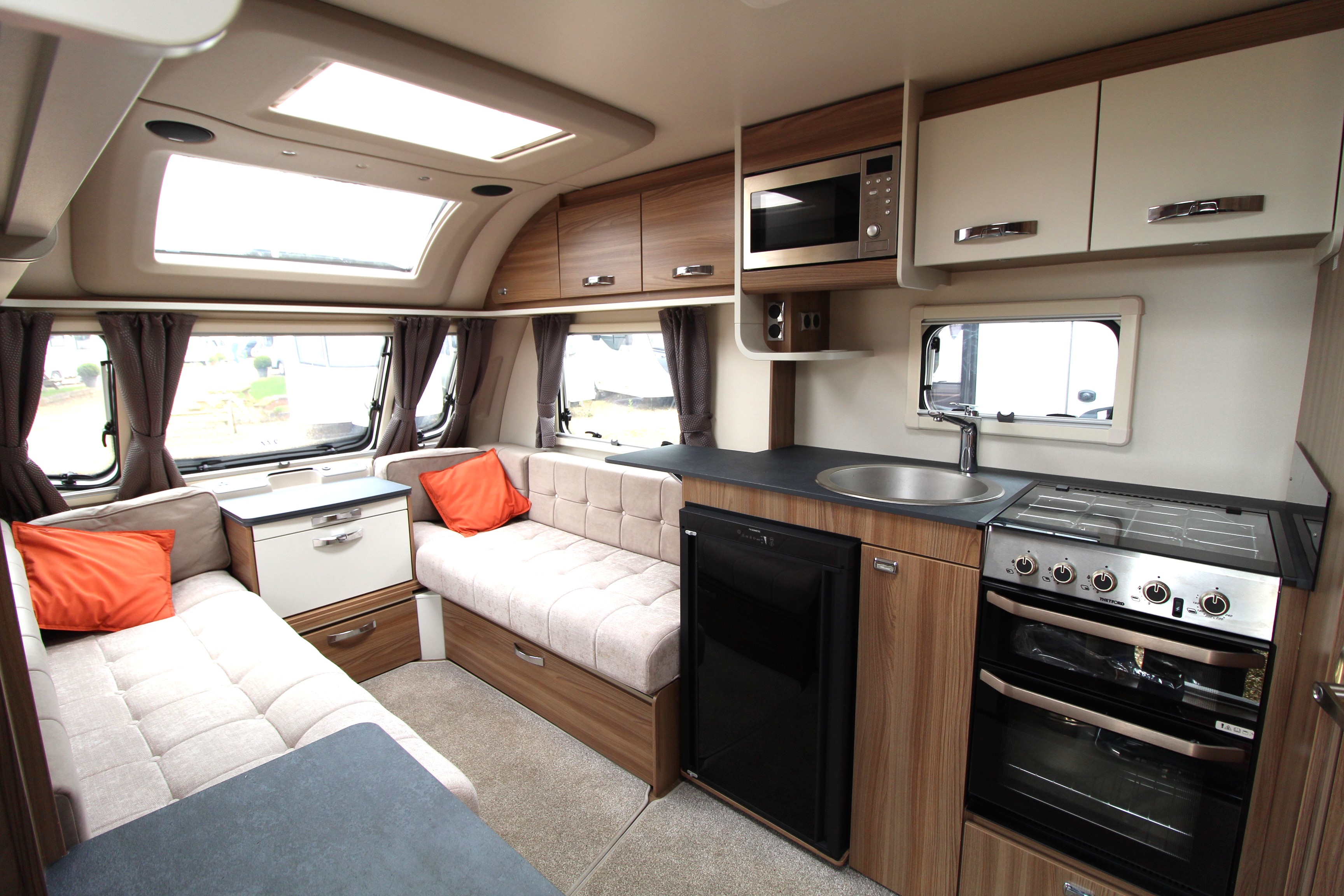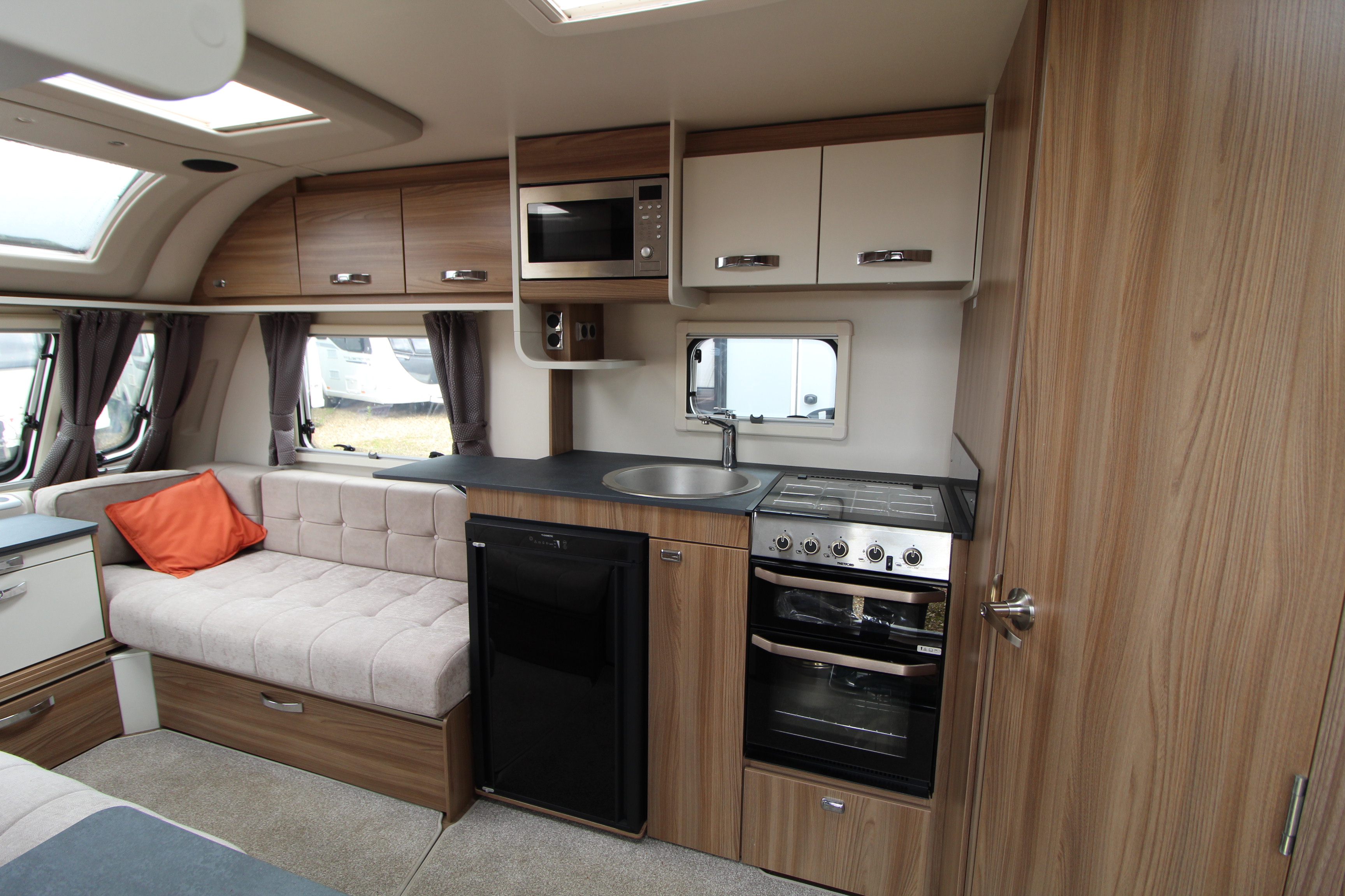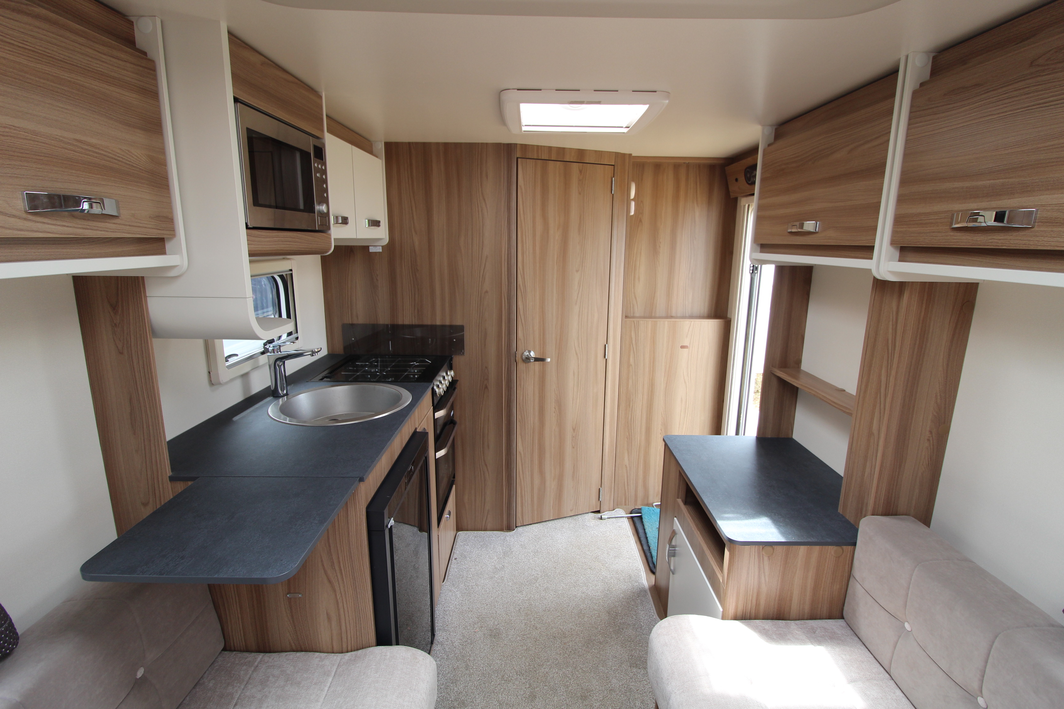 The open plan accommodation offers a well-equipped kitchen providing everything you need for a short weekend break or long touring adventures. Facilities include hob, oven, grill, fridge, microwave, extendable work surface and ample cupboards for your essential items. A generous display unit with cupboard below can double up to offer extra work space if required.
