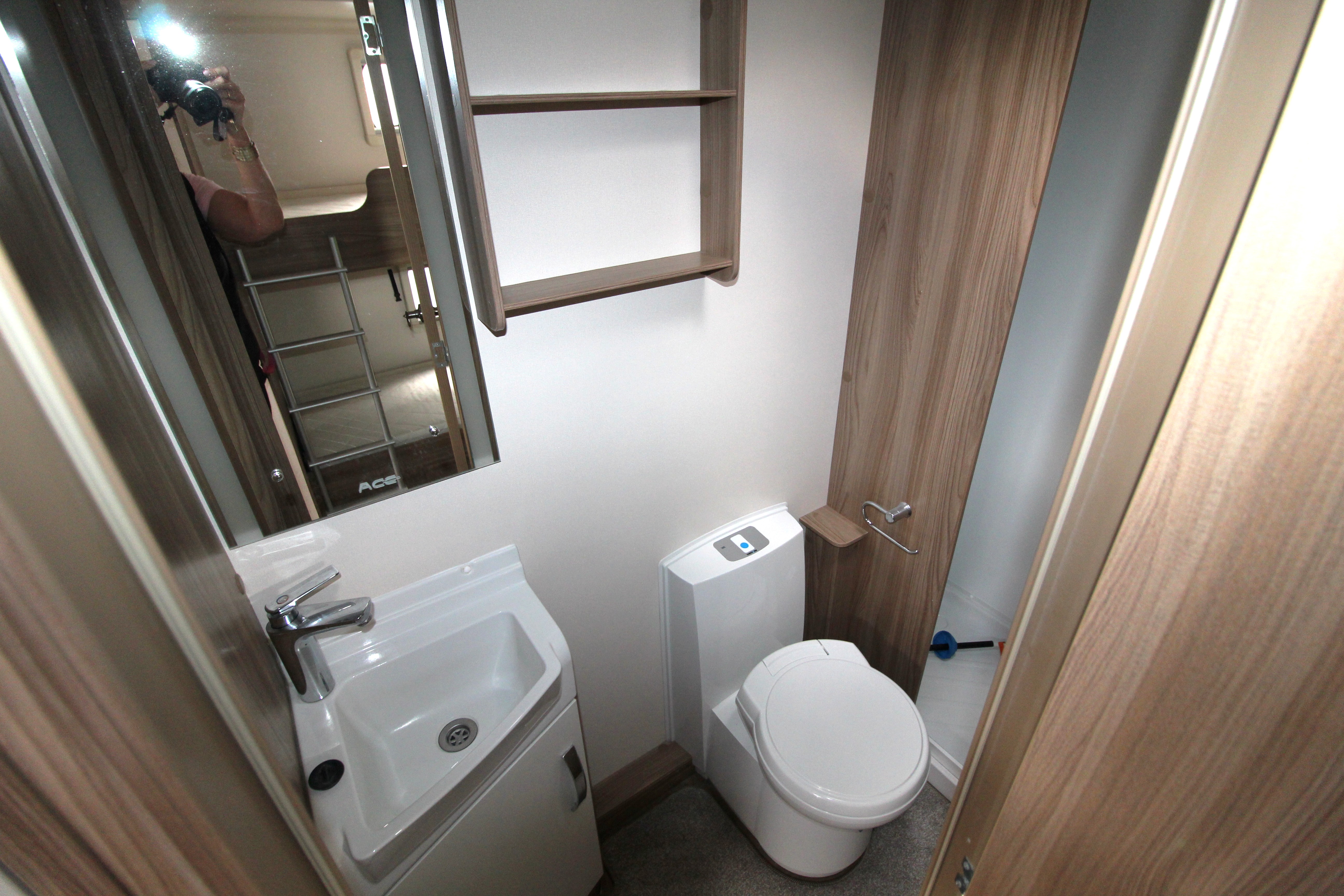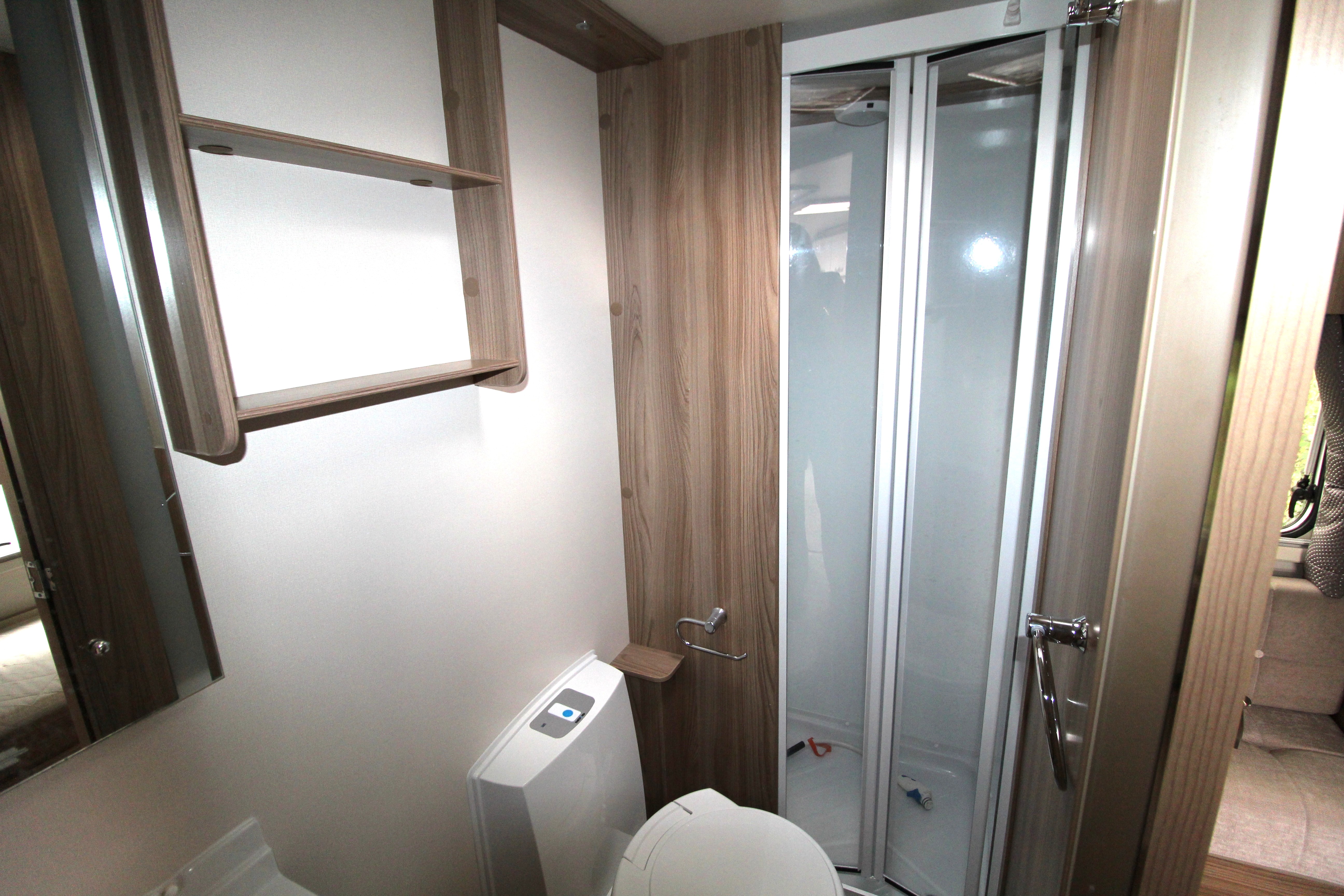 The off-side rear family washroom provides cassette toilet, vanity washbasin with mirror over and a shower cubicle.