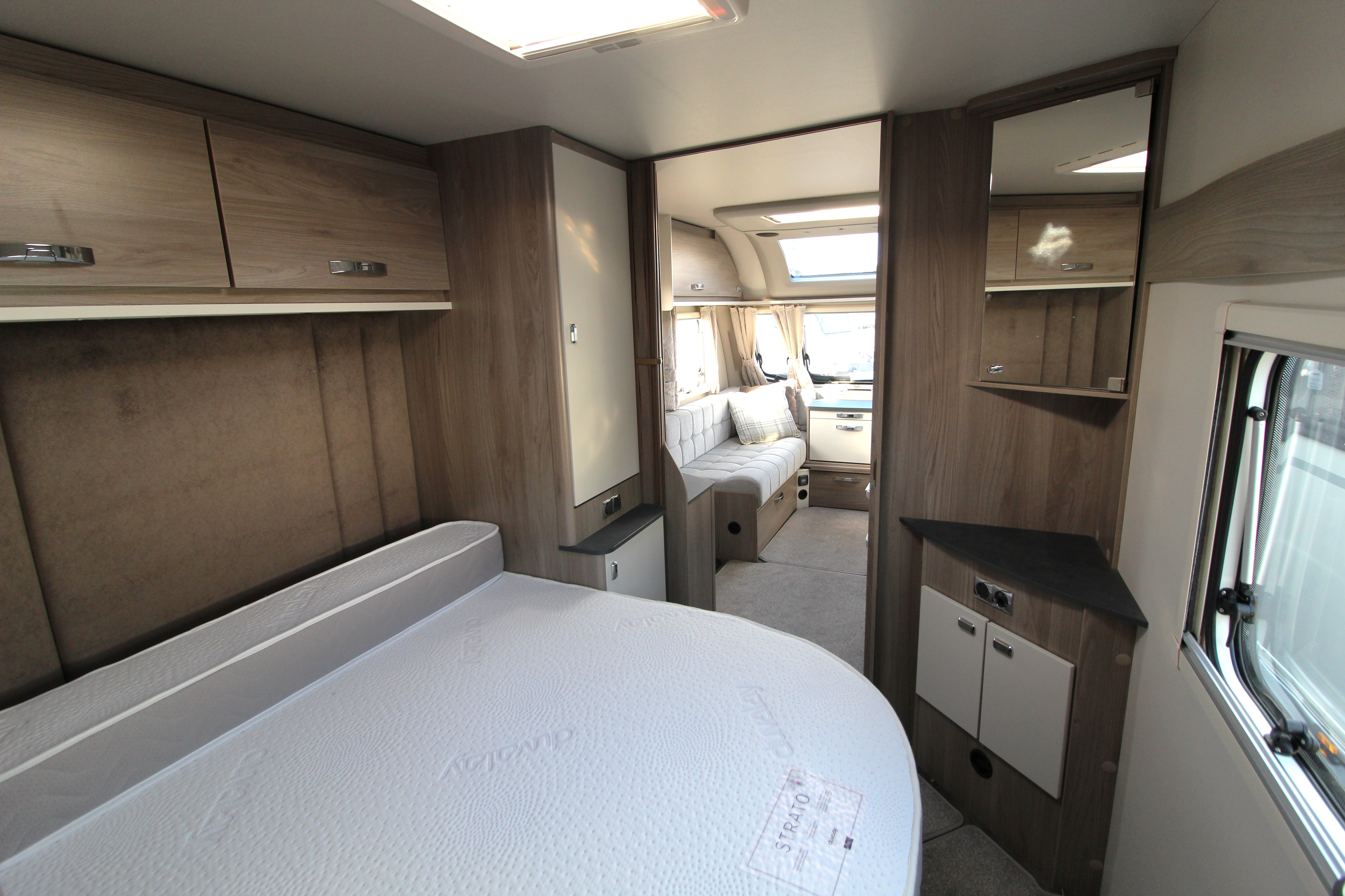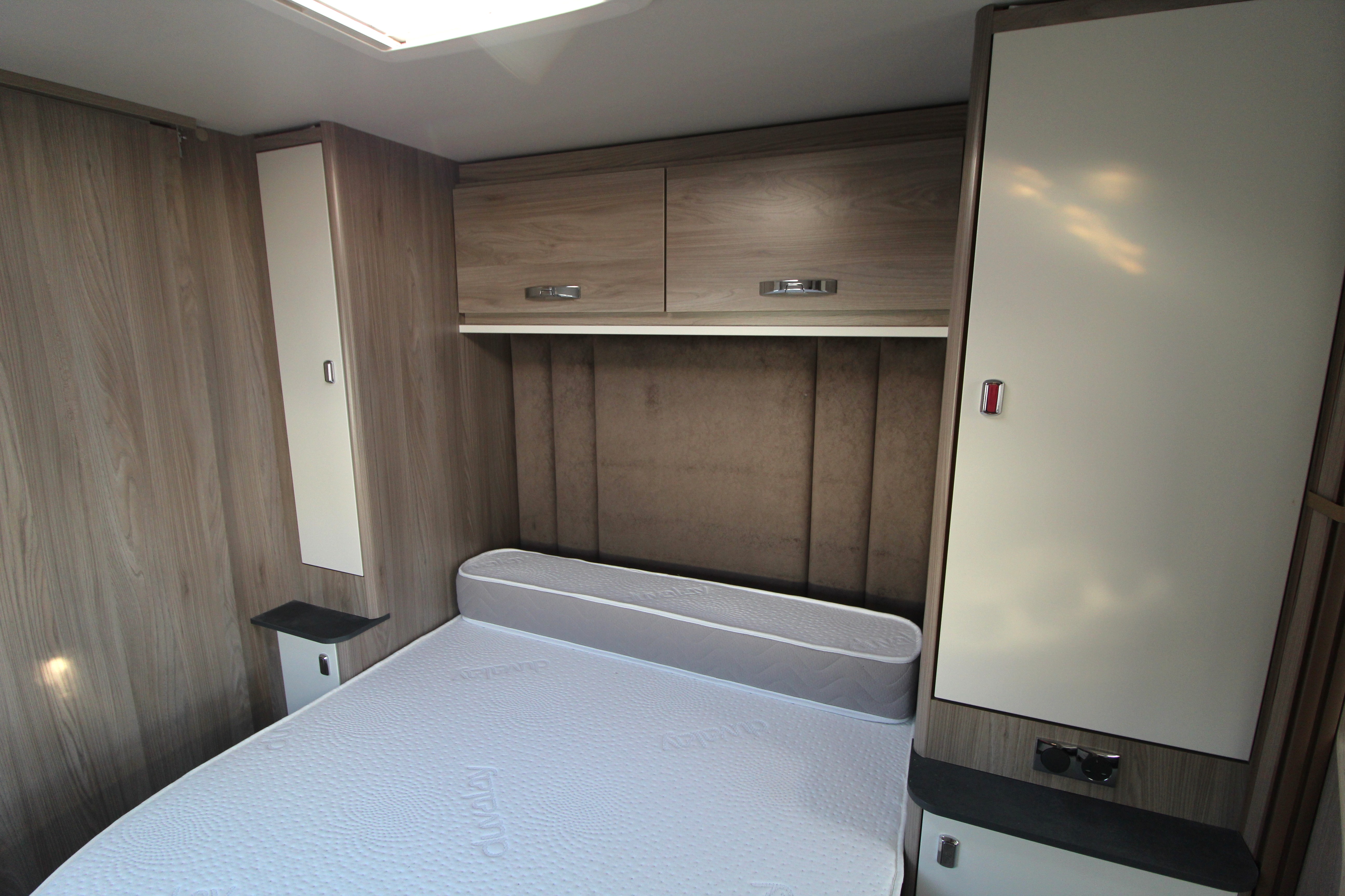 Flowing through to the main bedroom area, which can be screened off from the main living area, you will find a transverse island bed with a feature soft headboard, overhead lockers, wardrobes and bedside cabinets either side. In the corner there is a small vanity mirror and shelving.