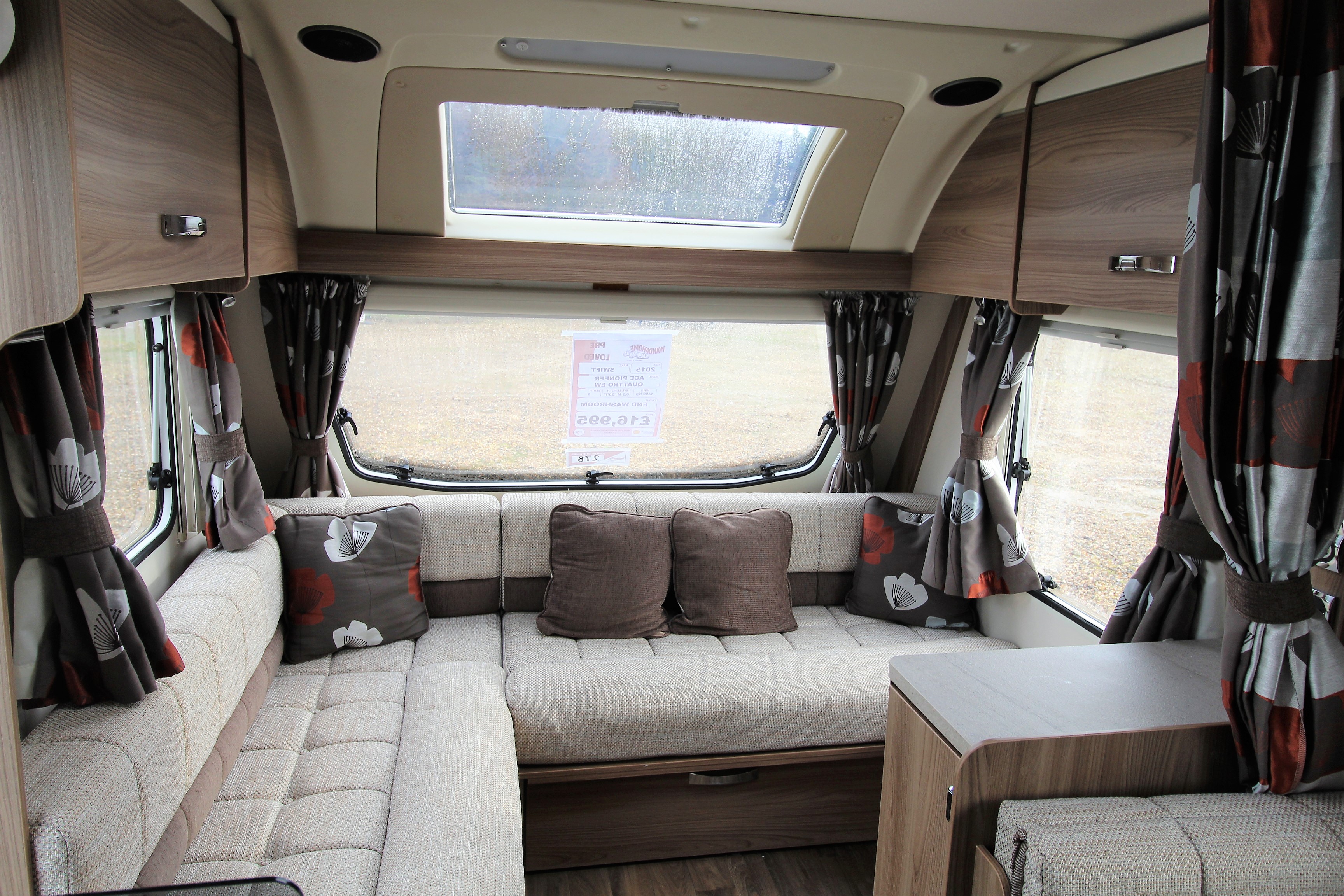 Available at Wandahome South Cave, this pre-loved six berth 2015 Swift Ace Pioneer consists of a great layout featuring a large L-Shaped front lounge, a wonderfully spacious side dinette, a great sized double bed to the rear and a full width end washroom. The cleaverly designed interior makes the Swift Ace Pioneer a great caravan for families. The whole caravan feel spacious and welcoming and the upholstery is bright and modern whilst still keeping a warm feel.