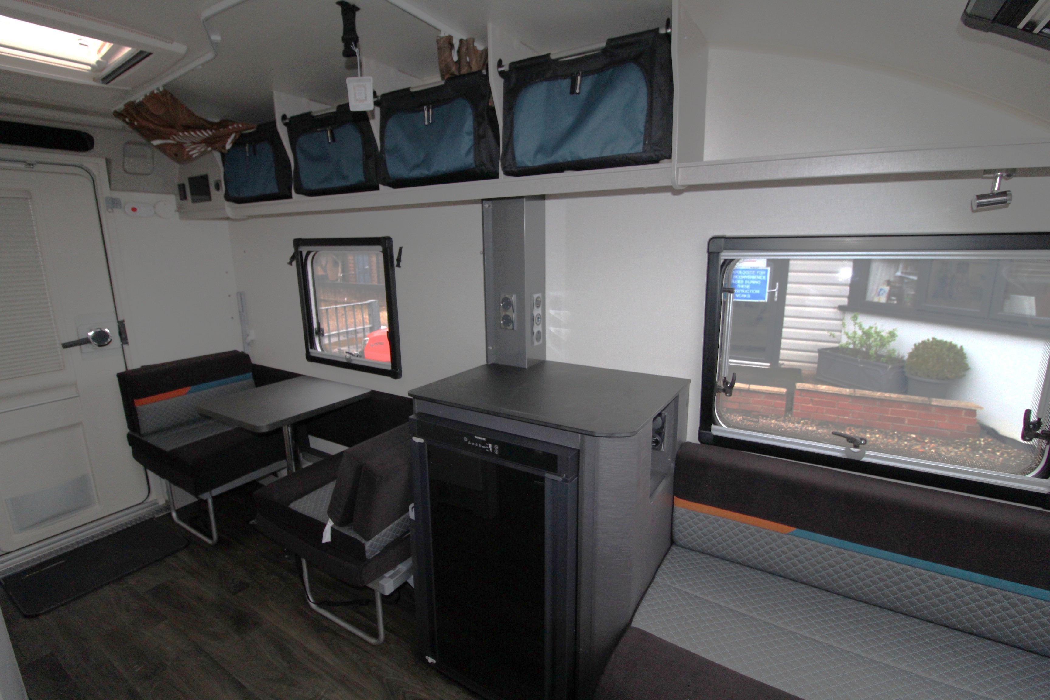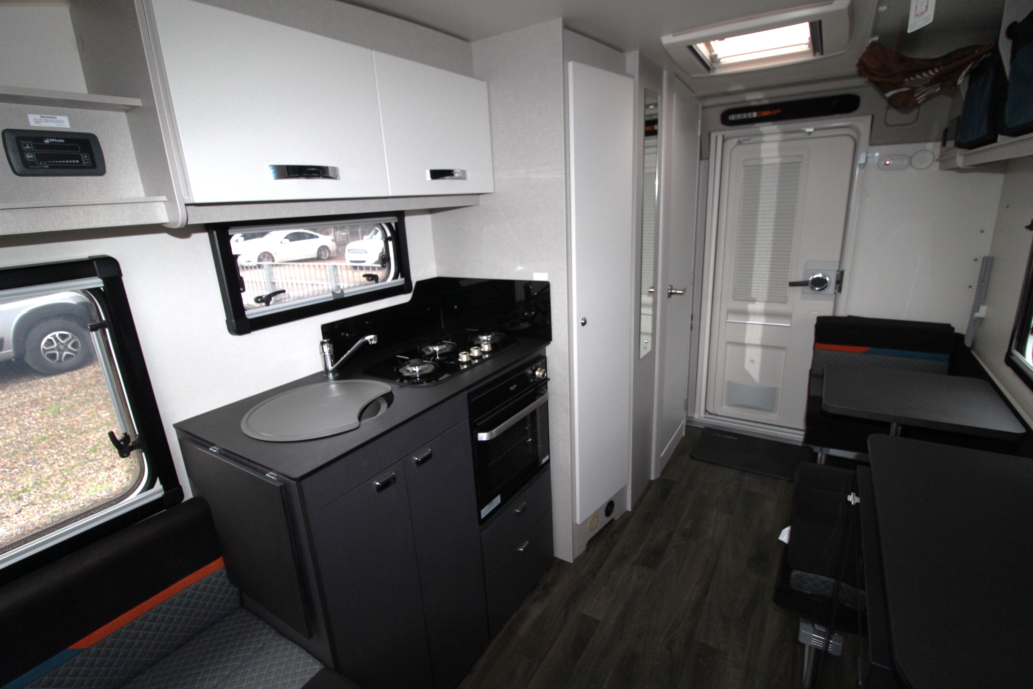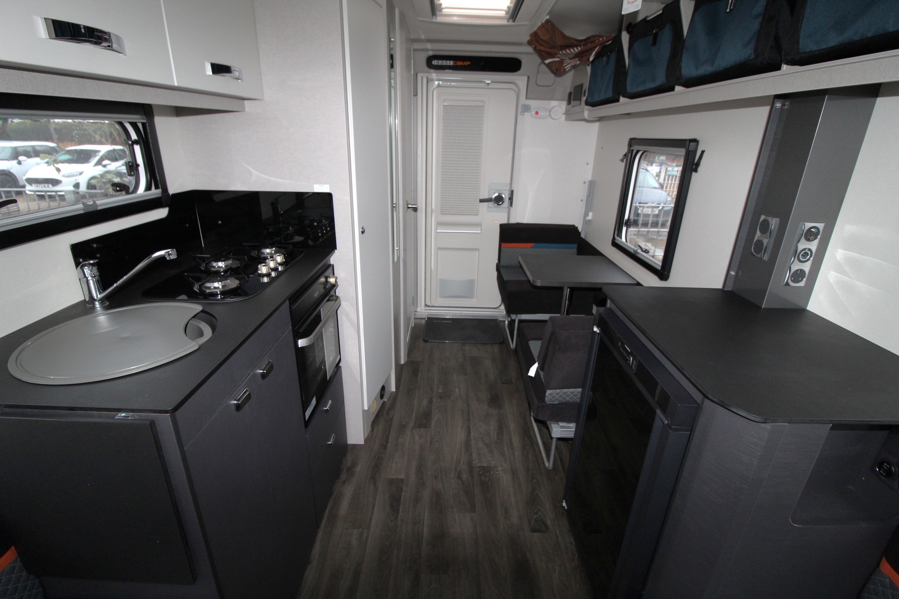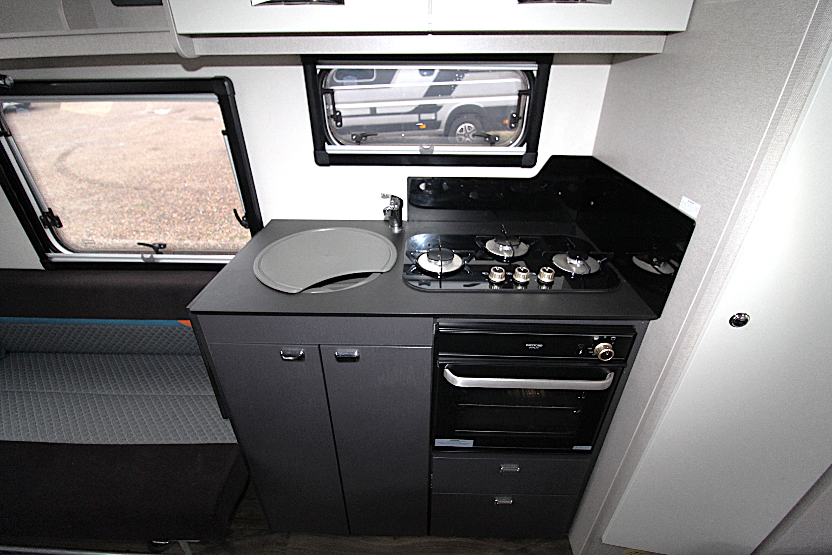 Featuring a versatile layout with a front lounge that converts to a large double bed and a side dinette that creates two bunk beds, with a curtain for privacy. It includes a modern kitchen with a three-burner hob and oven, Dometic 83 litre fridge with a removable freezer compartment, a washroom with a shower and toilet, and a durable construction with SMART construction and a GRP (Glass Reinforced Plastic) body. A dual fuel space saving under-floor Whale heater, with blown air central heating system and a rapid water heater make it ideal for year-round use.