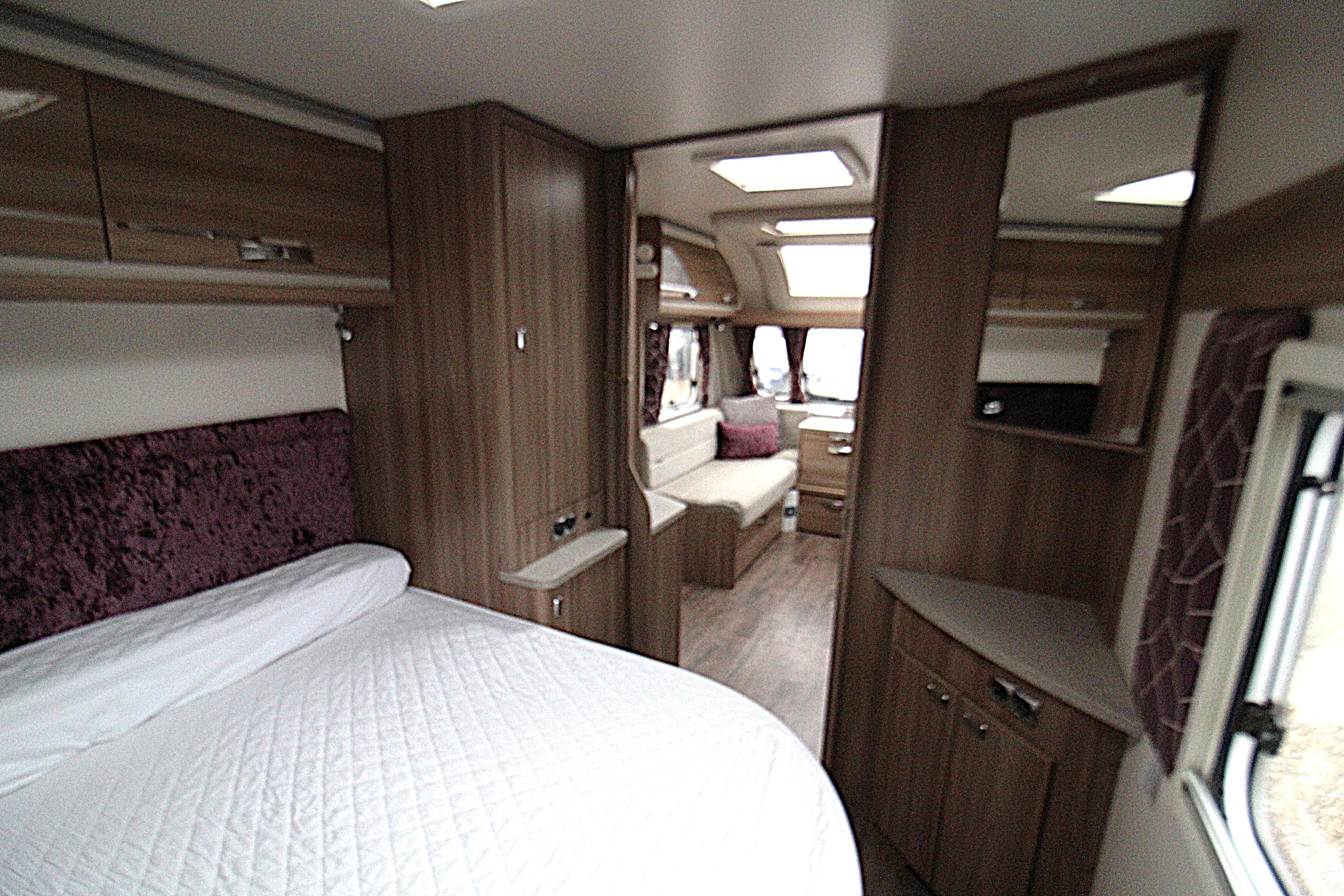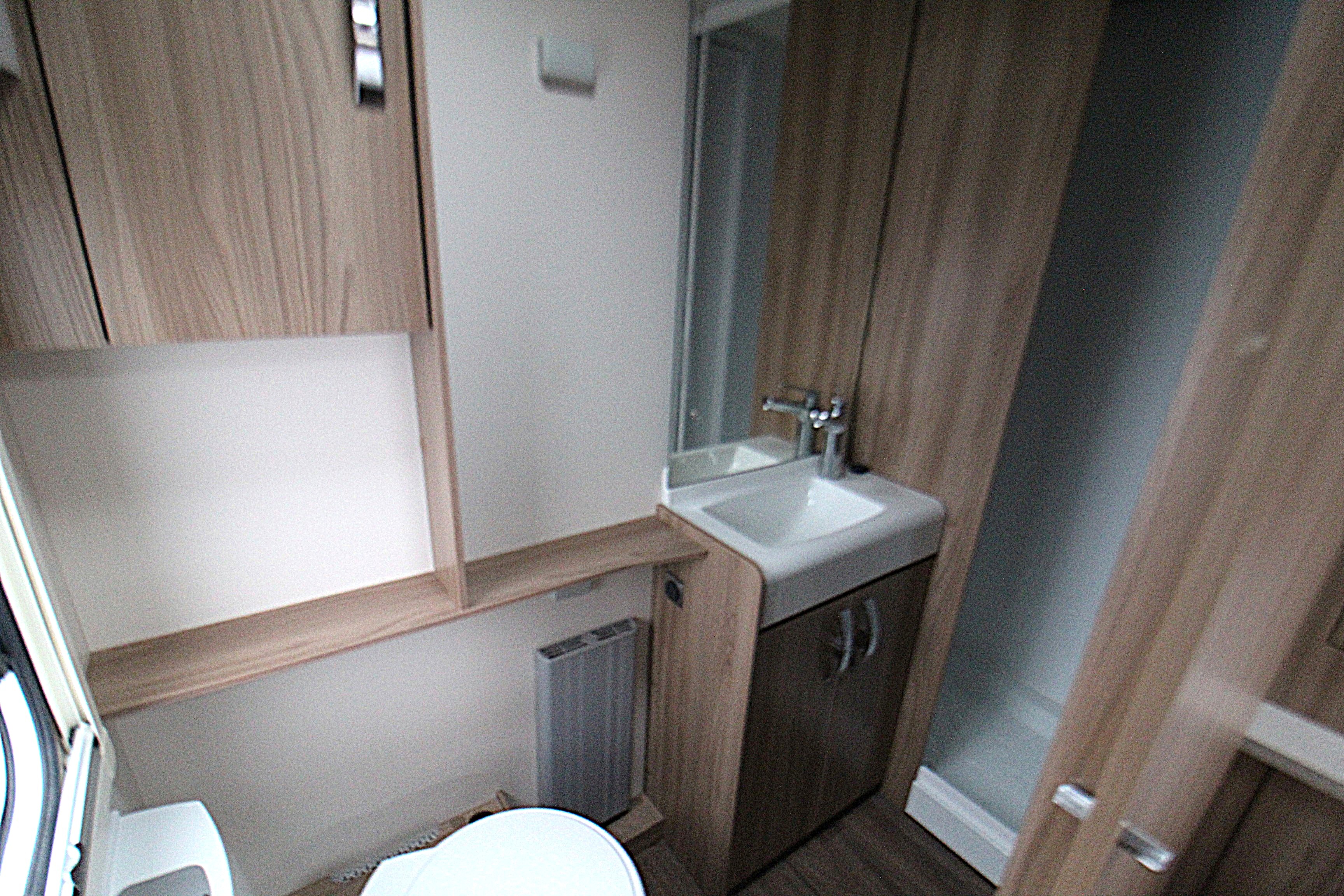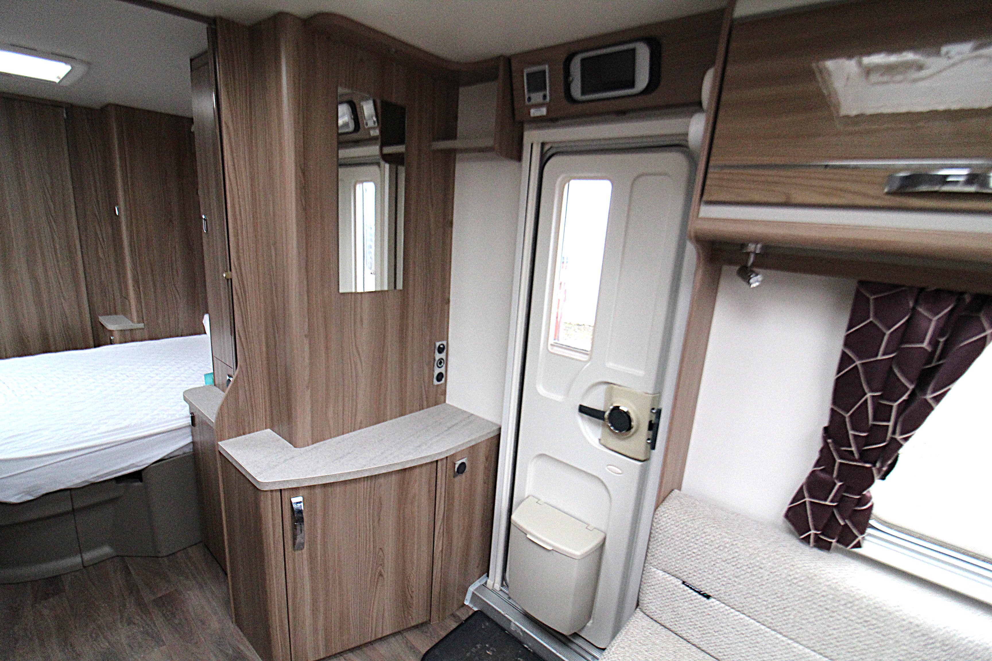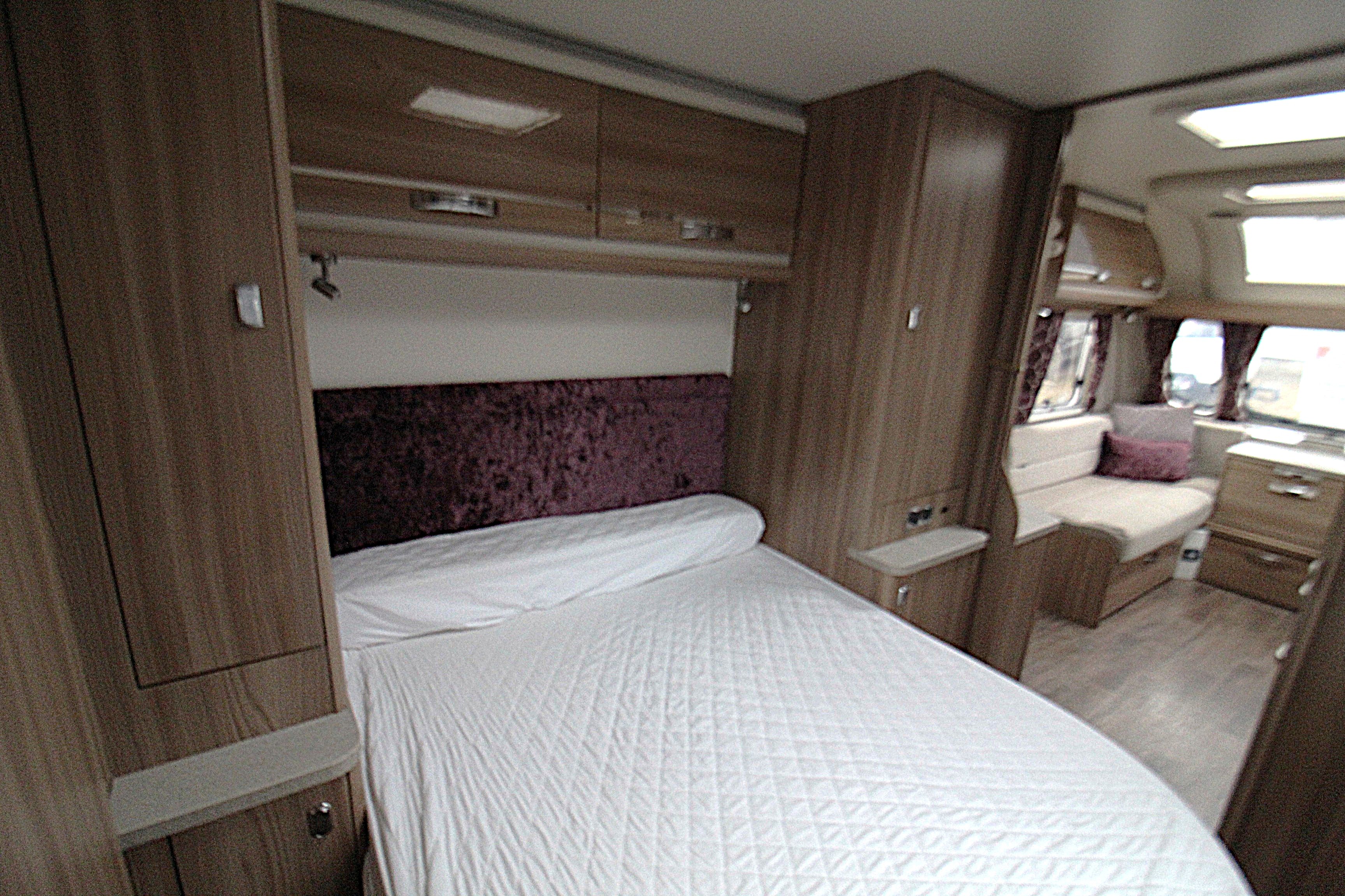The interior is bright and modern, featuring a well-appointed lounge area that converts easily into a double bed. A well fitted kitchen provides a dual fuel hob, oven, fridge microwave, ample storage and extendable workspace. Flowing through to the main bedroom area with a transverse island bed, his and hers wardrobes and overhead lockers. Access the full width bathroom from the bedroom area you will find a cassette toilet, cabinets, washbasin with mirror over, and a shower cubicle.