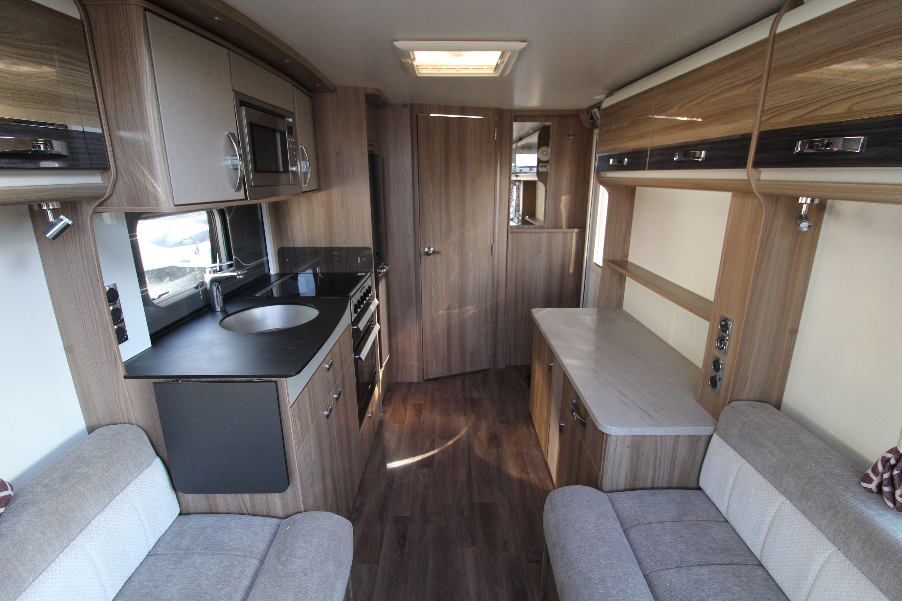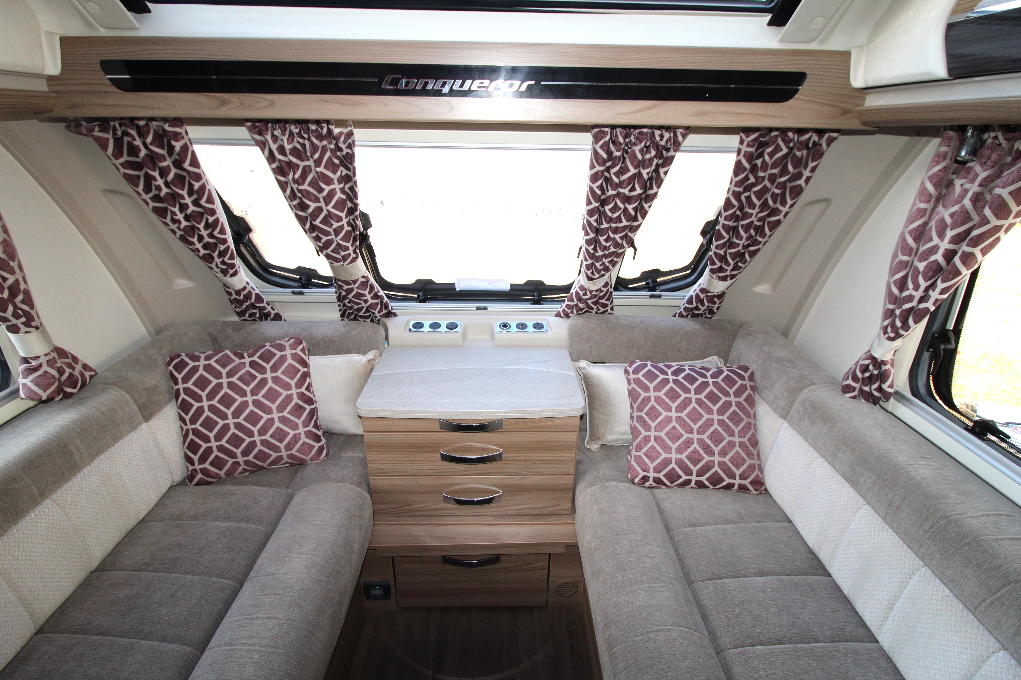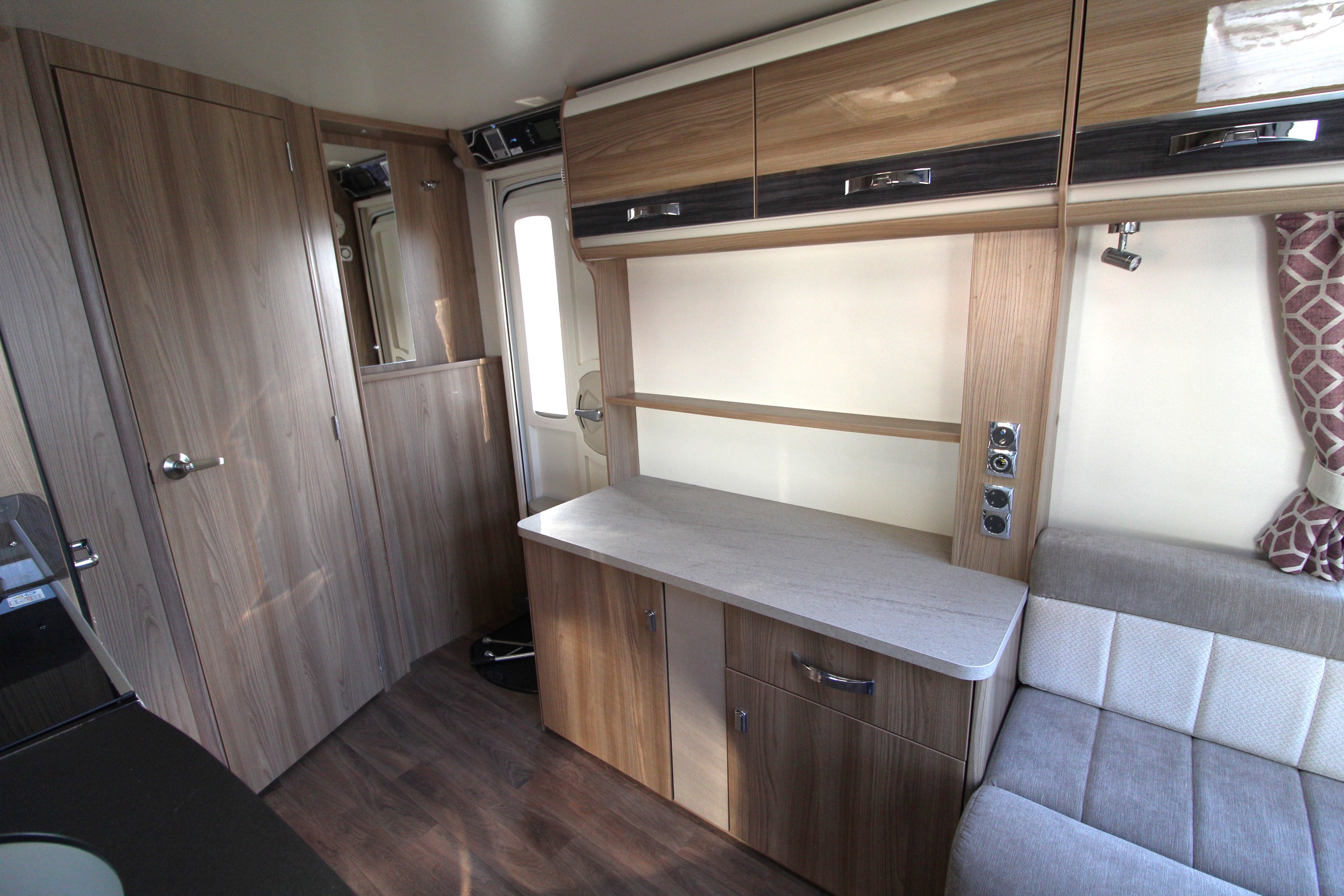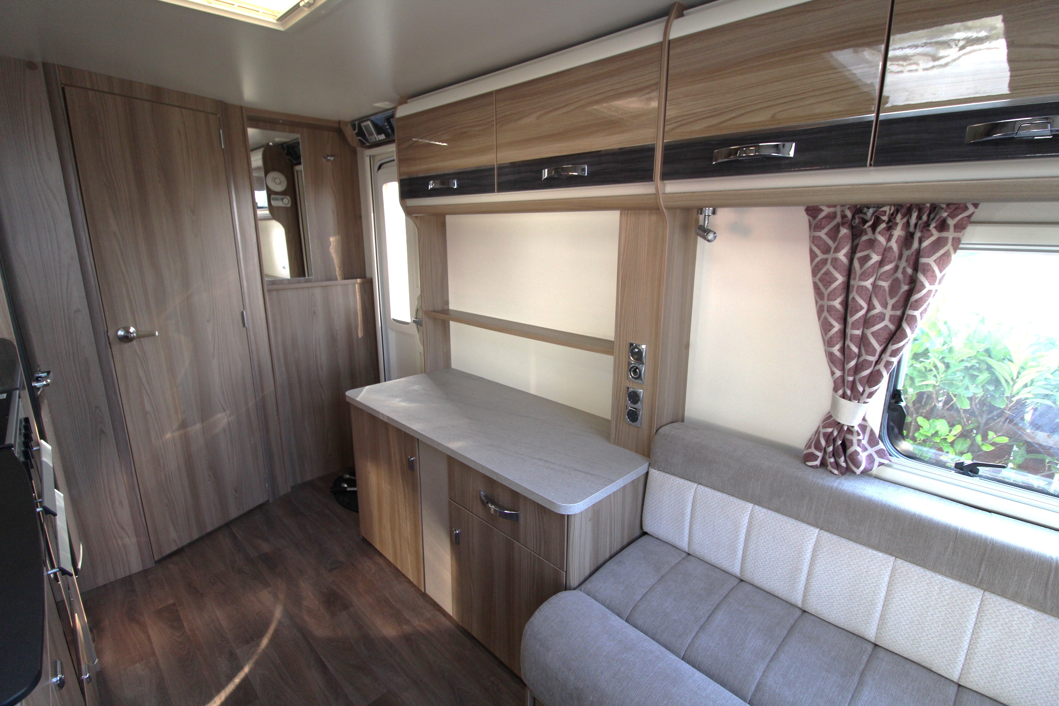 Presenting a spacious front lounge area with face to face seating, centre chest of drawers/coffee table, overhead lockers and under bench storage. Use as two single beds on a night or convert to one large double bed. Moving towards the rear, a large display cupboard offers additional storage and a surface for your television to be displayed.