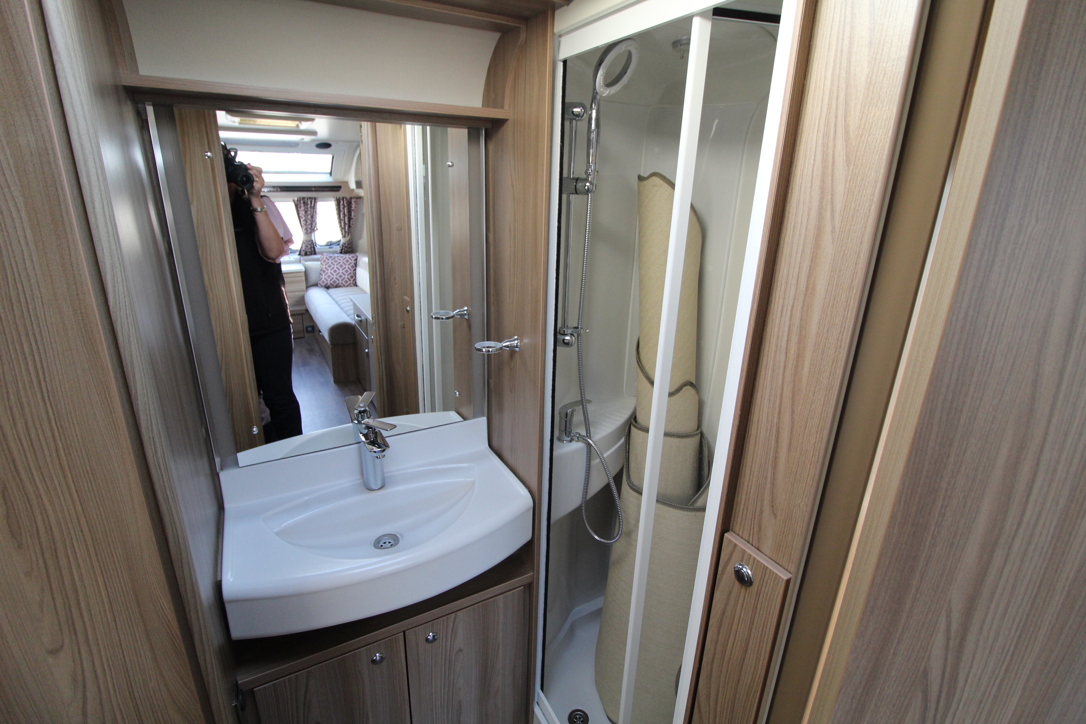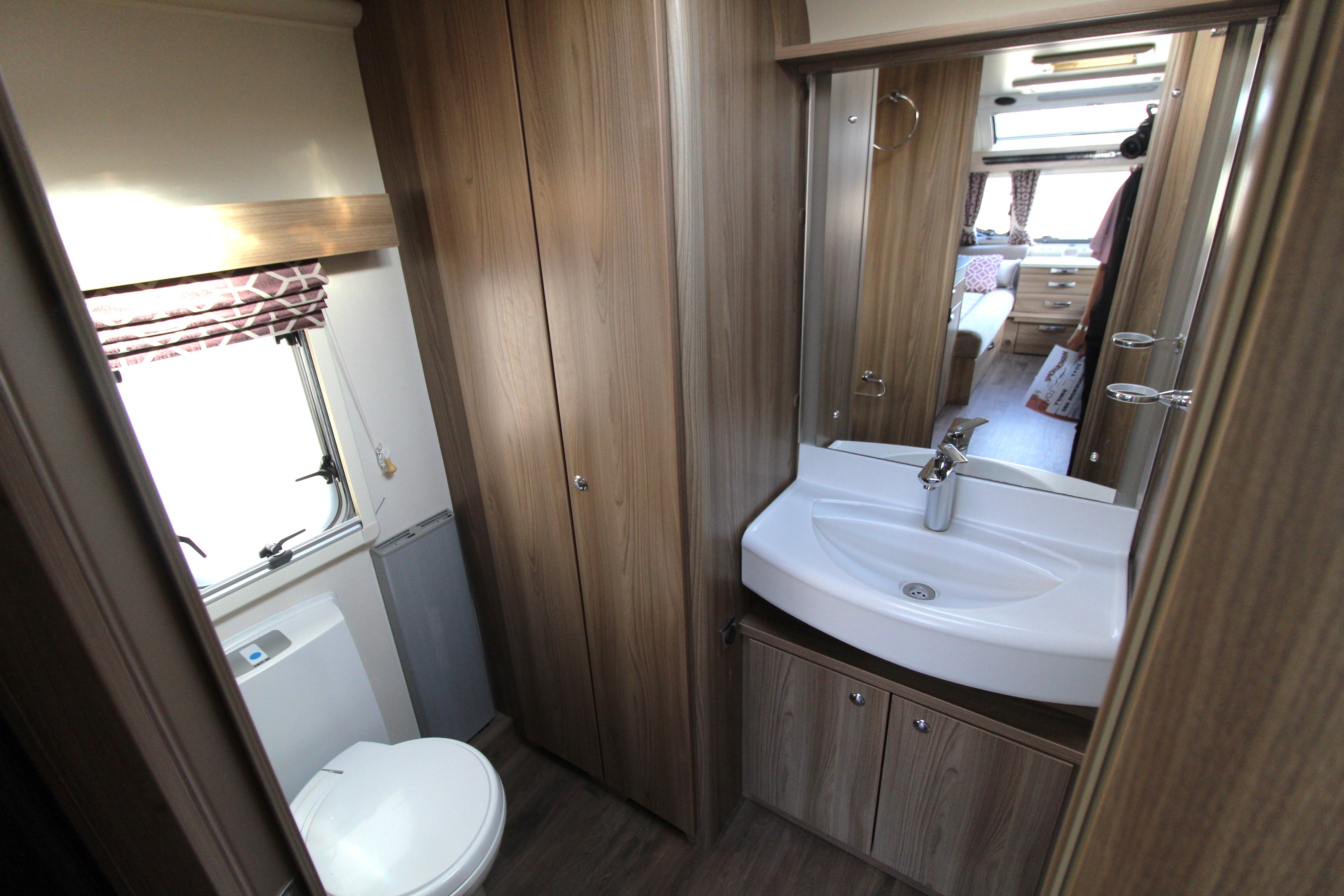 The large end washroom/dressing room offers double wardrobe, cassette toilet, vanity sink unit with mirror over and a shower cubicle.