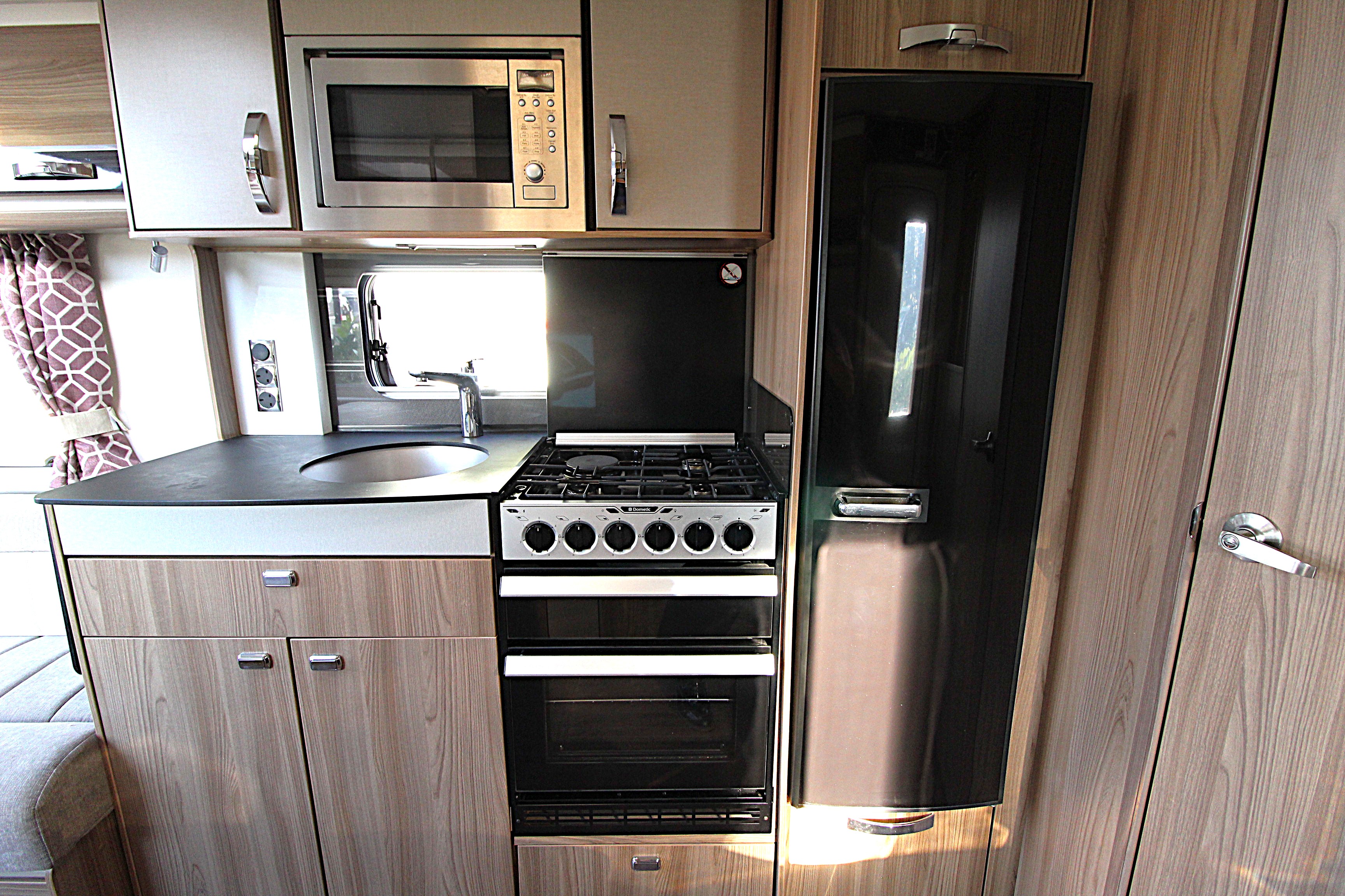 Kitchen facilities include dual fuel hob, oven and grill, overhead microwave and large fridge with freezer compartment.