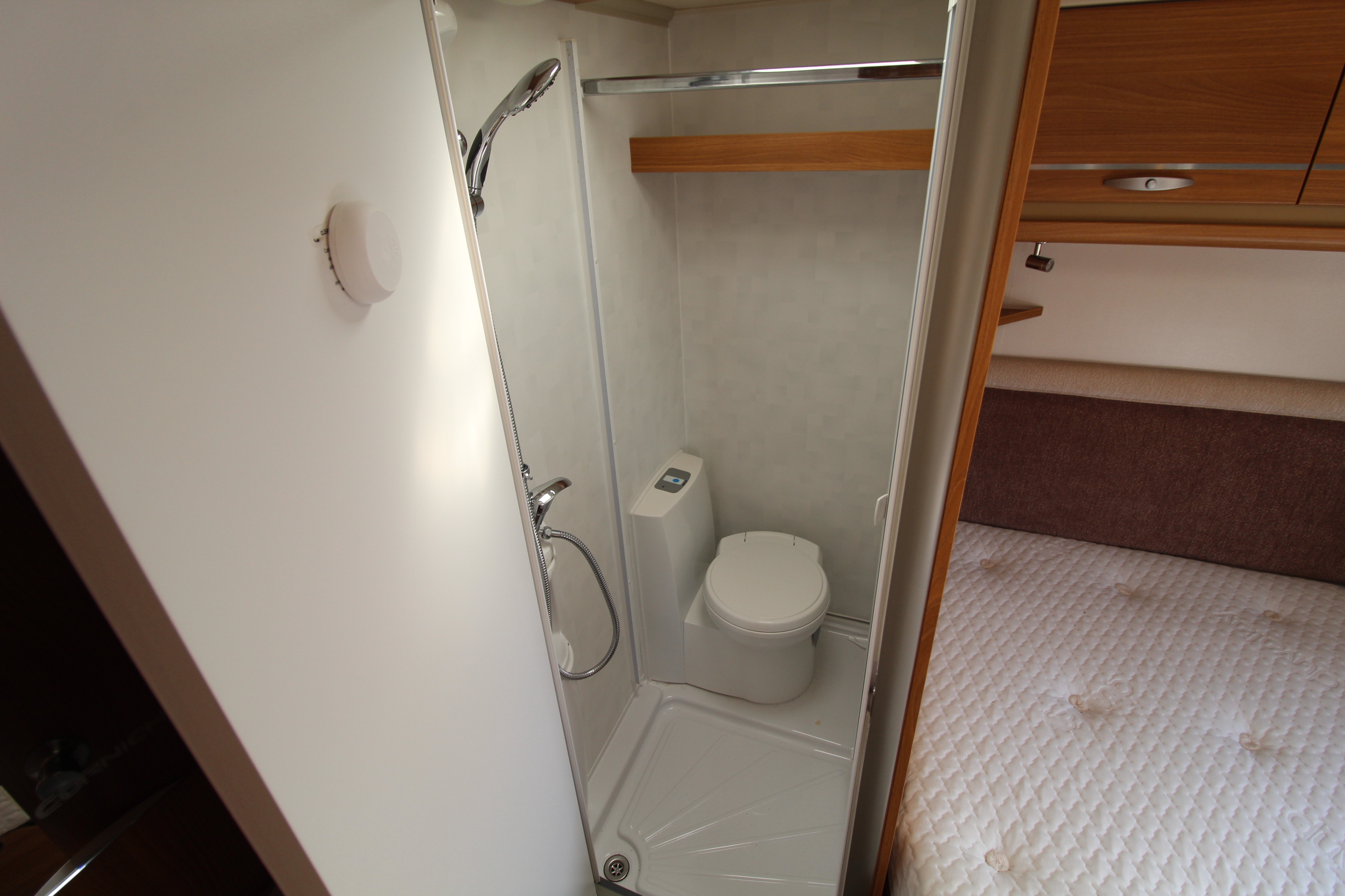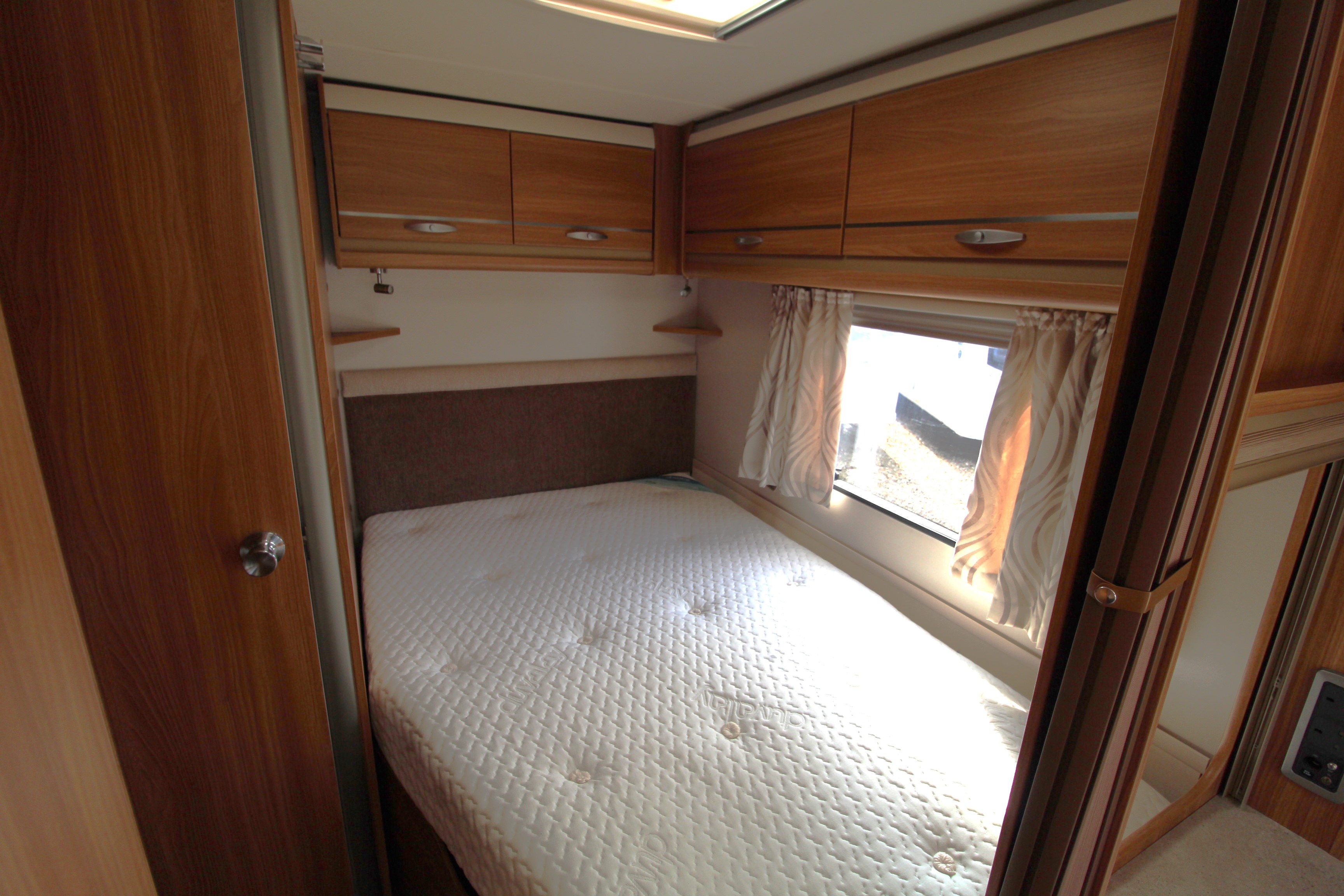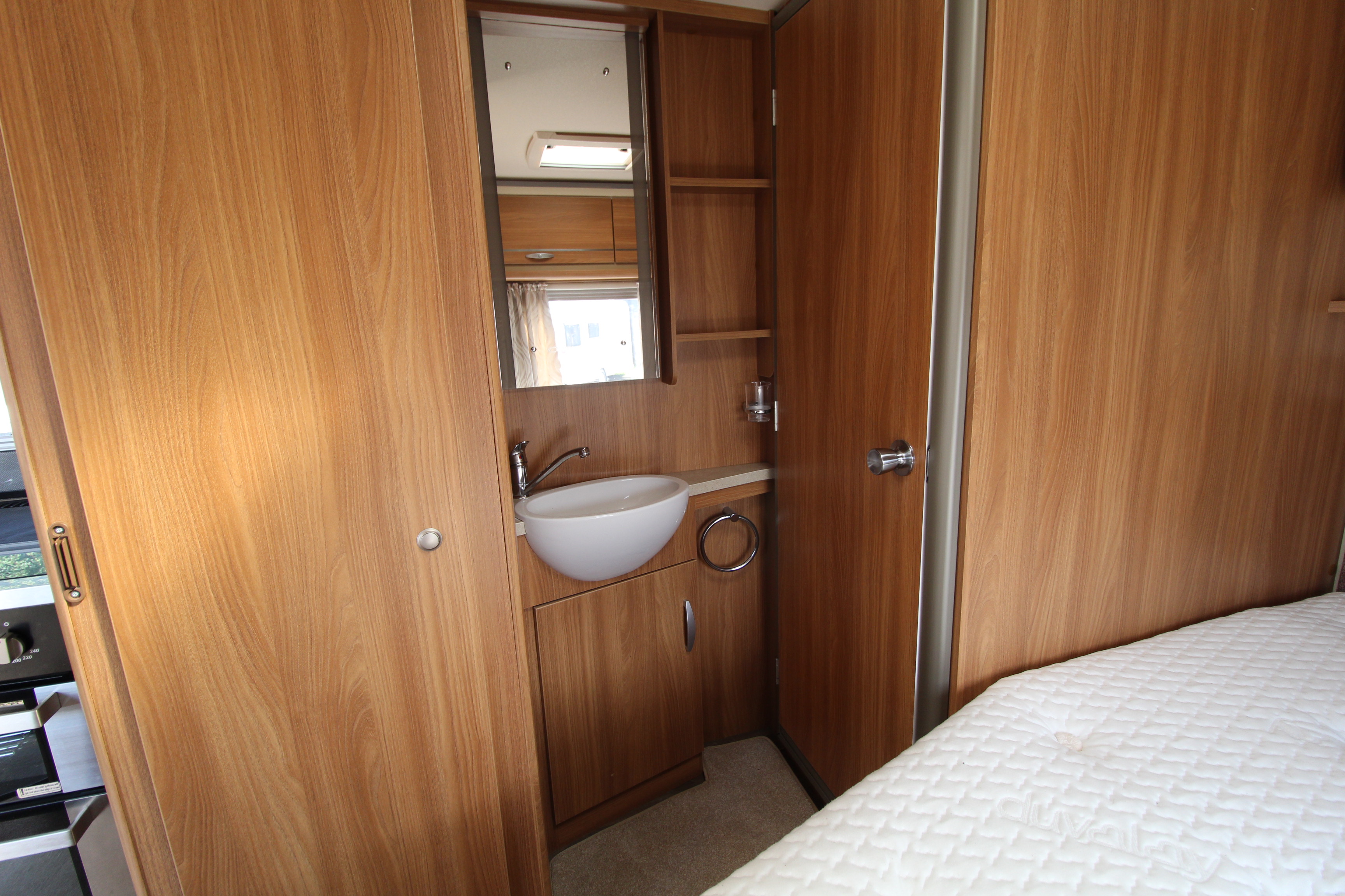 Moving into the main bedroom area you will find a fixed French bed with overhead lockers, wardrobe, washbasin and vanity area and access through to the wet floor washroom with cassette toilet and shower area.