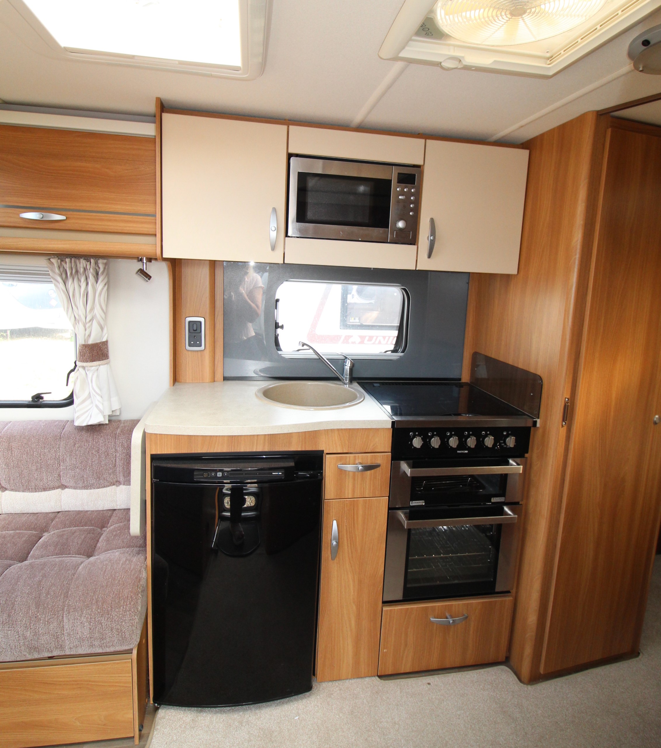 There is a well-equipped central kitchen complete with hob, oven, fridge, microwave and ample storage cupboards work surface. Opposite the kitchen area is a large display unit with cupboard over.