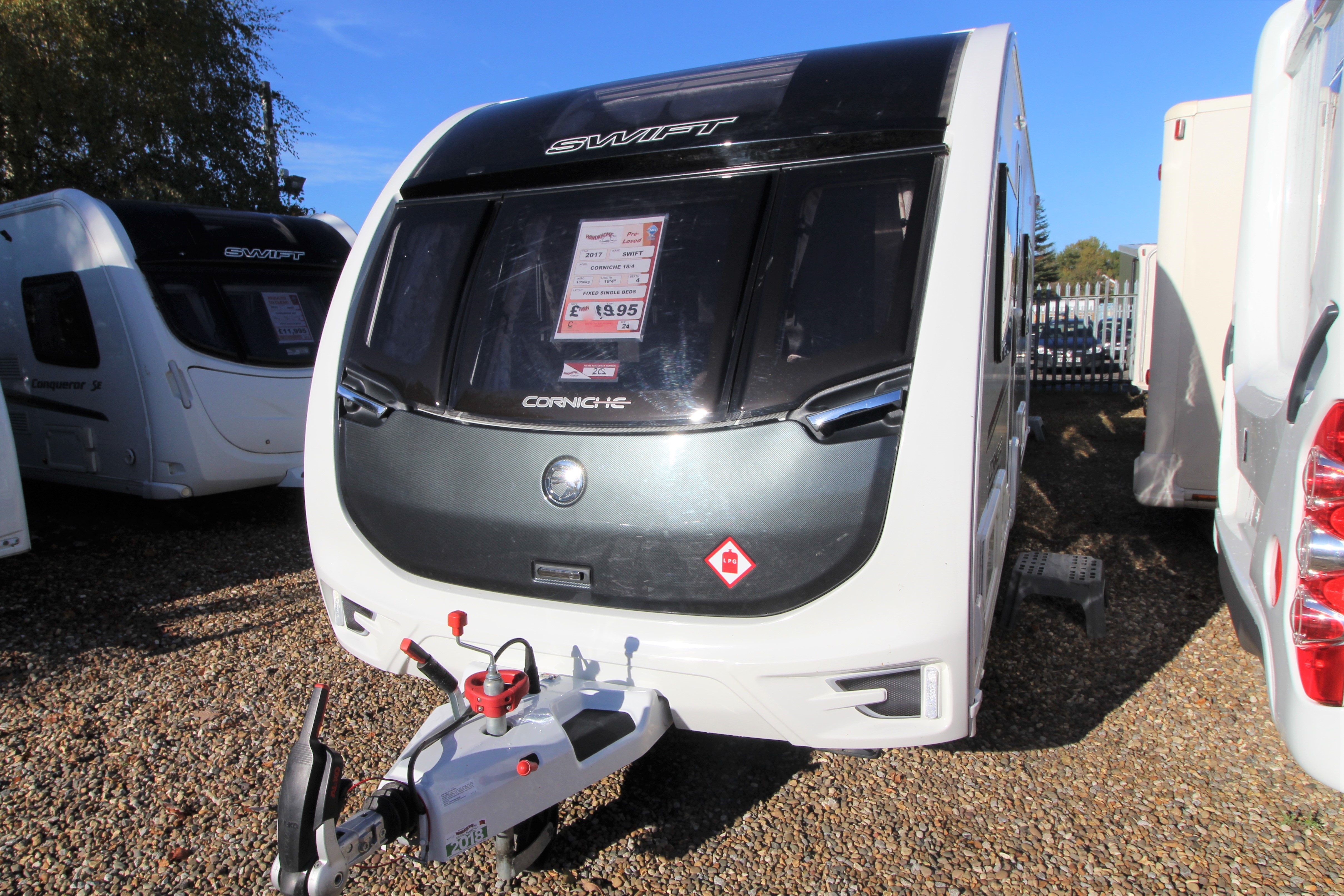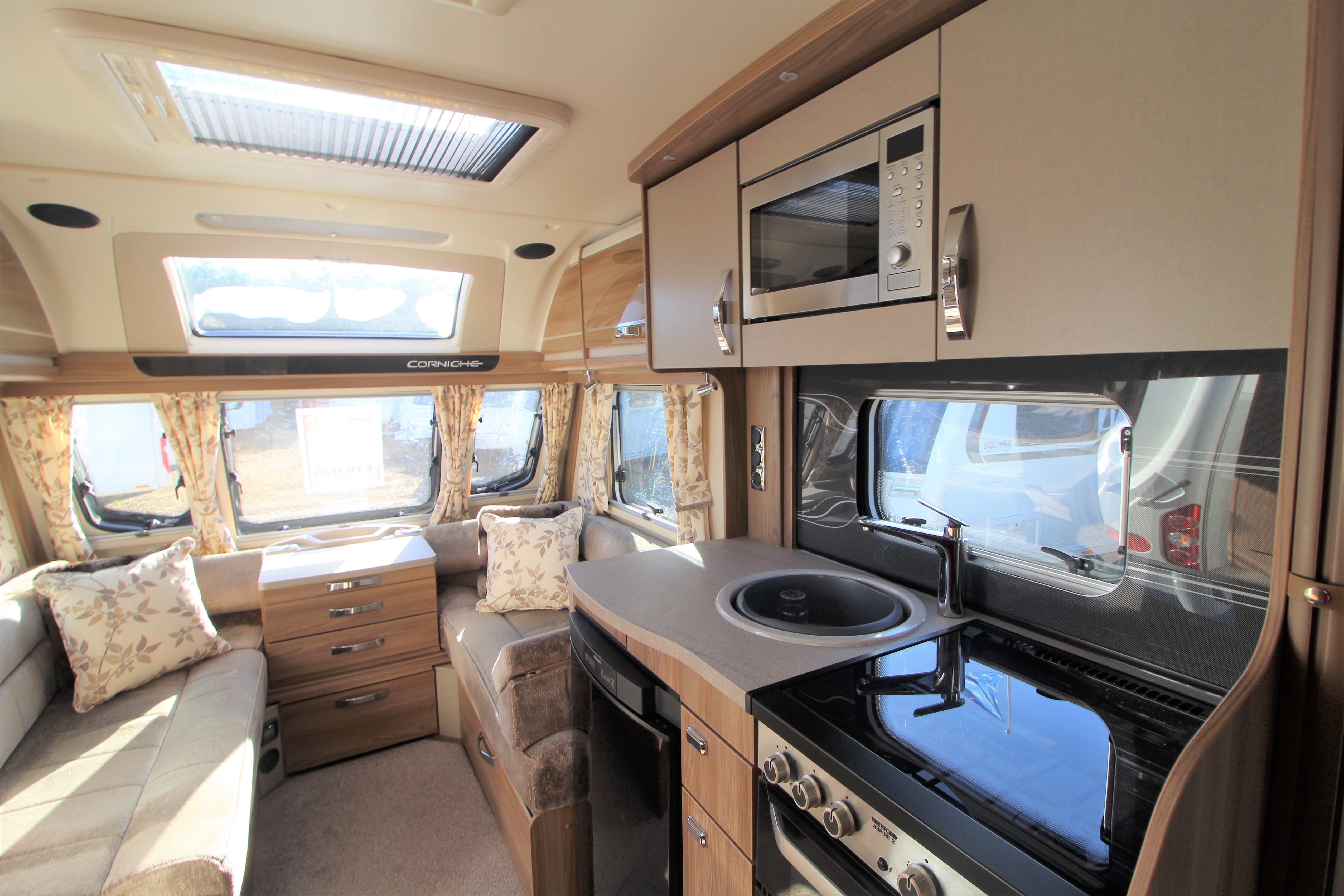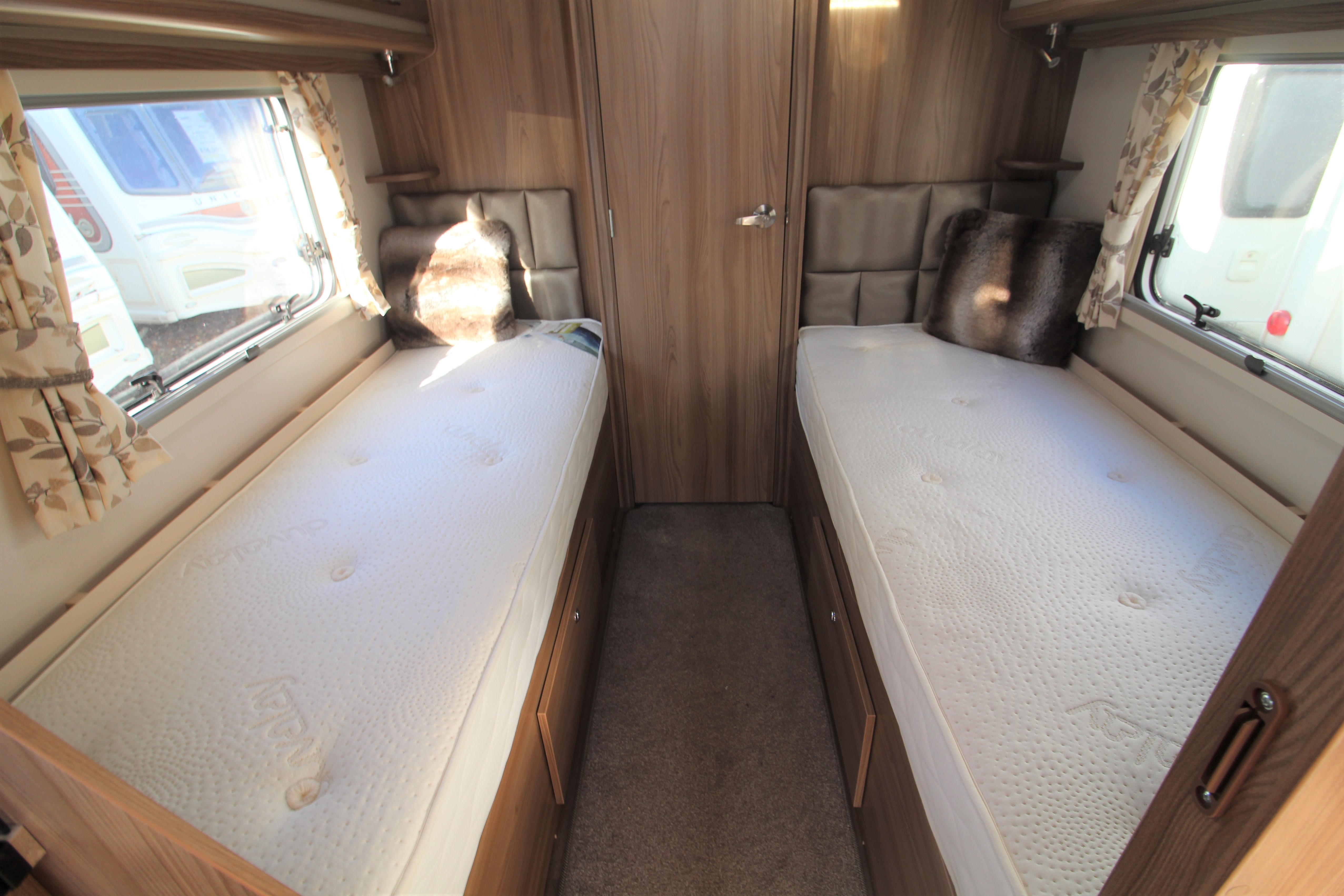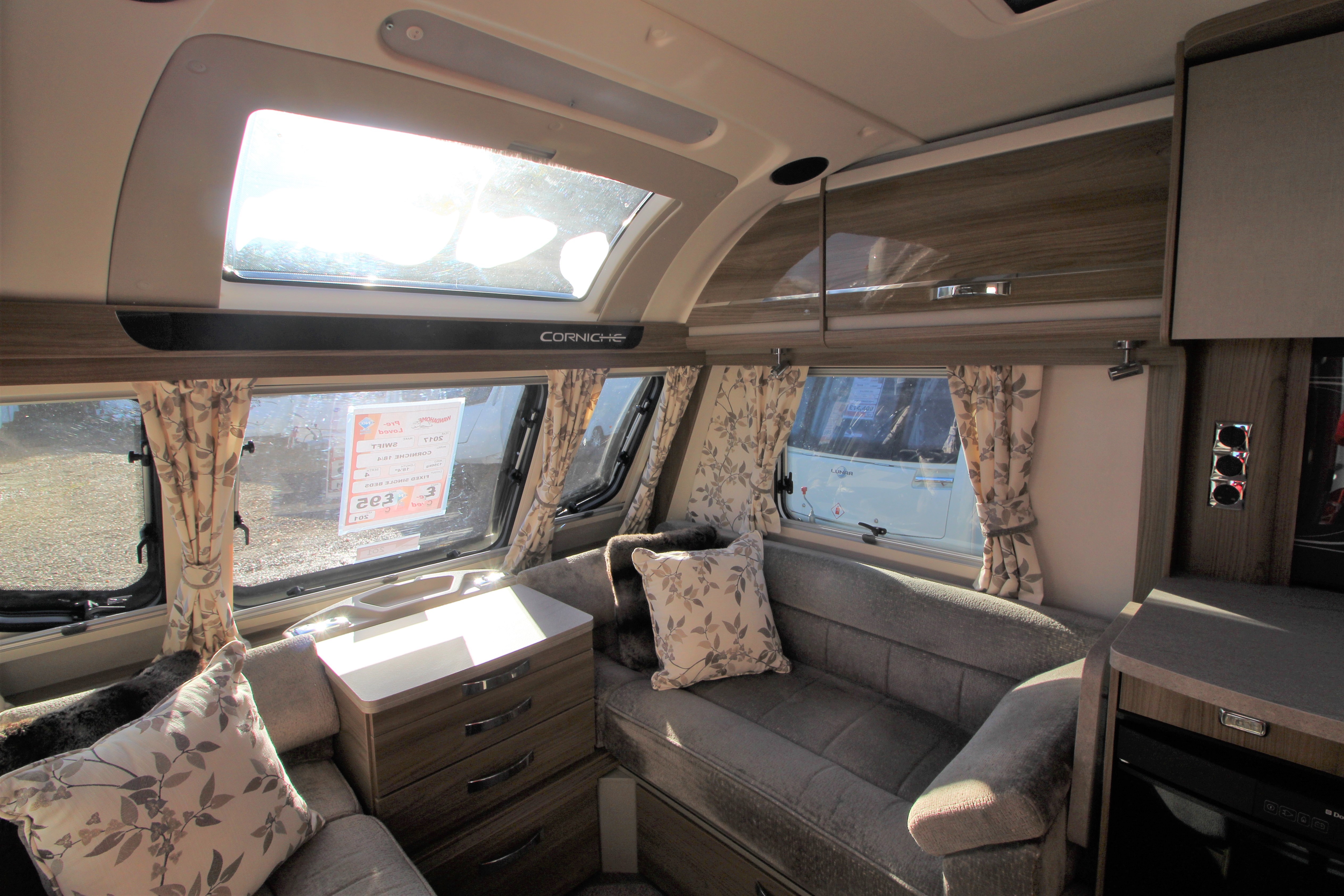 This stunning 2017 Corniche 18/4 is a Wandahome Special Edition and comes with an extremely high spec and beautifully designed interior. The fixed single beds provide practicality and comfort for either a family with small children or a couple who enjoy a little extra space and convenience. Fitted extras include, a Solar Panel, Alarm, External Gas BBQ point, and External 240v Socket plus many more. The bright and contempoary lounge has latest colour designs and offers a small double should it be needed. Theres plenty of Storage in over head lockers throughout the vehicle. The kitchen contains a gas cooker with electric hot plate-always useful should you run out of gas, a microwave, oven and grill. The Bathroom doubles up as a space to get changed in and includes extra storage space. A perfectly presented caravan that must be viewed!