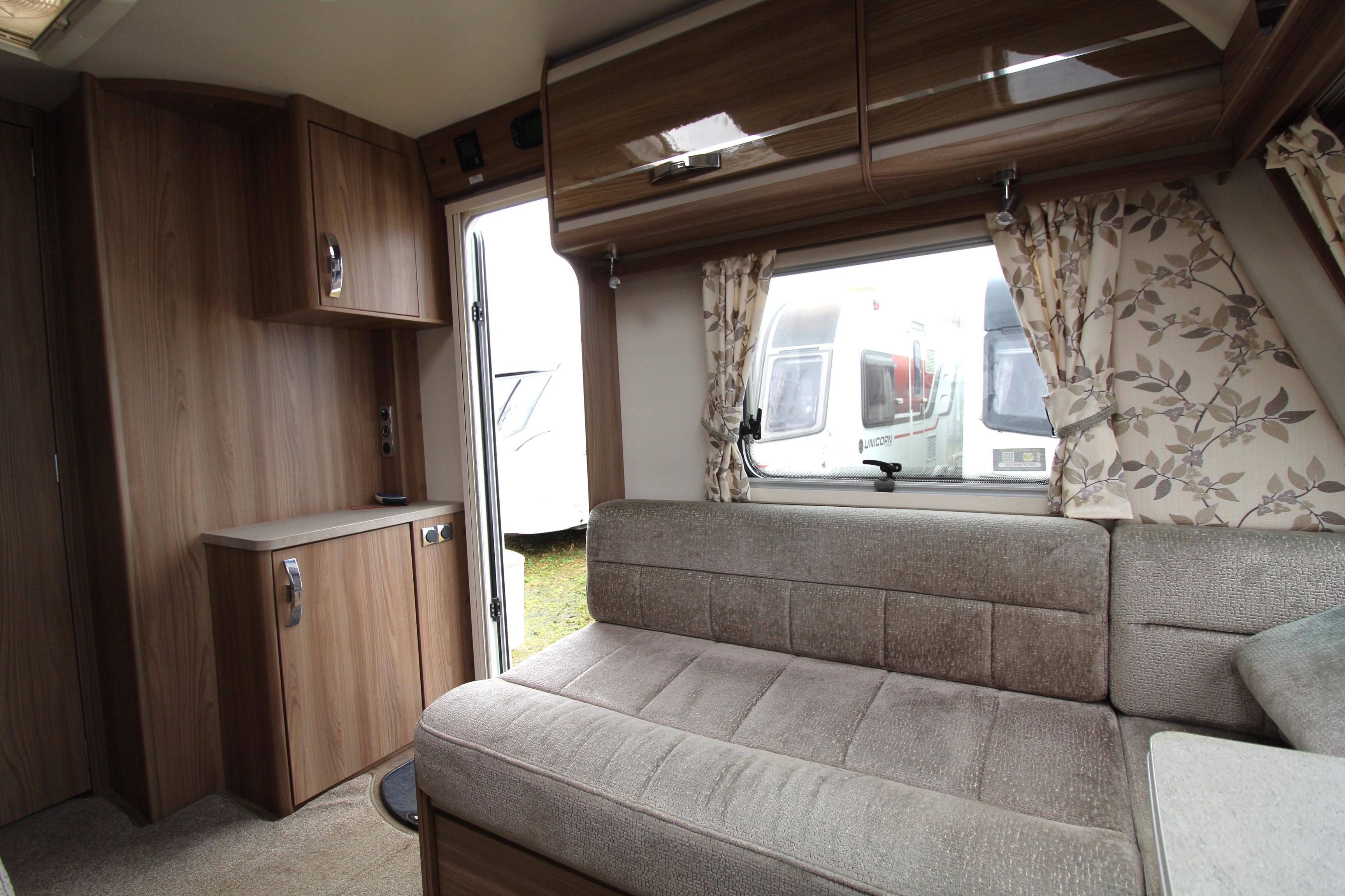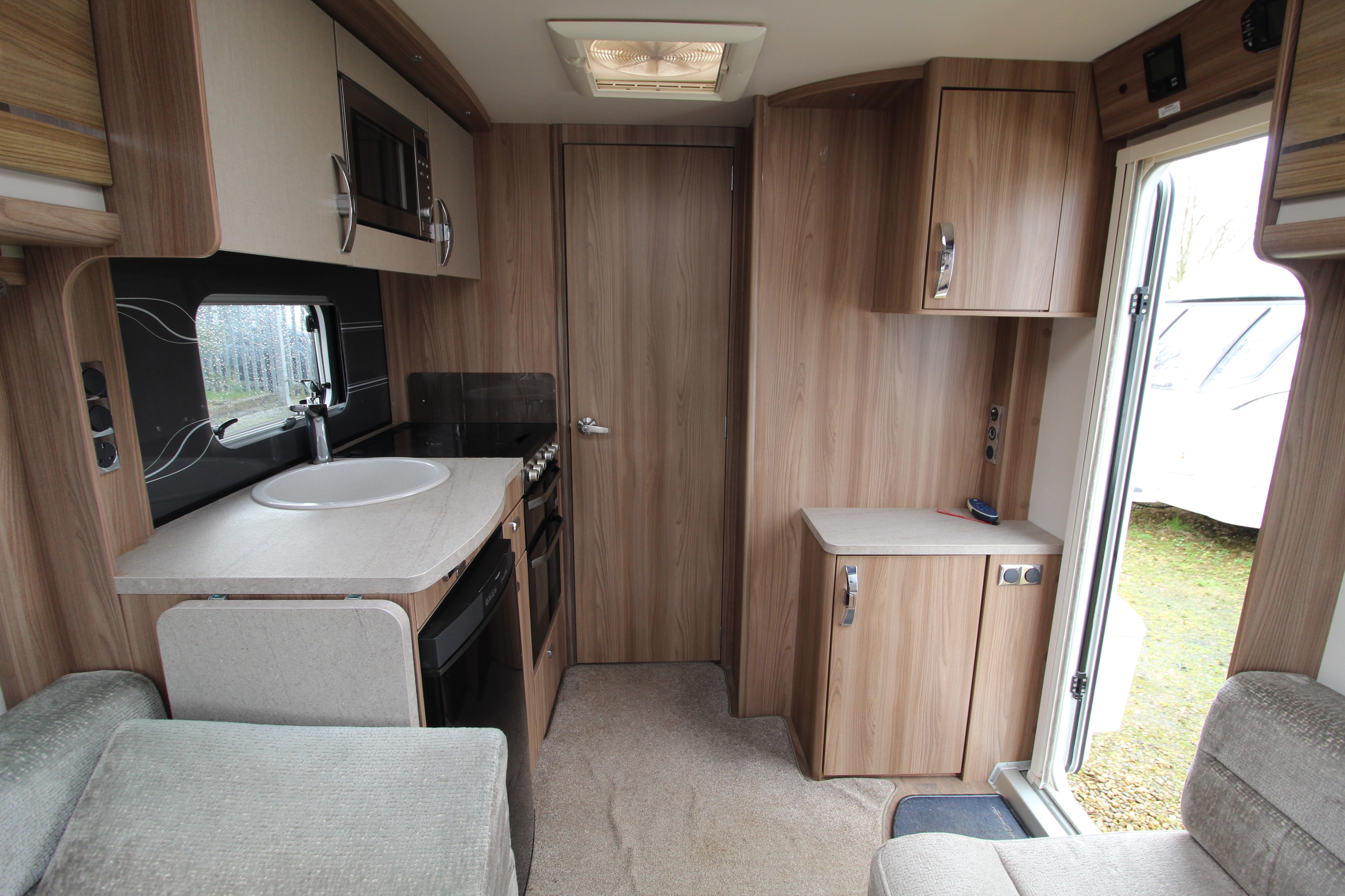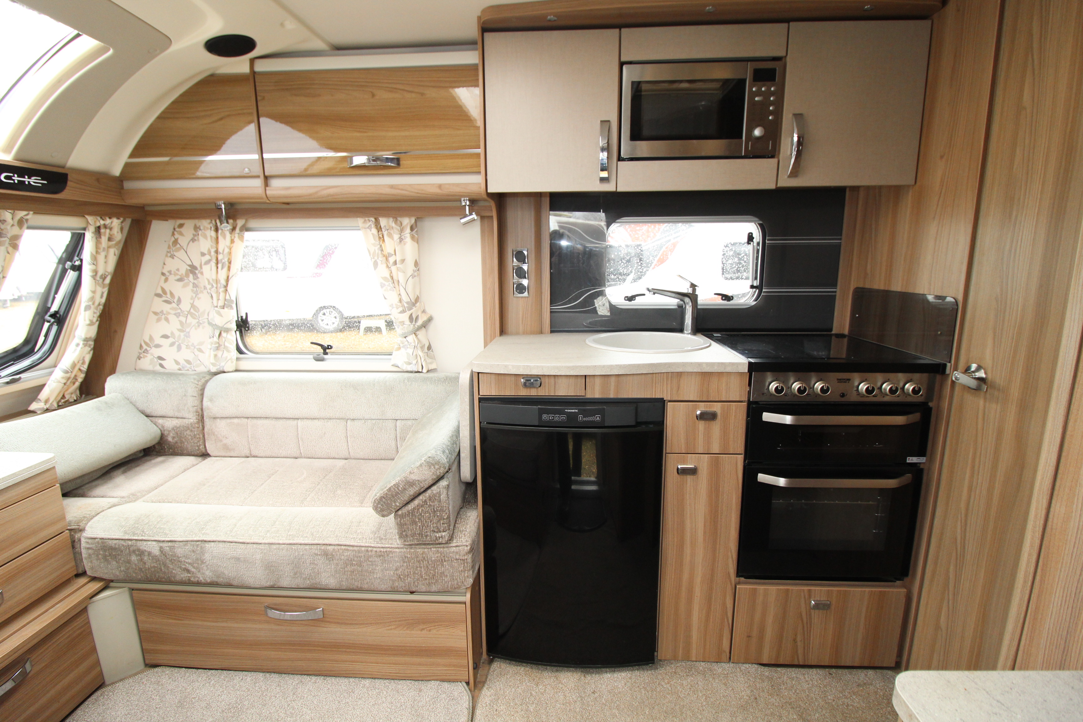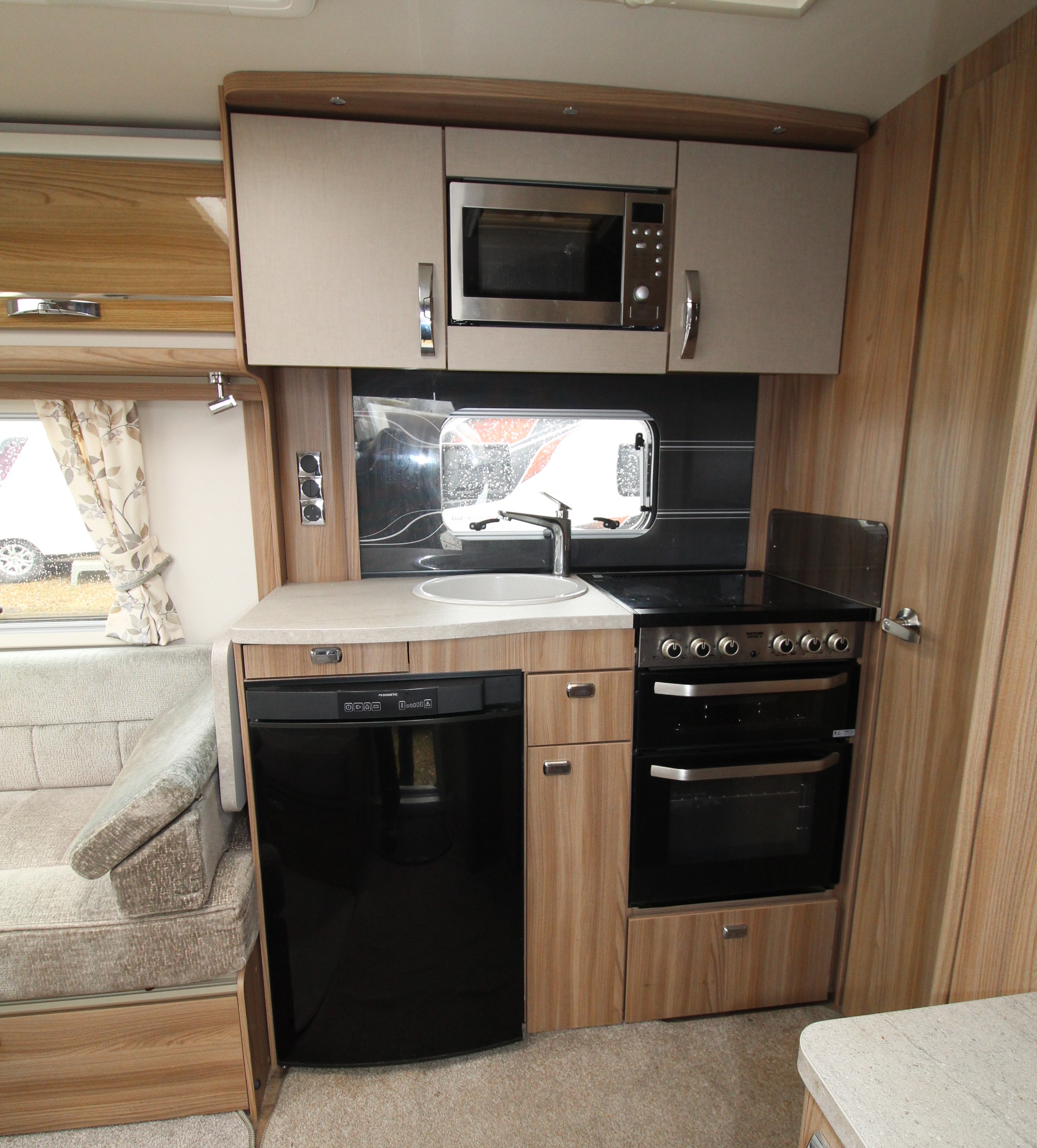 The well fitted kitchen is equipped with everything you need for a short weekend break or long touring adventures. The kitchen offers a hob, oven, grill, fridge, microwave, extendable work surface and storage cupboard units.