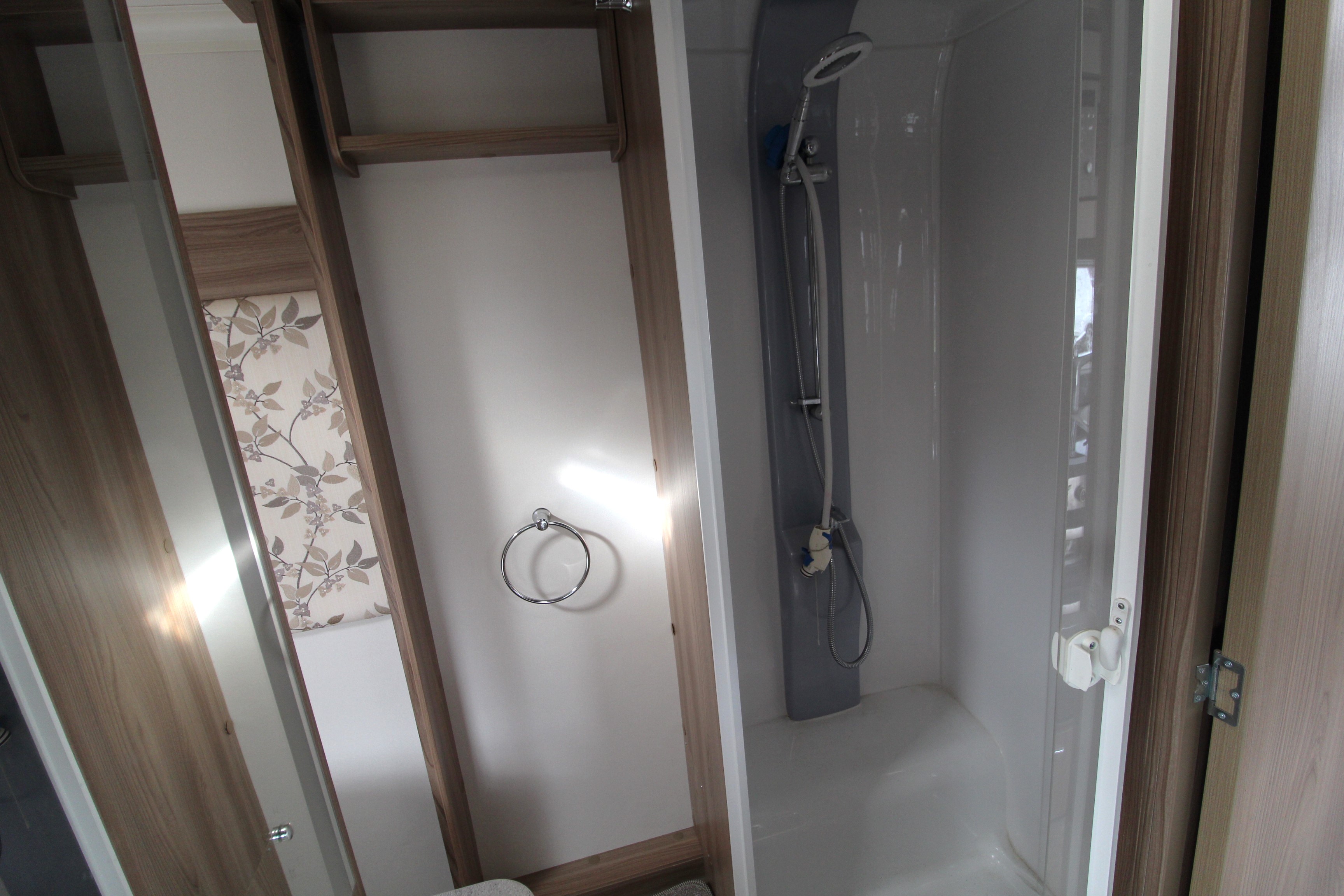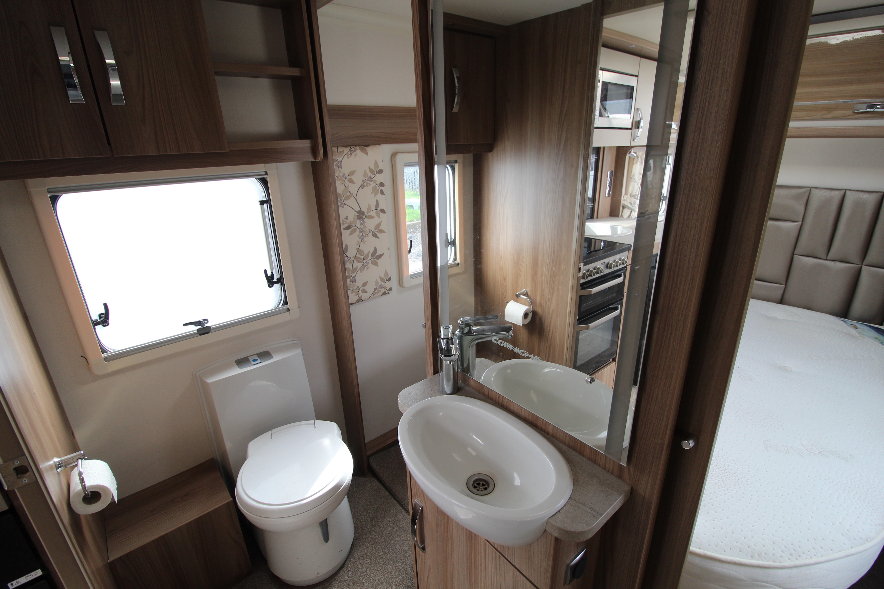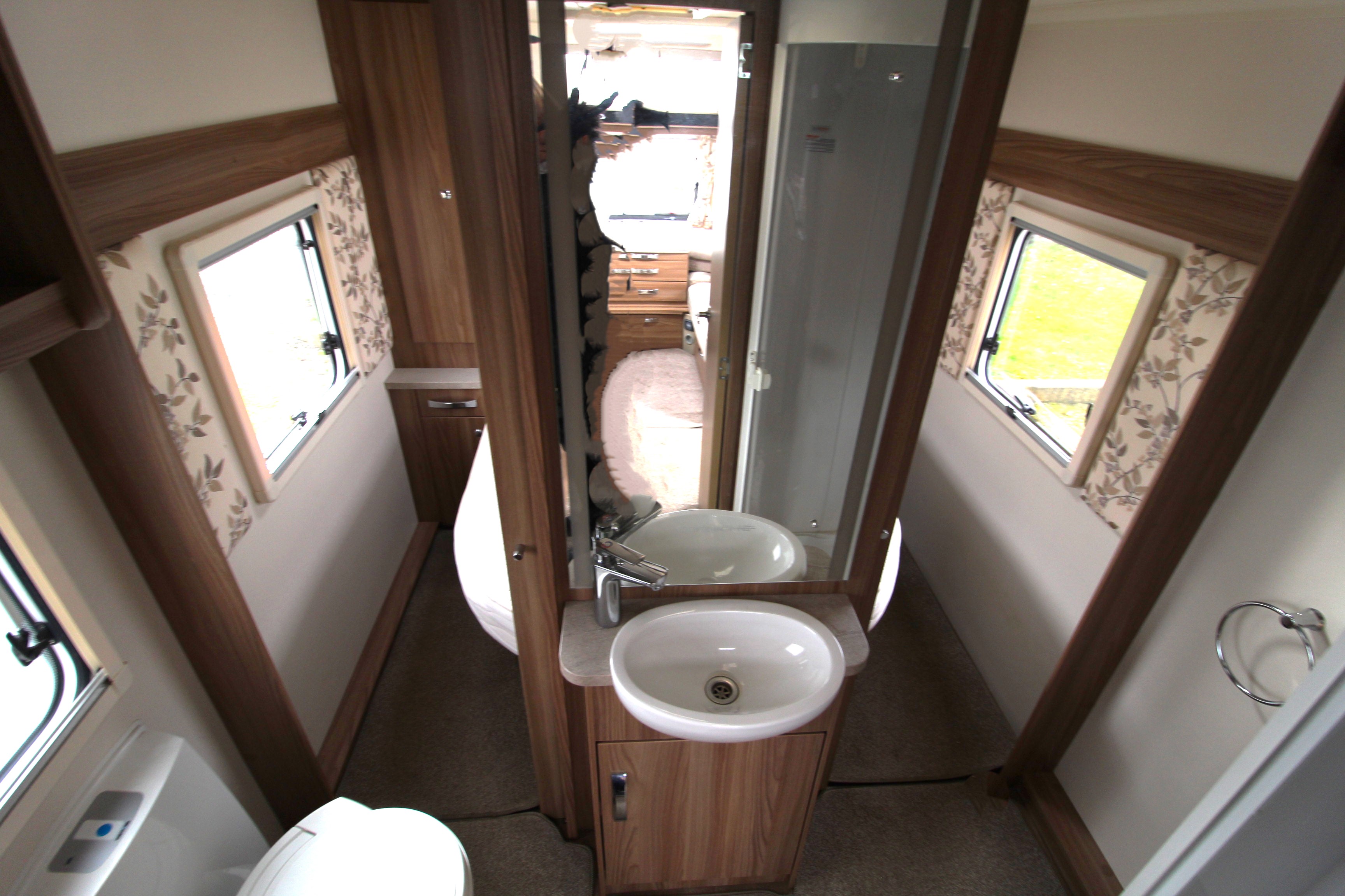 Benefitting from a centre washroom with central washbasin with mirror over and storage underneath, cassette toilet a separate corner shower cubicle.