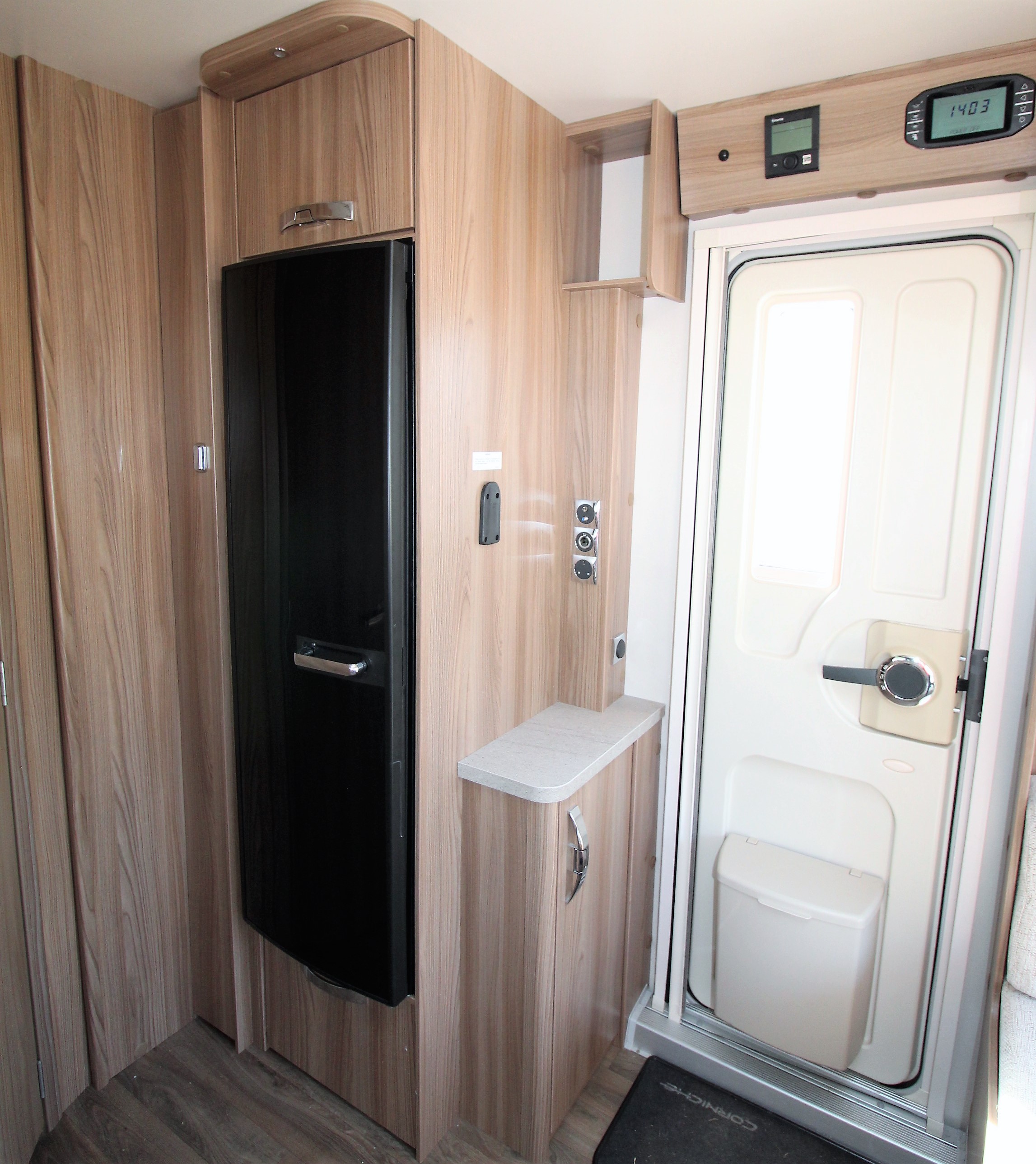 Flowing through to the central washroom with a wardrobe storage area, cassette toilet, vanity sink with mirror over and corner shower cubicle.