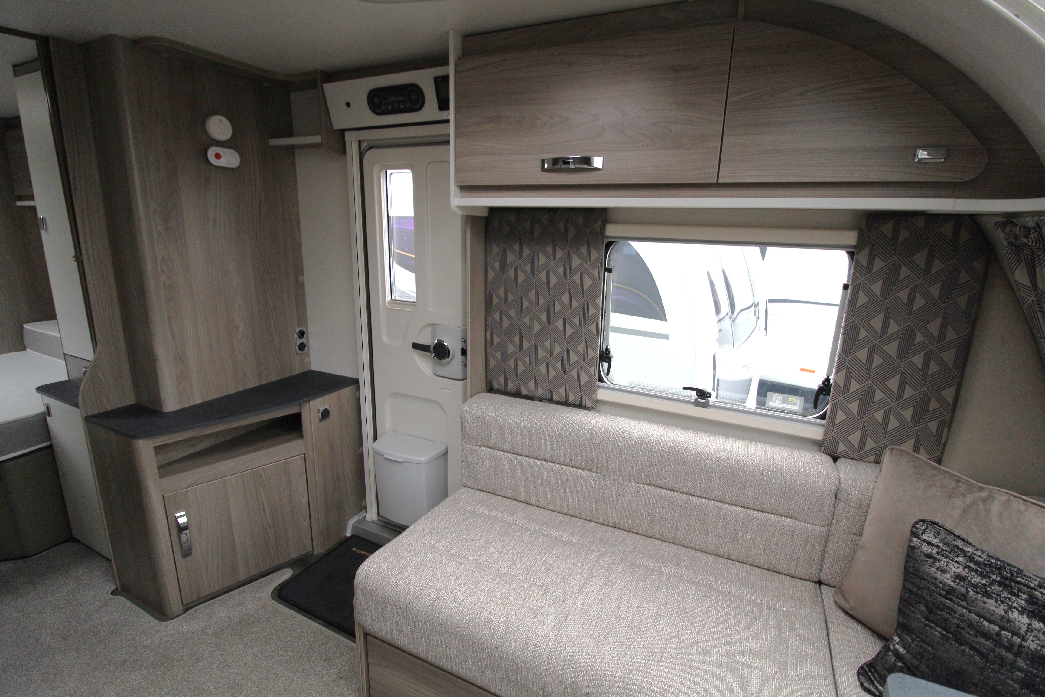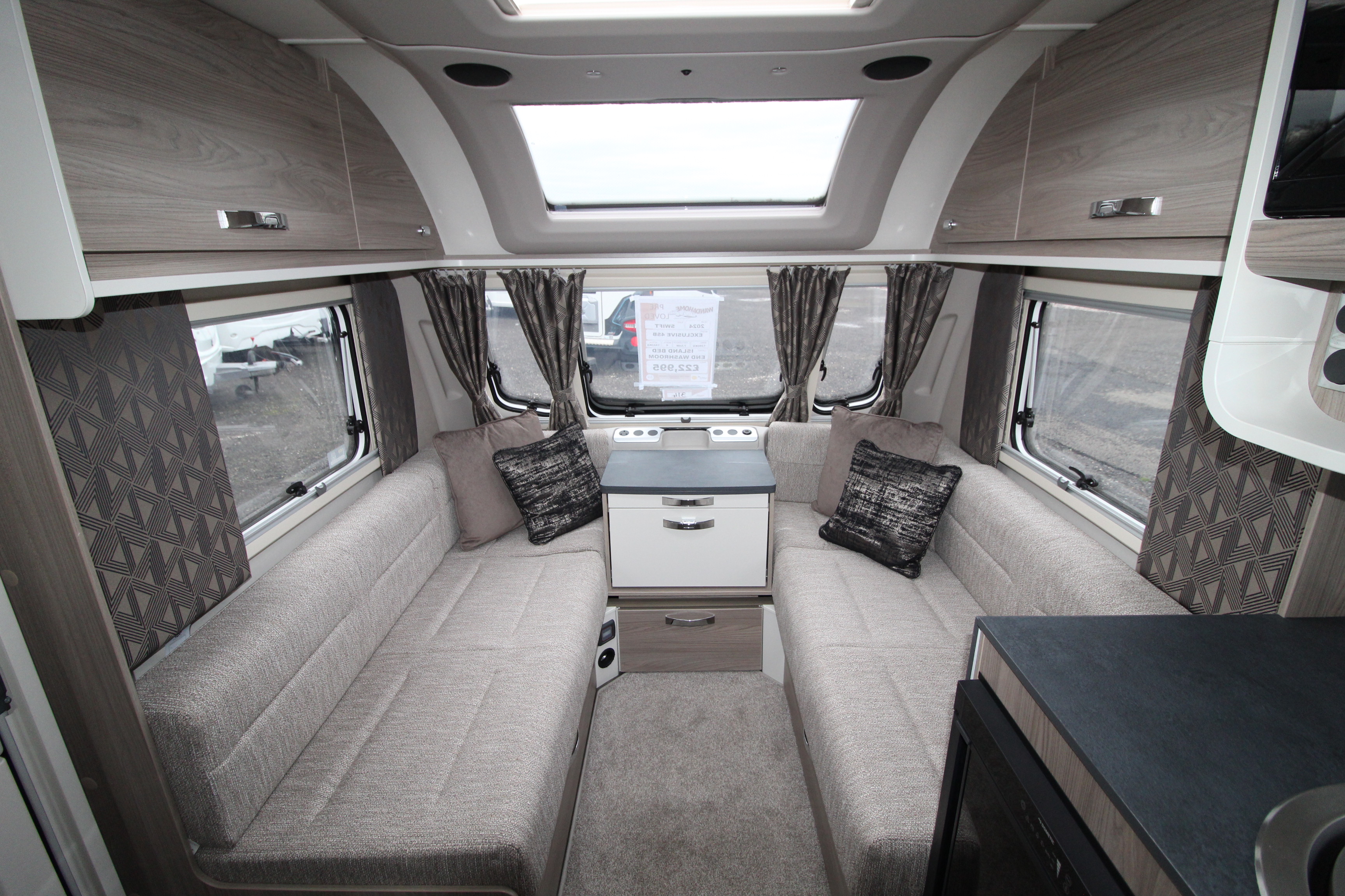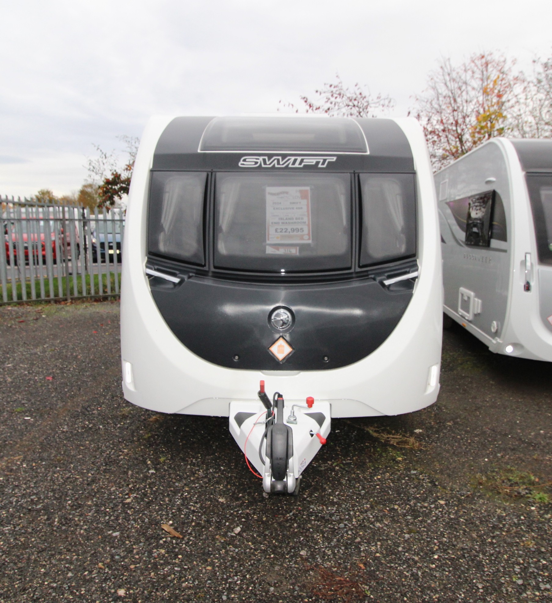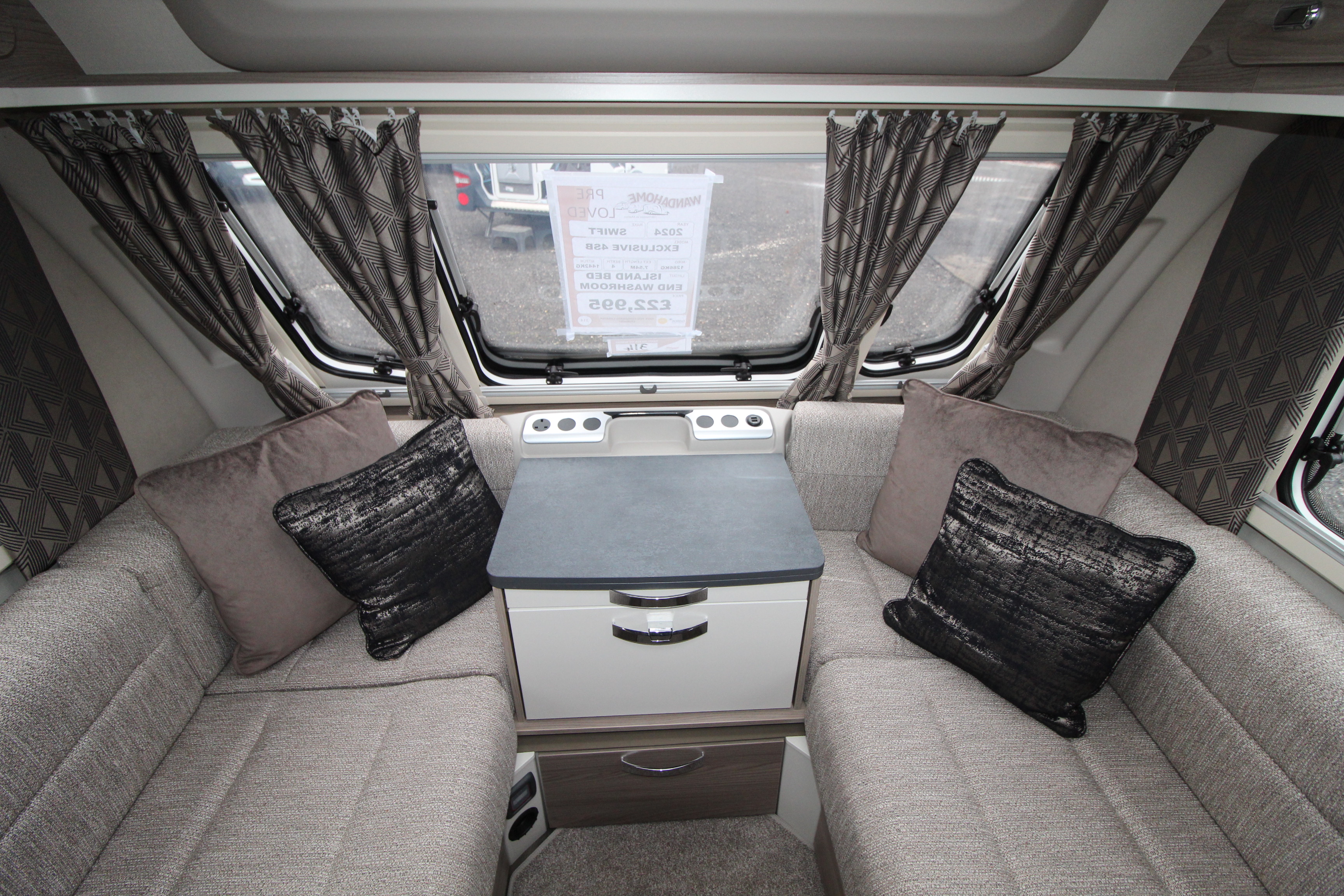 Step inside this pre-loved 2024 Swift Exclusive 4 SB, special-edition, four-berth caravan presenting an open plan layout with transverse island bed and full width end washroom.