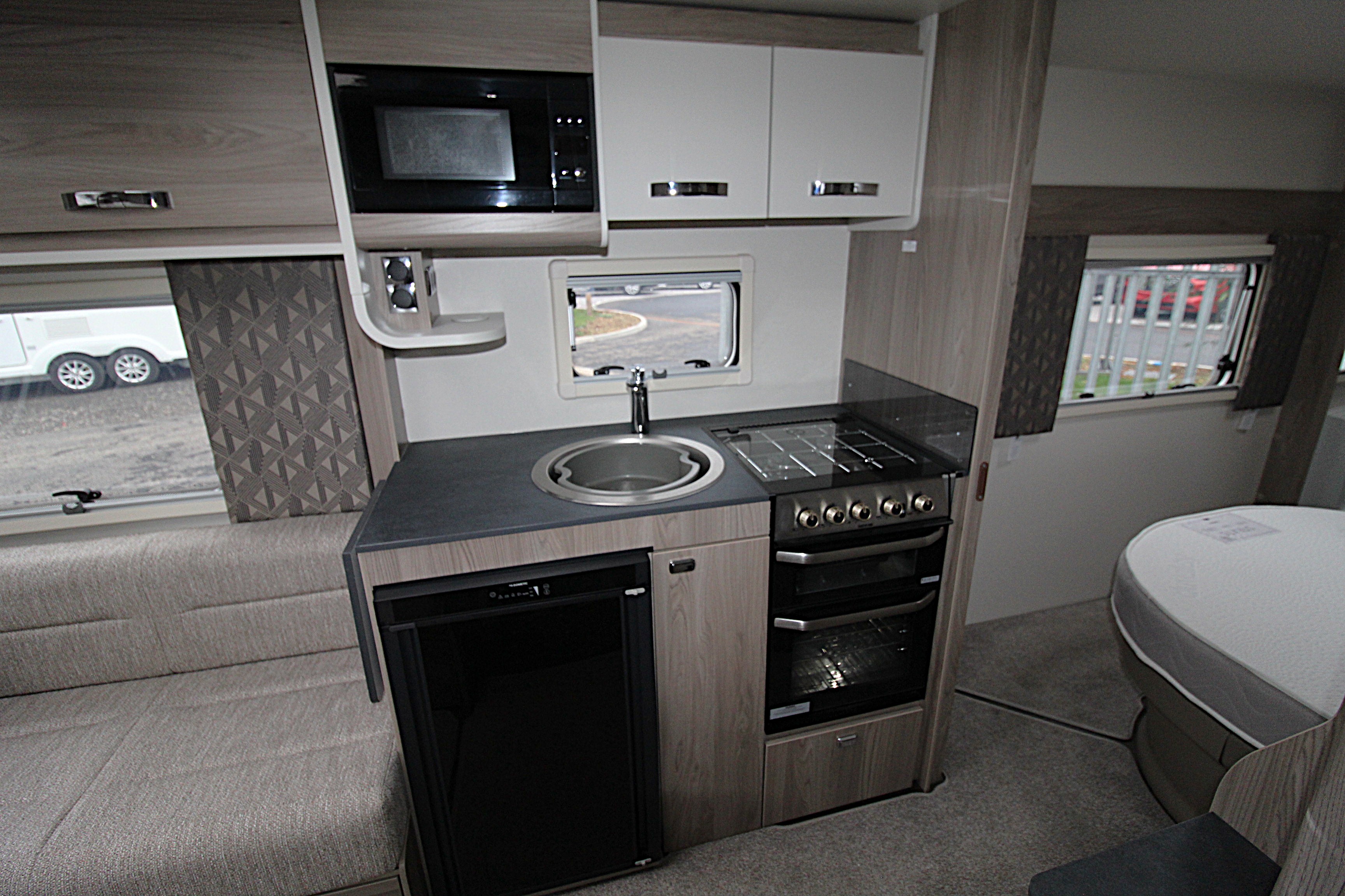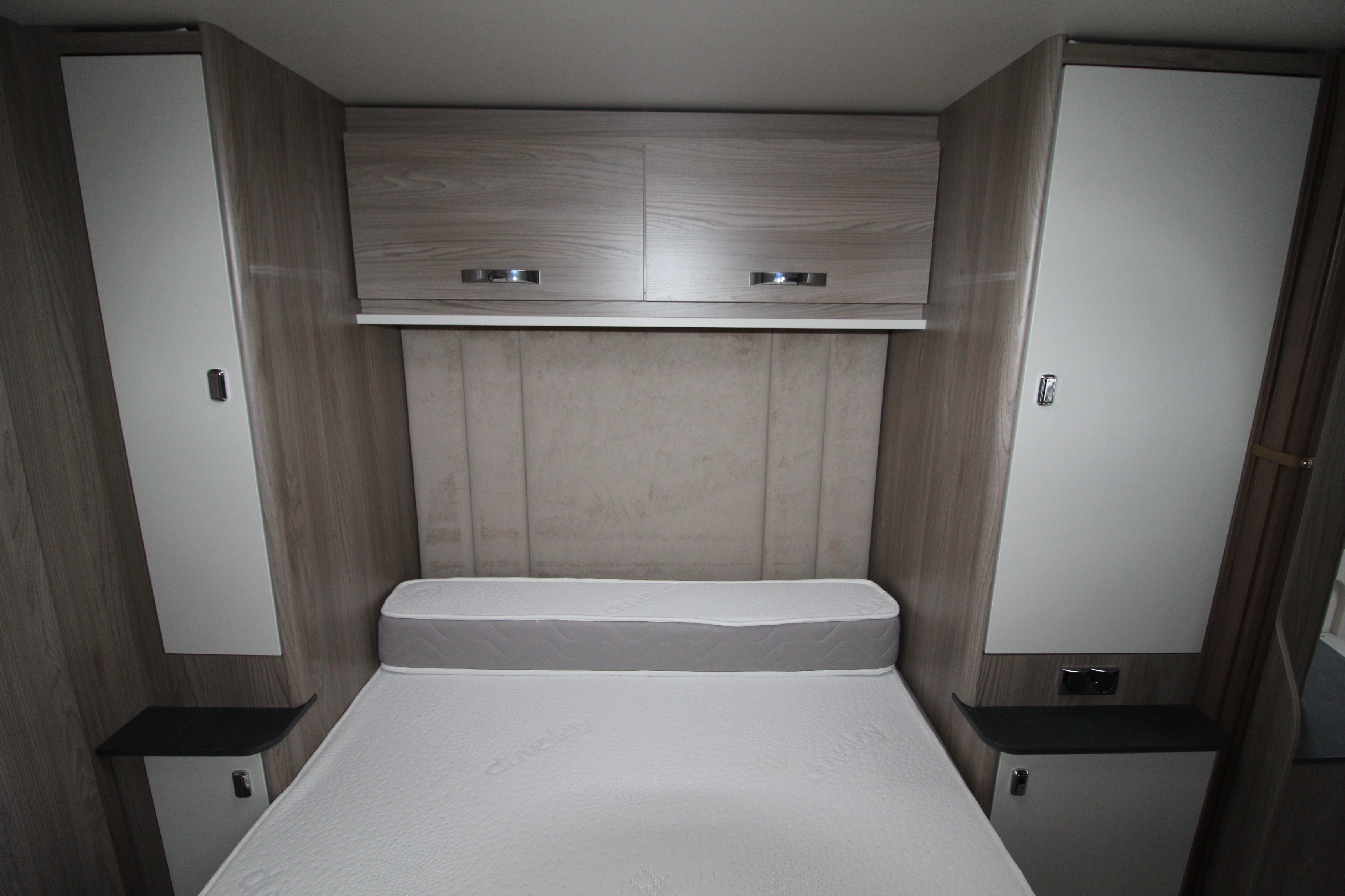 Flowing through to the main bedroom area, which can be screened off from the main living area, you will find a transverse island bed with a feature soft headboard, overhead lockers, wardrobes and bedside cabinets either side. In the corner there is a small vanity mirror and shelving.