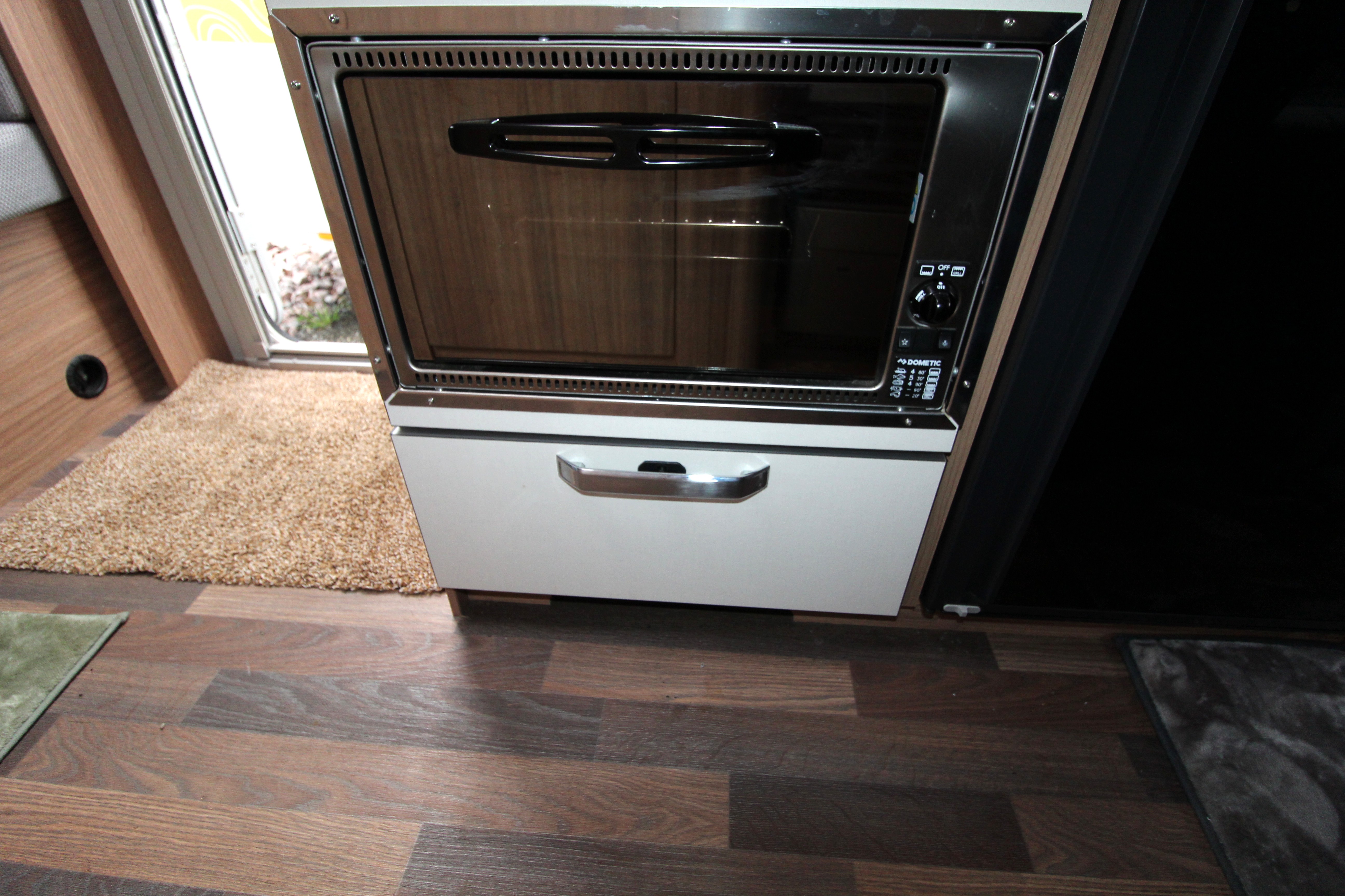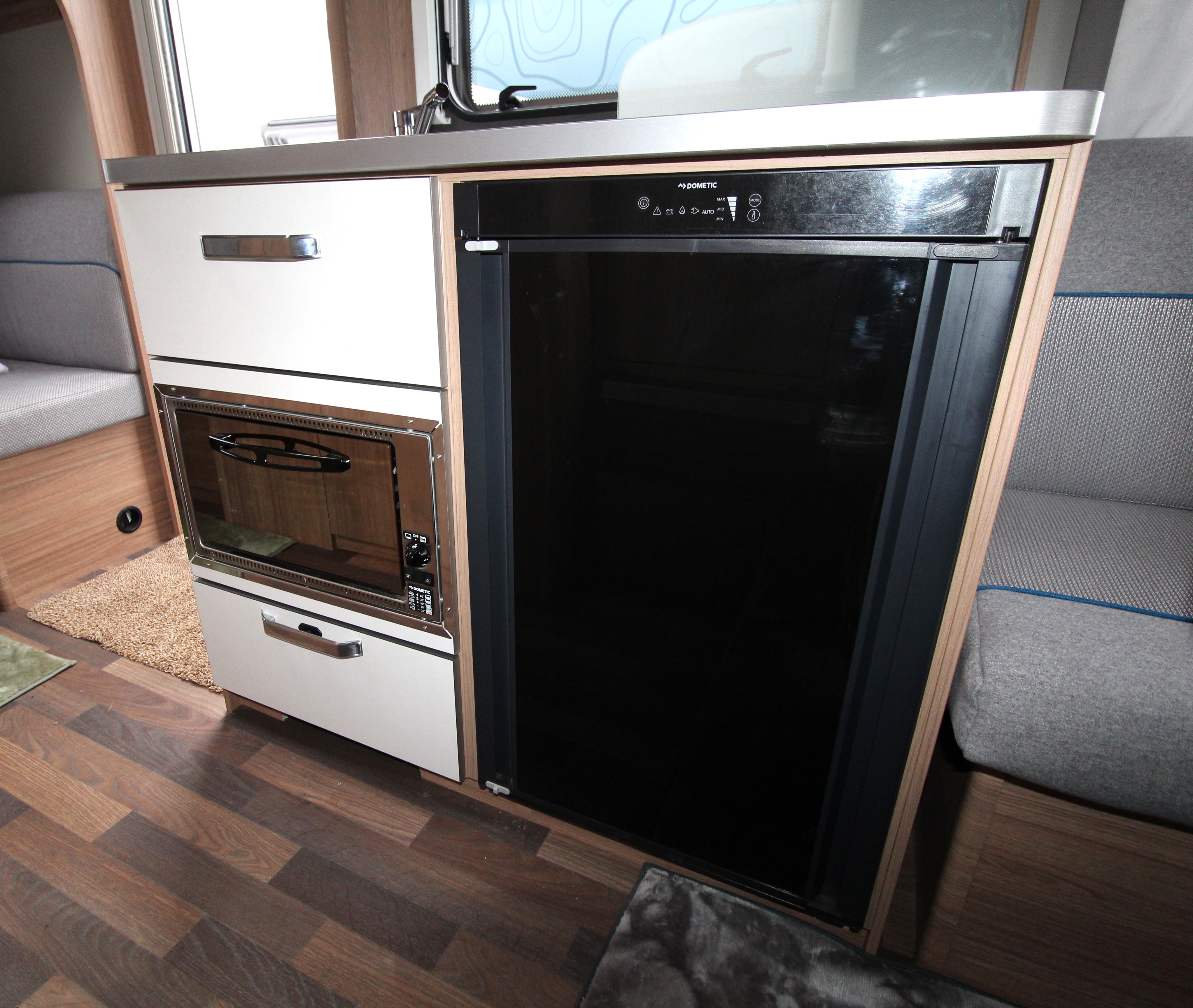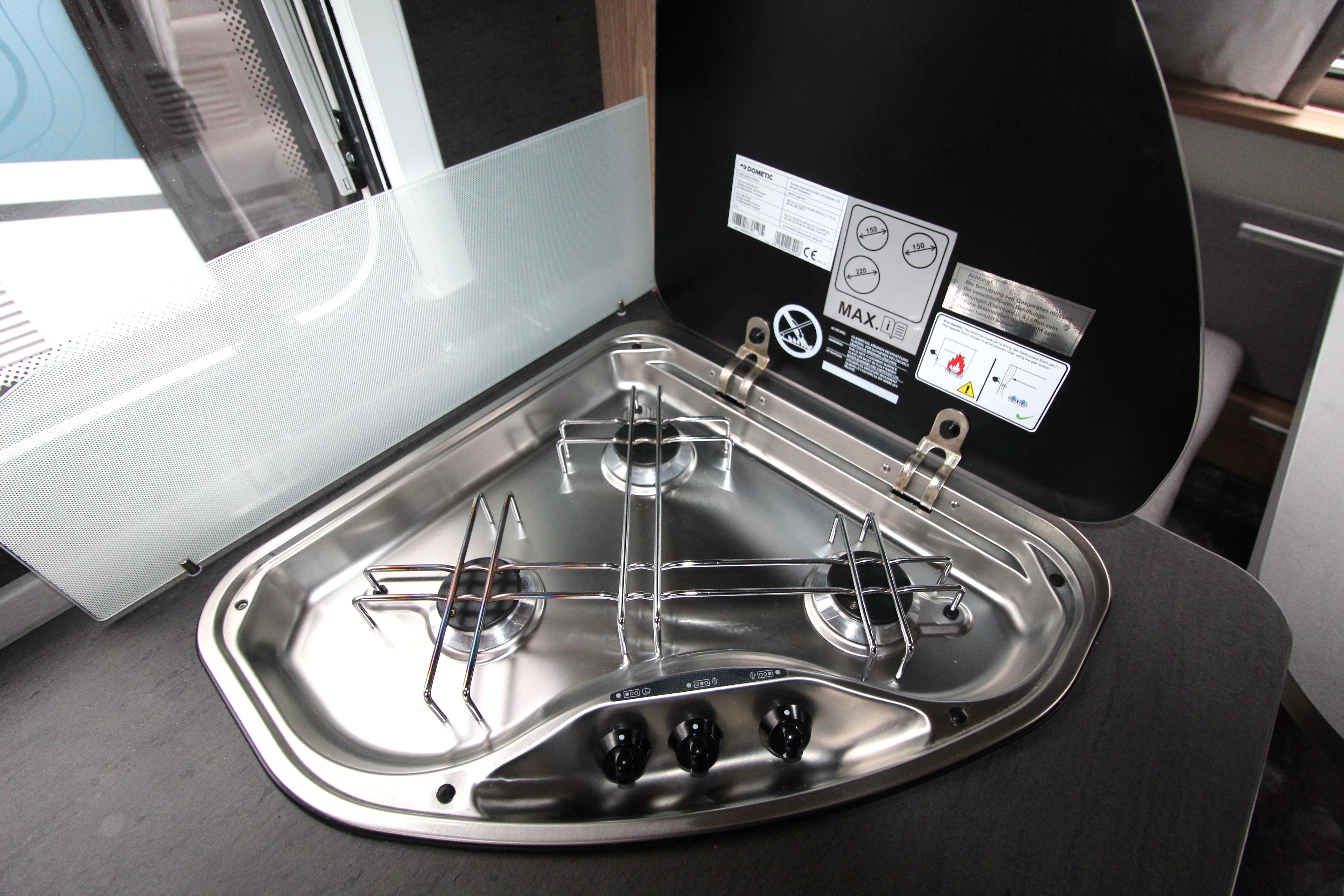 The compact well fitted kitchen include 3-burner gas hob, combi oven/grill, undercounter fridge/freezer and storage cupboards.