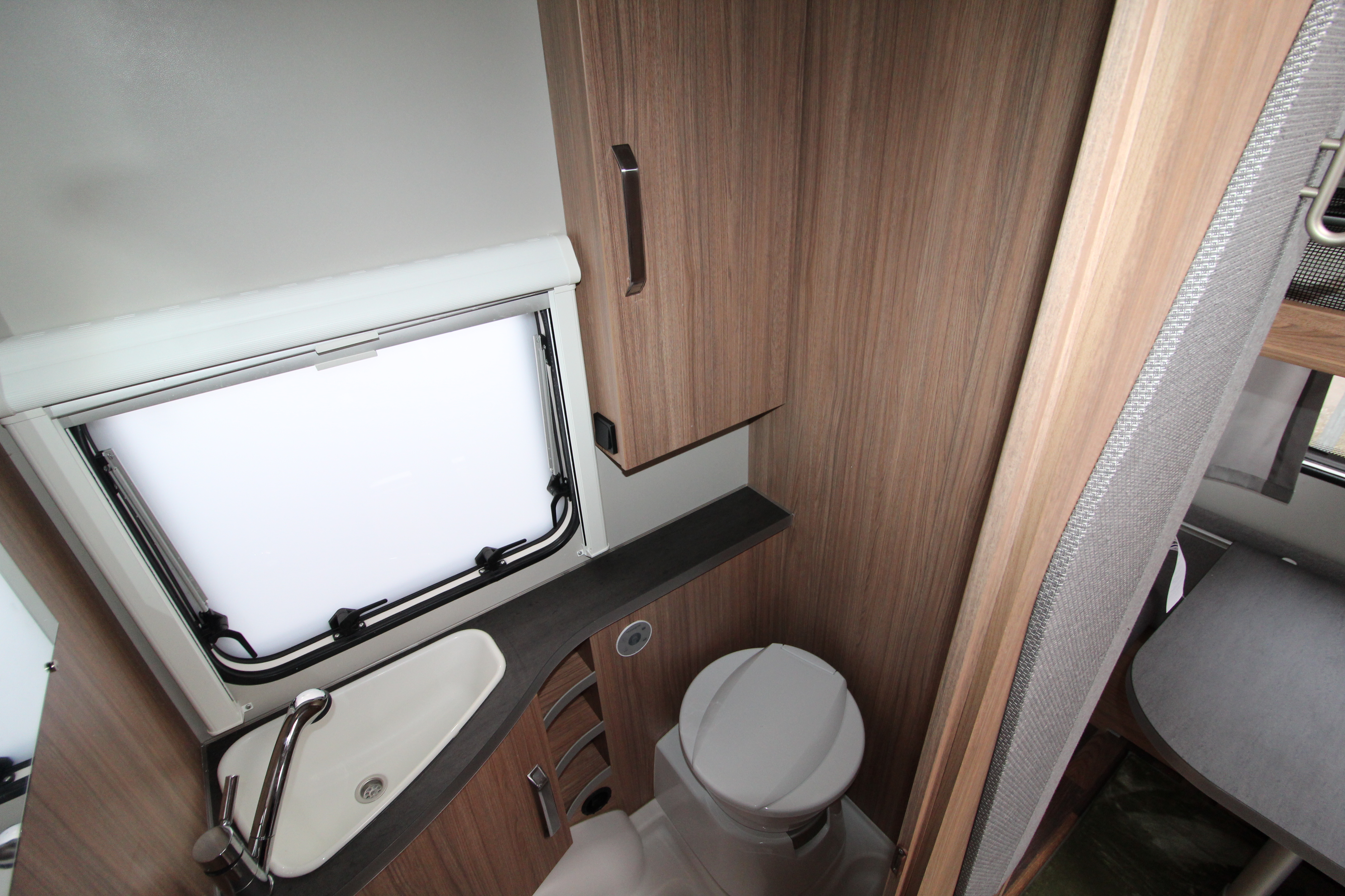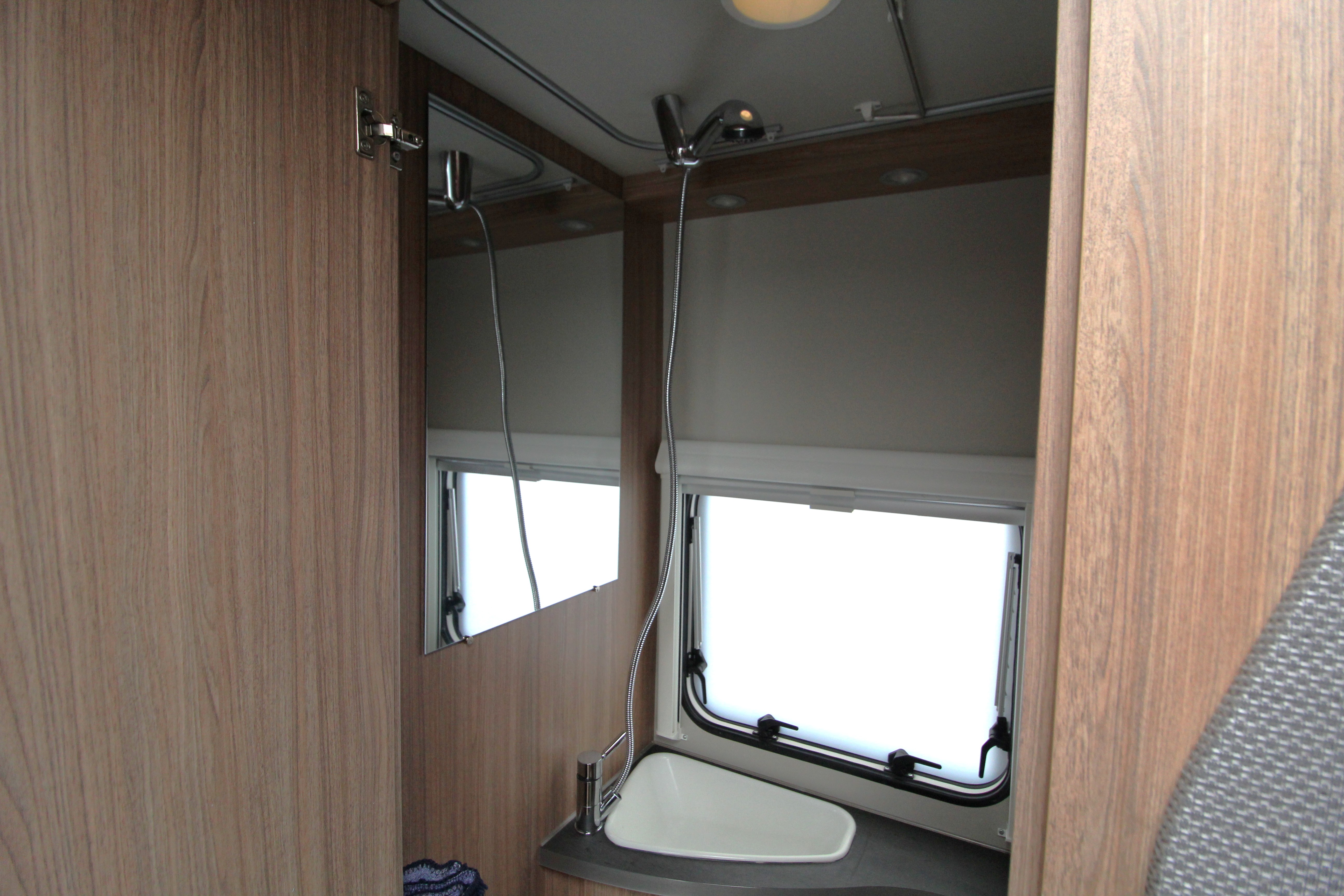 Combined shower and washroom facilities include cassette toilet, corner basin with shower hose facility.