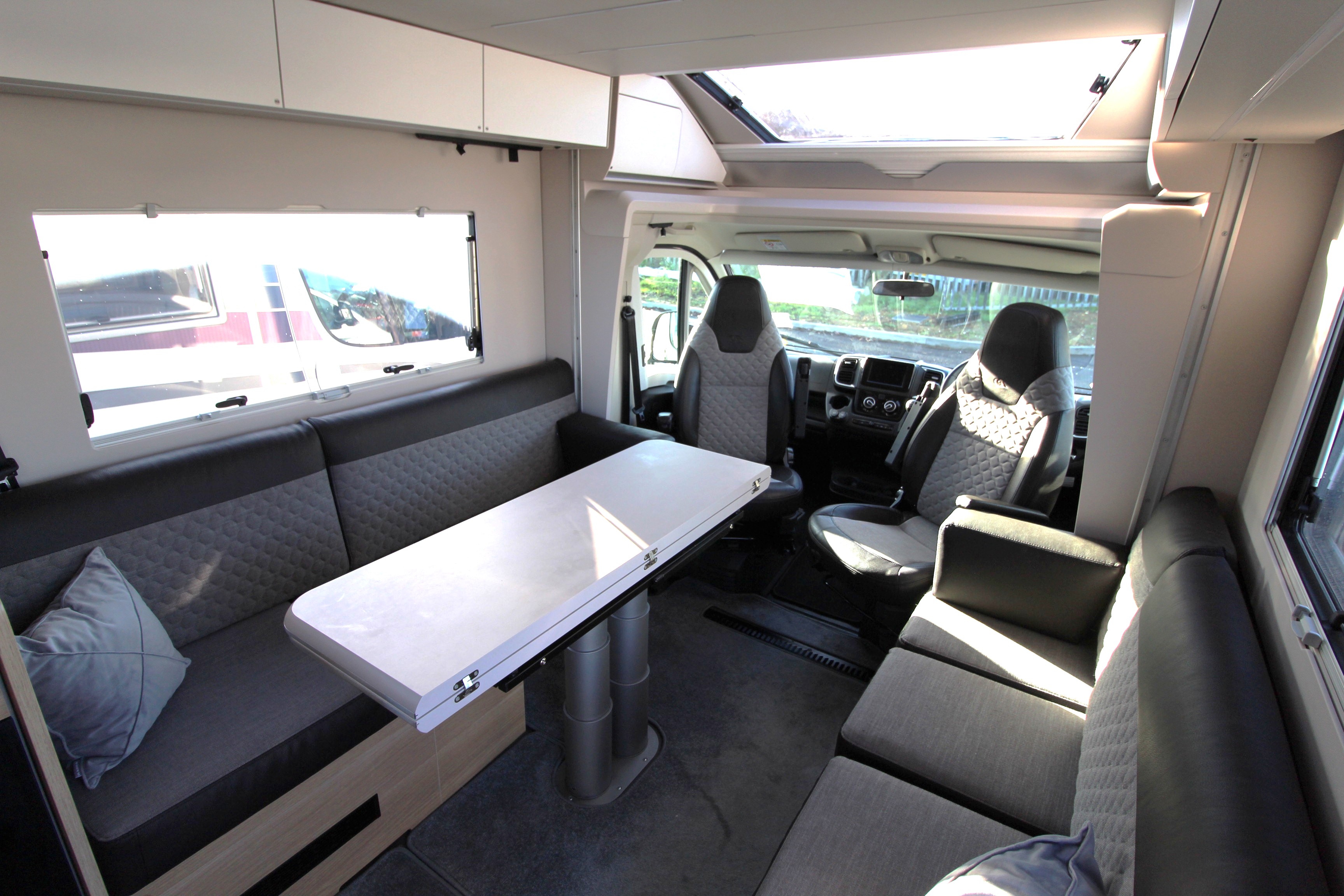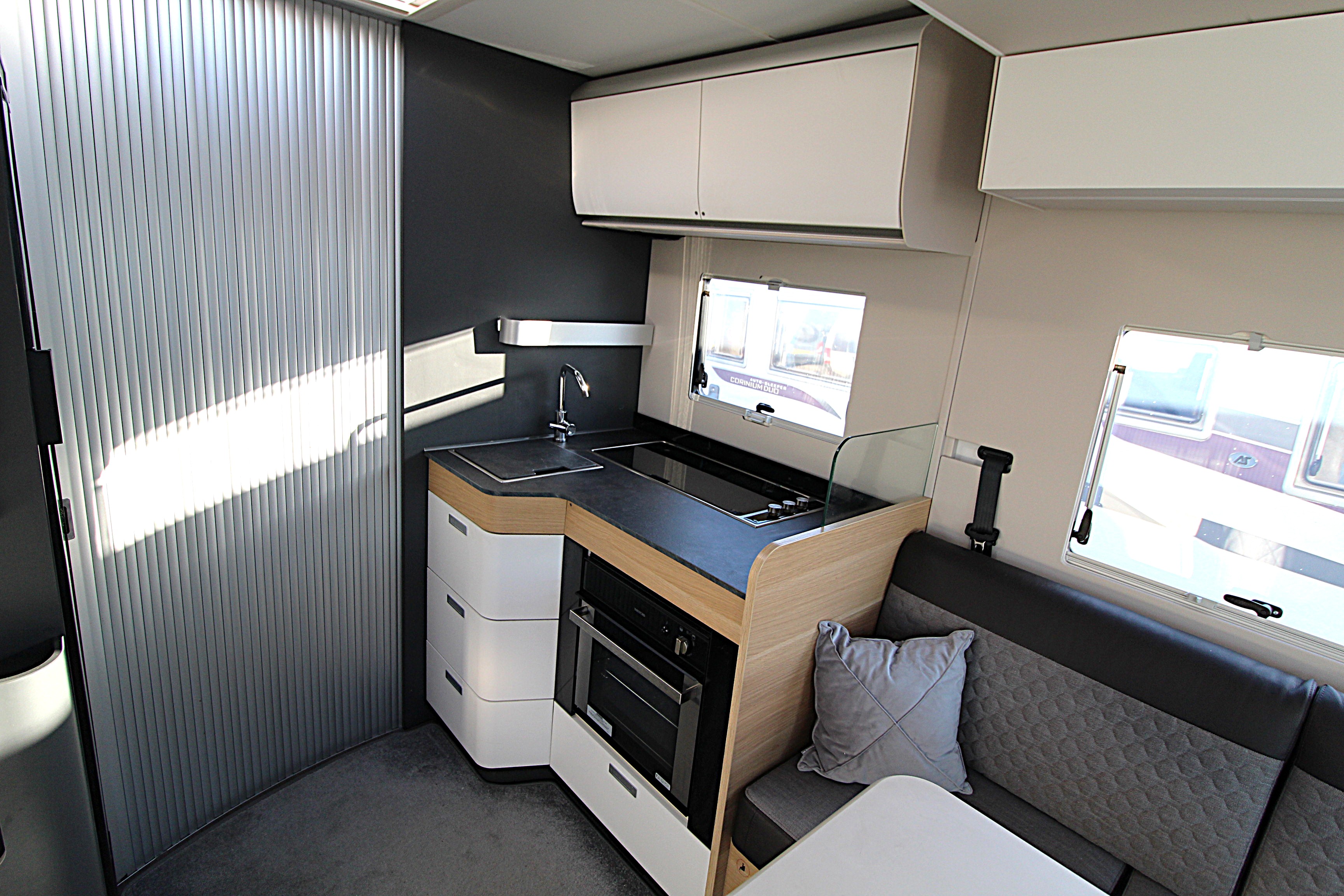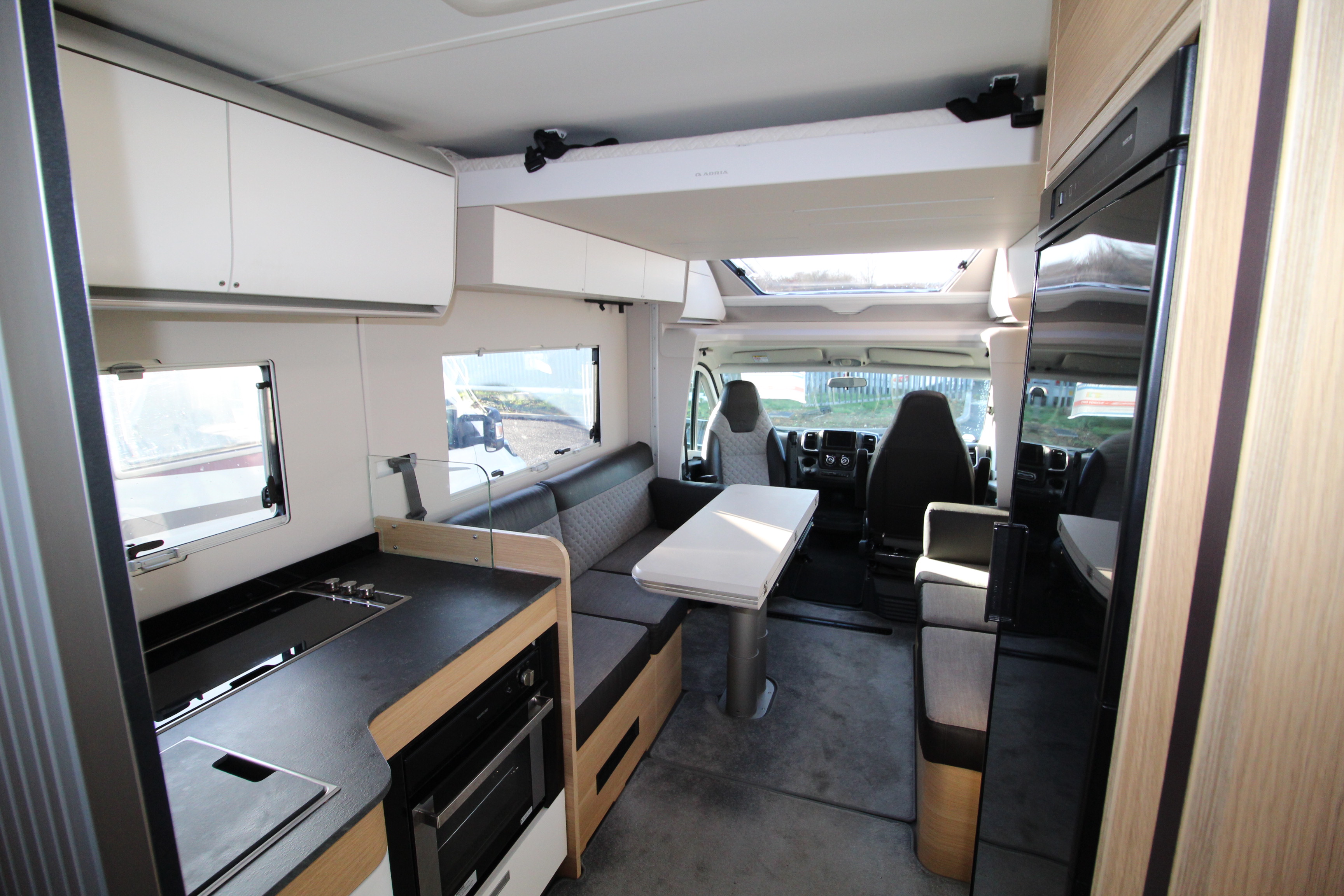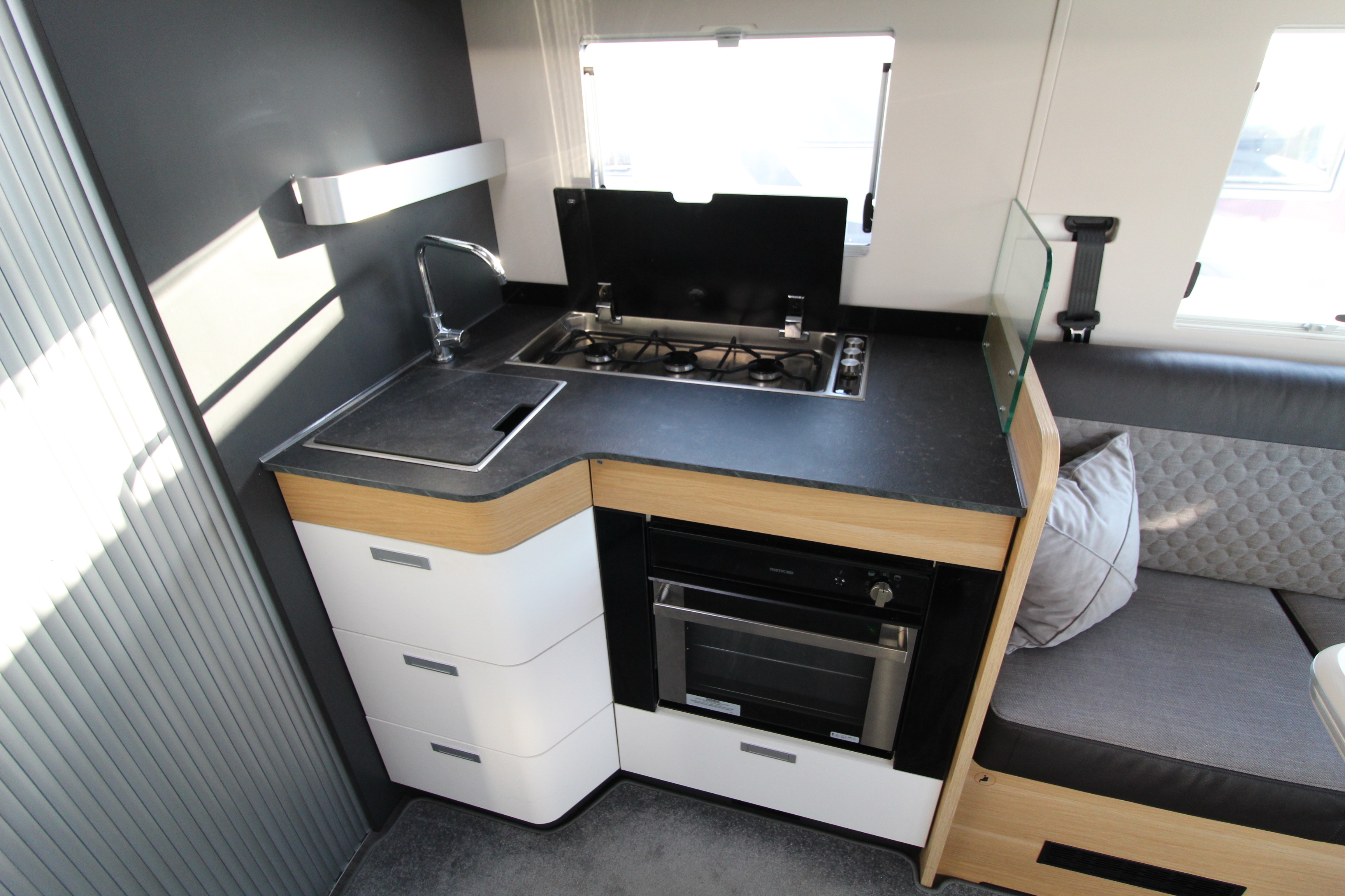 The layout is as you step inside towards the rear of the vehicle offers a spacious lounge area with overhead electric drop down bed and swivel cab seats. Storage solutions are provided in the overhead lockers and under bench seats. The adjacent kitchen area provides a three-gas burner hob, extractor fan, combi oven/grill and a tall three-way fridge freezer.