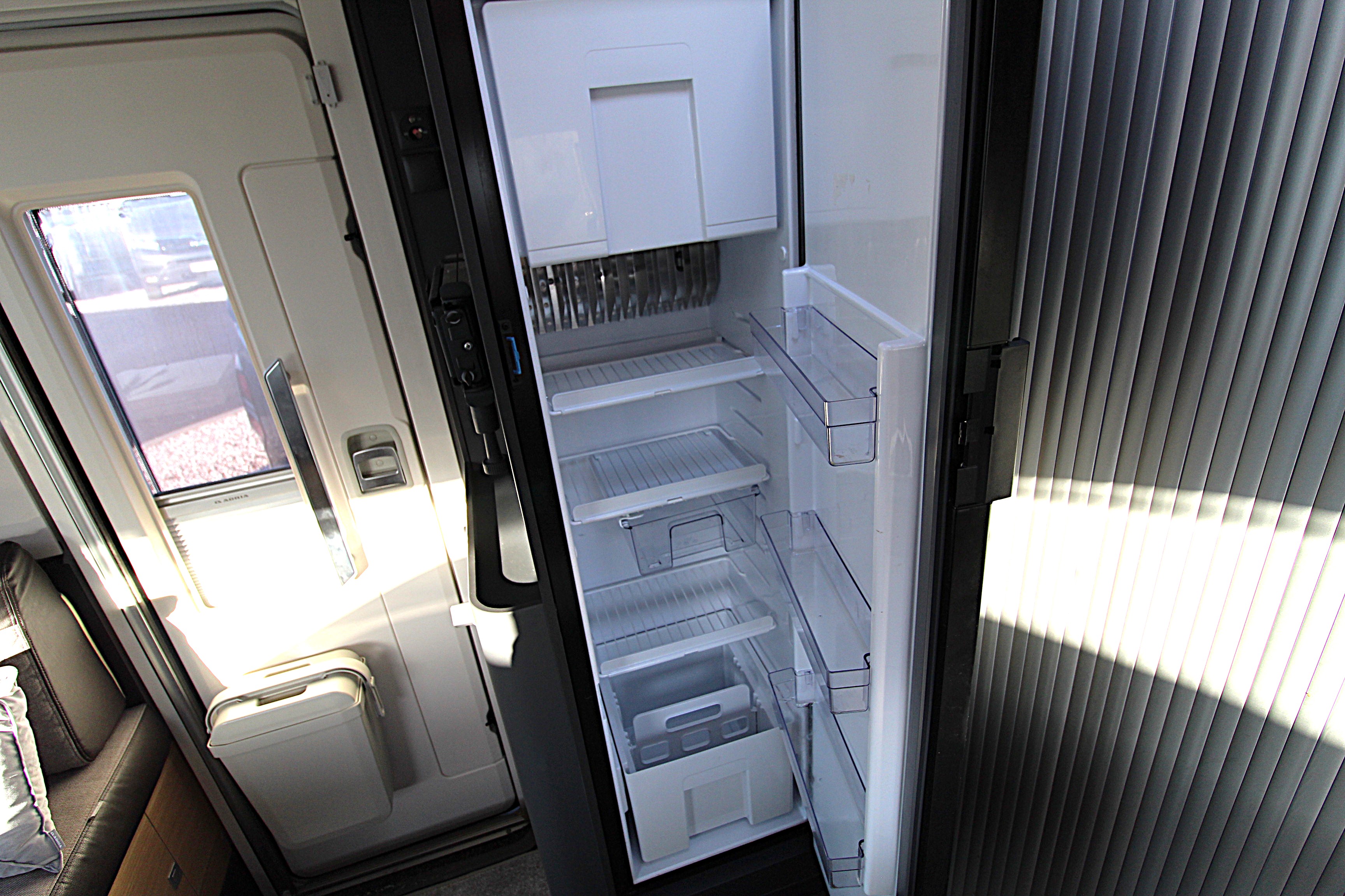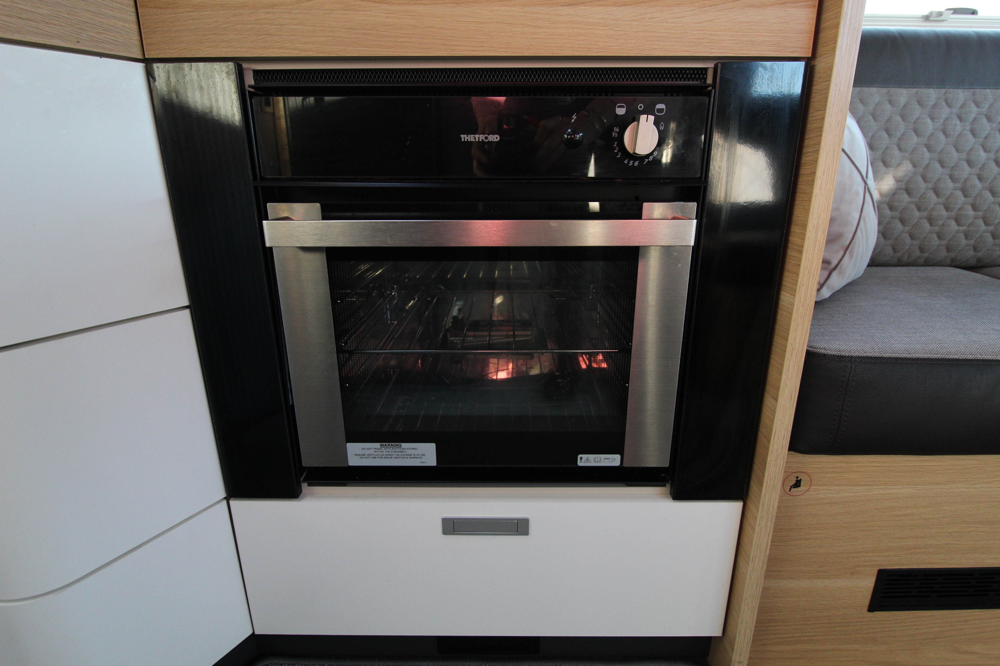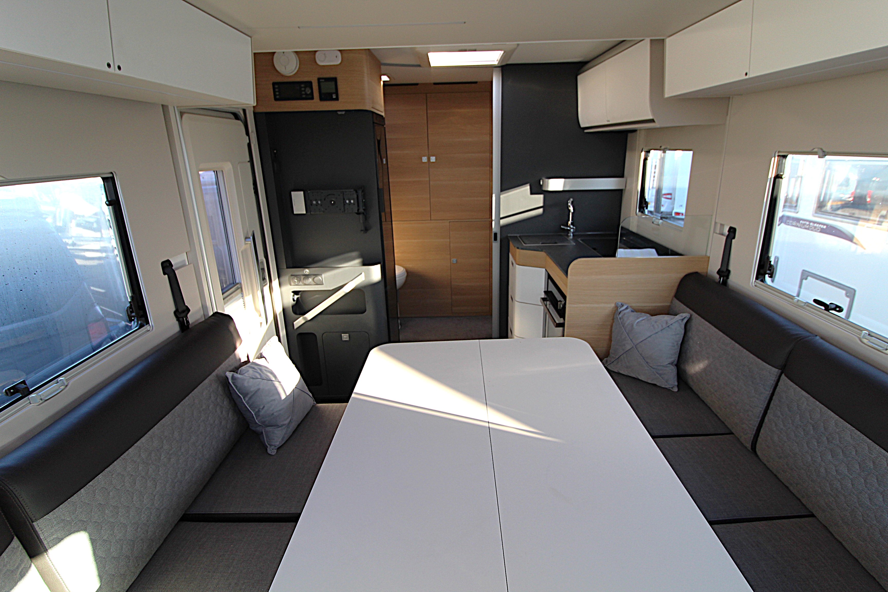 The layout is as you step inside towards the rear of the vehicle offers a spacious lounge area with overhead electric drop down bed and swivel cab seats. Storage solutions are provided in the overhead lockers and under bench seats. The adjacent kitchen area provides a three-gas burner hob, extractor fan, combi oven/grill and a tall three-way fridge freezer.