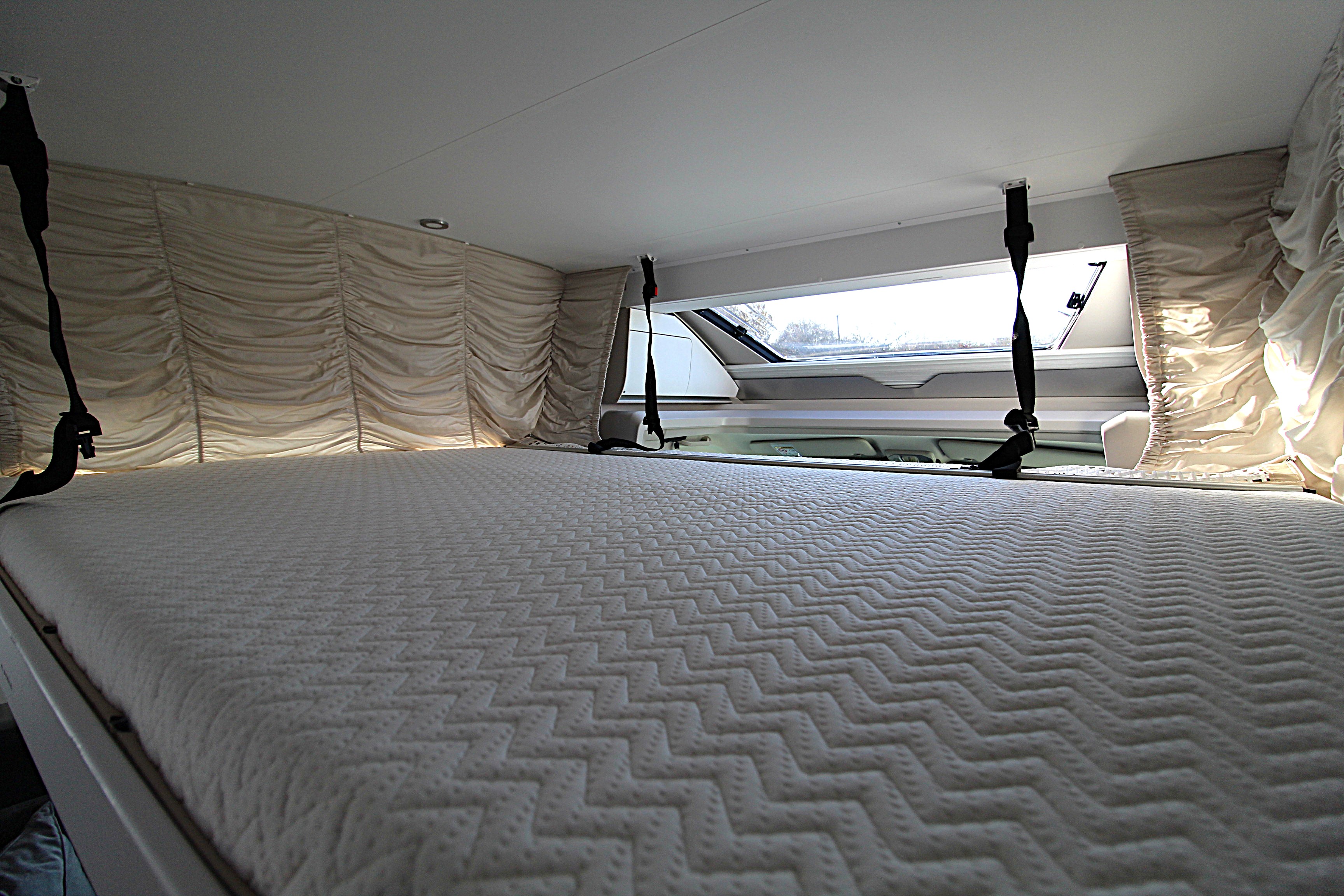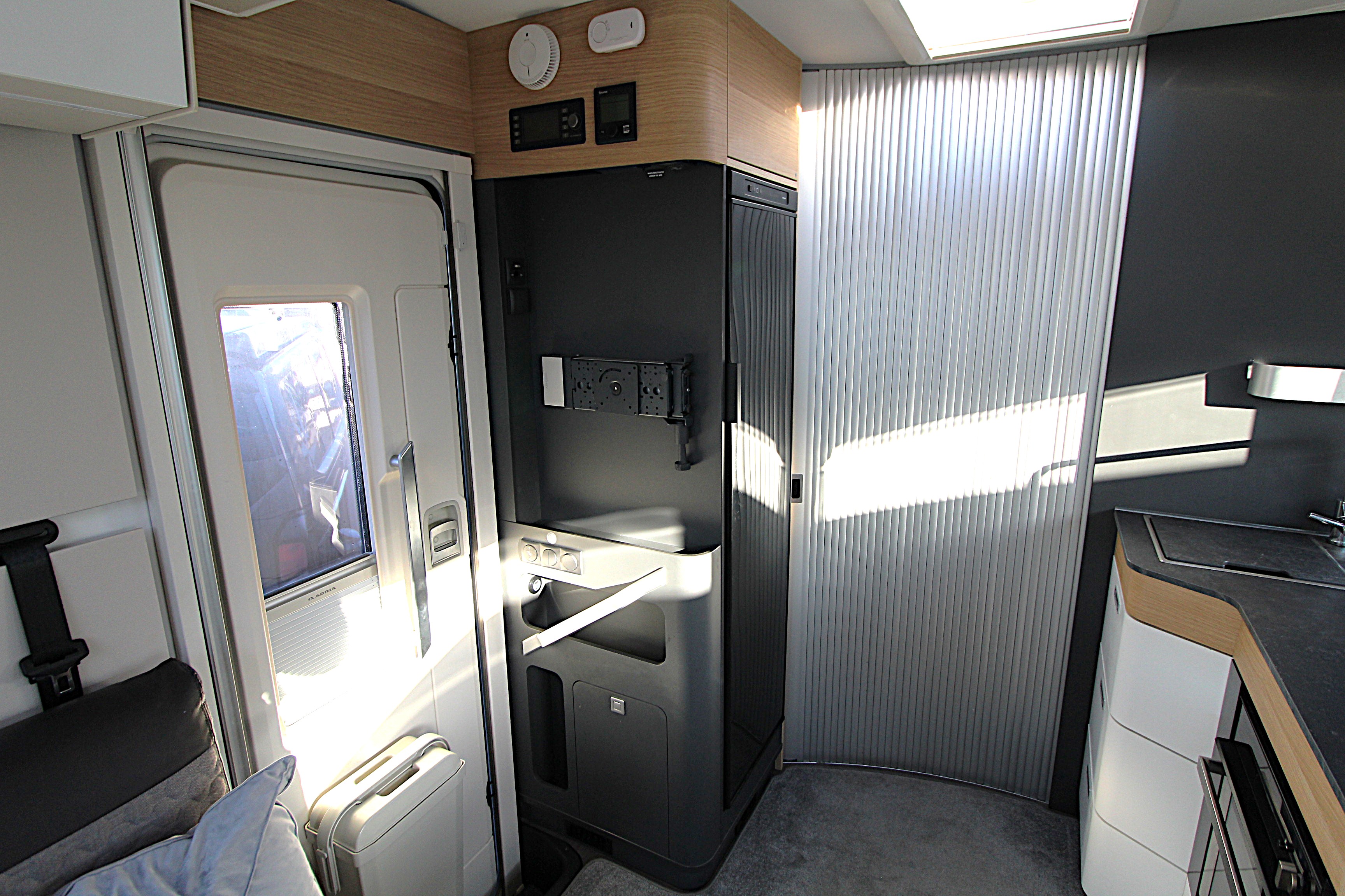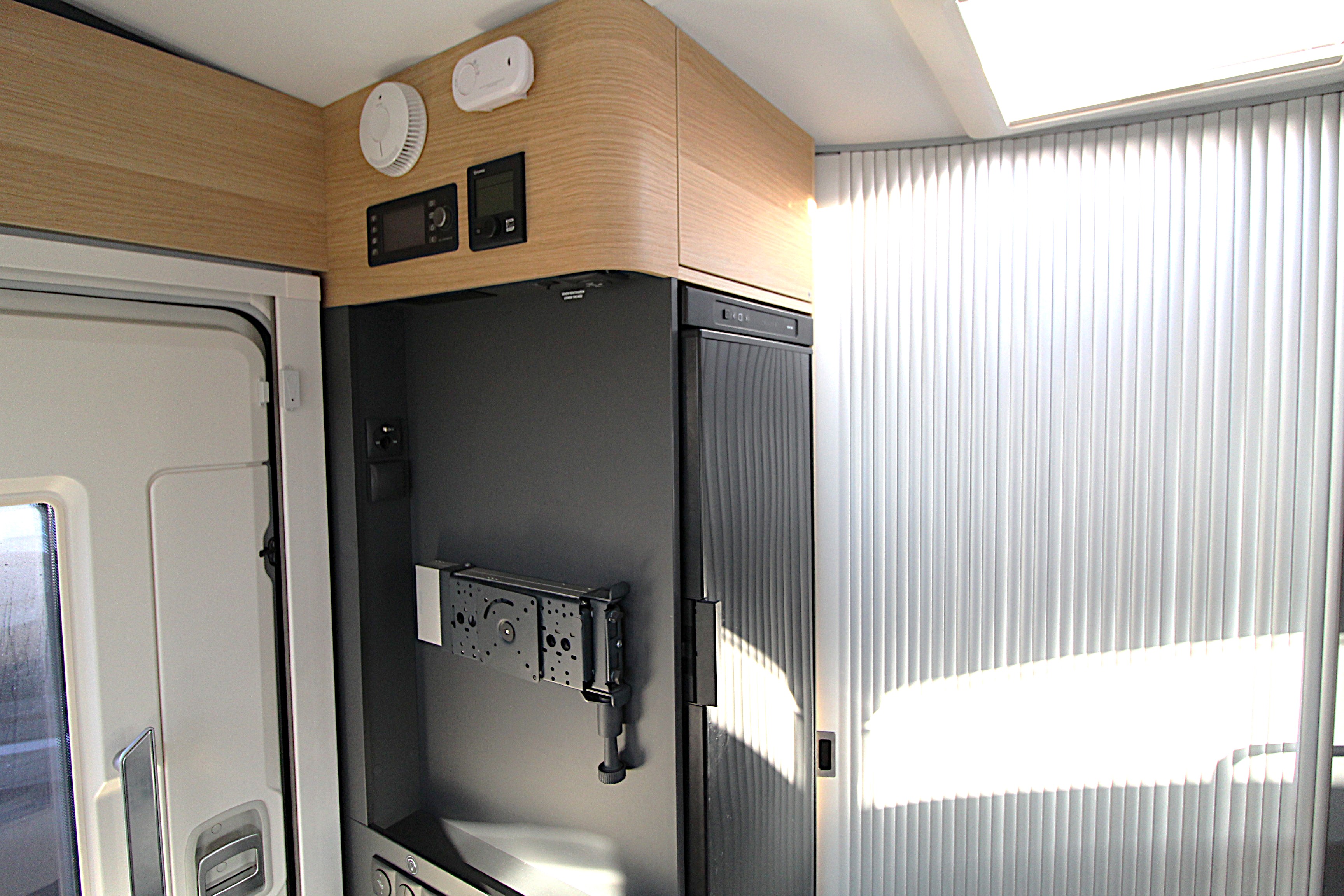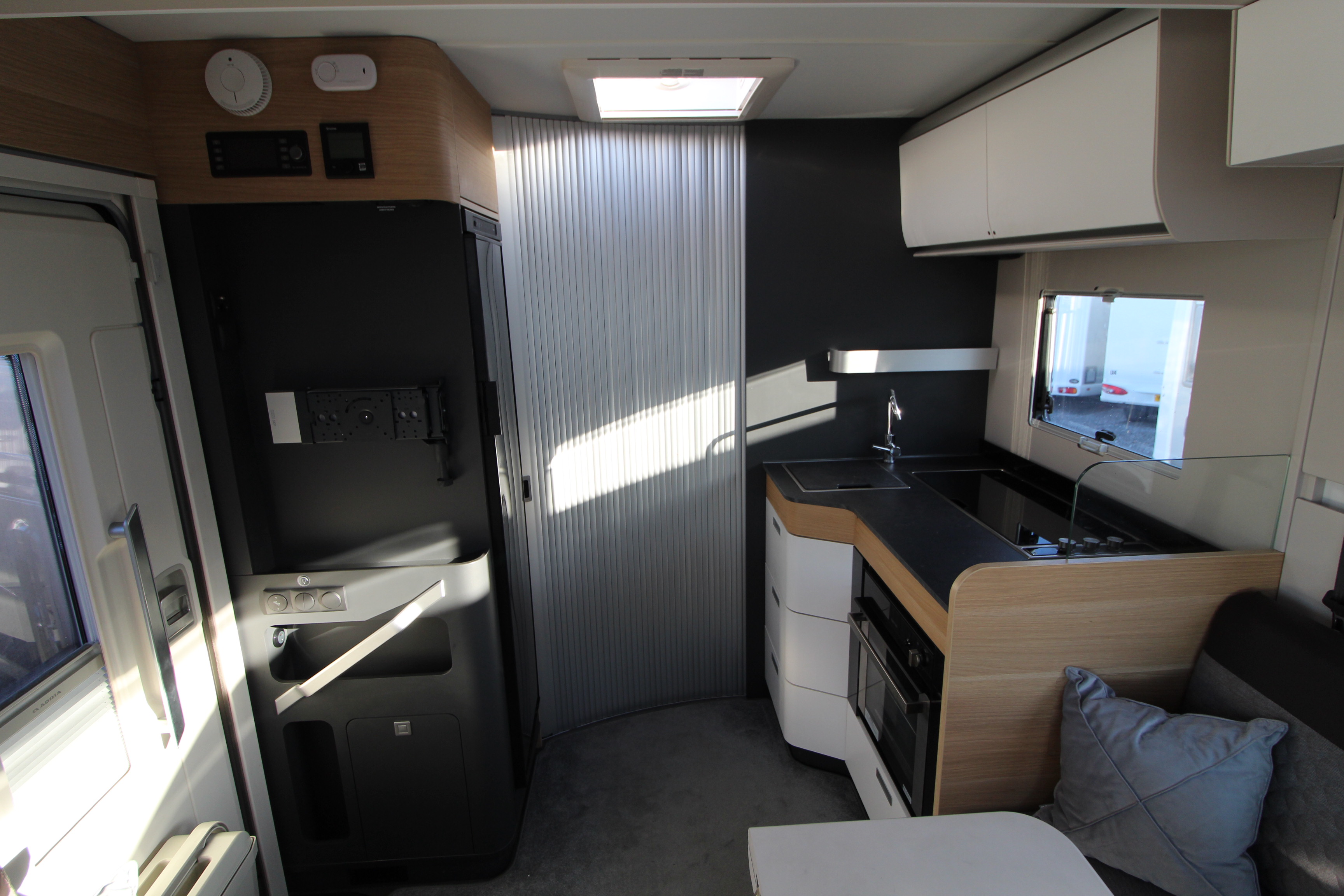The layout is as you step inside towards the rear of the vehicle offers a spacious lounge area with overhead electric drop down bed and swivel cab seats. Storage solutions are provided in the overhead lockers and under bench seats. The adjacent kitchen area provides a three-gas burner hob, extractor fan, combi oven/grill and a tall three-way fridge freezer.