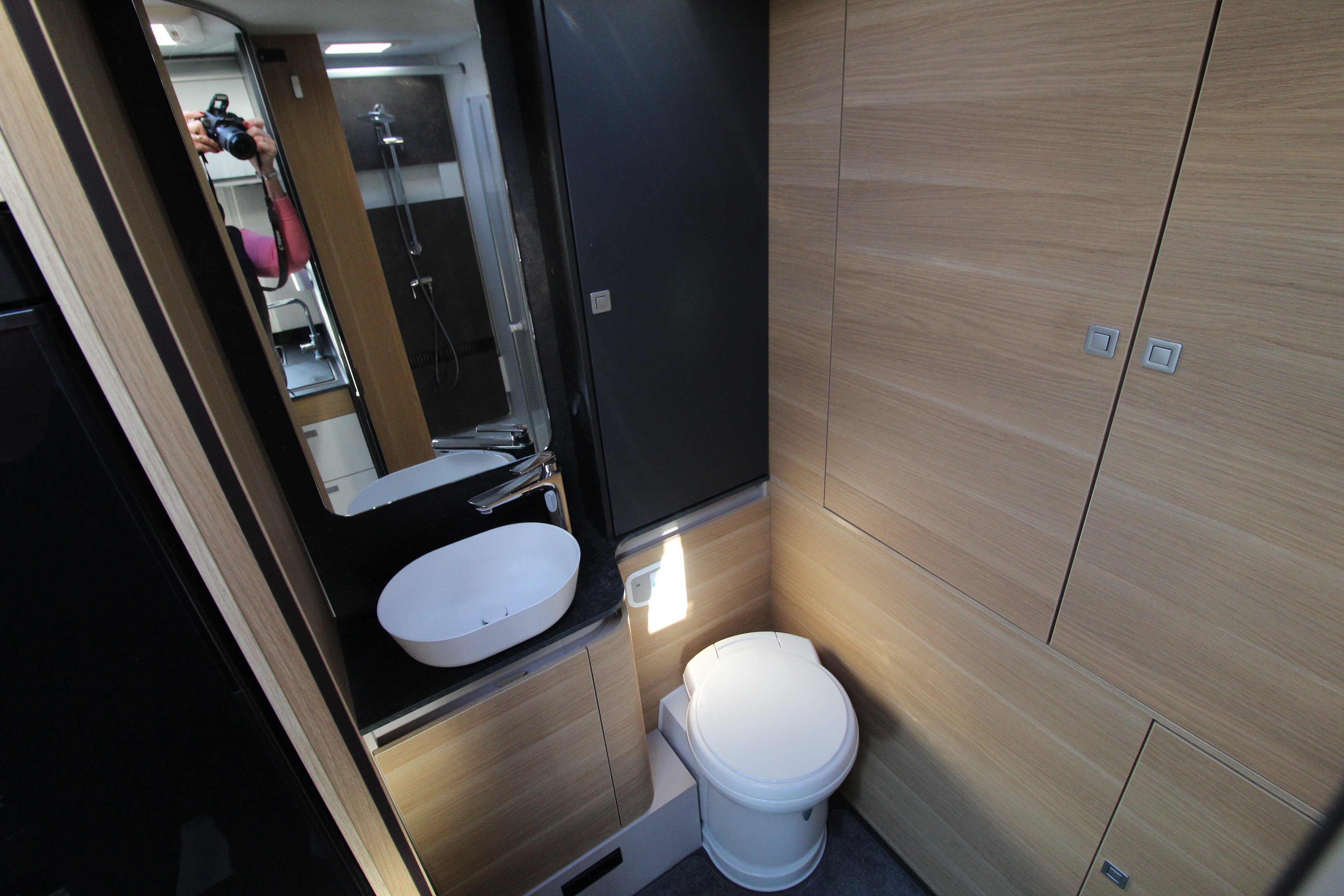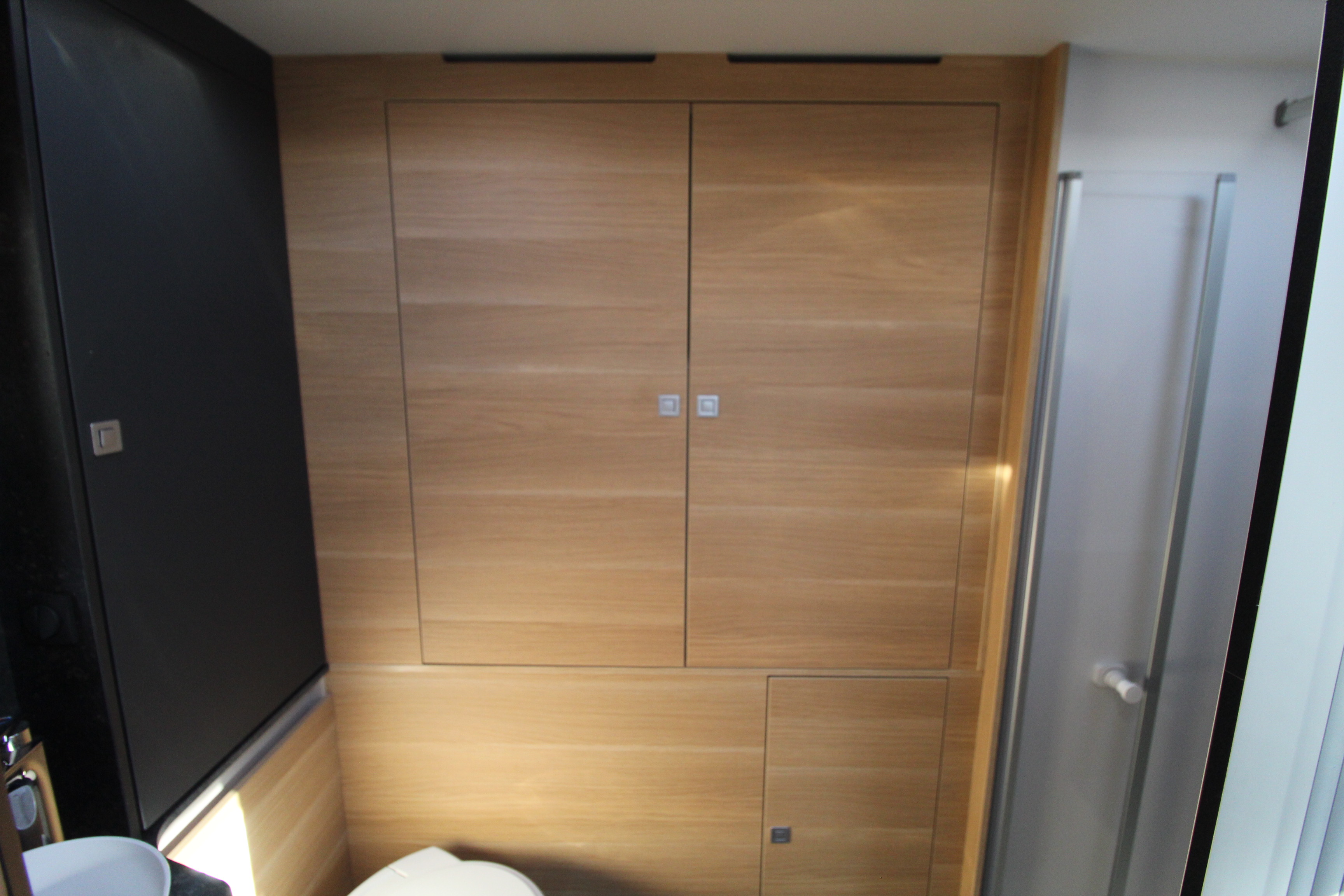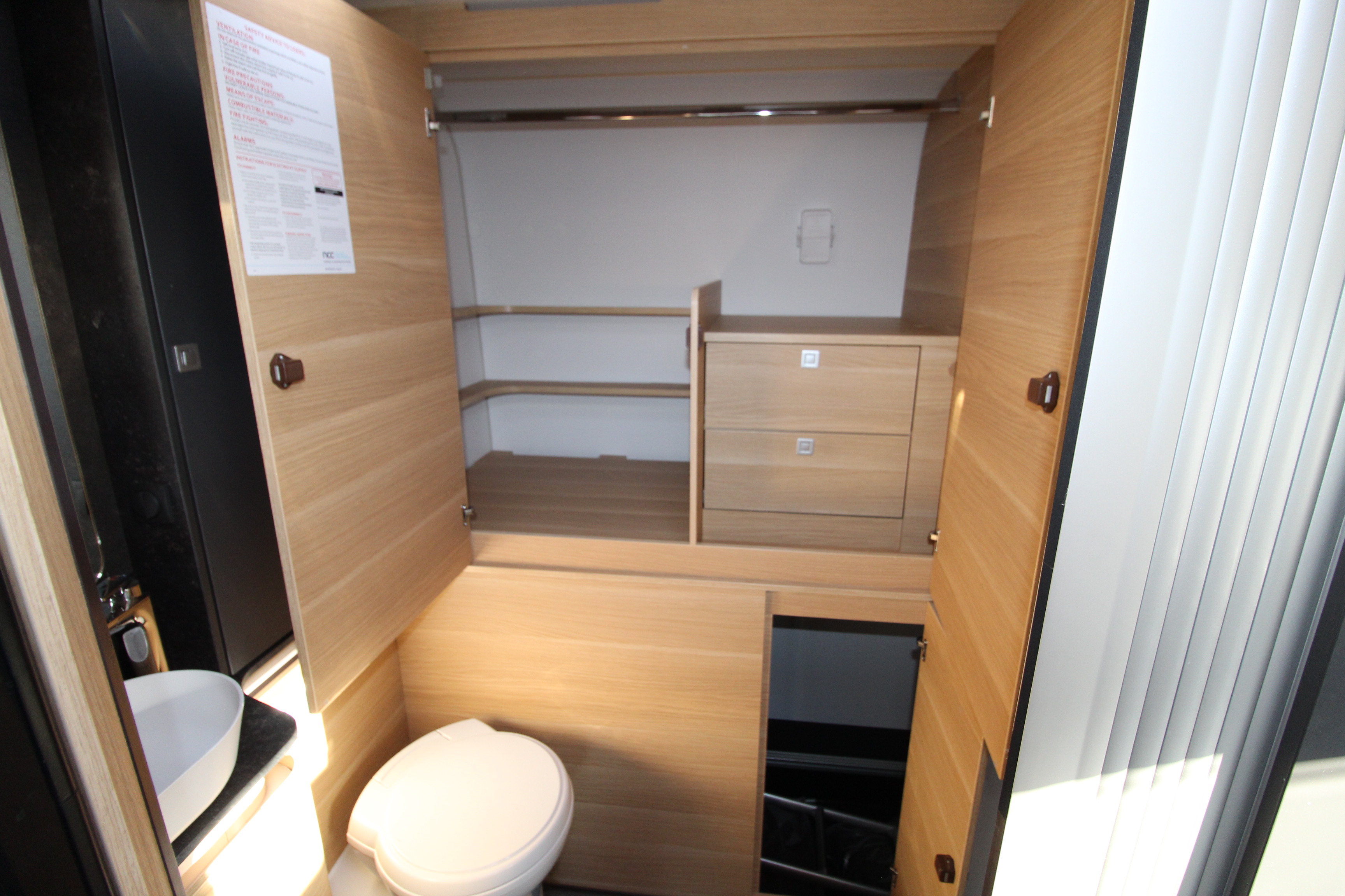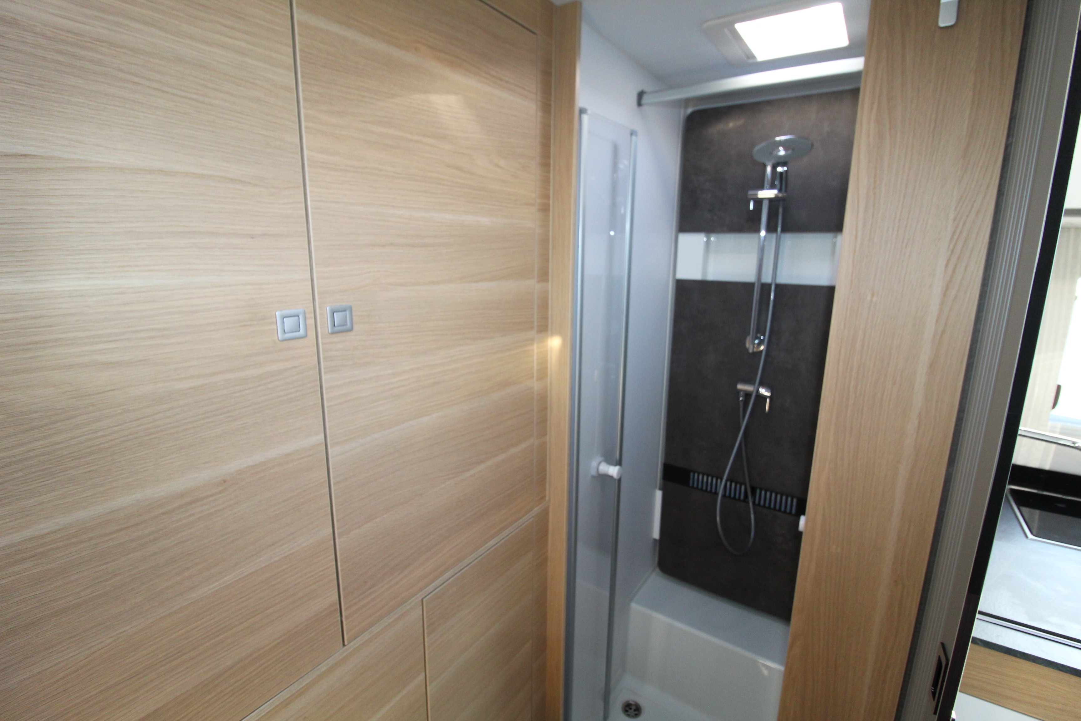 The large end washroom/dressing room offers cassette toilet, vanity unit, shower cubicle and excellent storage behind the concealed double doors.