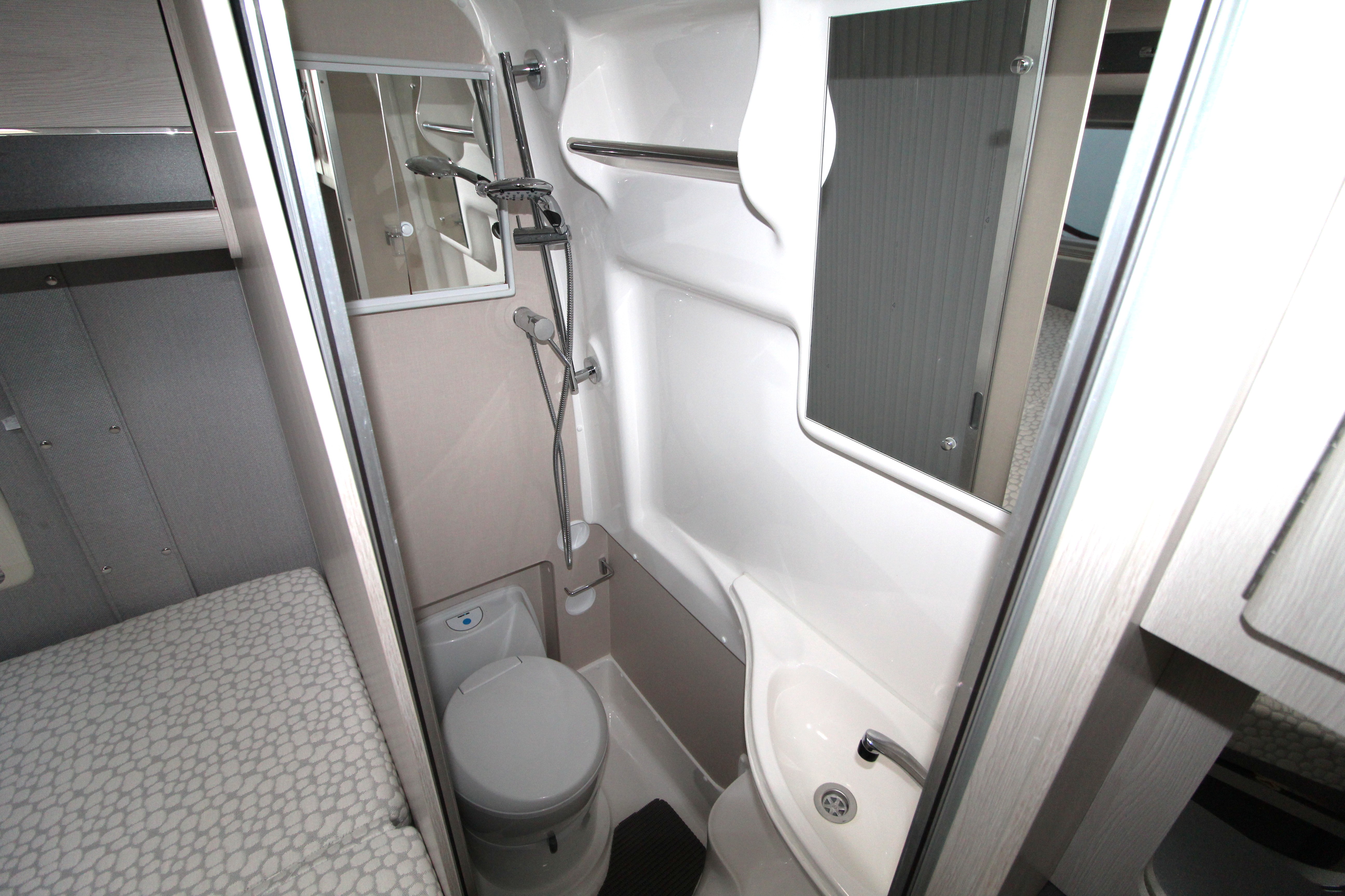 Providing a French bed for comfort and a multifunctional washroom with shower facility, cassette toilet and wash basin.