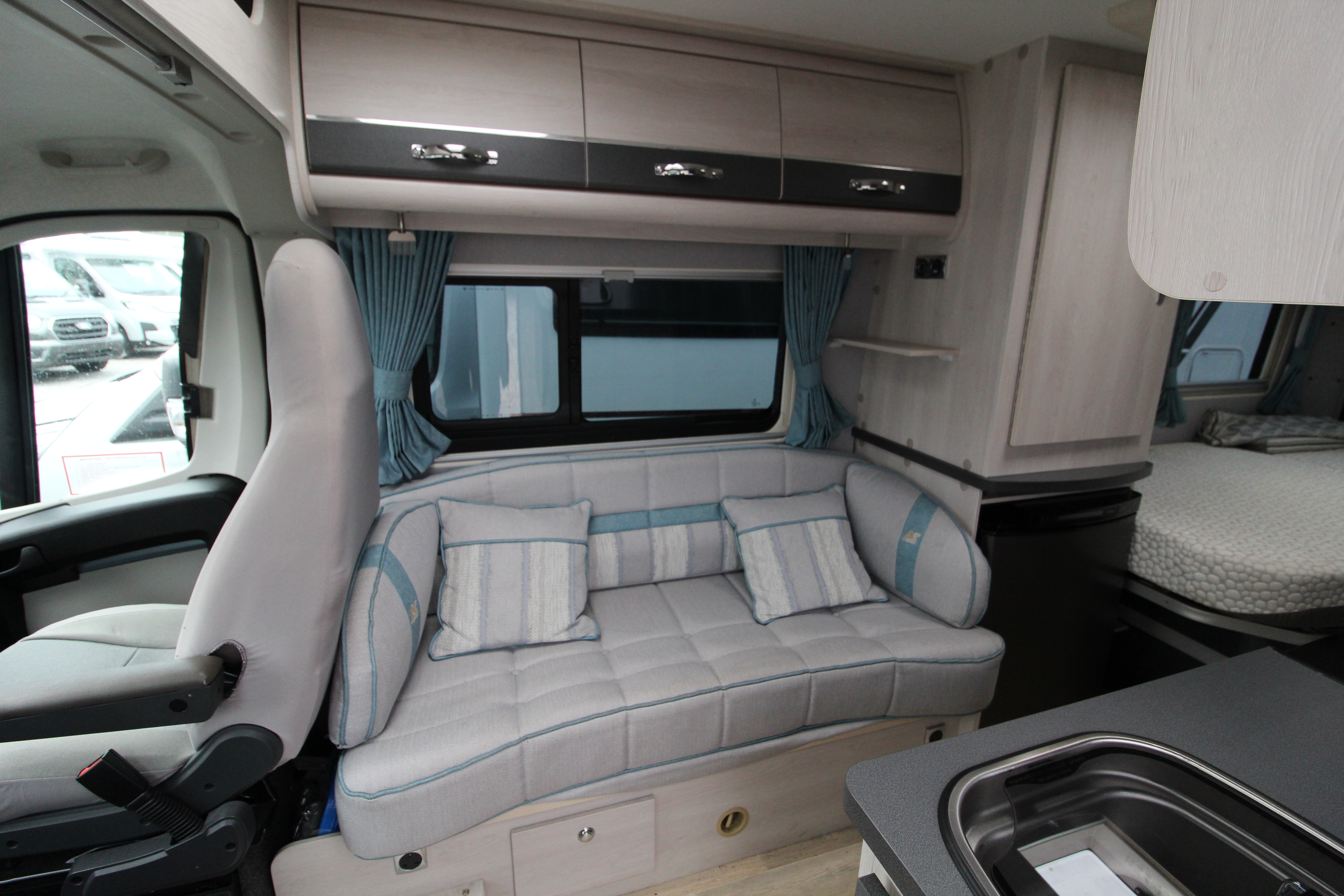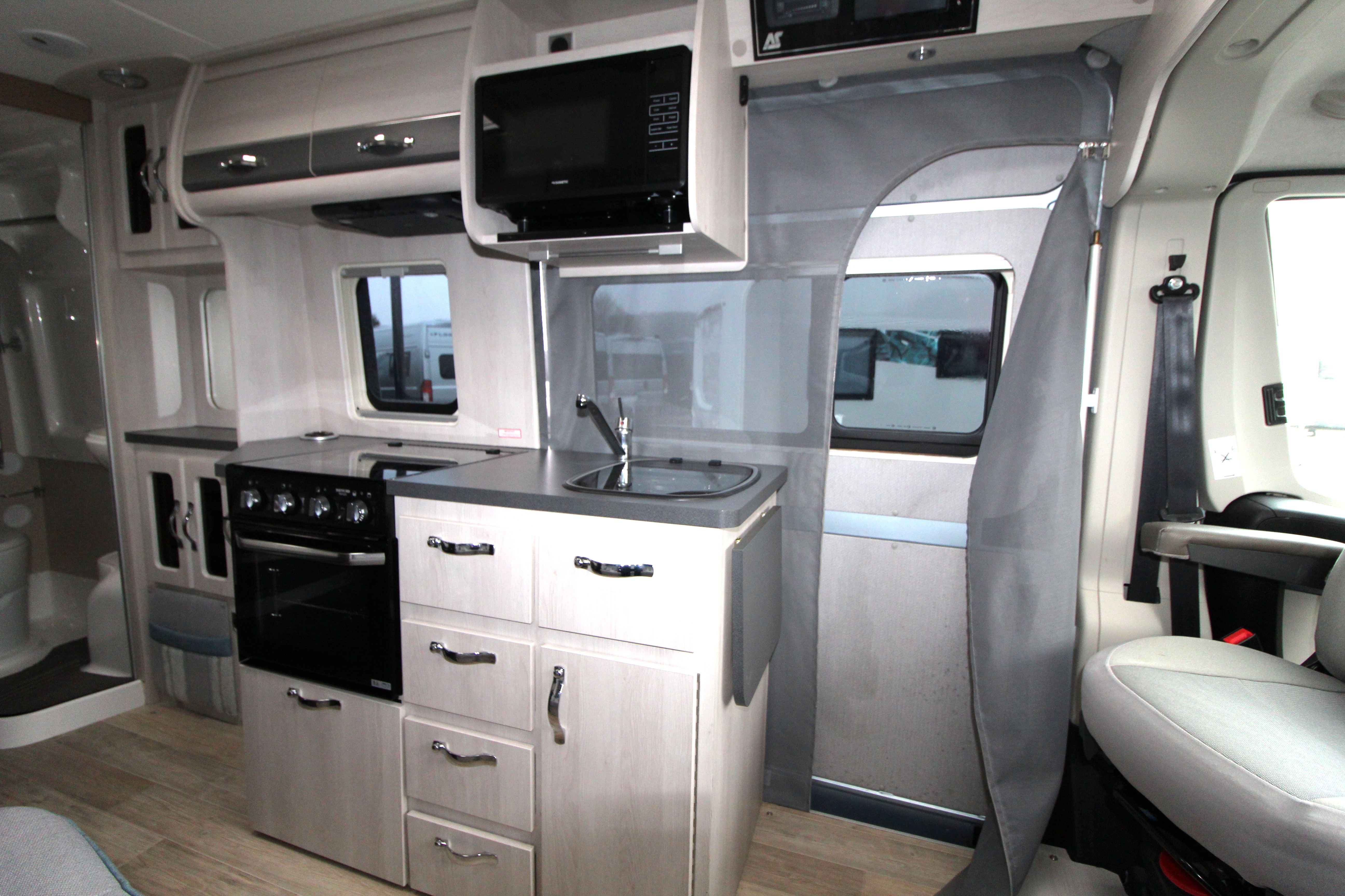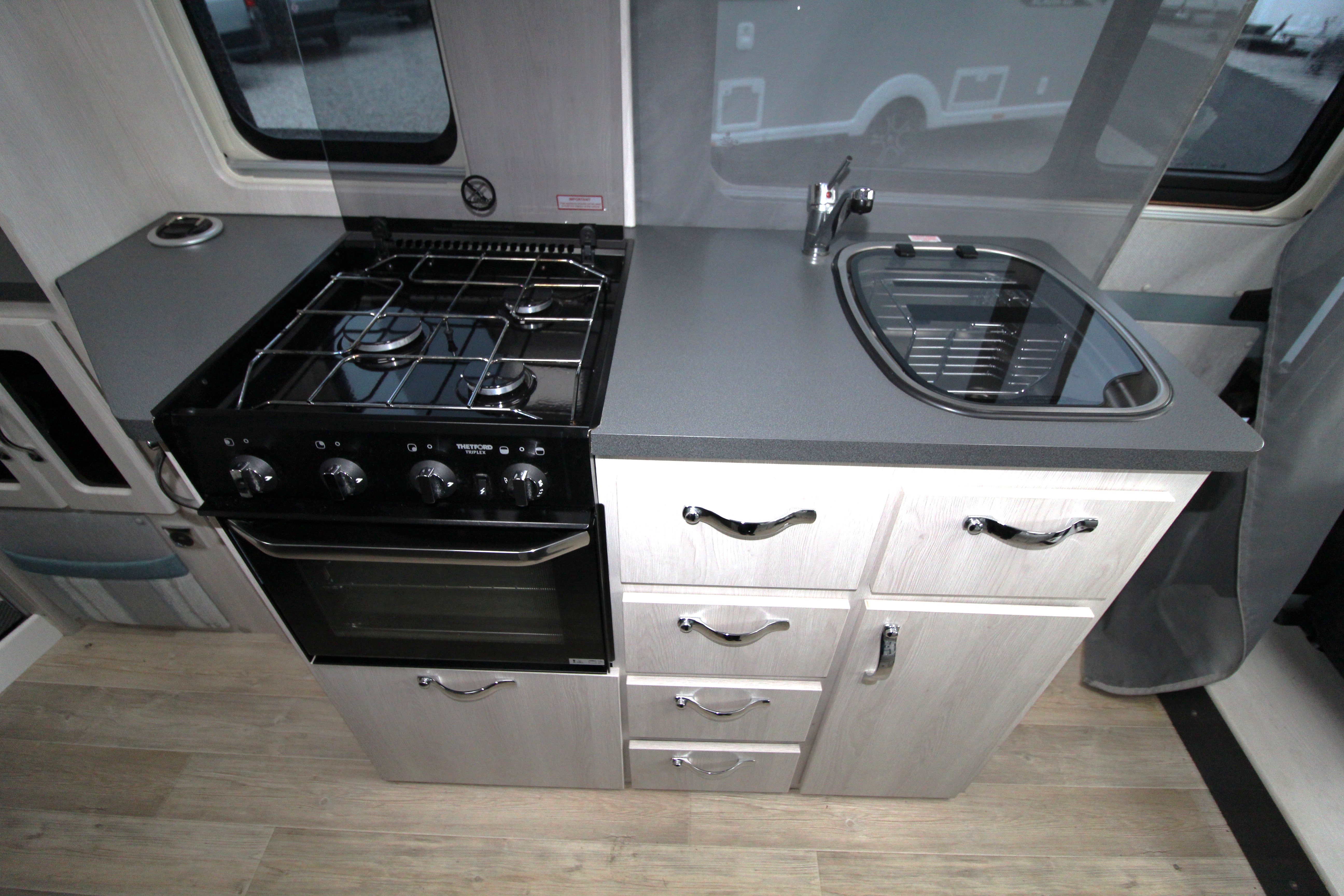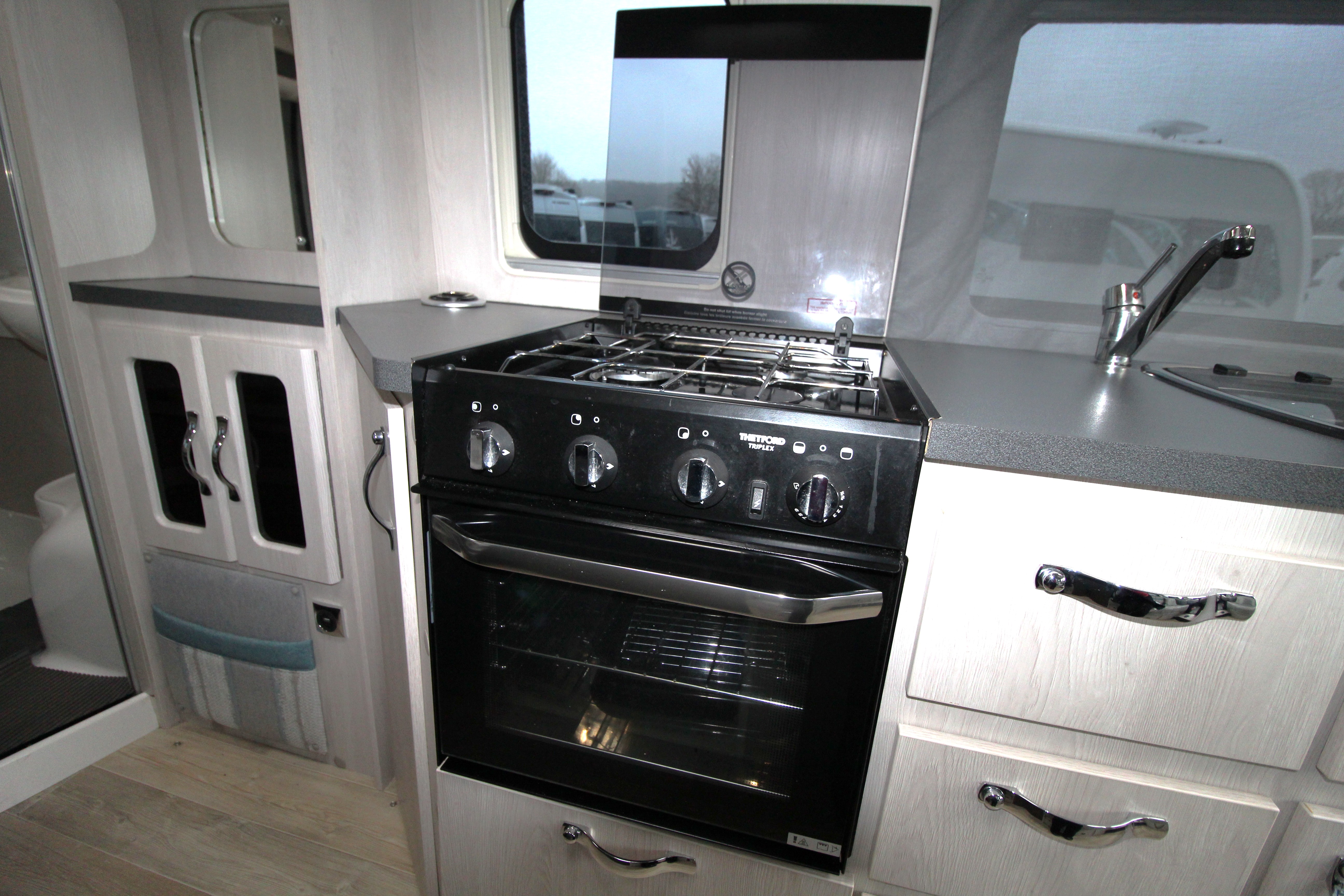 The well-equipped kitchen provides 3-gas burner hob, Thetford Triplex combi-oven, undercounter fridge with ice box, microwave and ample storage cabinets including a glass holder cabinet, and cupboards.