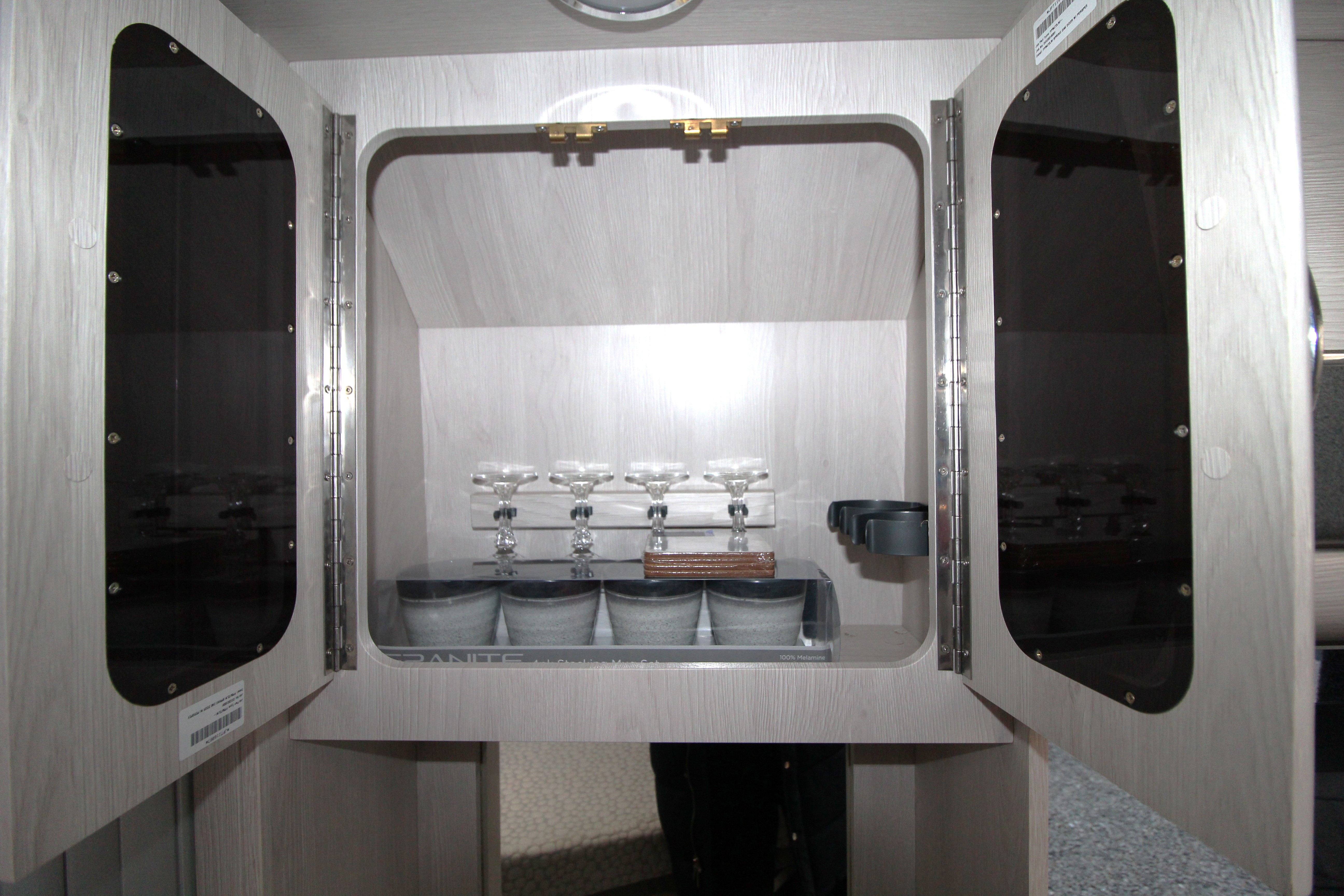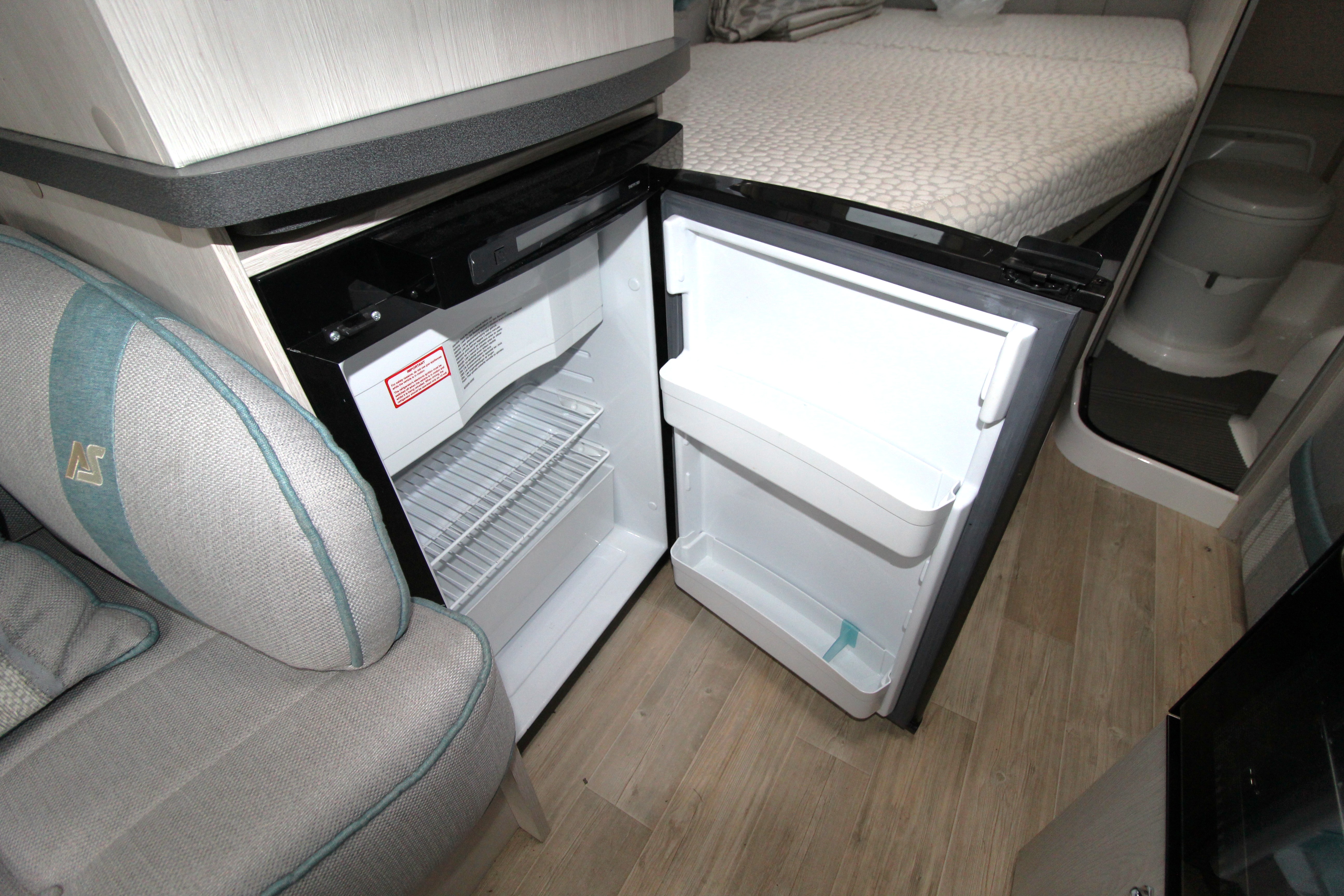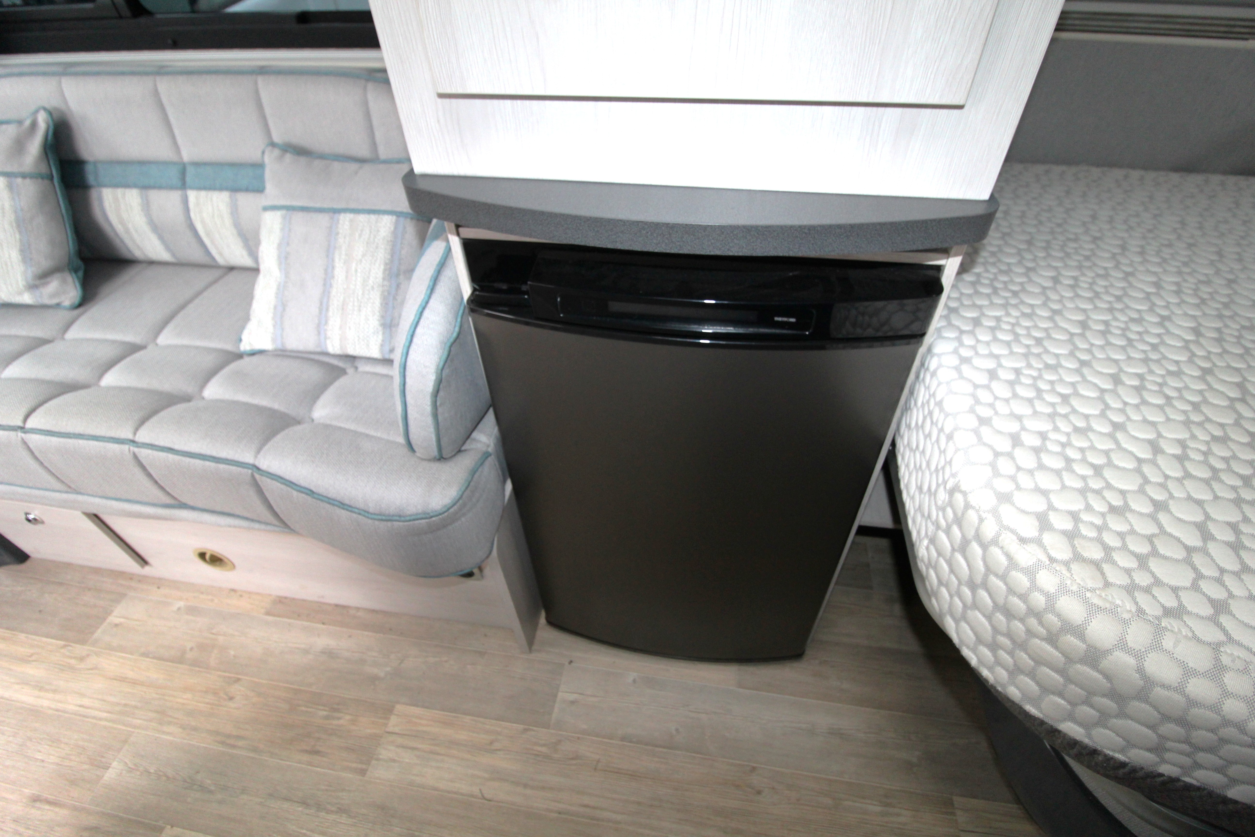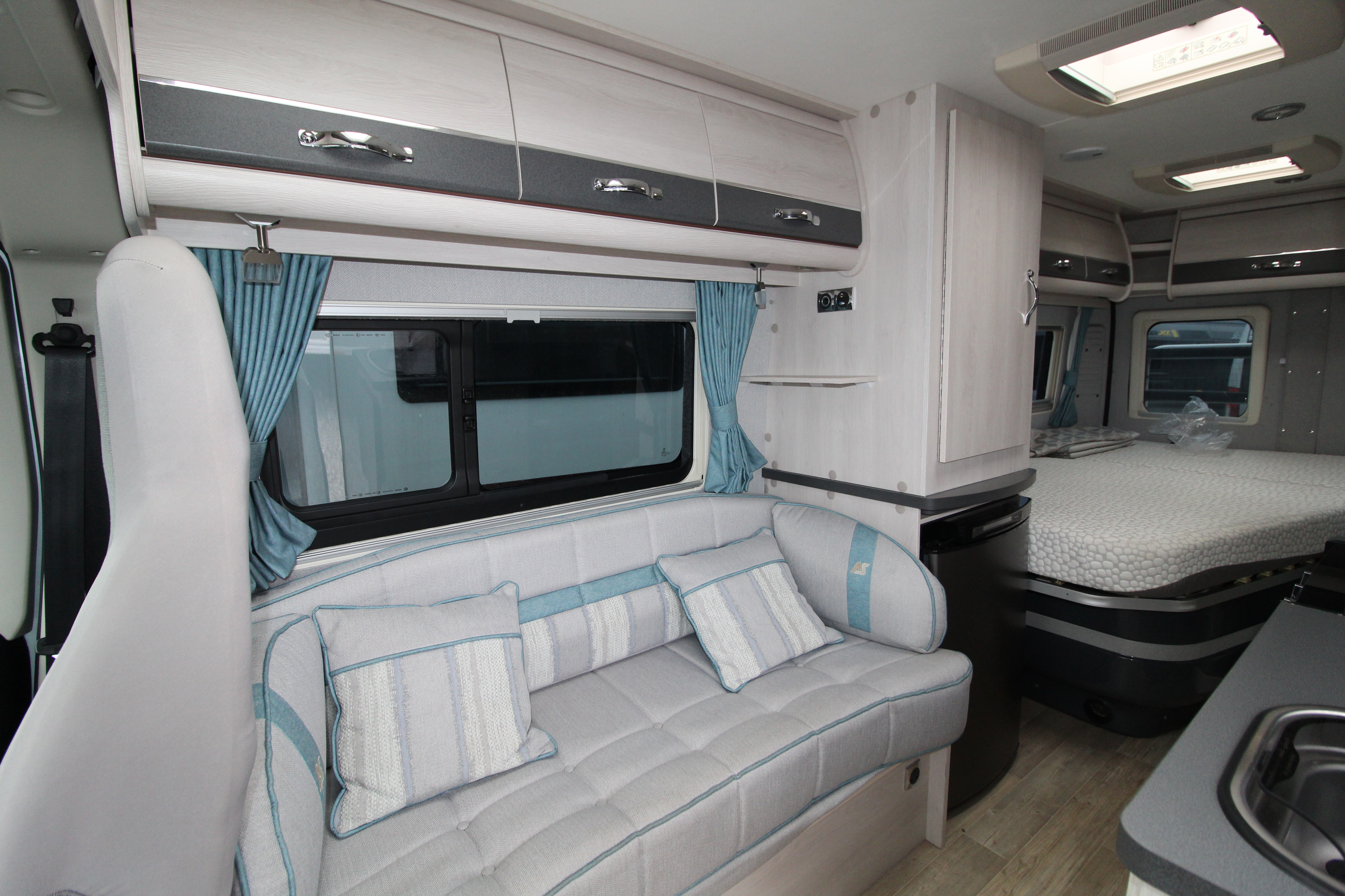 The well-equipped kitchen provides 3-gas burner hob, Thetford Triplex combi-oven, undercounter fridge with ice box, microwave and ample storage cabinets including a glass holder cabinet, and cupboards.