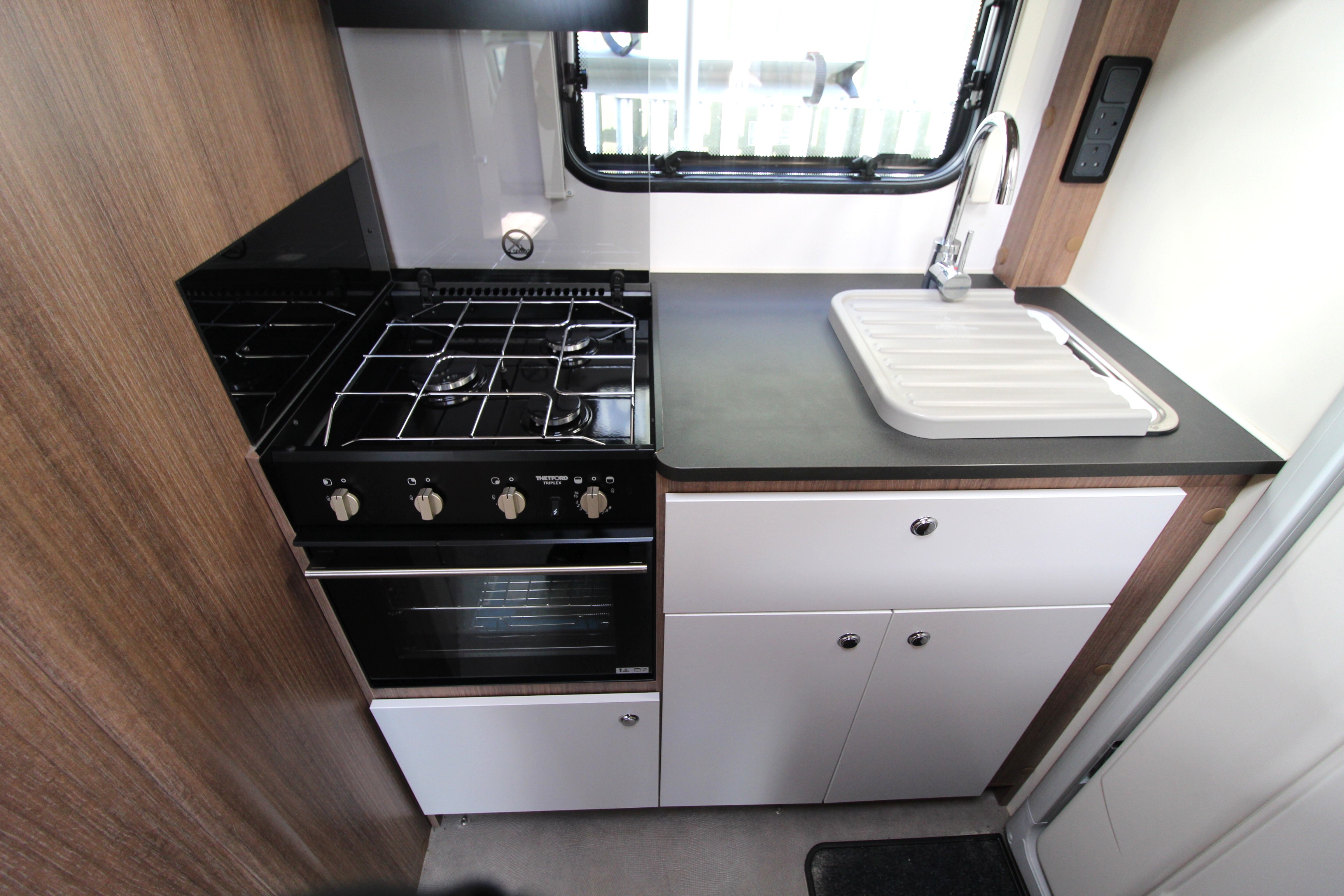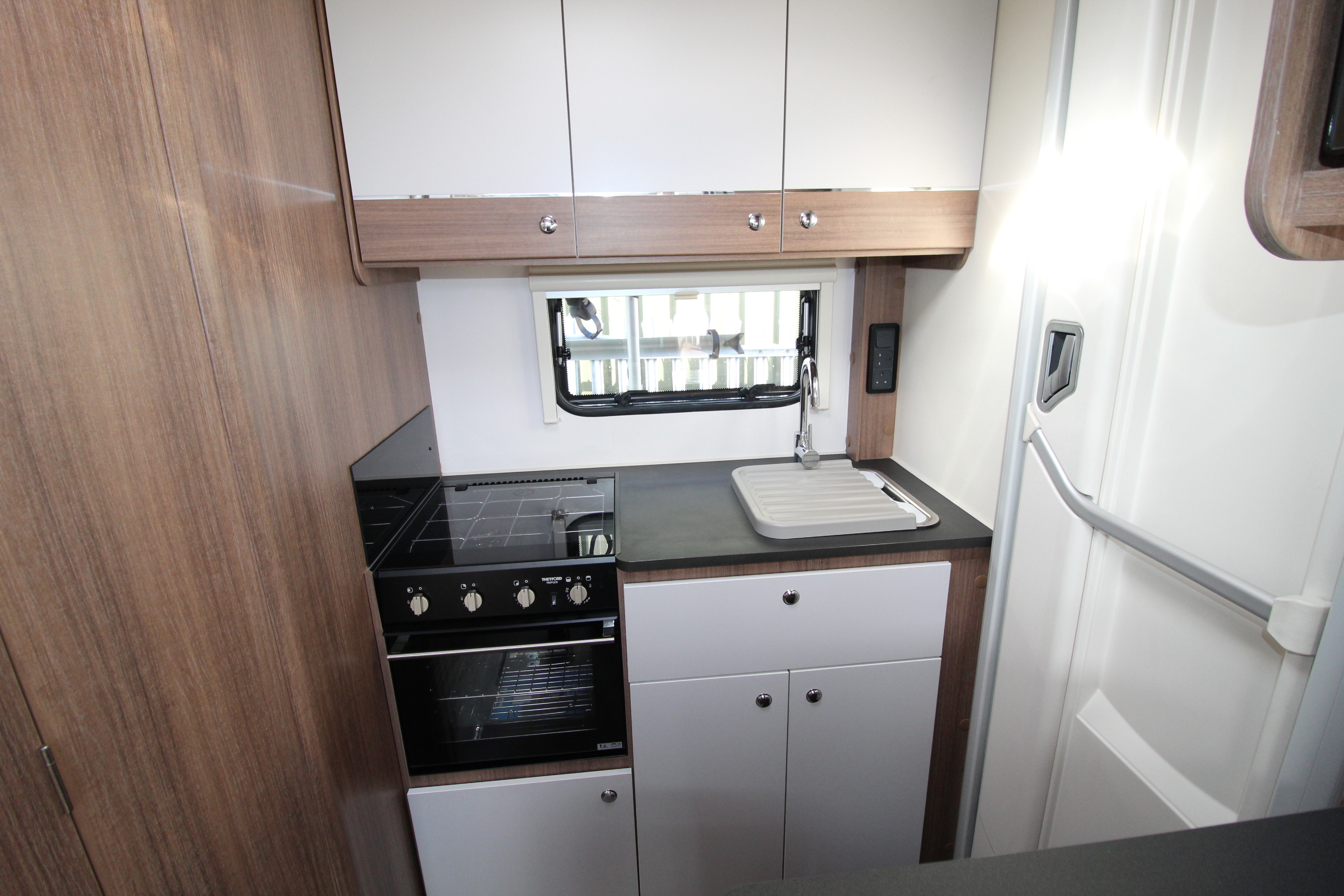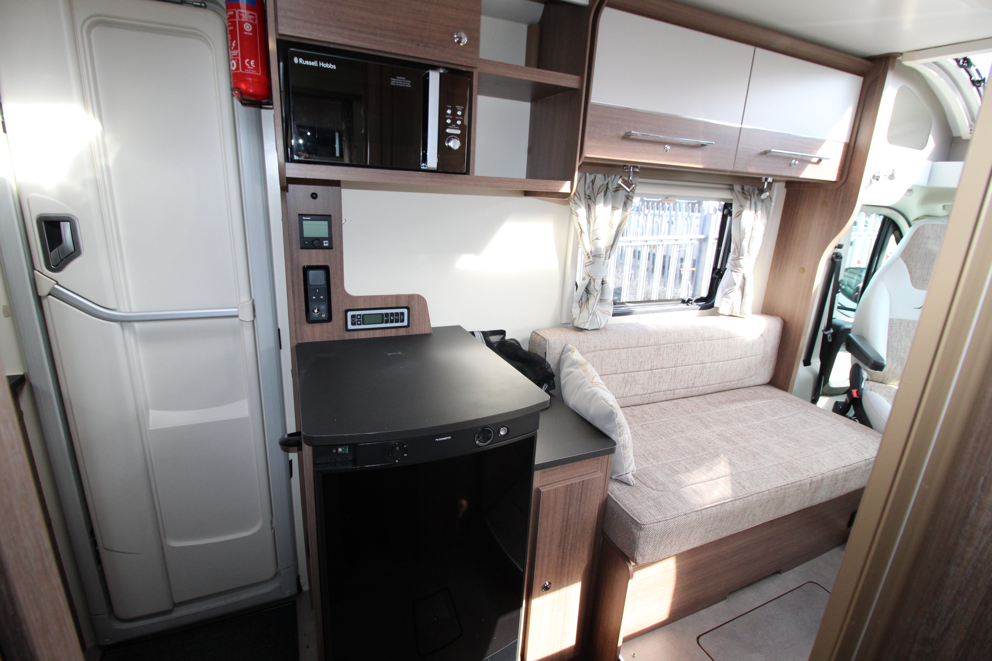 The long lounge area is complemented by swivel cab seats making it a sociable area to dine/entertain or simply relax. End kitchen facilities include Thetford Triplex 3 gas burner hob and combi oven/grill. An undercounter fridge is located below a display unit and provides extra workspace above and a microwave overhead.