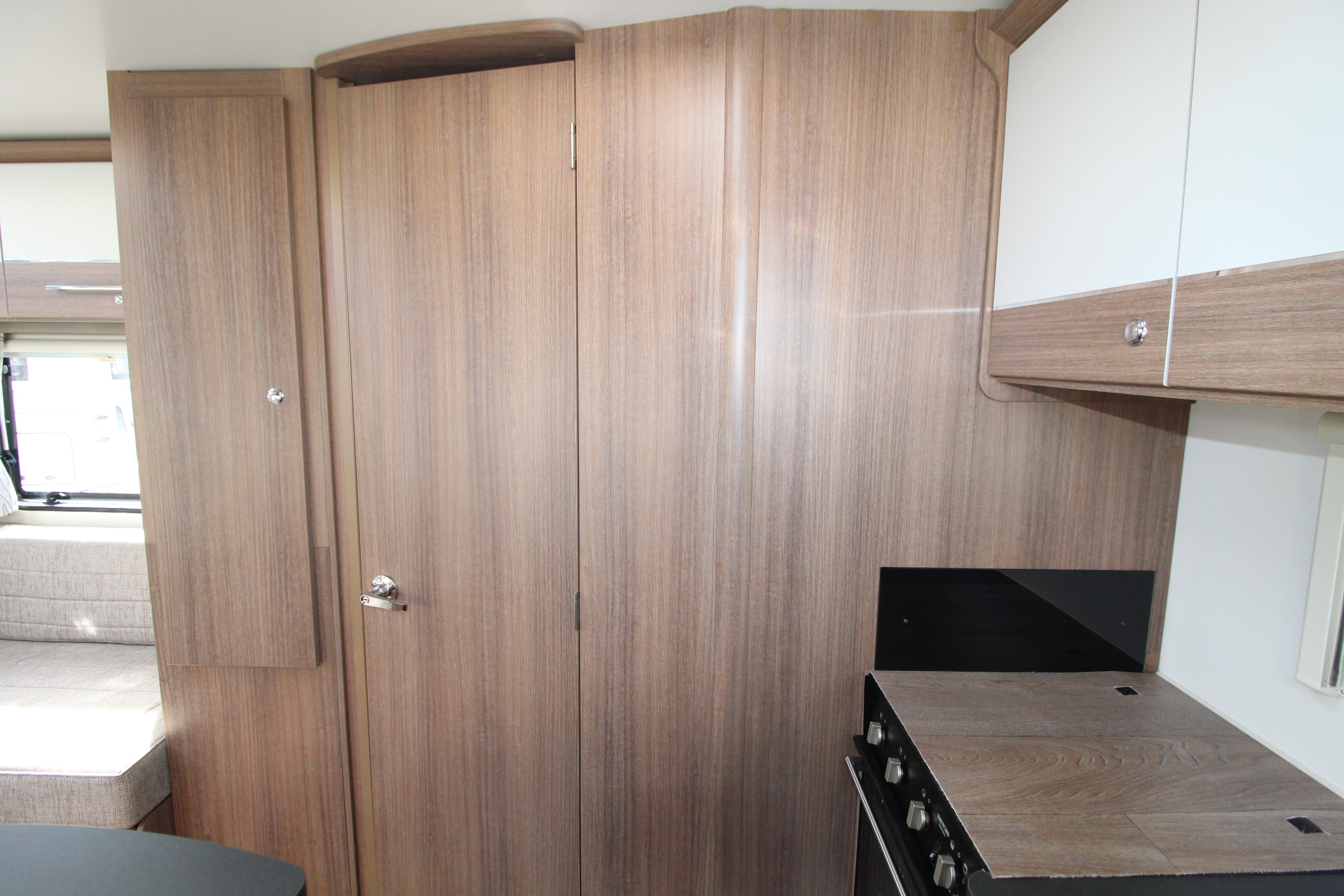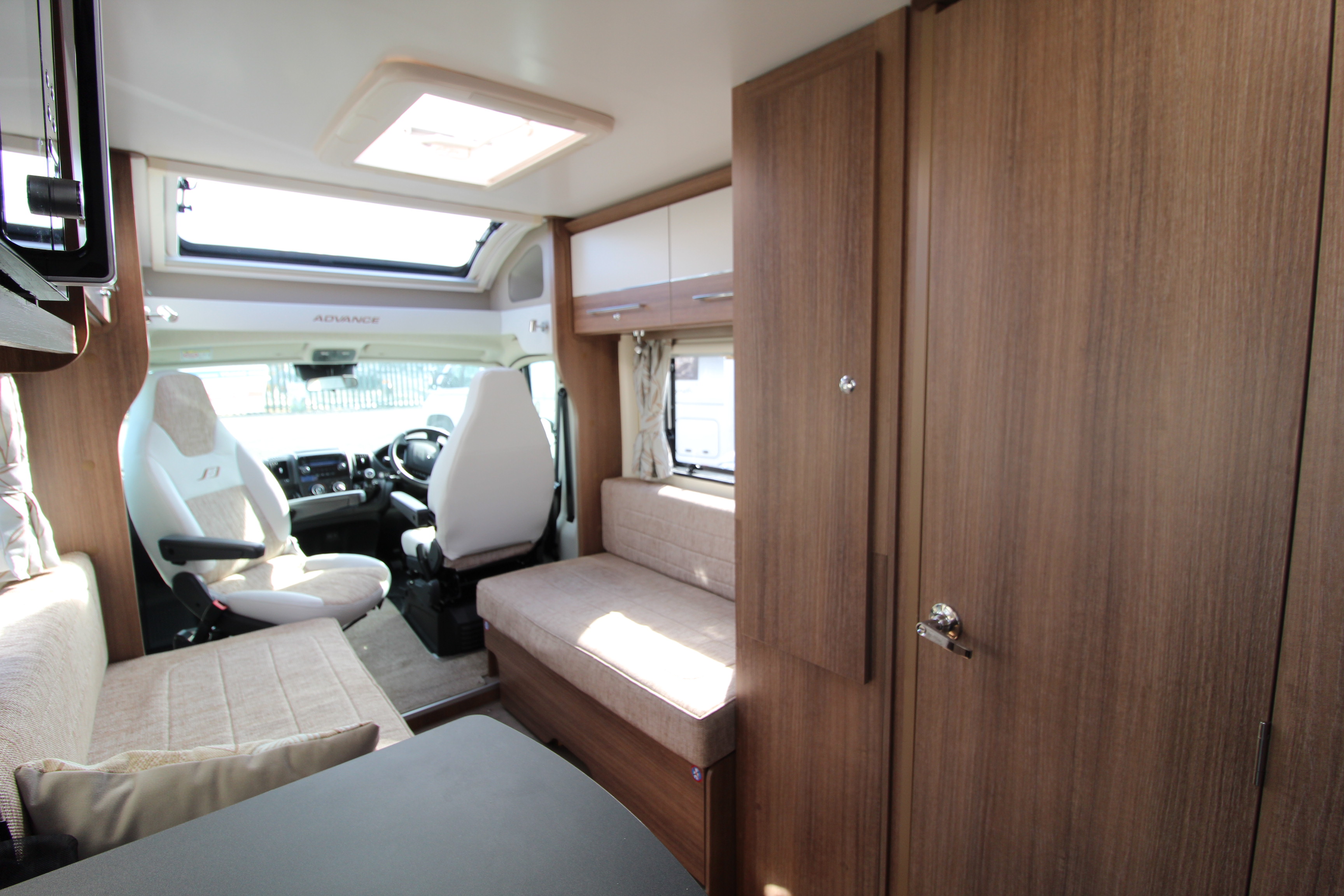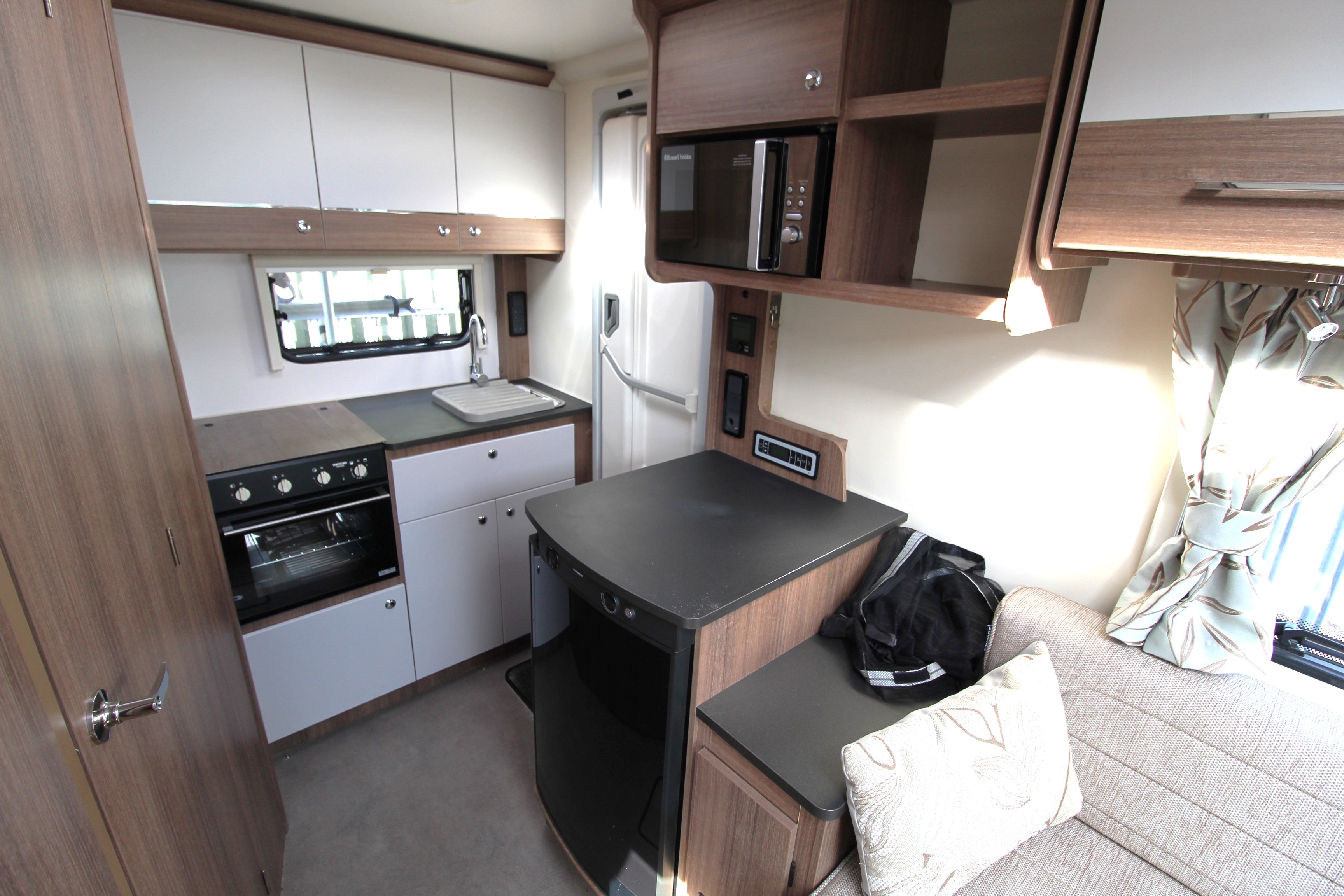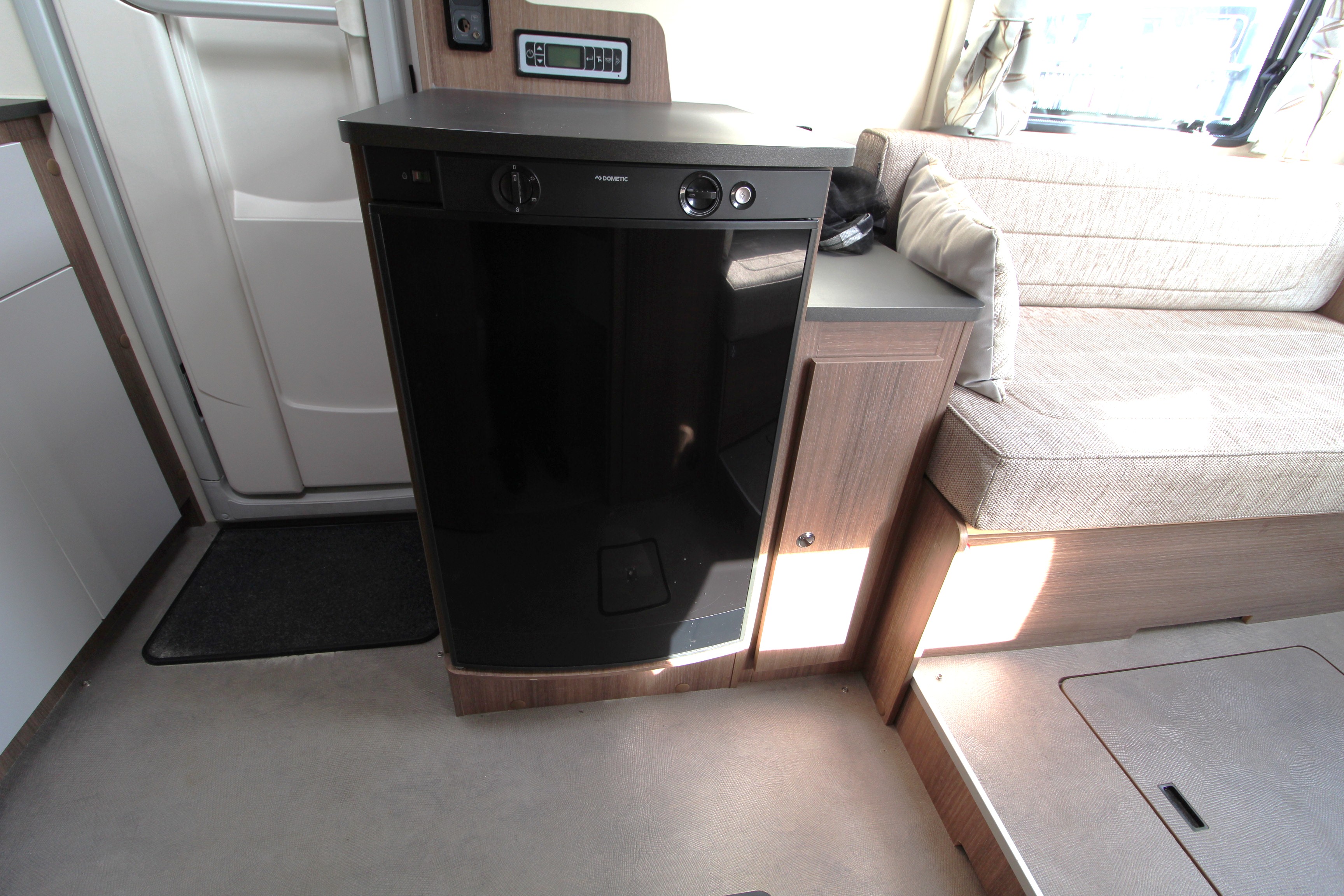 The long lounge area is complemented by swivel cab seats making it a sociable area to dine/entertain or simply relax. End kitchen facilities include Thetford Triplex 3 gas burner hob and combi oven/grill. An undercounter fridge is located below a display unit and provides extra workspace above and a microwave overhead.