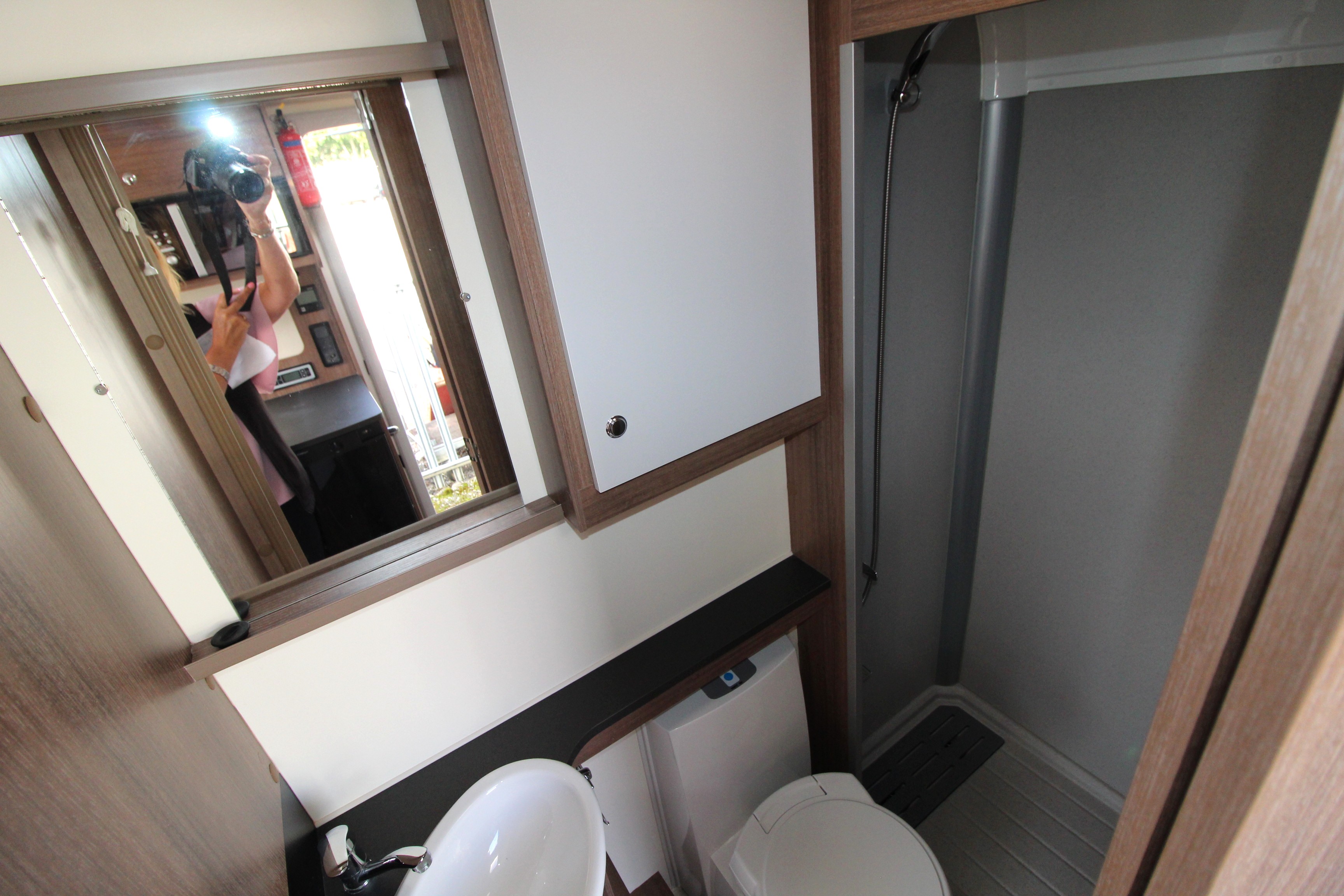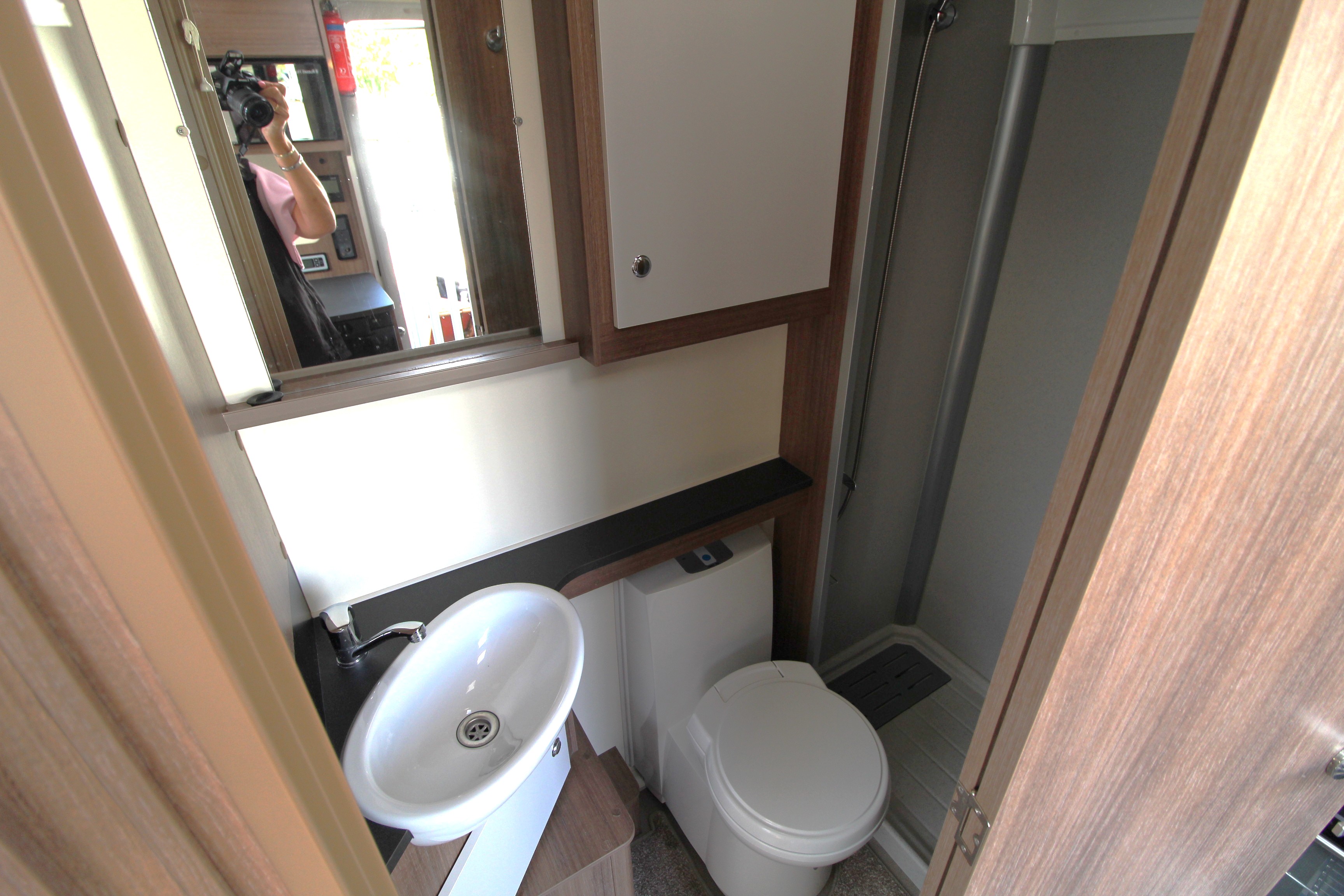 Washroom facilities corner washbasin, cassette toilet and shower cubicle.