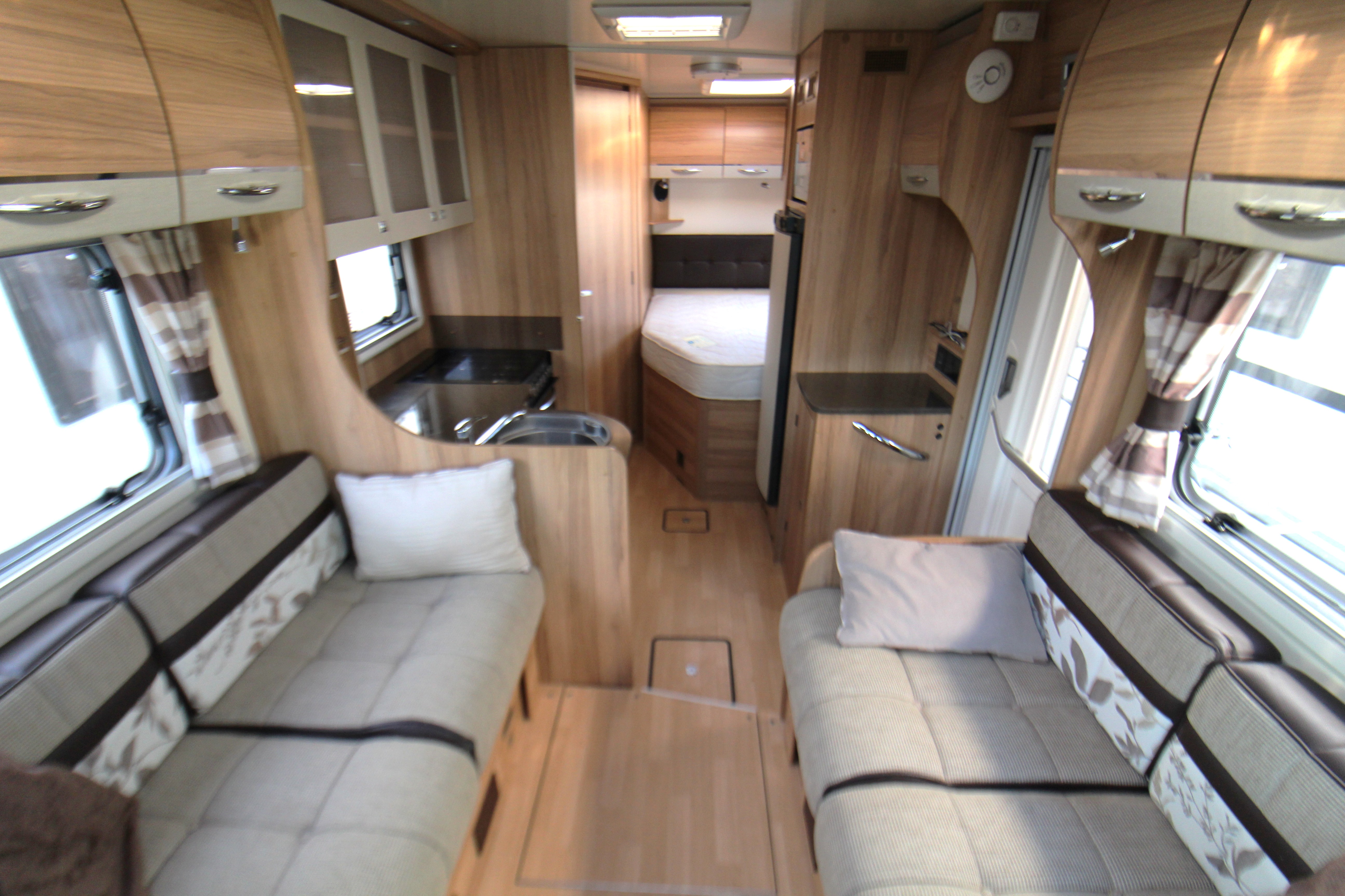 Complete with a spacious front lounge area with face-to-face seating and swivel cab seats, this area has the ability to convert to an additional sleeping area for two people. The l-shaped kitchen provides a dual-fuel hob (3+1),Thetford Caprice MKIII oven and grill, tall Dometic fridge with removable icebox, Daewoo microwave and ample storage cabinets and work surface.