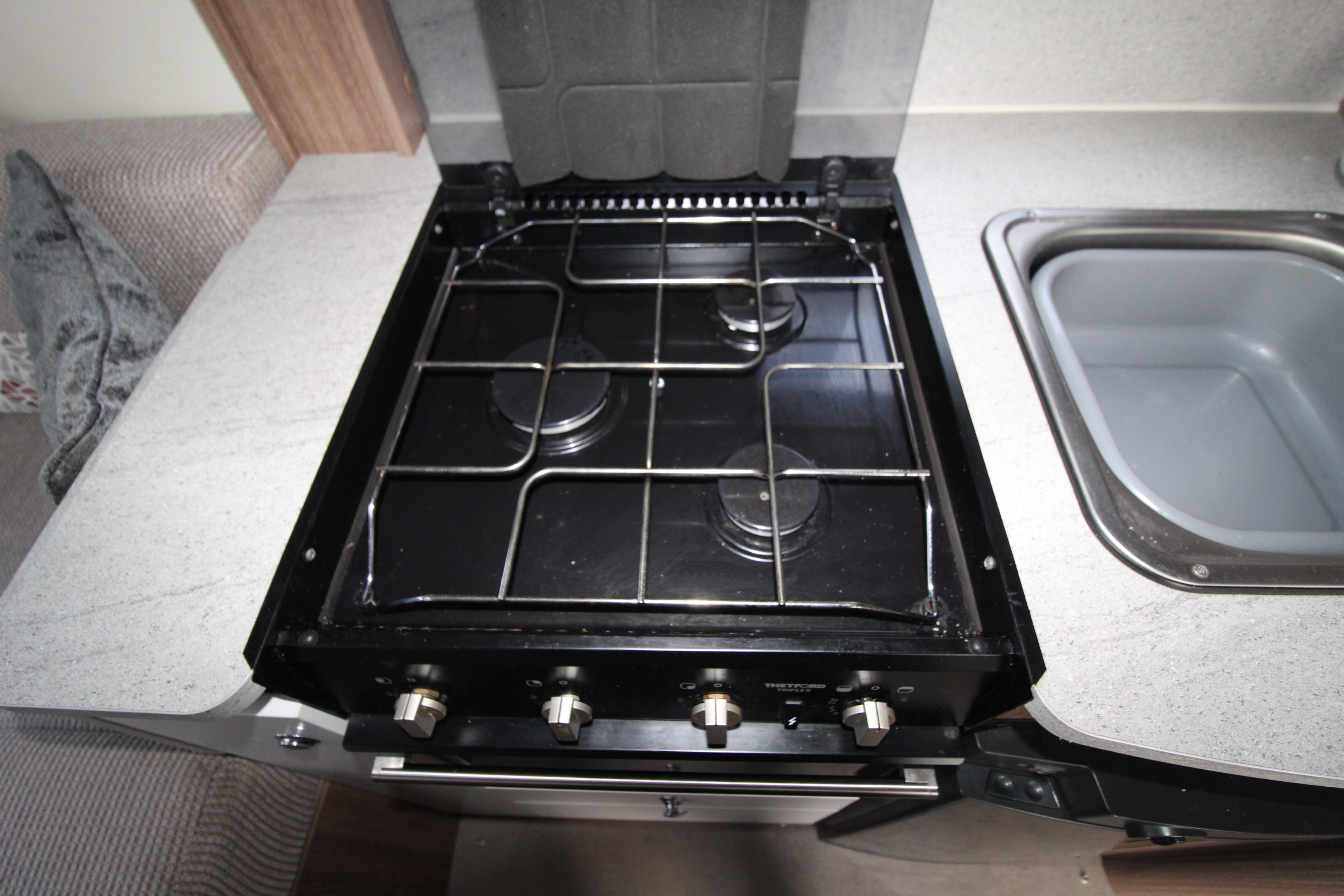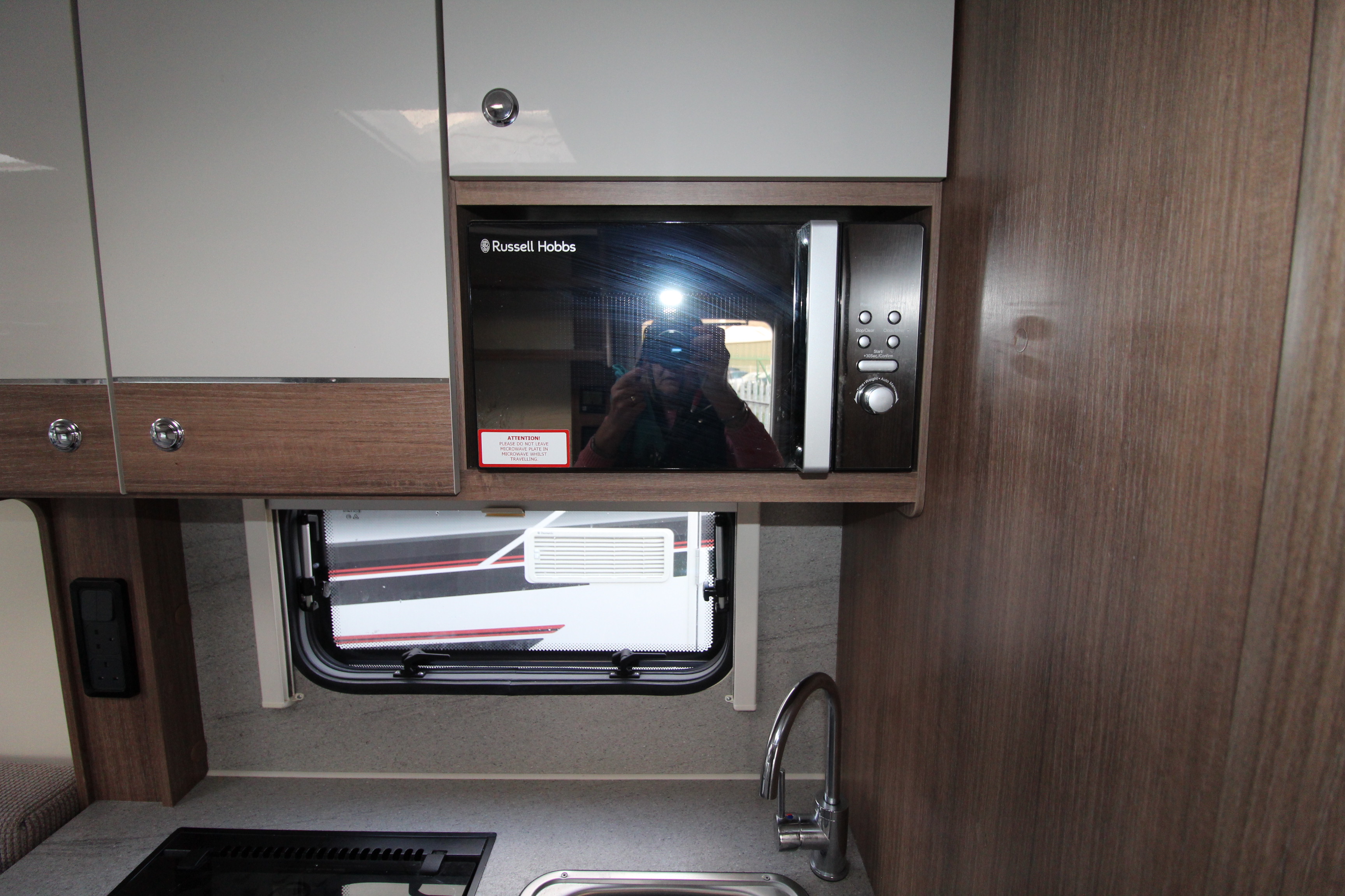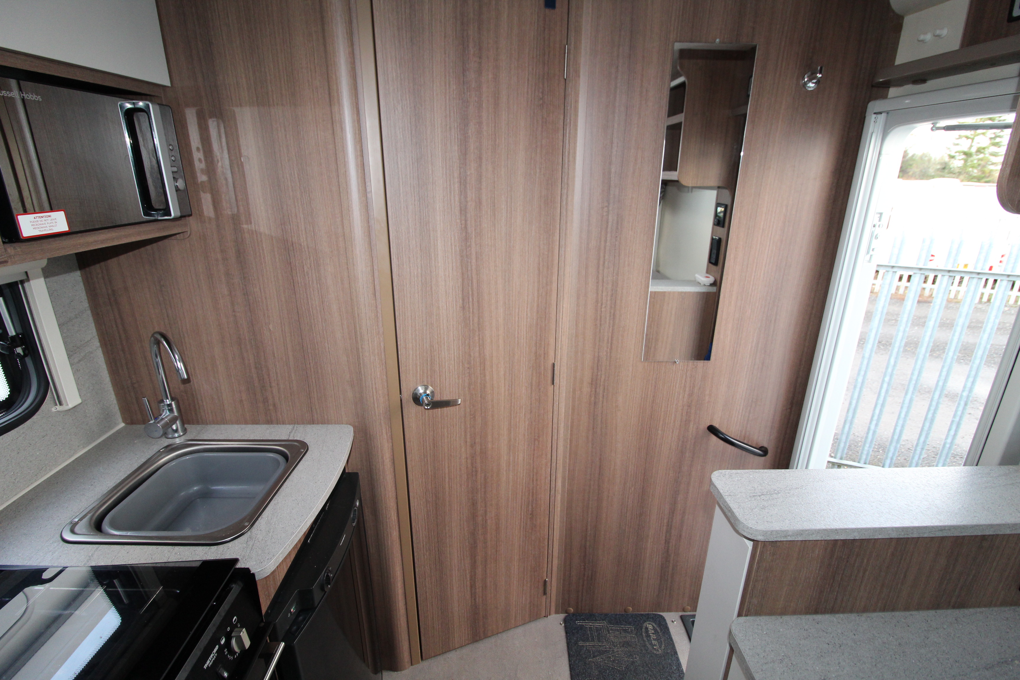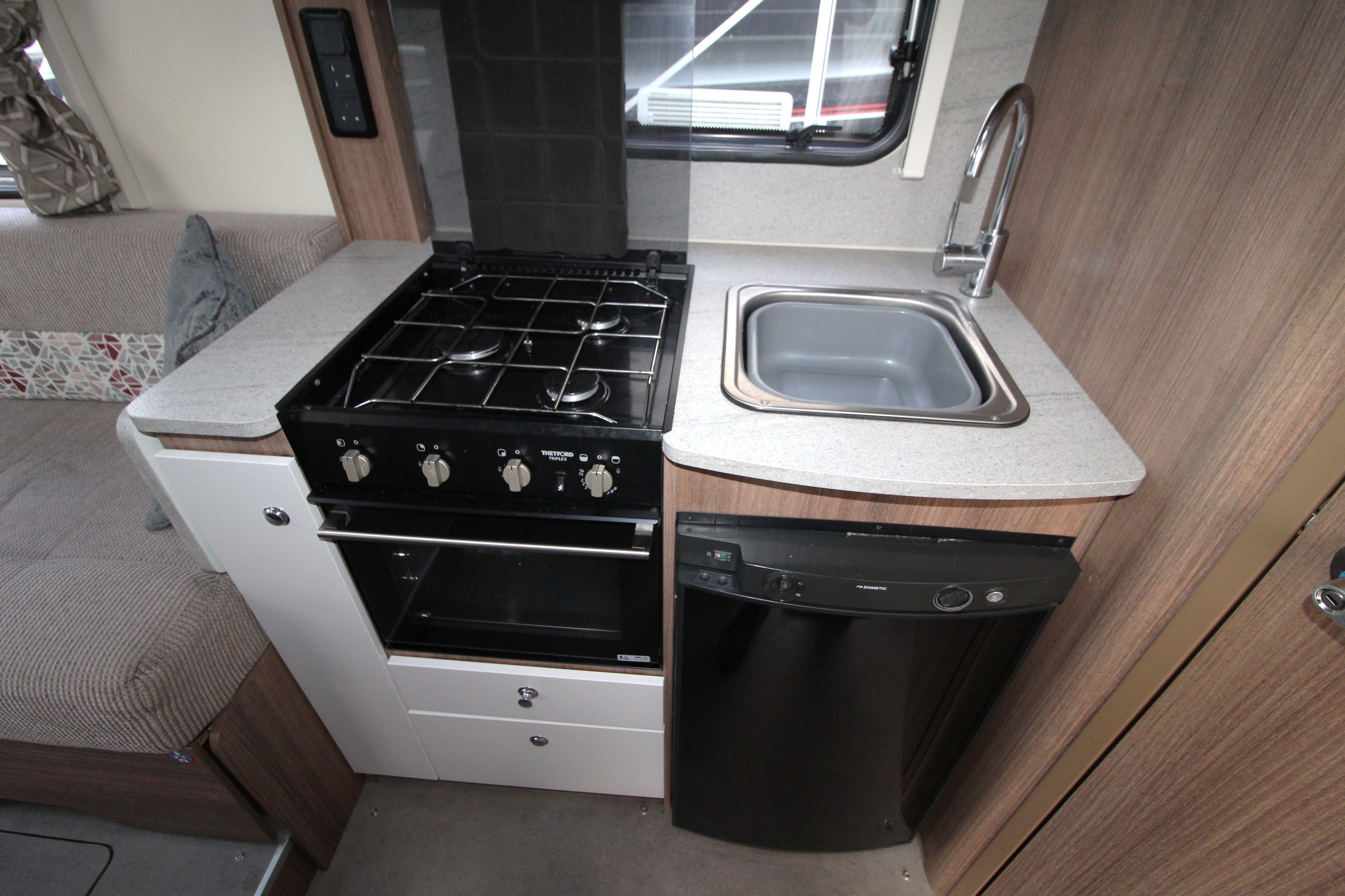 Kitchen facilities include 3-gas burner hob, combi oven, microwave, undercounter fridge, extendable work surface and ample cupboards. Opposite the kitchen is a display unit with table storage cupboard, 3-deep drawers, display surface and shelving above.