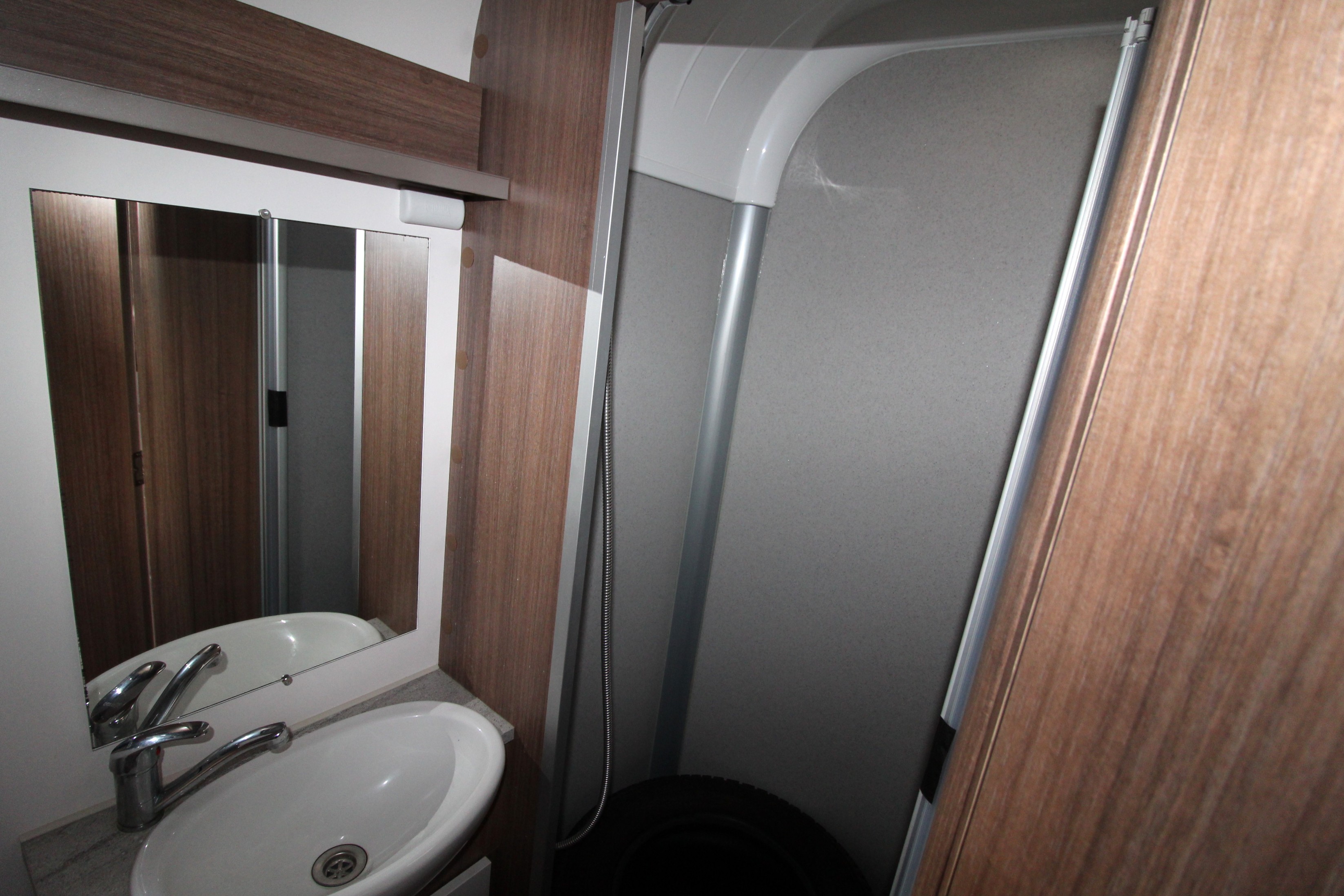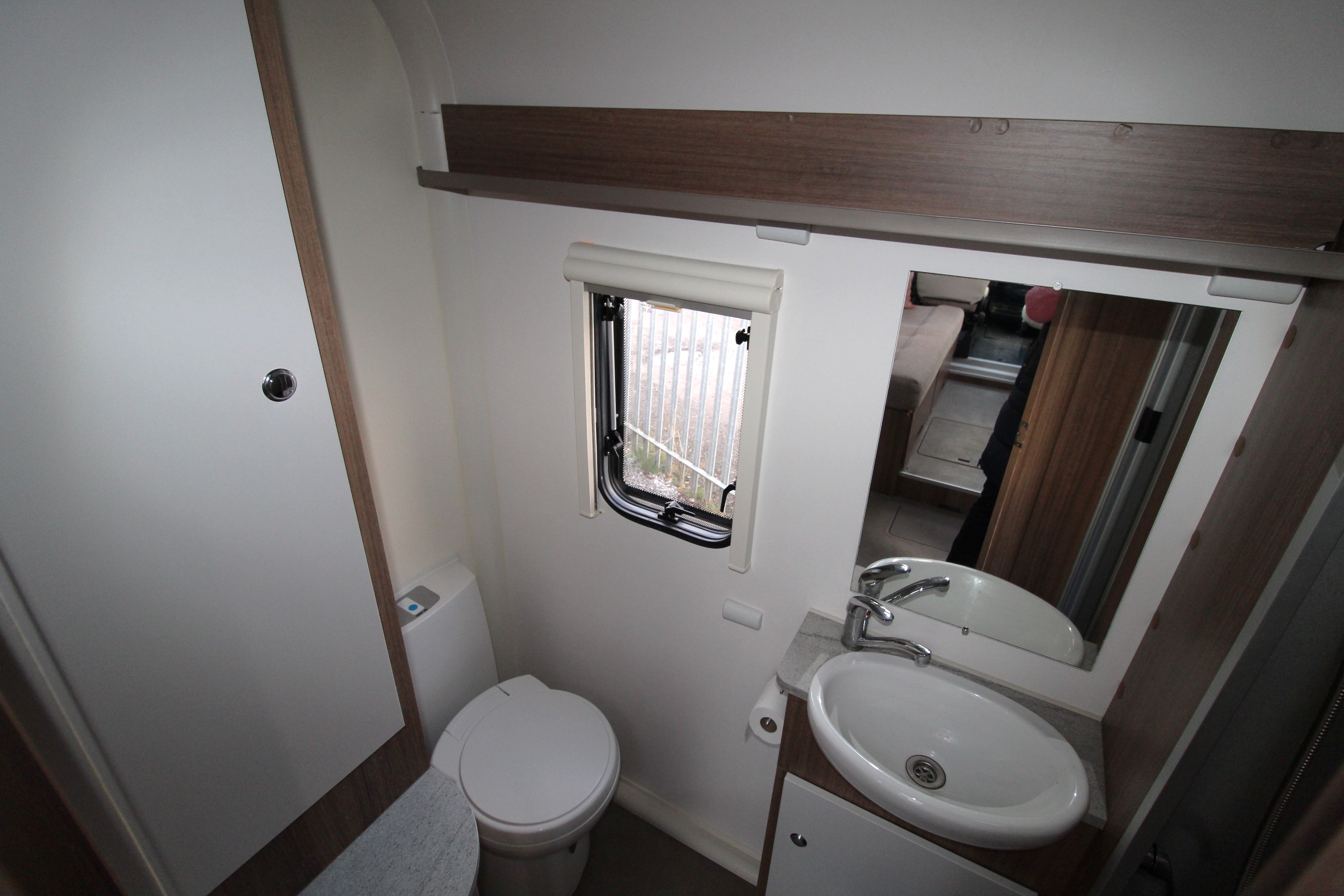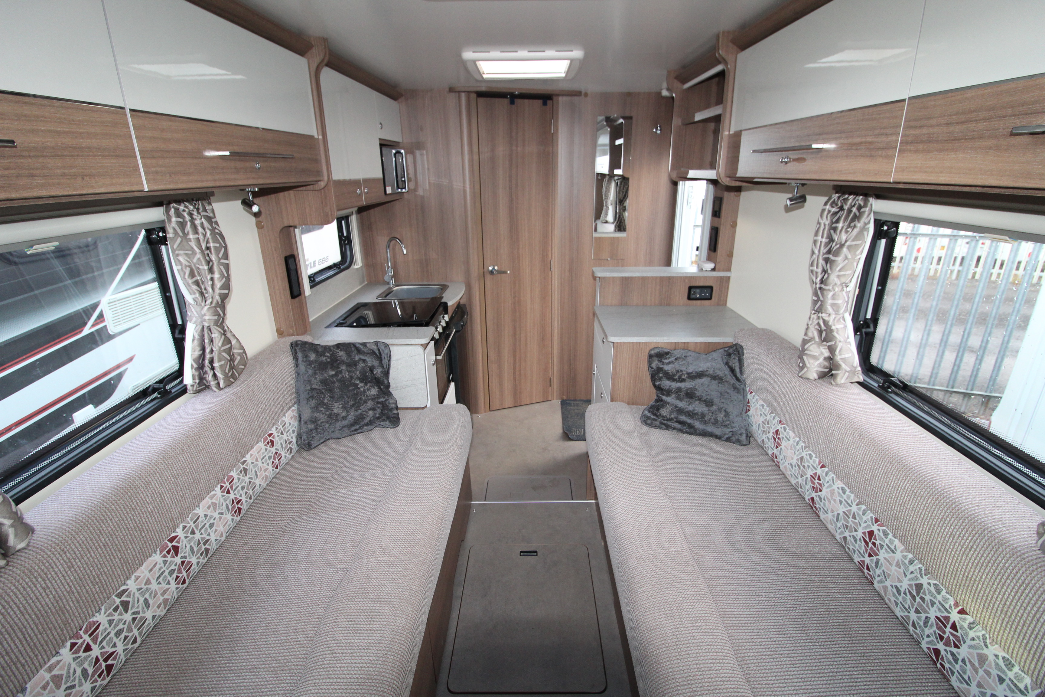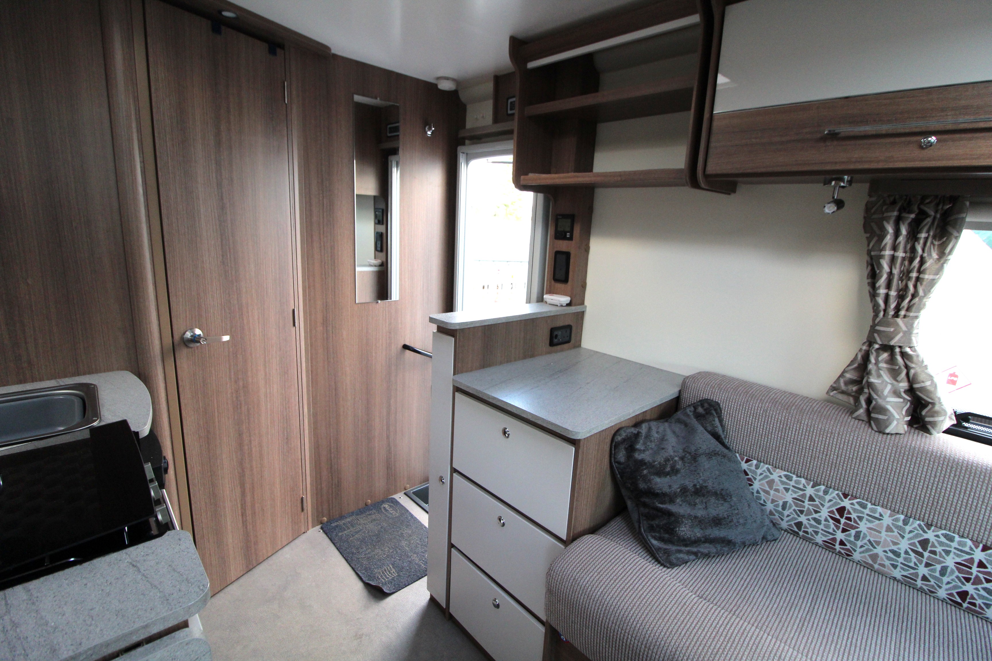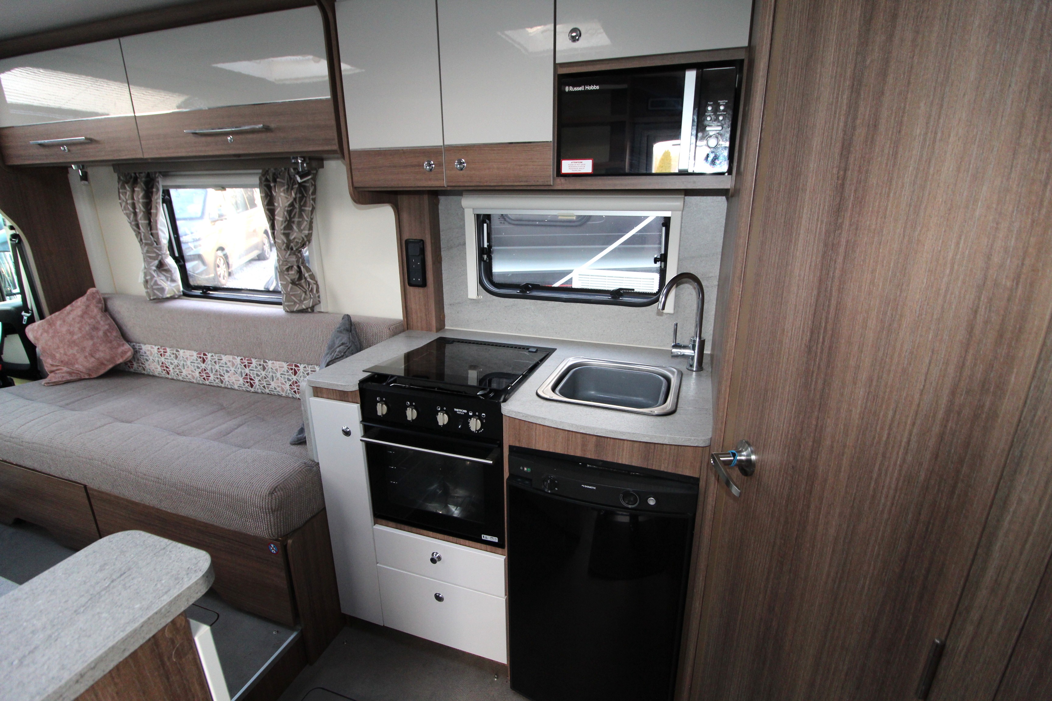 The full width end washroom features cassette toilet, vanity sink unit, shower cubicle and a wardrobe. Further storage can be found under the bench seats and overhead in the multiple lockers.