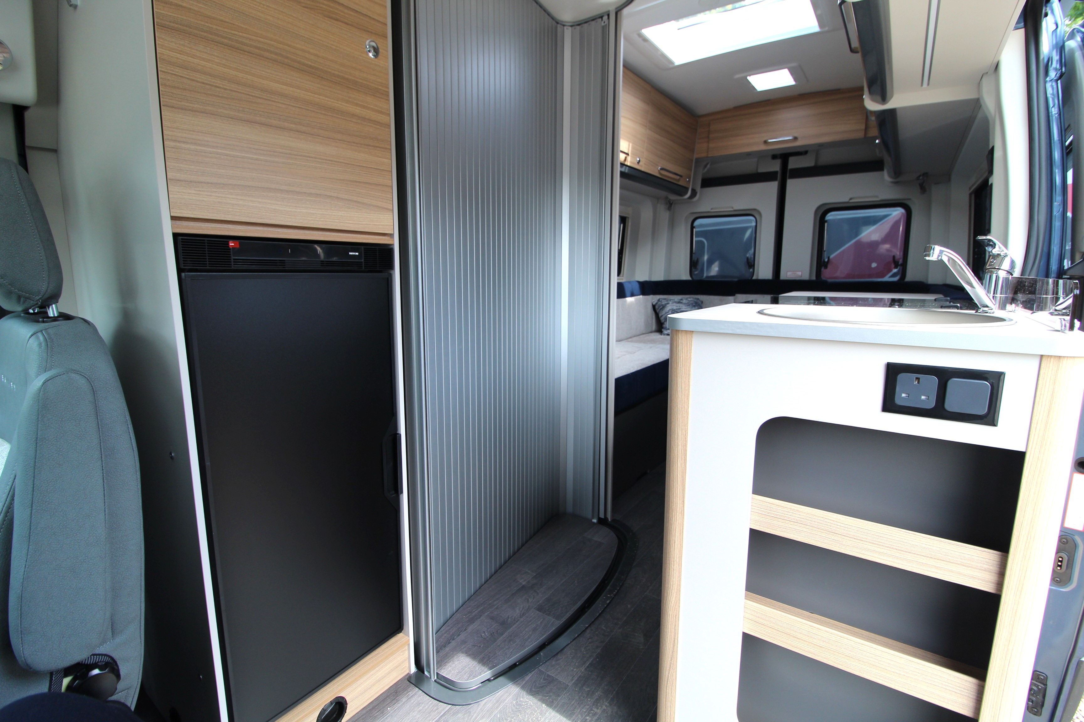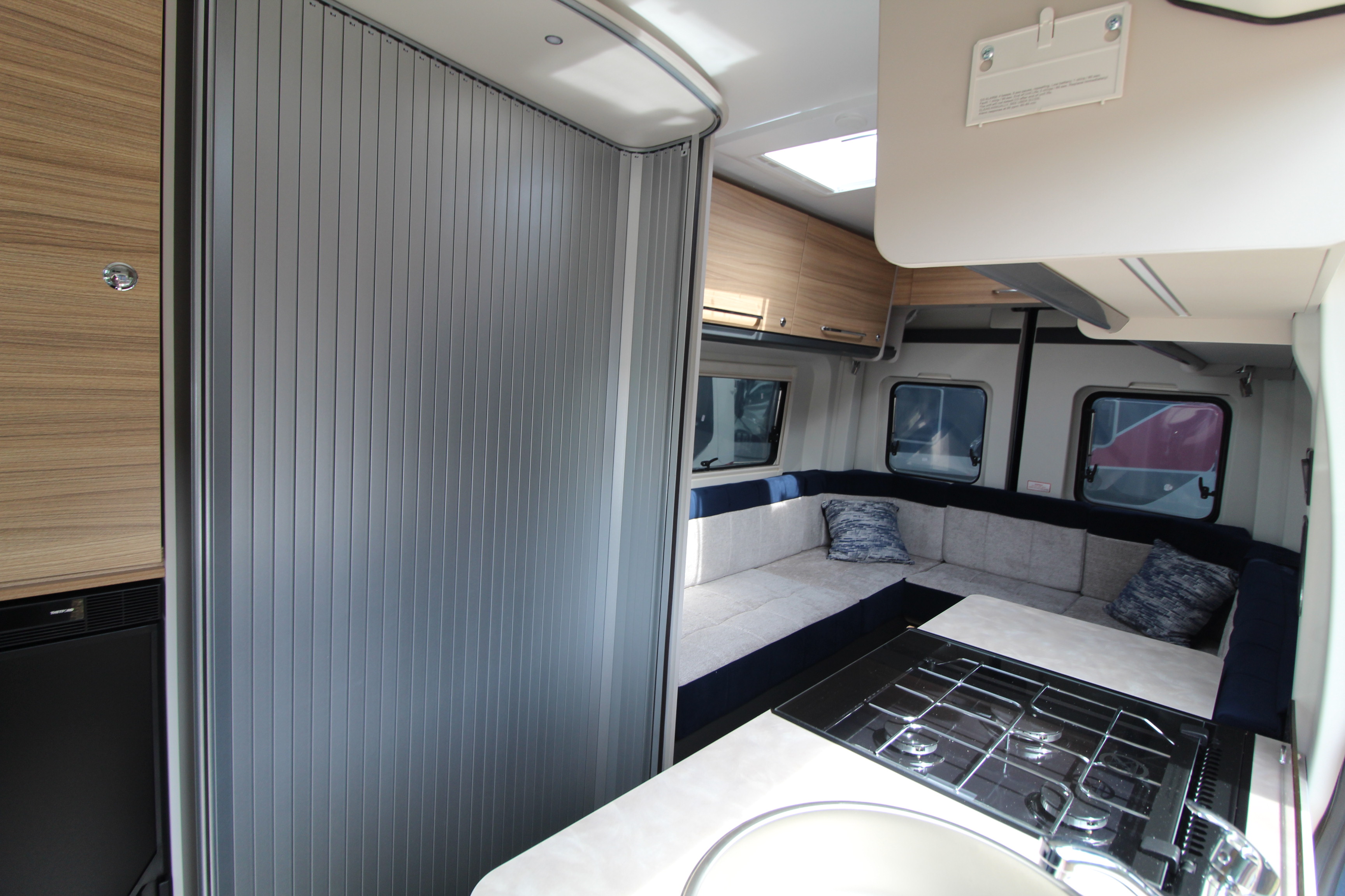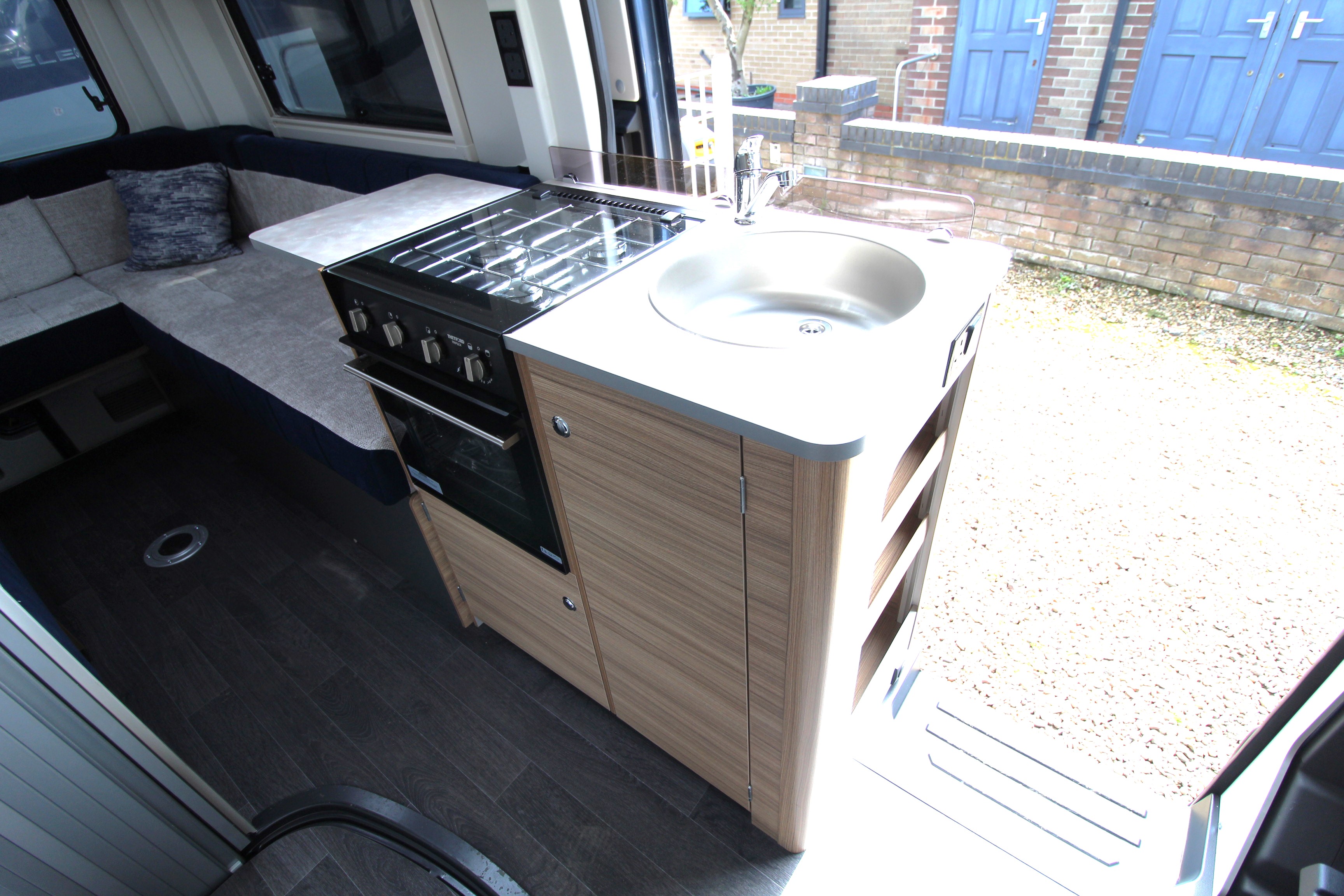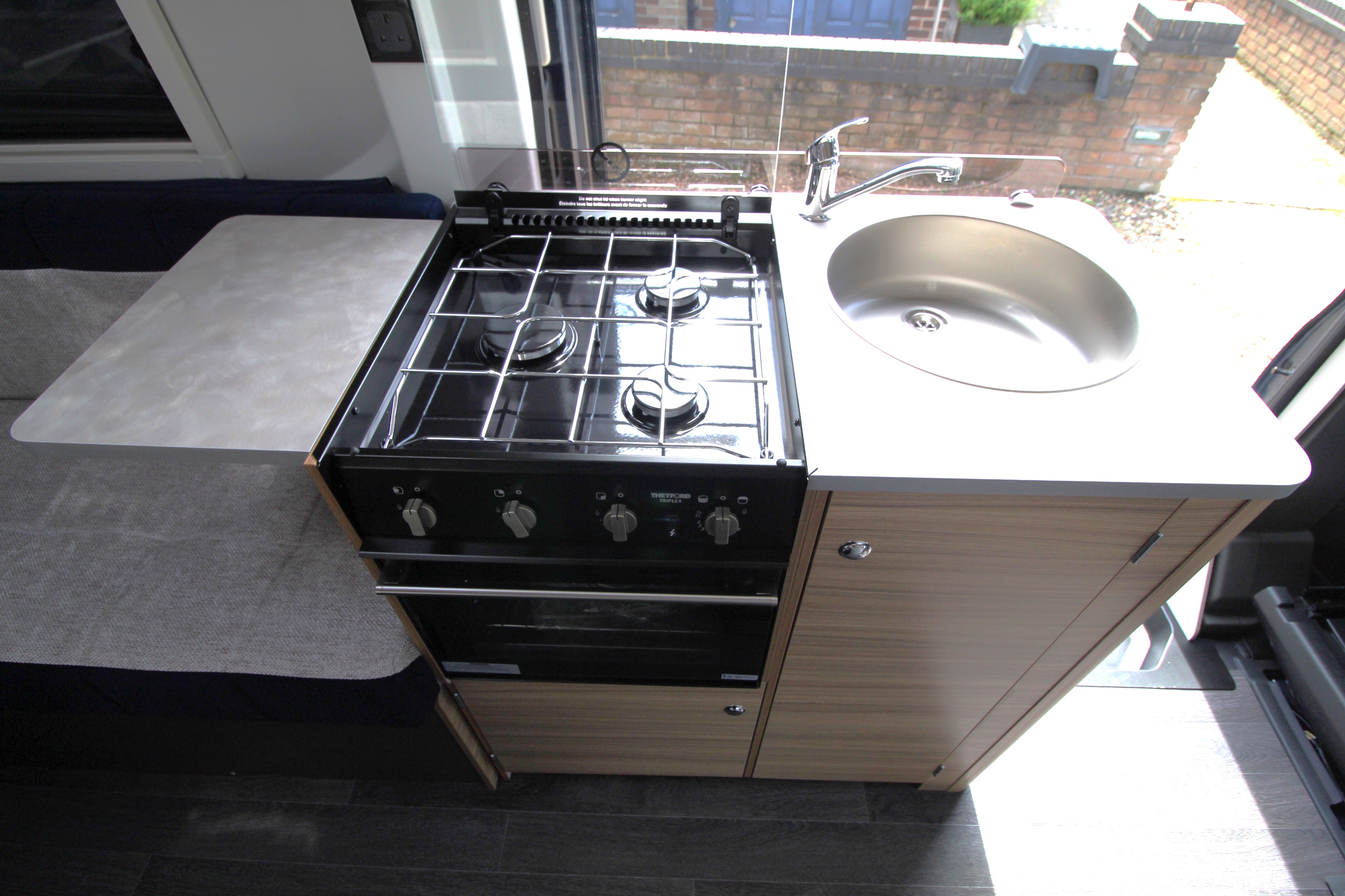 Kitchen facilities include a Thetford 90L compressor fridge, a 3-ring gas hob and combination oven and grill, giving you the opportunity in the cooler months to enjoy a piping hot meal or cooked breakfast!