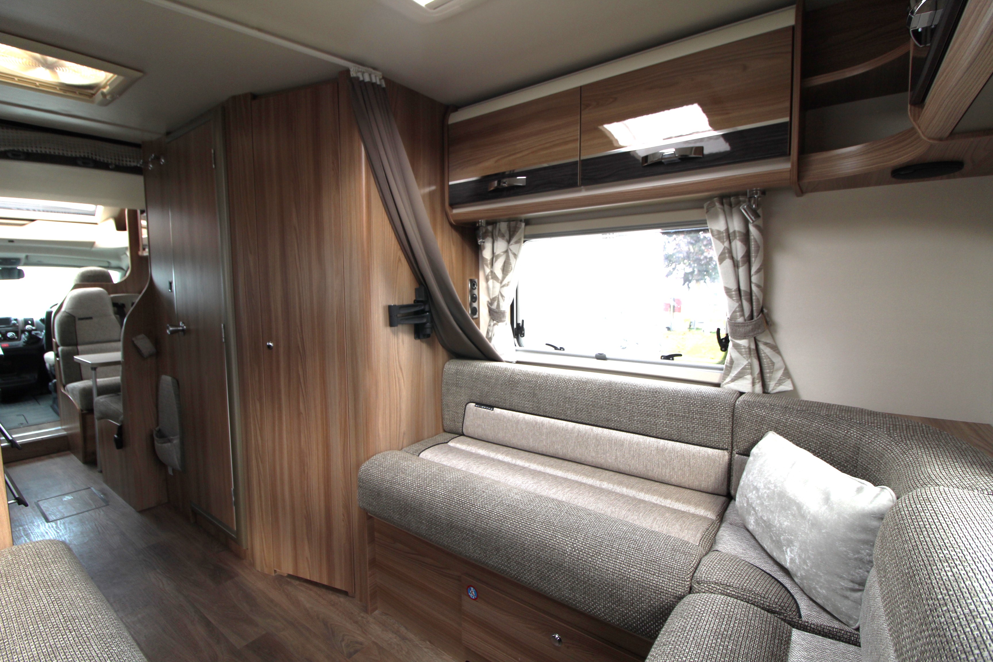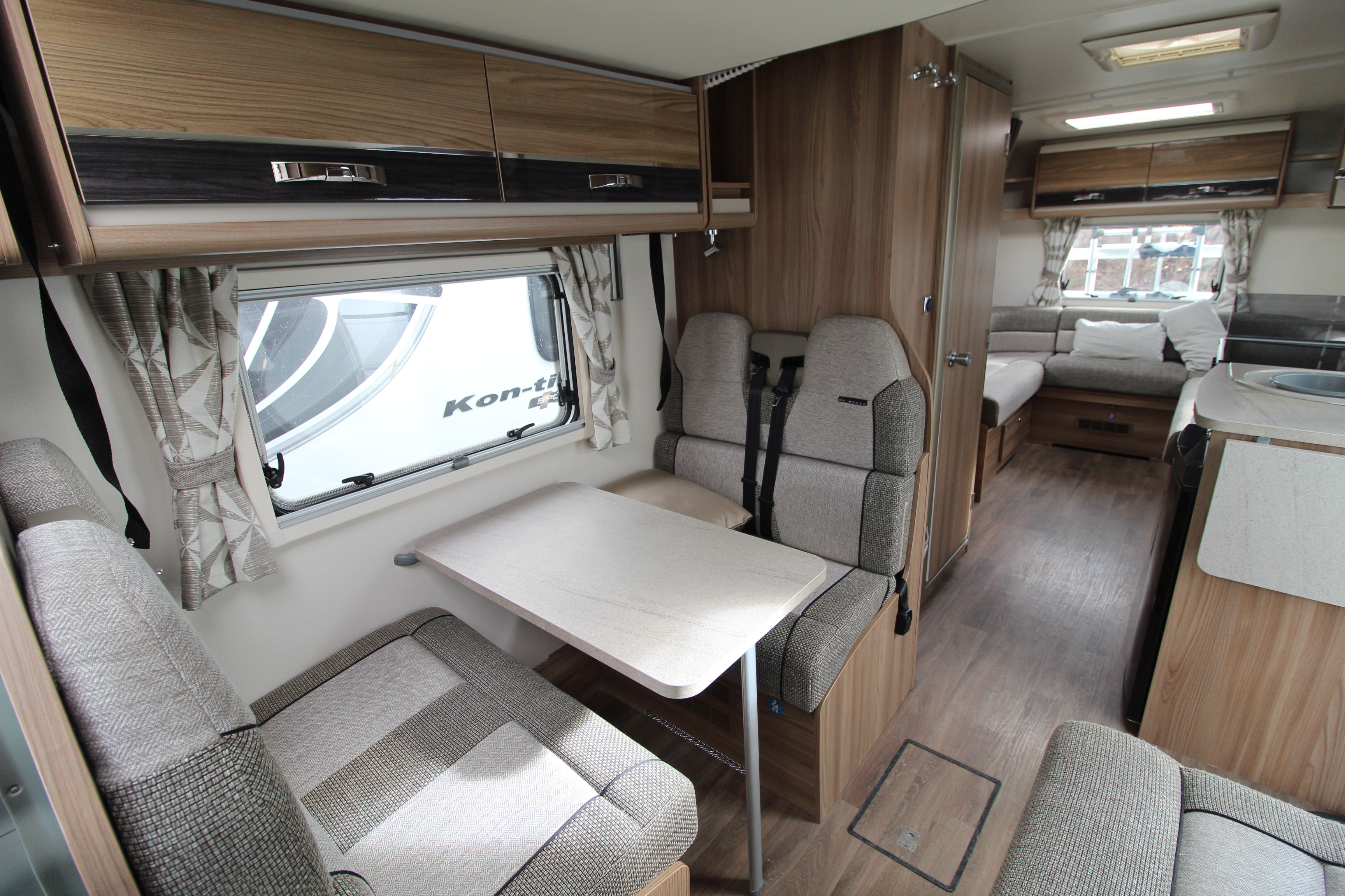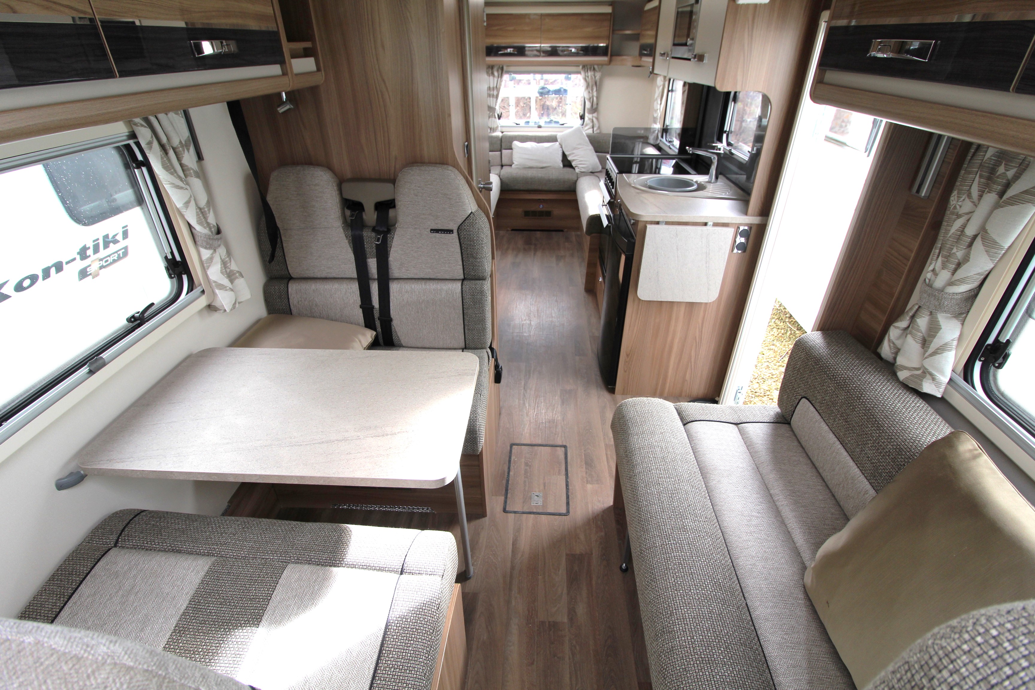 In excellent condition throughout a generous front lounge area with forward, rear facing and side bench cab seats around a dining table to complement a spacious rear lounge area, the family have plenty of options to relax or play games. Over the front lounge area you will find a drop down double bed,