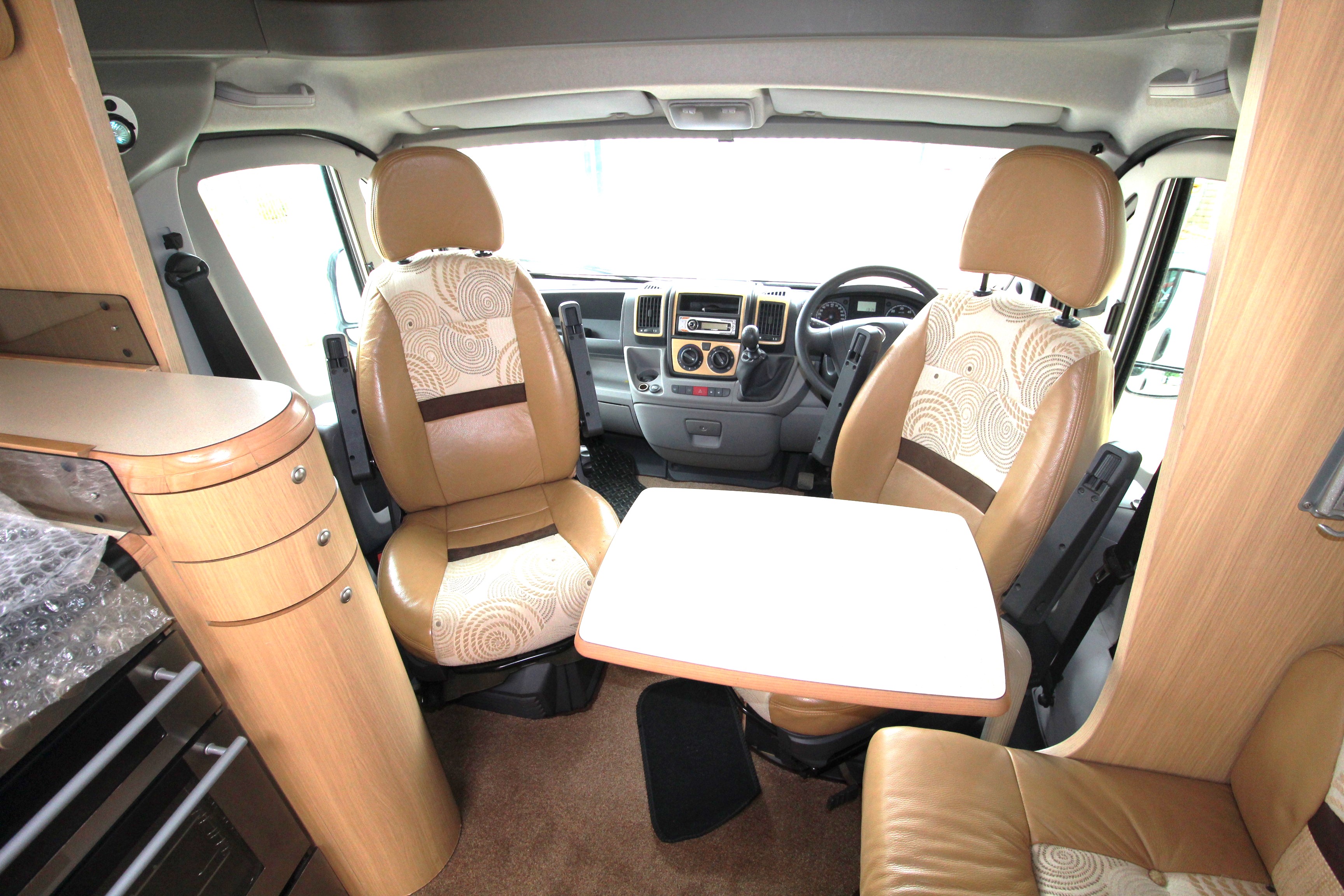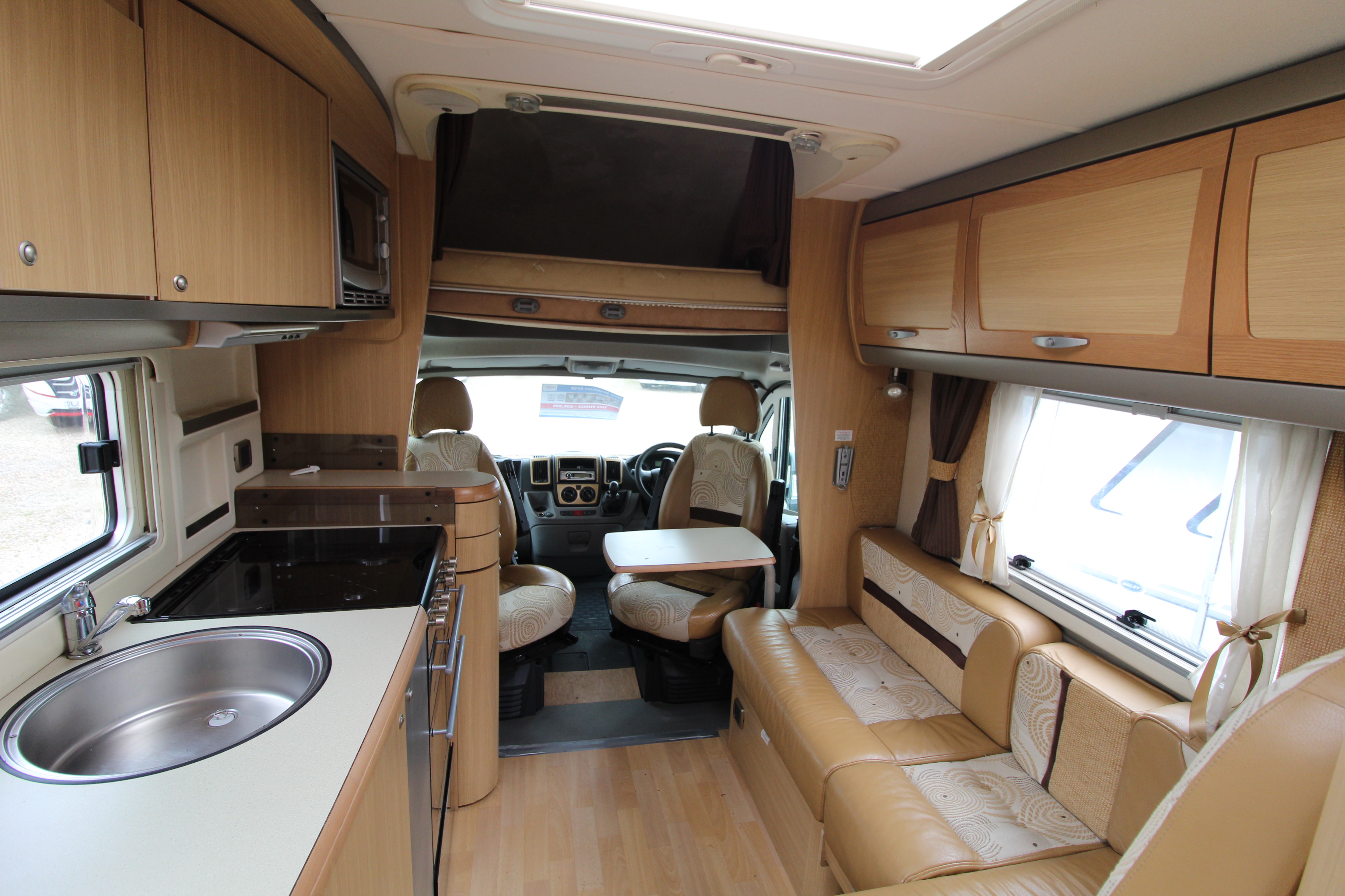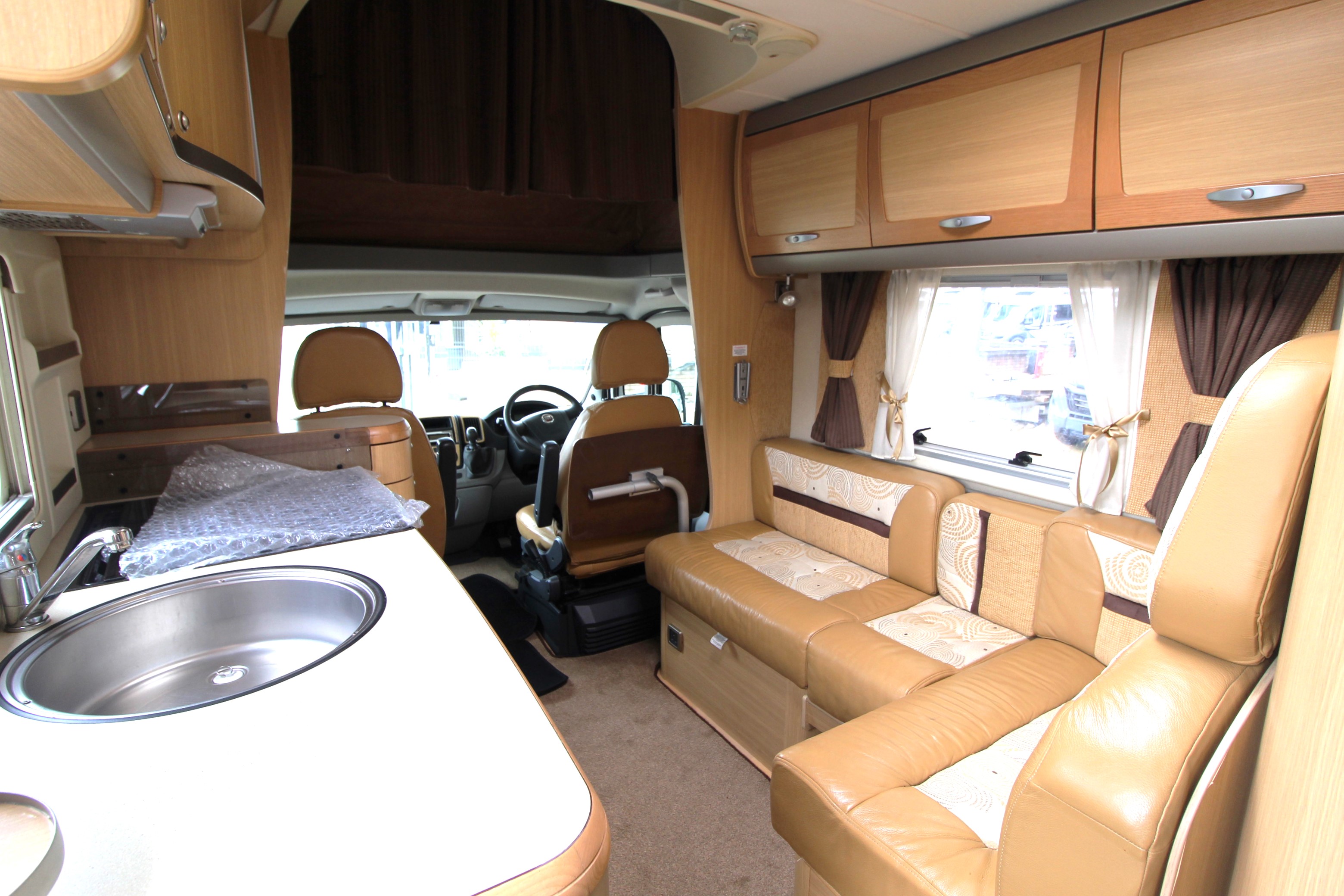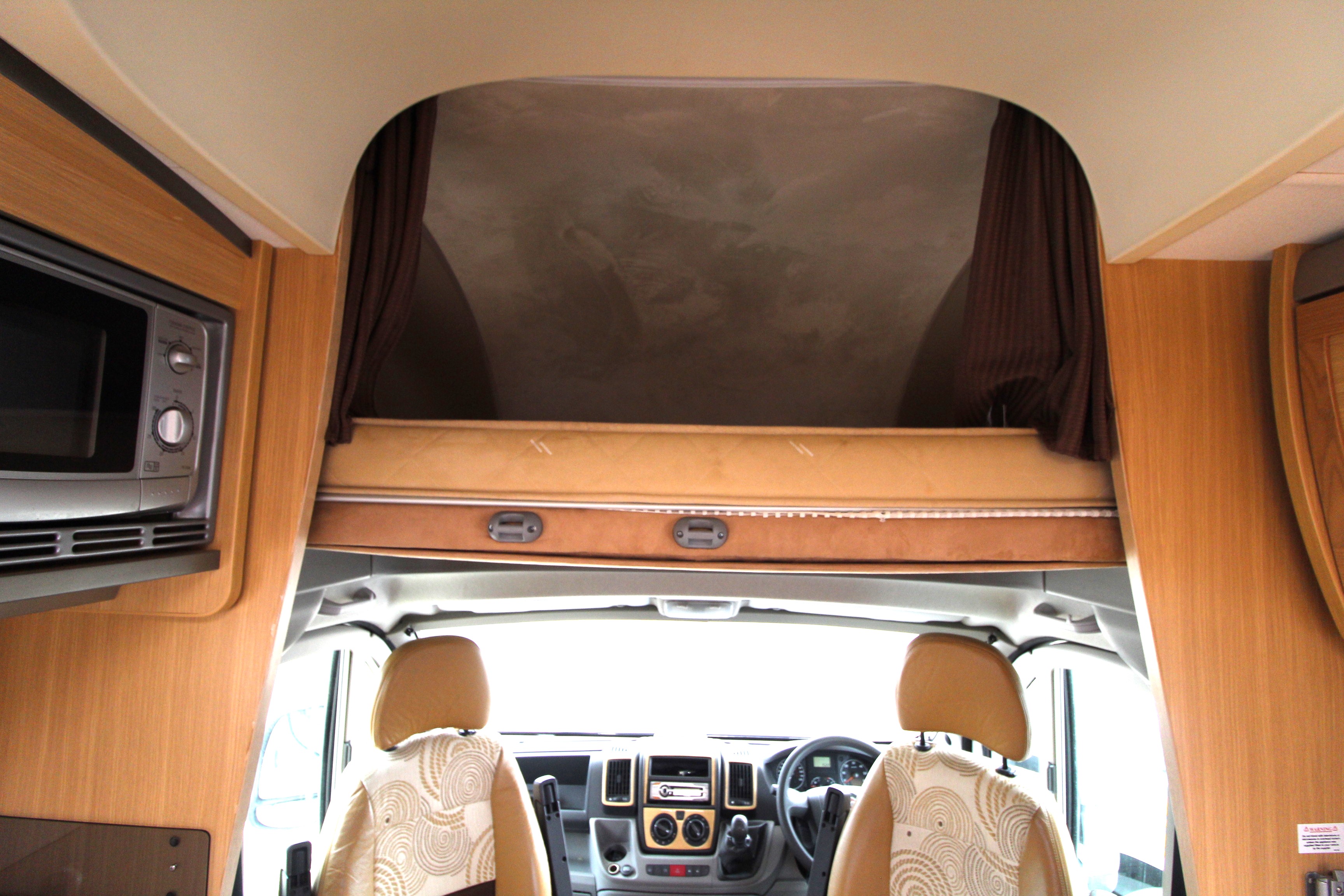 Swivel cab seats enhance the L-shaped front seating area with swing out coffee table. If required, this area can convert to a single bed. The over cab drop down bed can be accessed via a ladder and privacy curtains screen off the area, this area is also great for storage when not in use. Comprehensive kitchen facilities include 3+1 hob, extraction canopy, grill, oven, microwave, ample storage cupboards and extendable work surface.