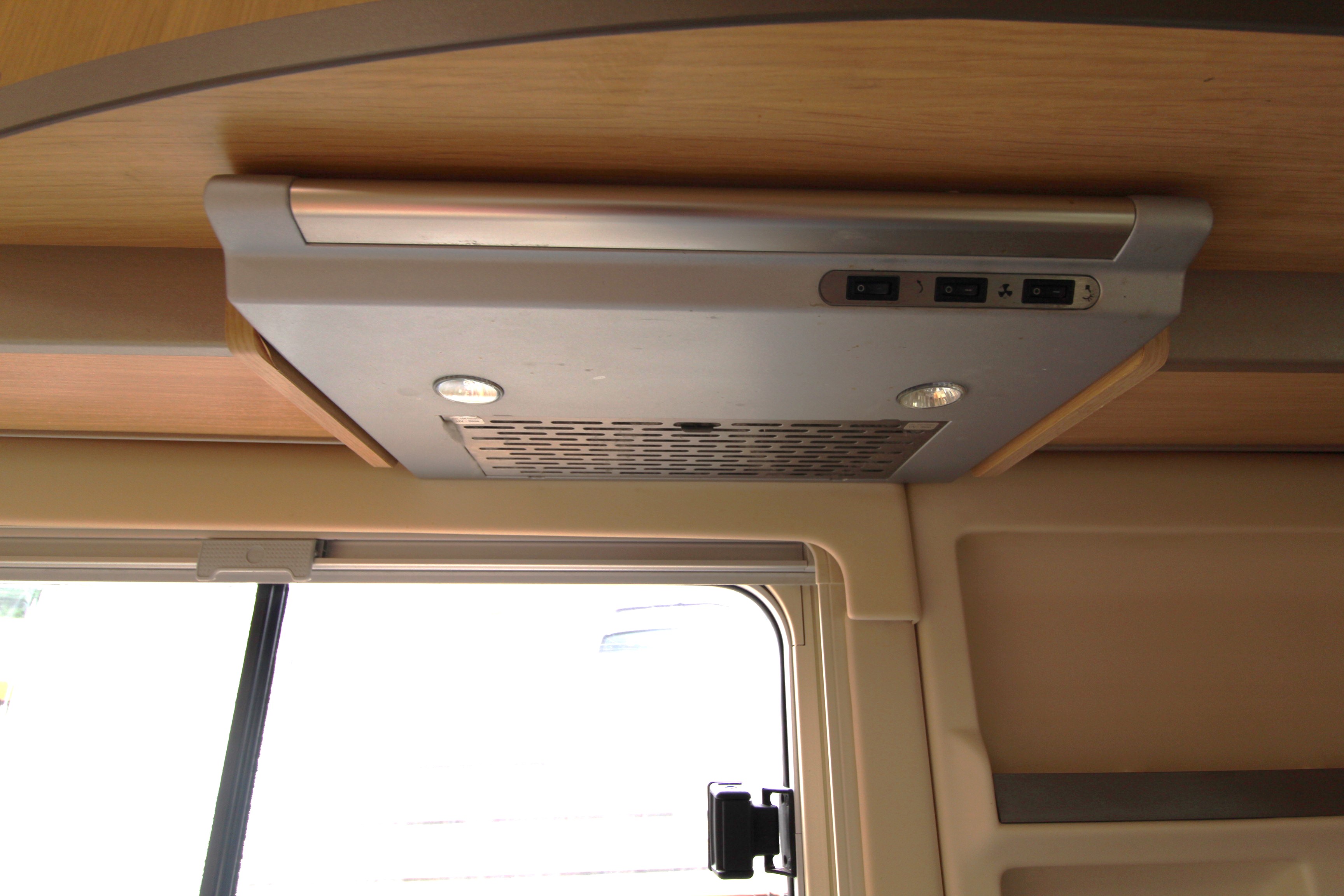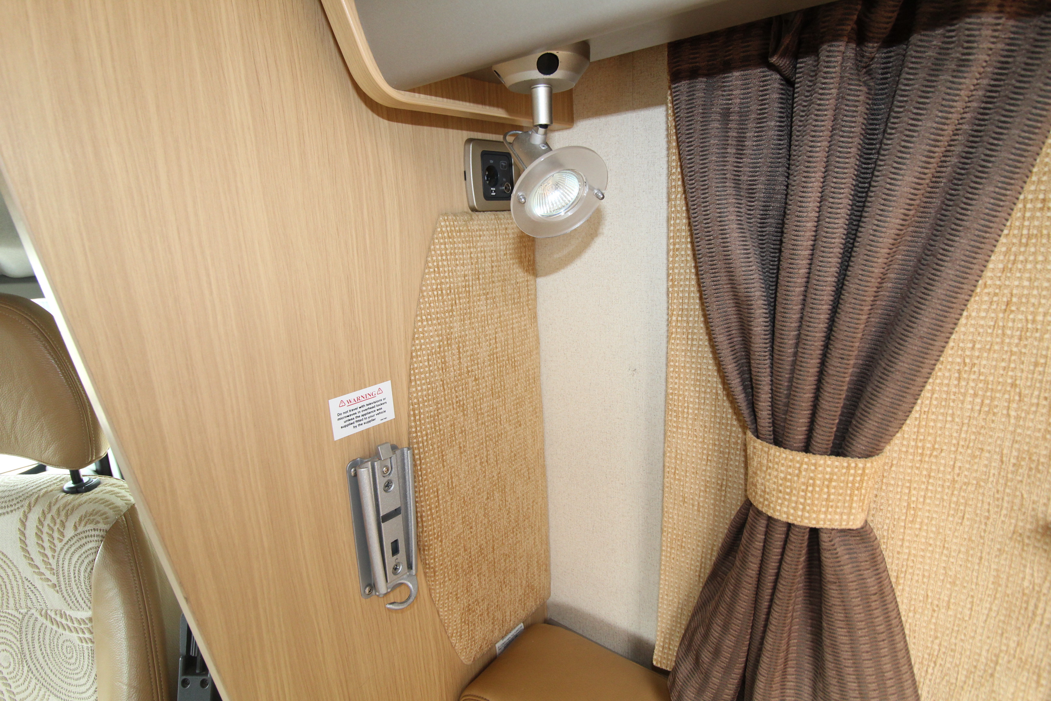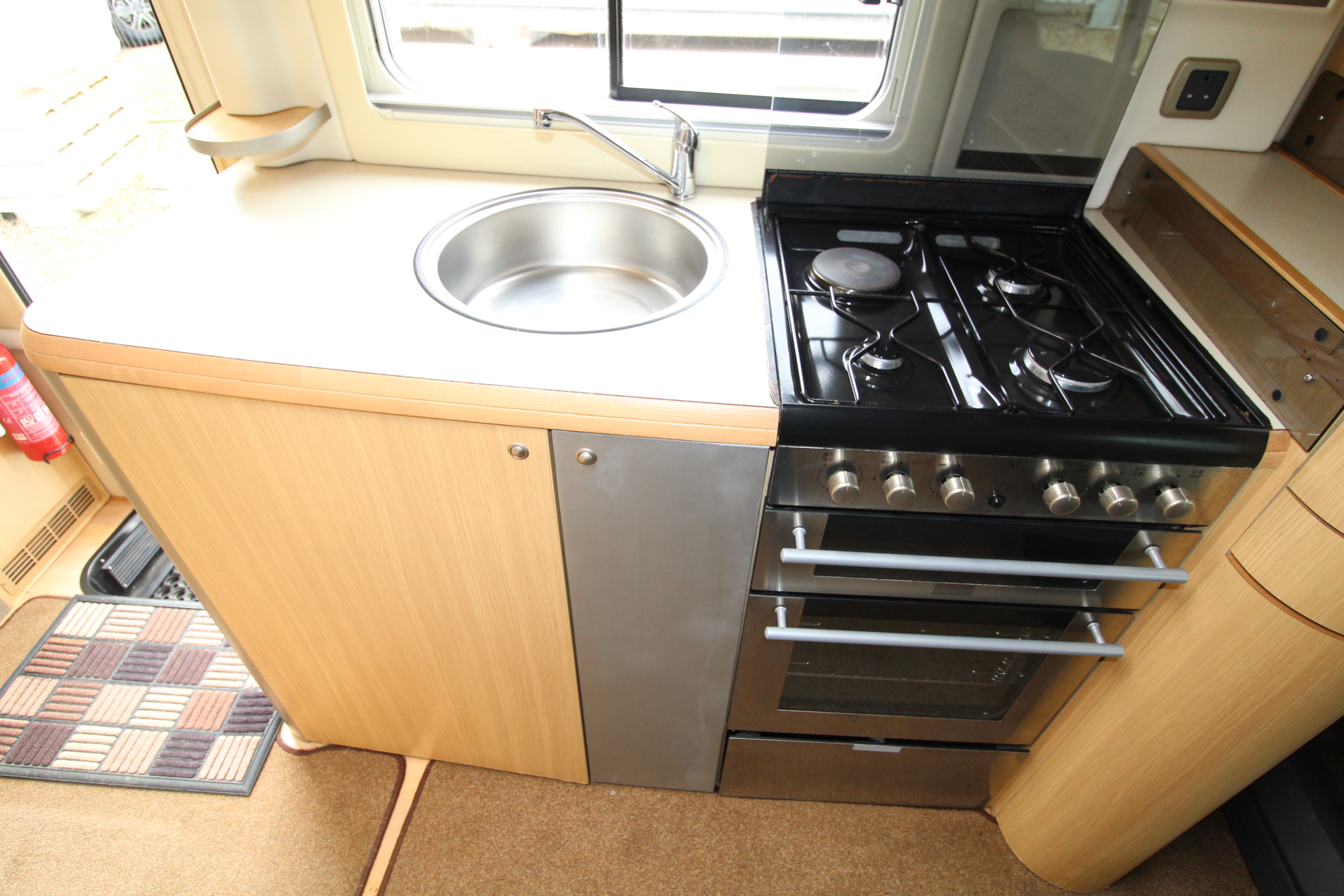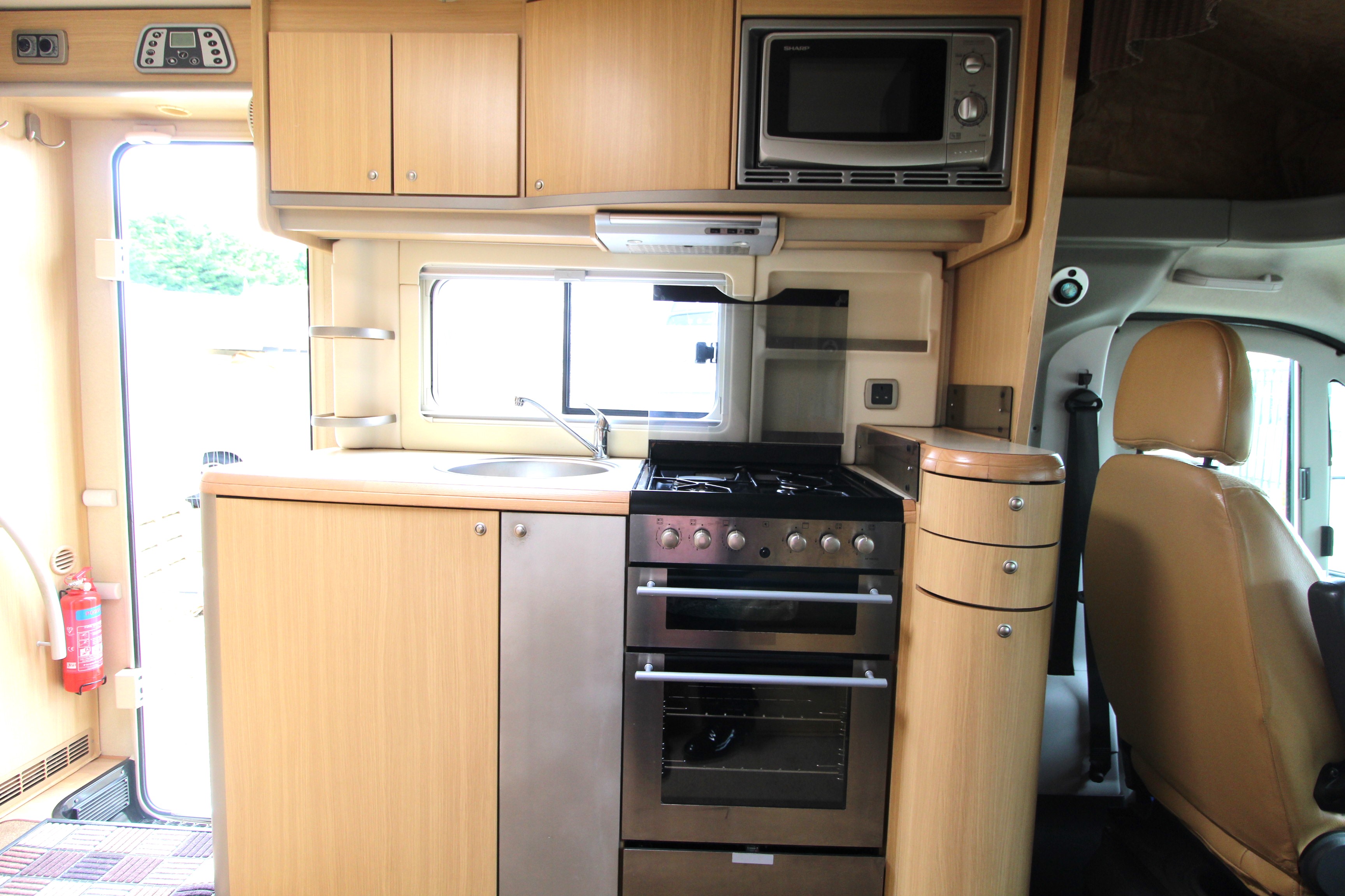 Swivel cab seats enhance the L-shaped front seating area with swing out coffee table. If required, this area can convert to a single bed. The over cab drop down bed can be accessed via a ladder and privacy curtains screen off the area, this area is also great for storage when not in use. Comprehensive kitchen facilities include 3+1 hob, extraction canopy, grill, oven, microwave, ample storage cupboards and extendable work surface.