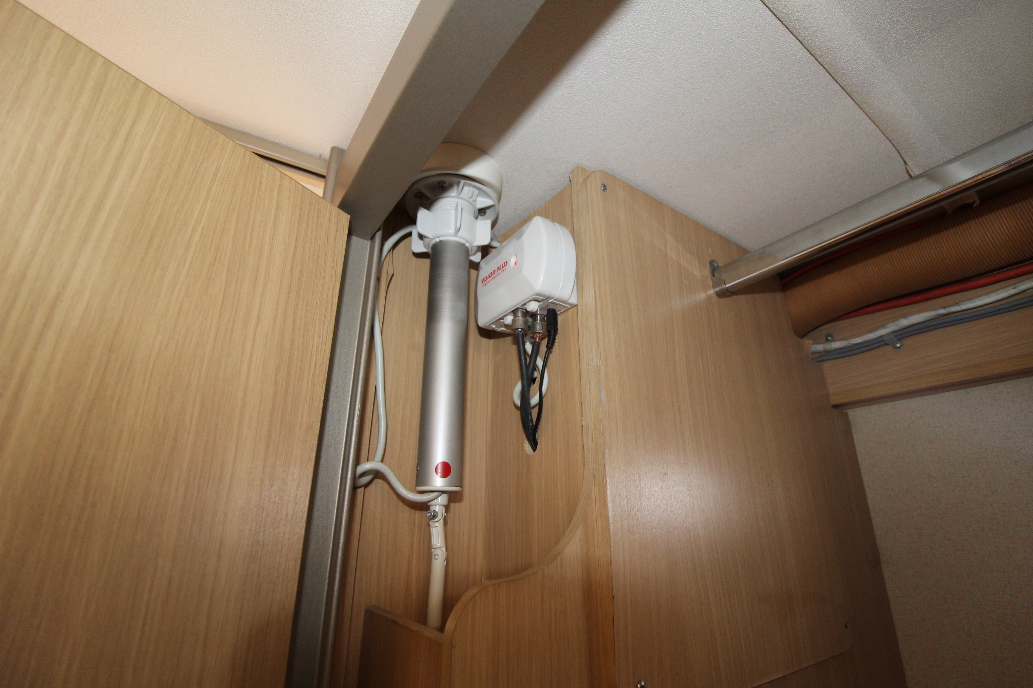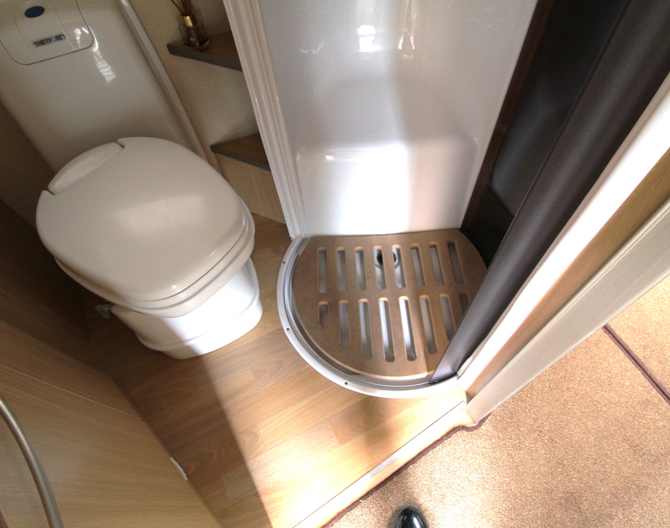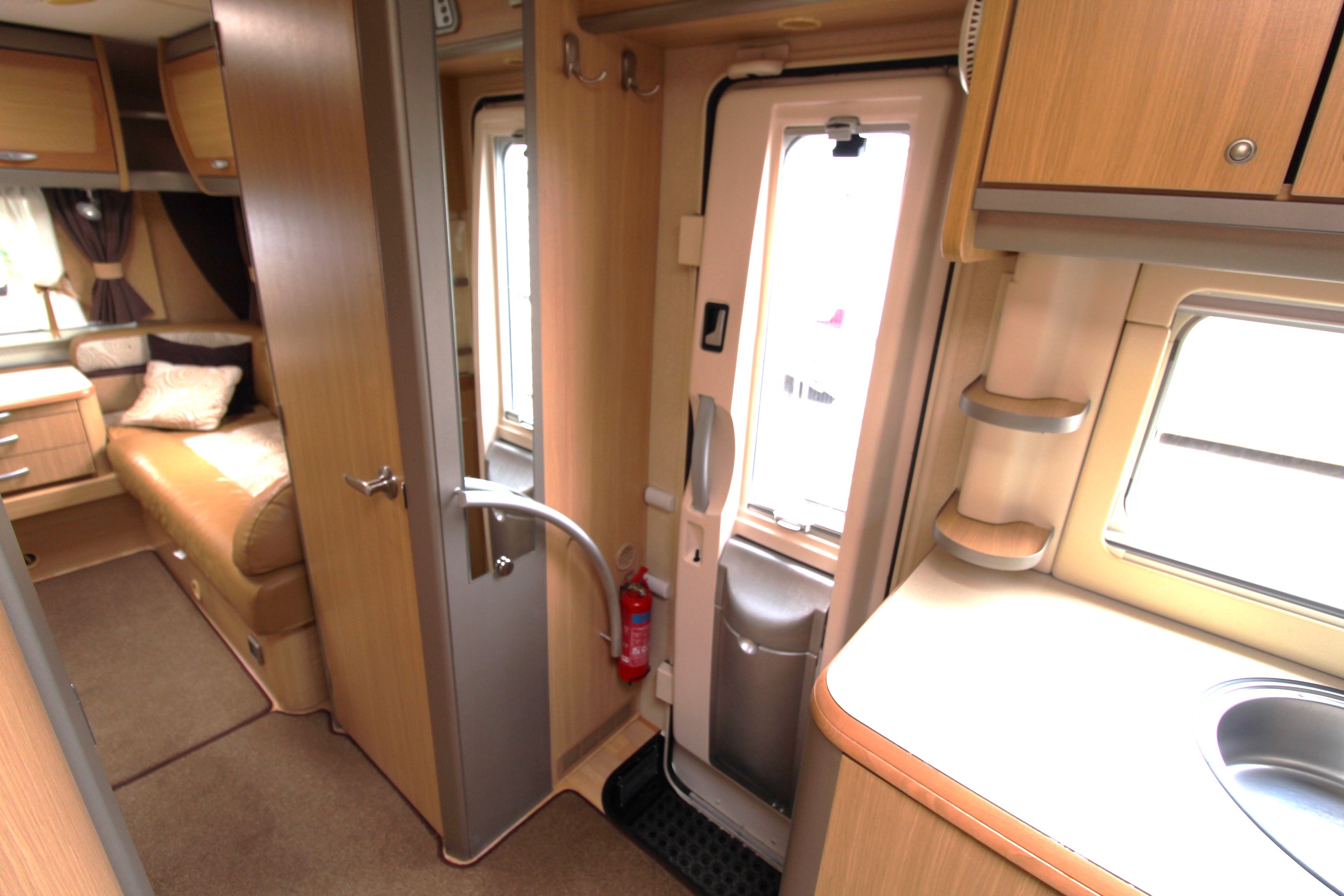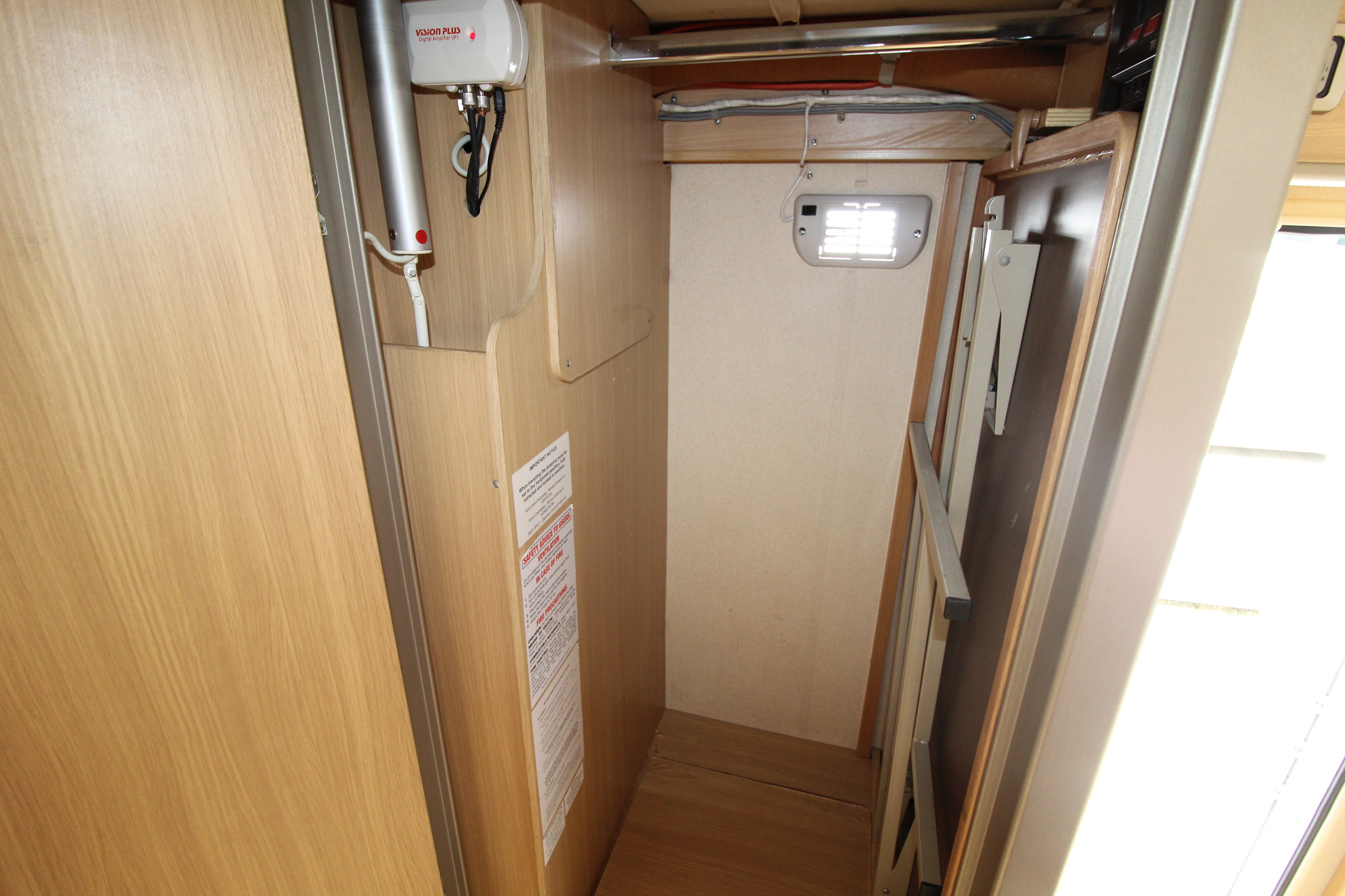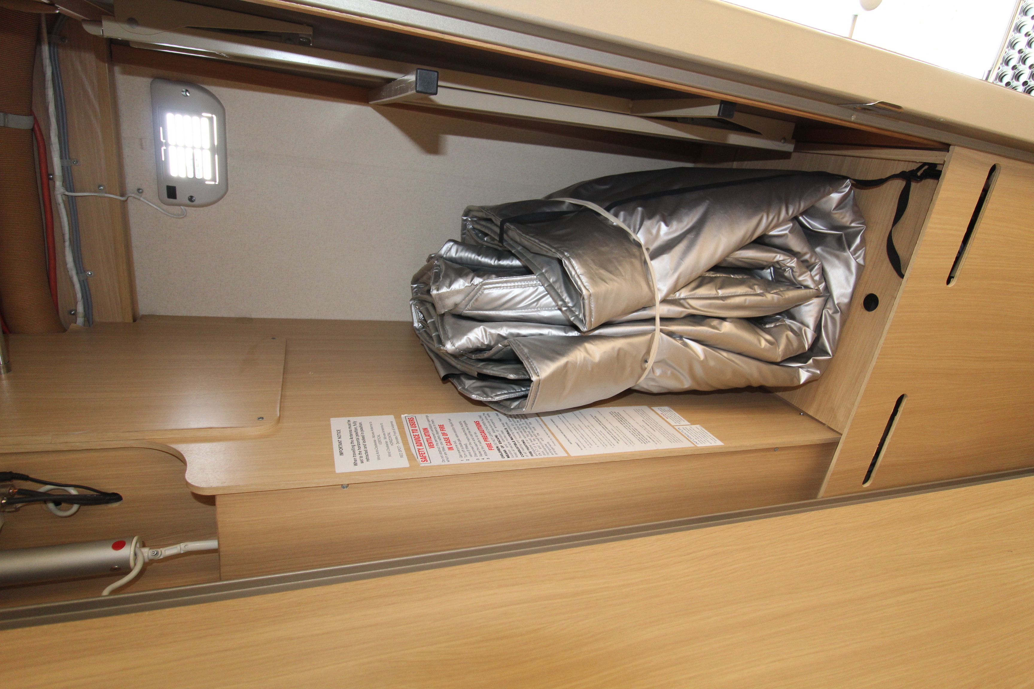 The offside washroom offers cassette toilet, vanity basin and separate shower cubicle. Situated opposite the washroom is a wardrobe storage area housing the wind up tv aerial and table.