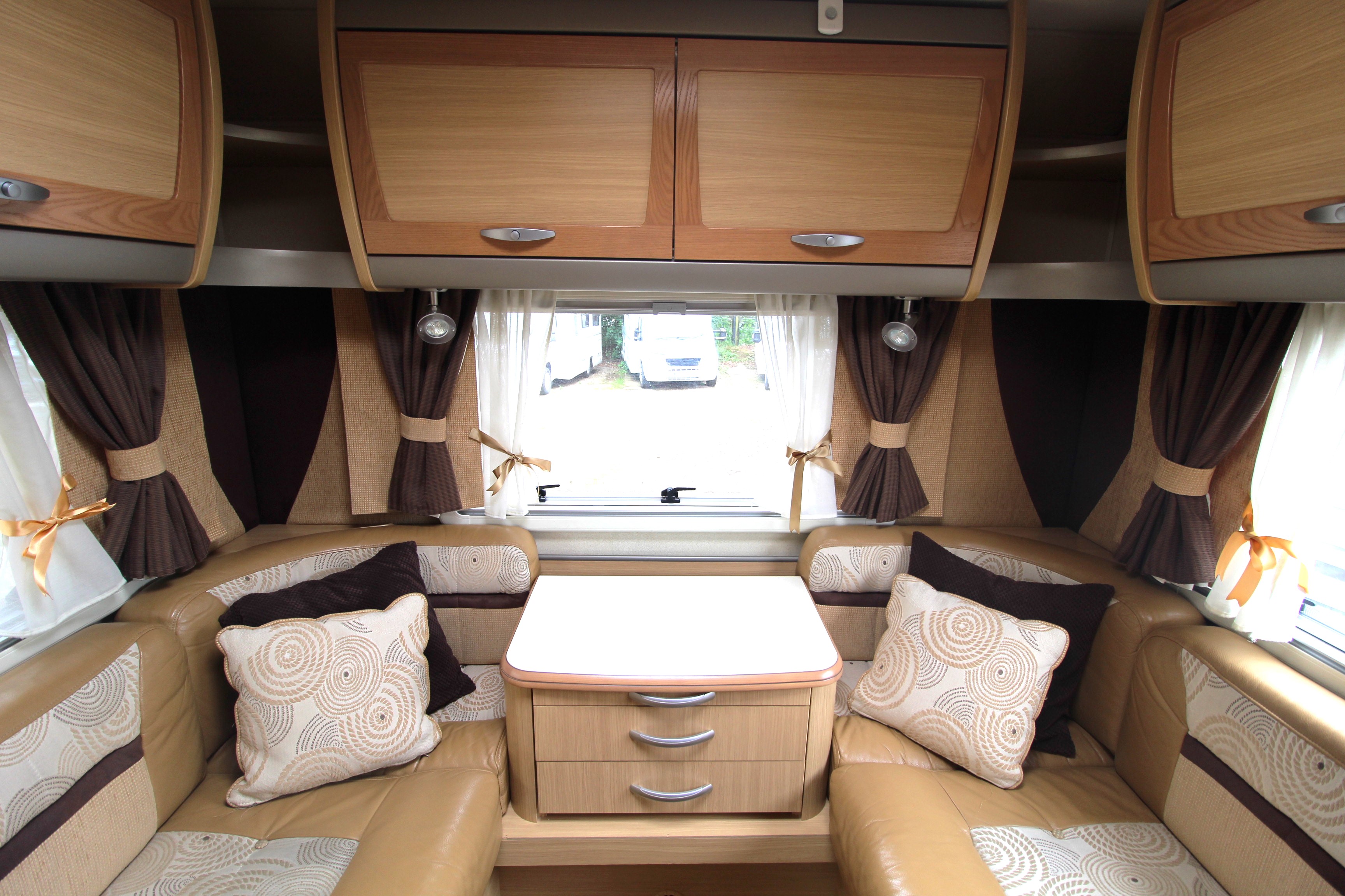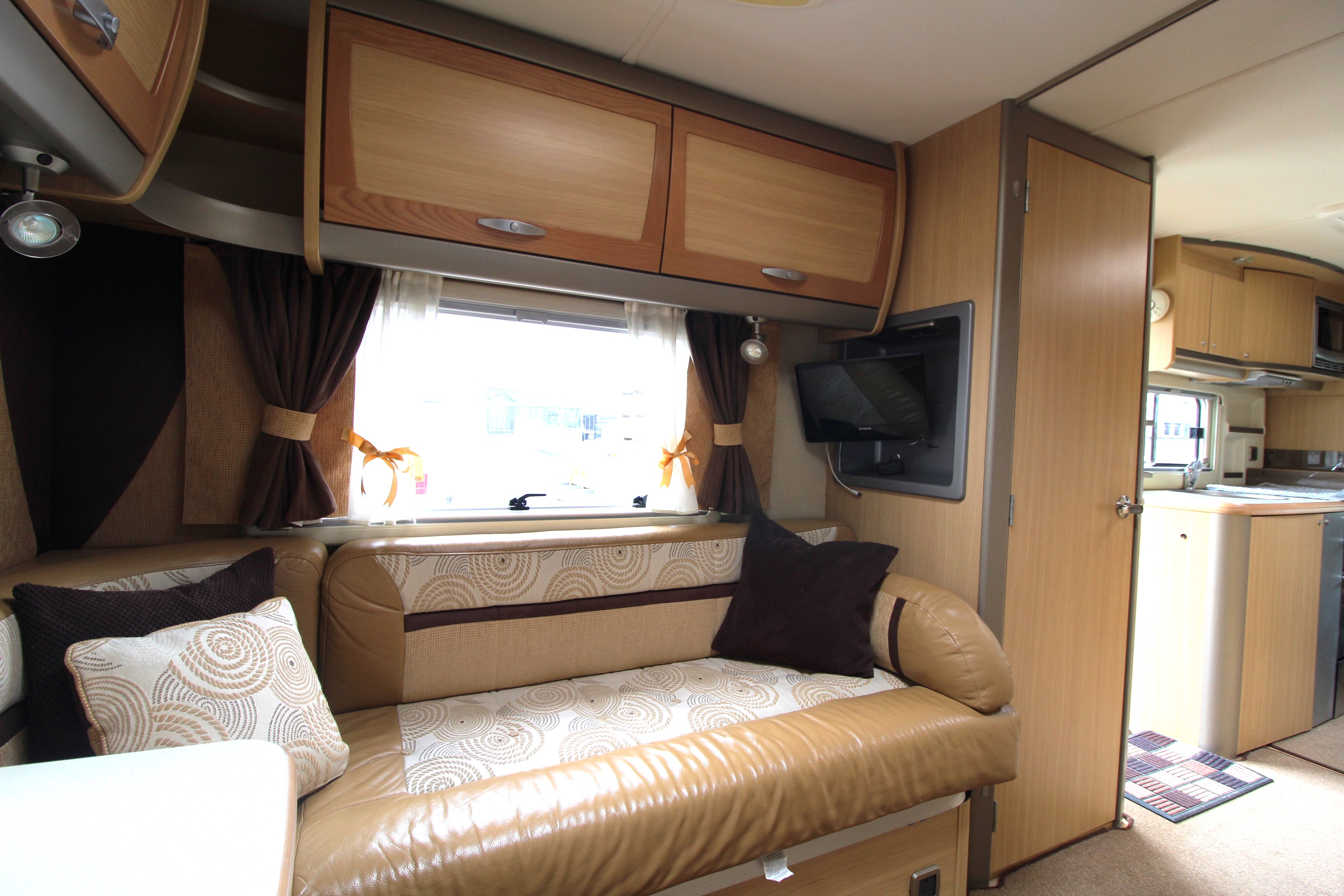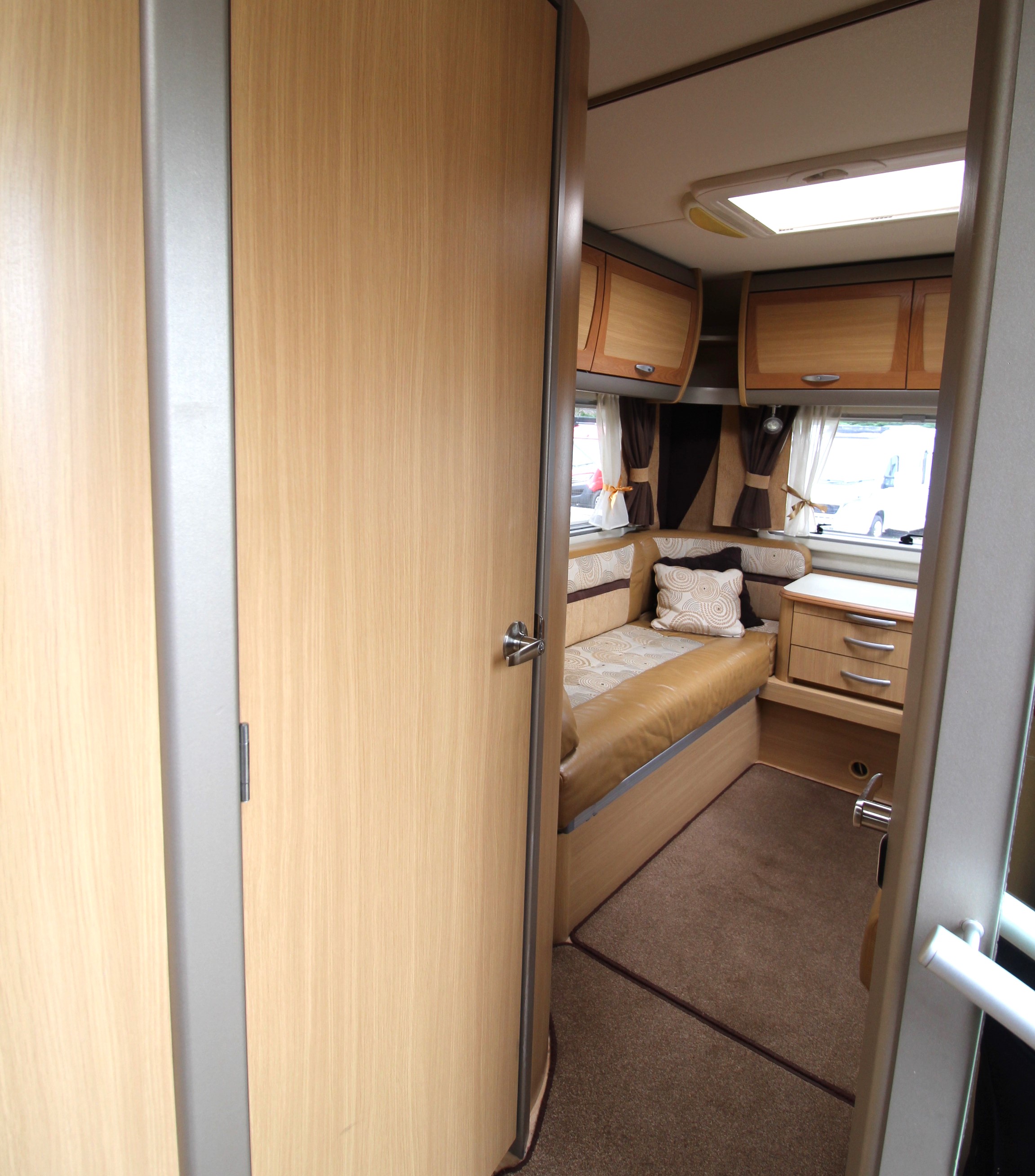 The rear lounge area is a cosy area to relax on an evening and benefits from a tv on bracket and central chest of drawers. Overhead lockers offer further storage options. Use as 2 single beds on a night or convert to a large double bed.