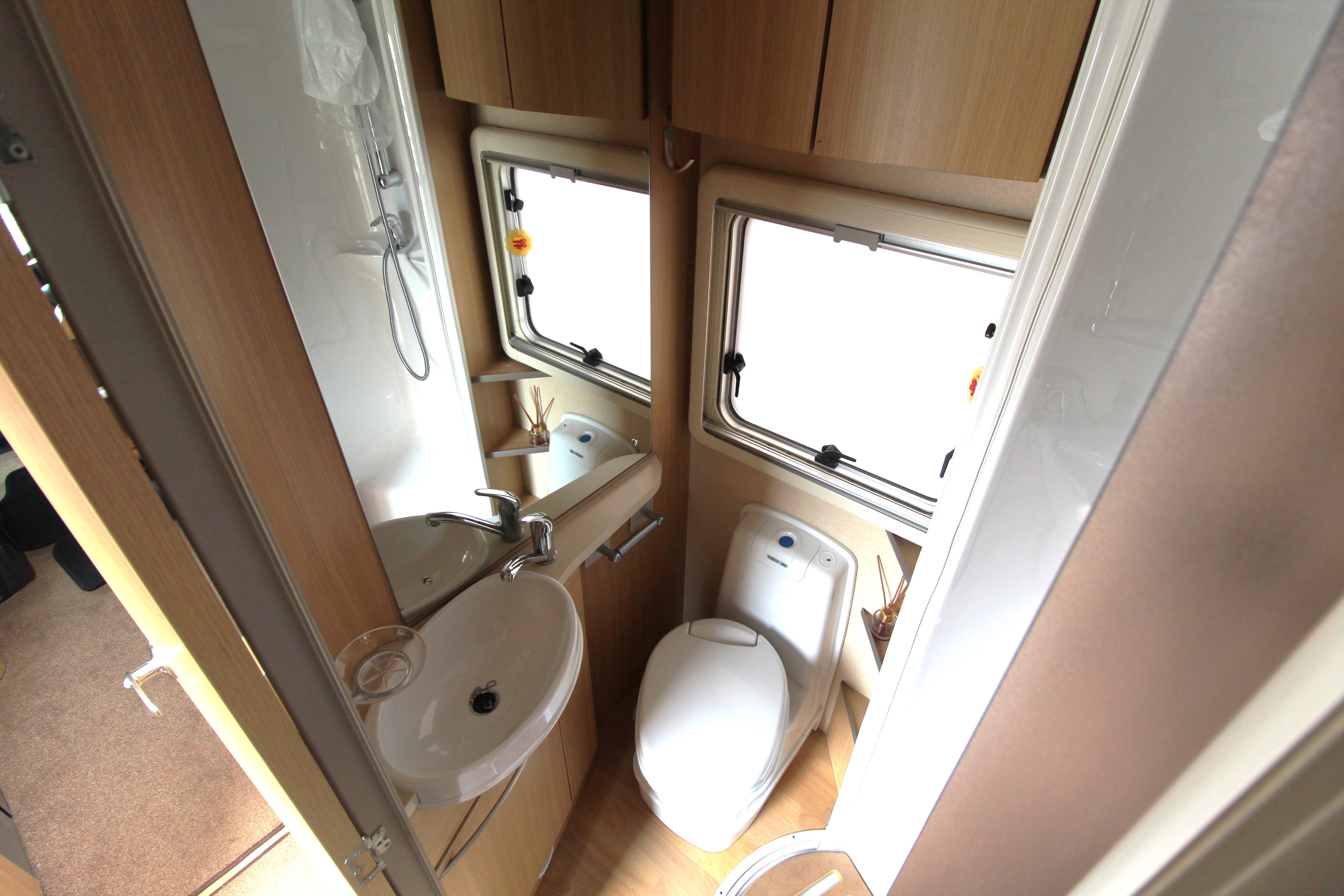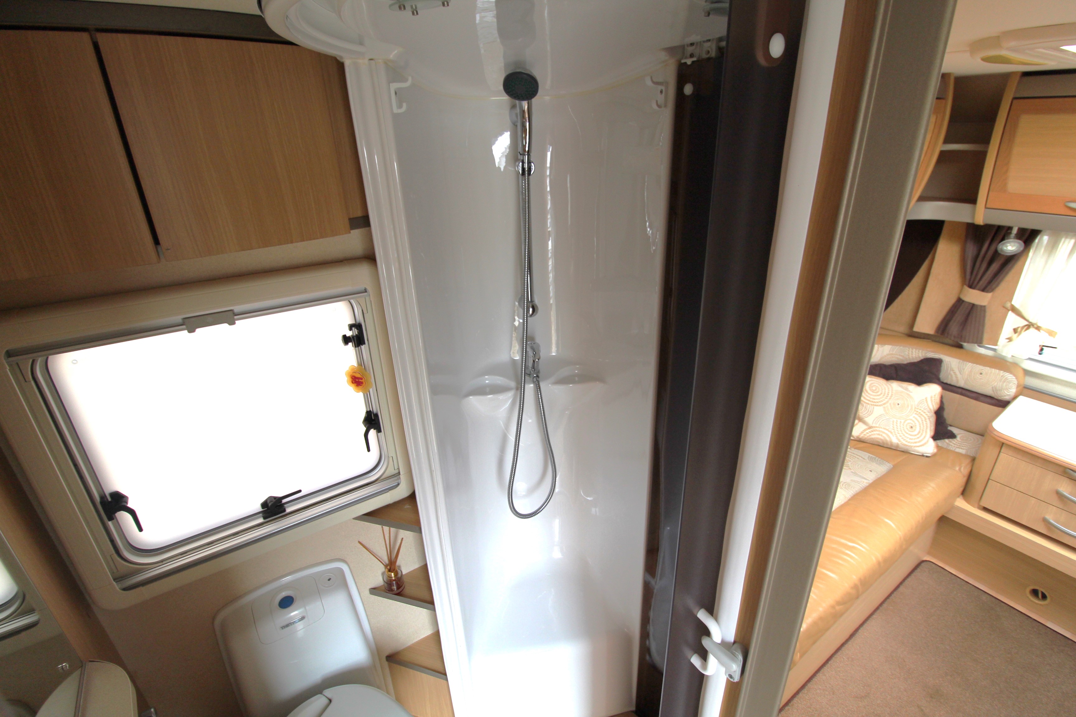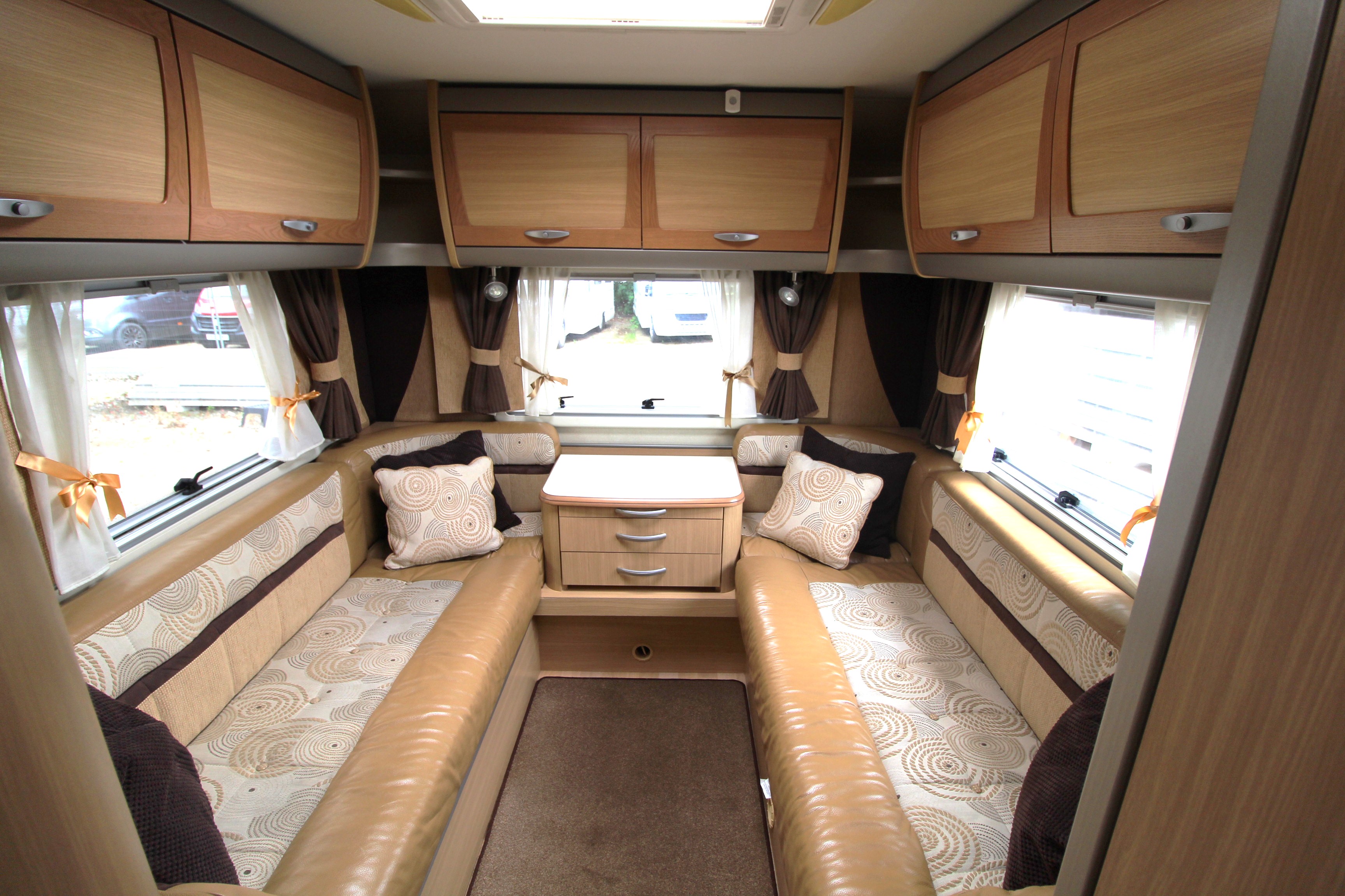 The rear lounge area is a cosy area to relax on an evening and benefits from a tv on bracket and central chest of drawers. Overhead lockers offer further storage options. Use as 2 single beds on a night or convert to a large double bed.