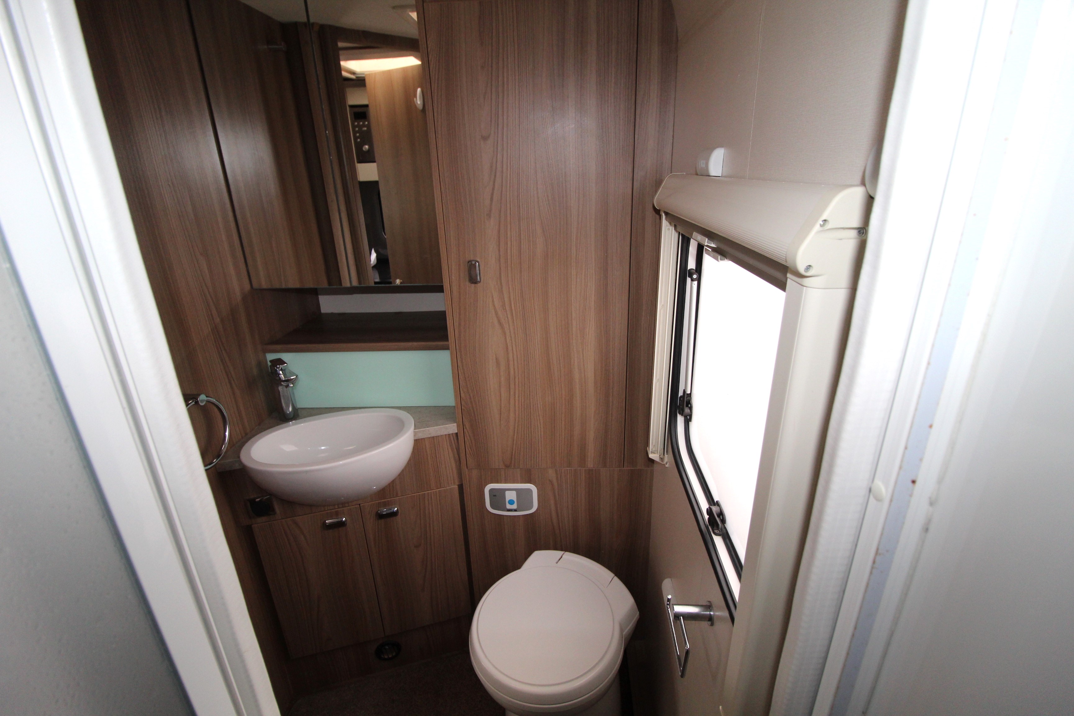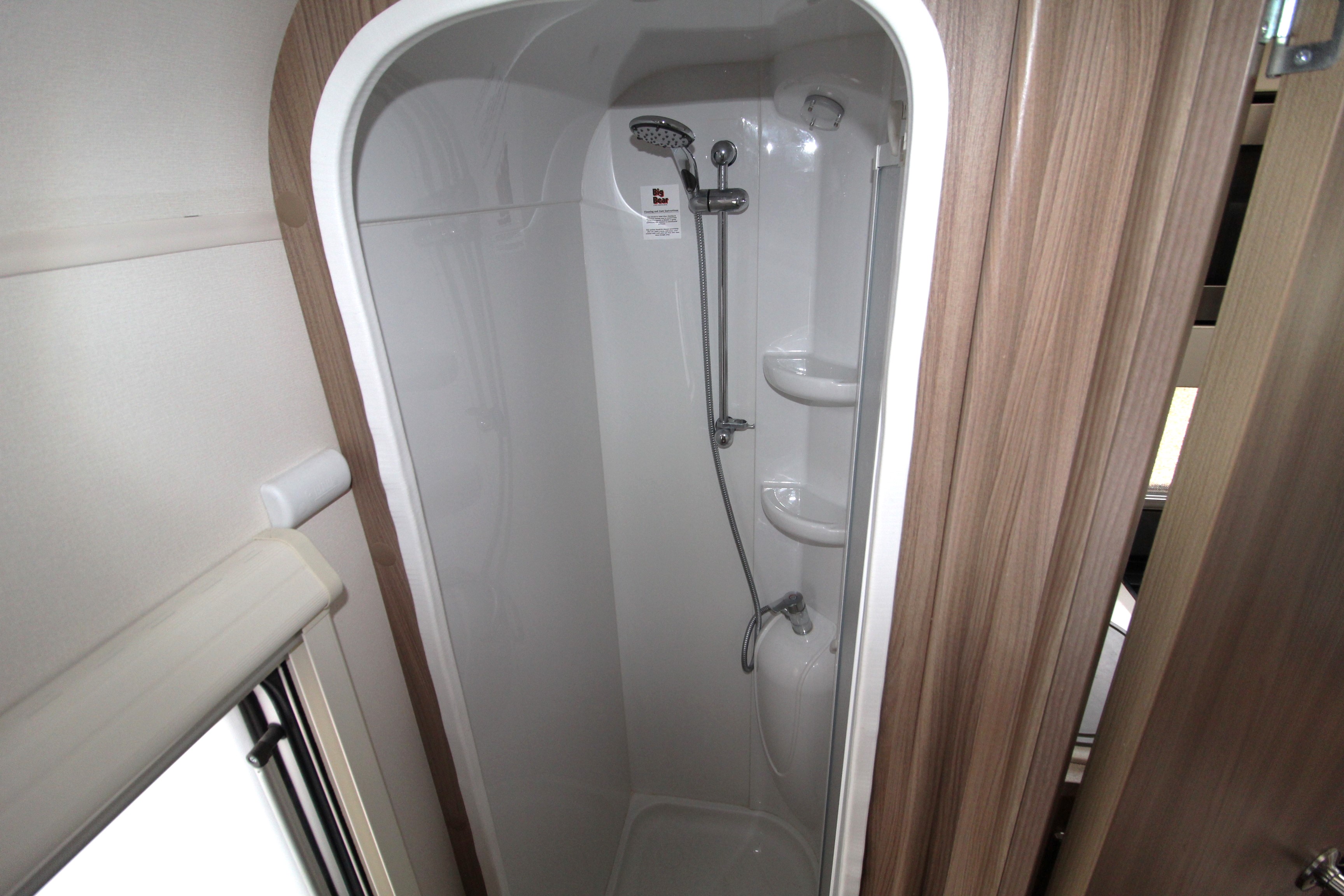 To the rear of the vehicle is a full width end washroom with vanity sink/cassette toilet unit with mirror and wardrobe storage. Situated opposite is the shower cubicle.