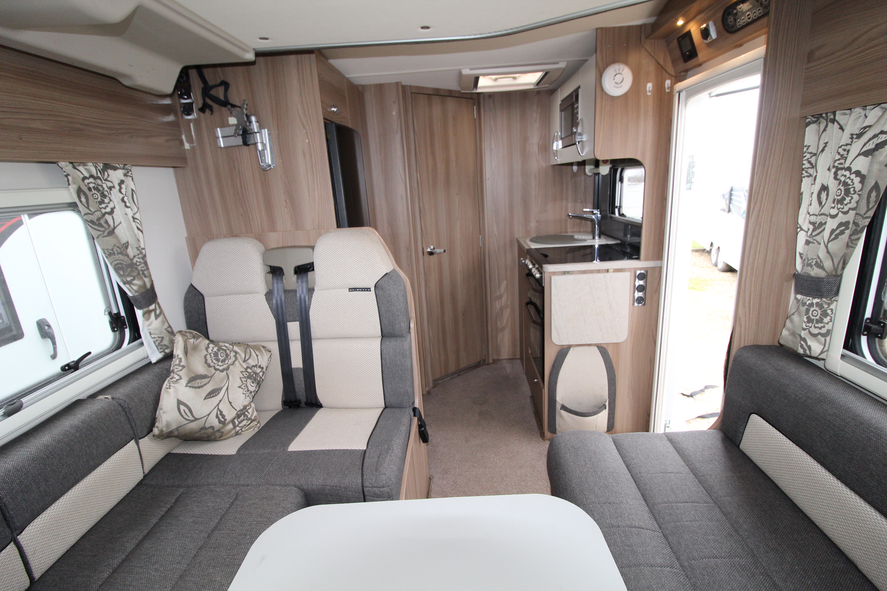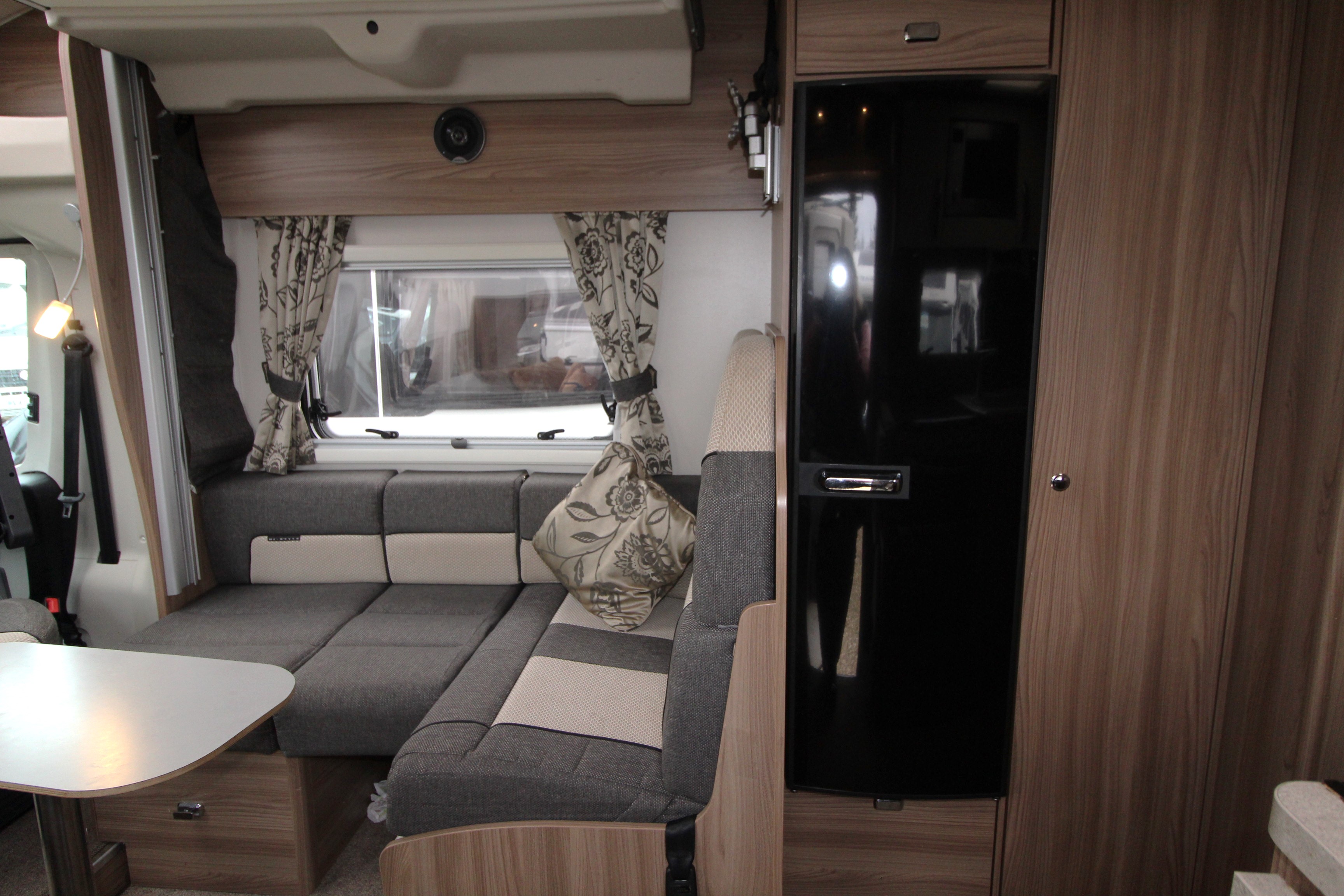 The spacious U-shaped lounge/dining area has a removal central table and a drop down double bed above.